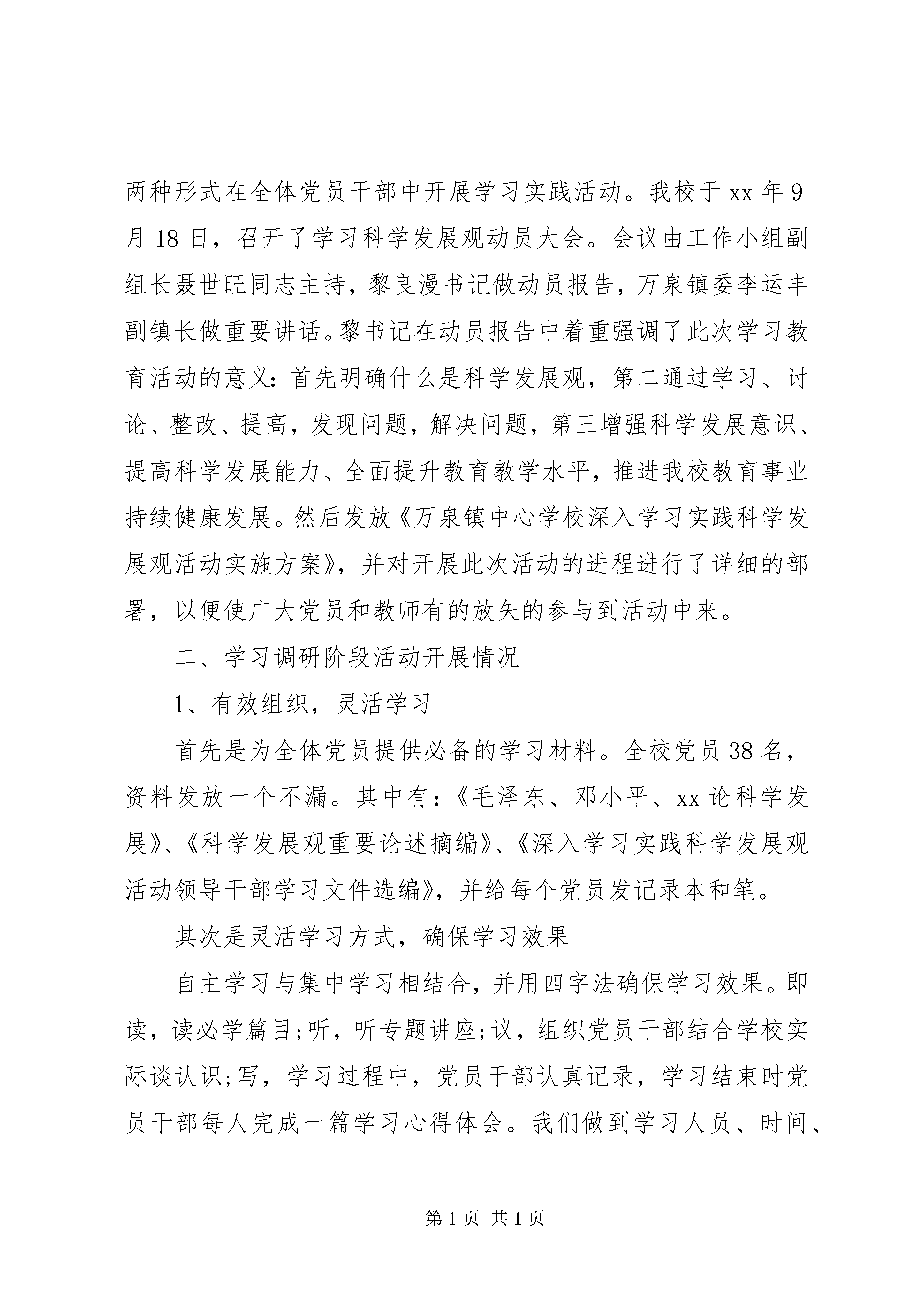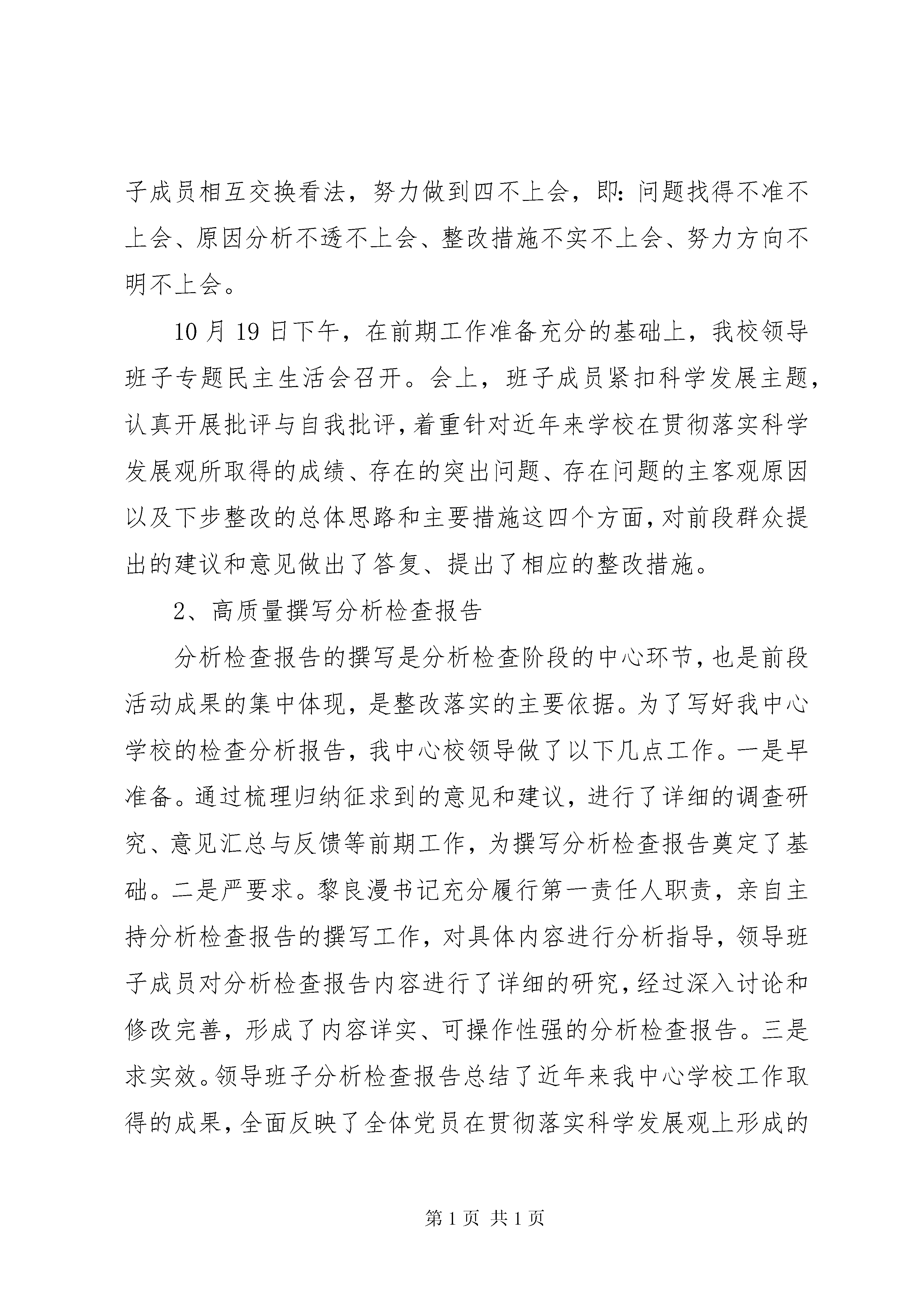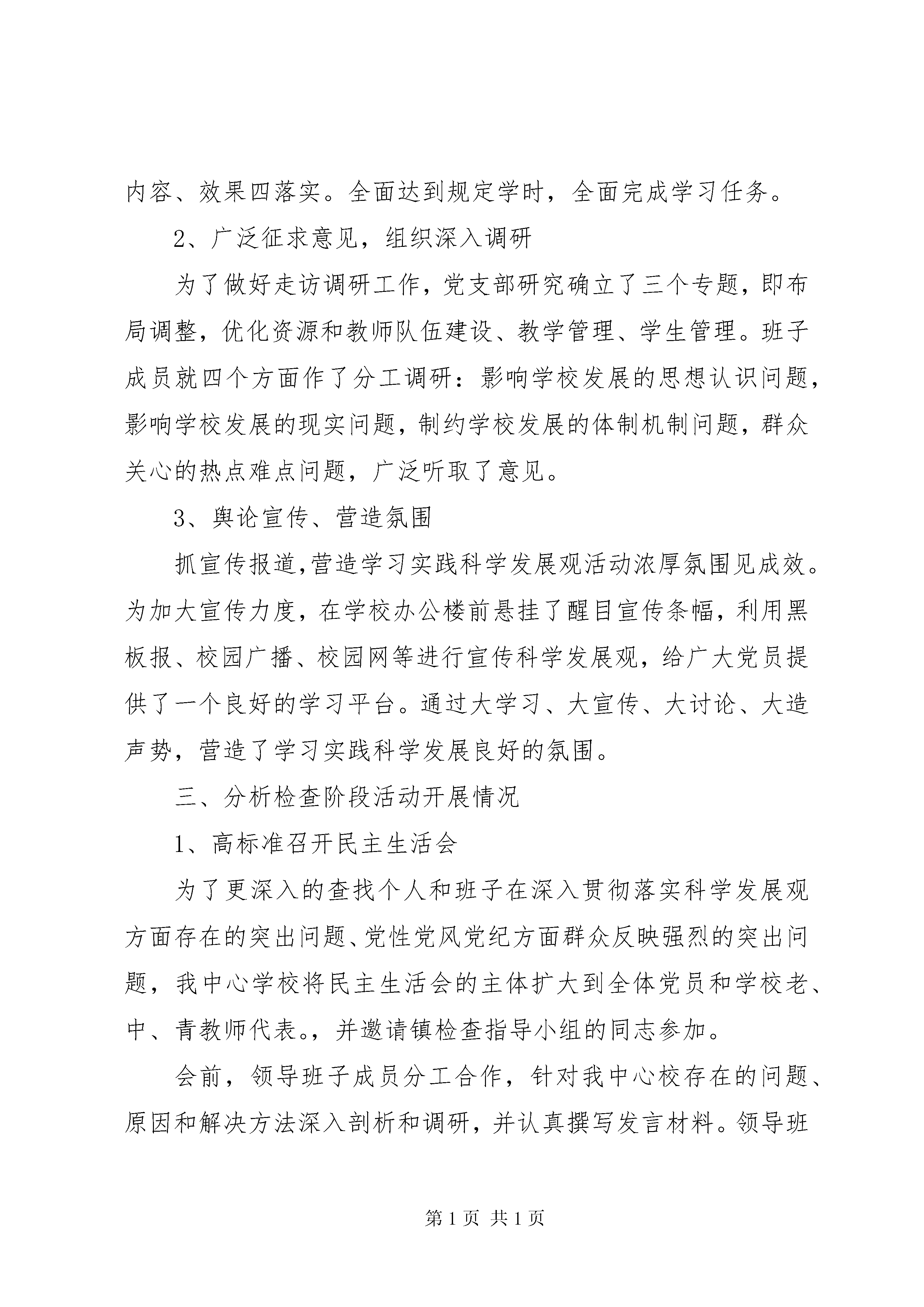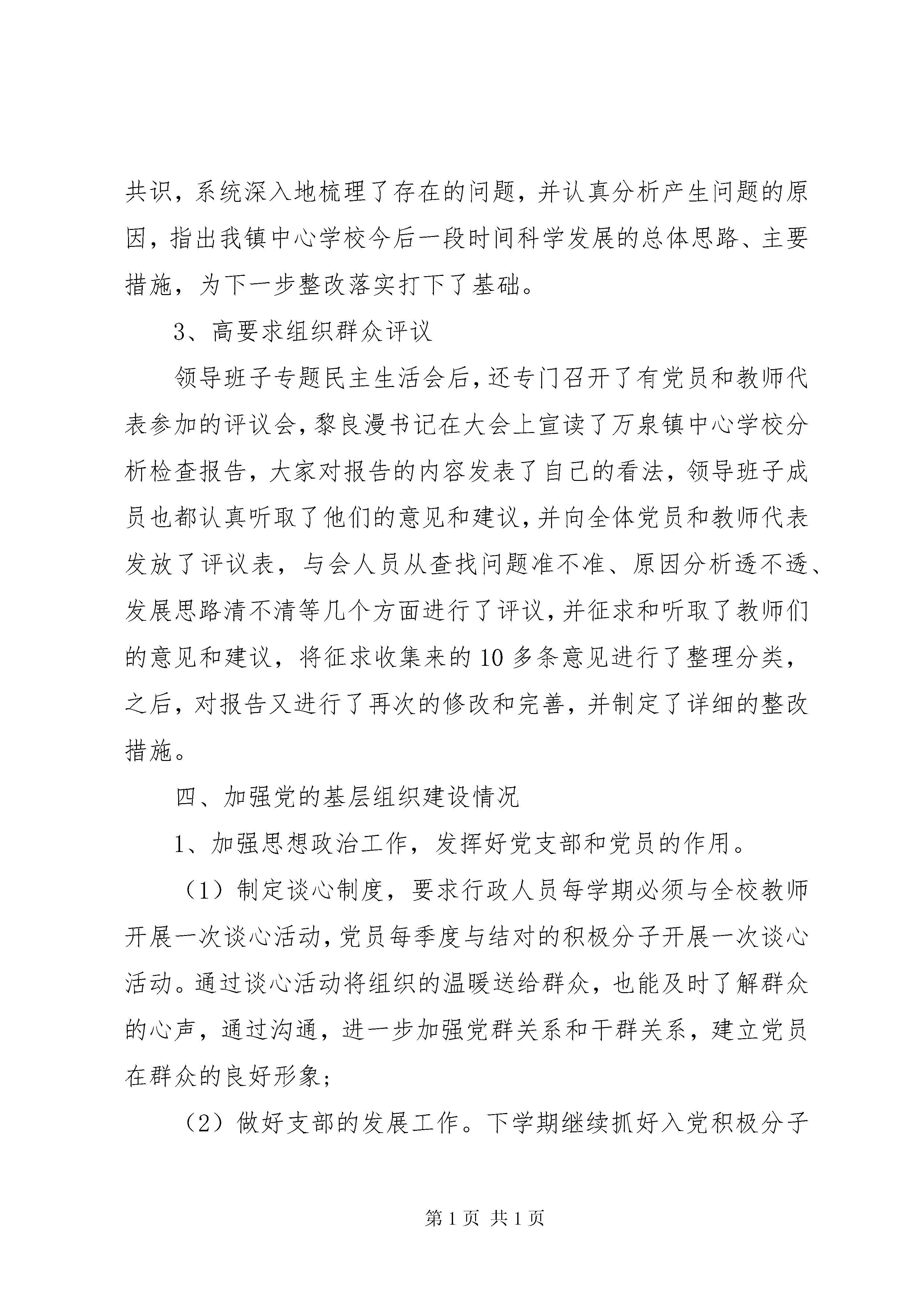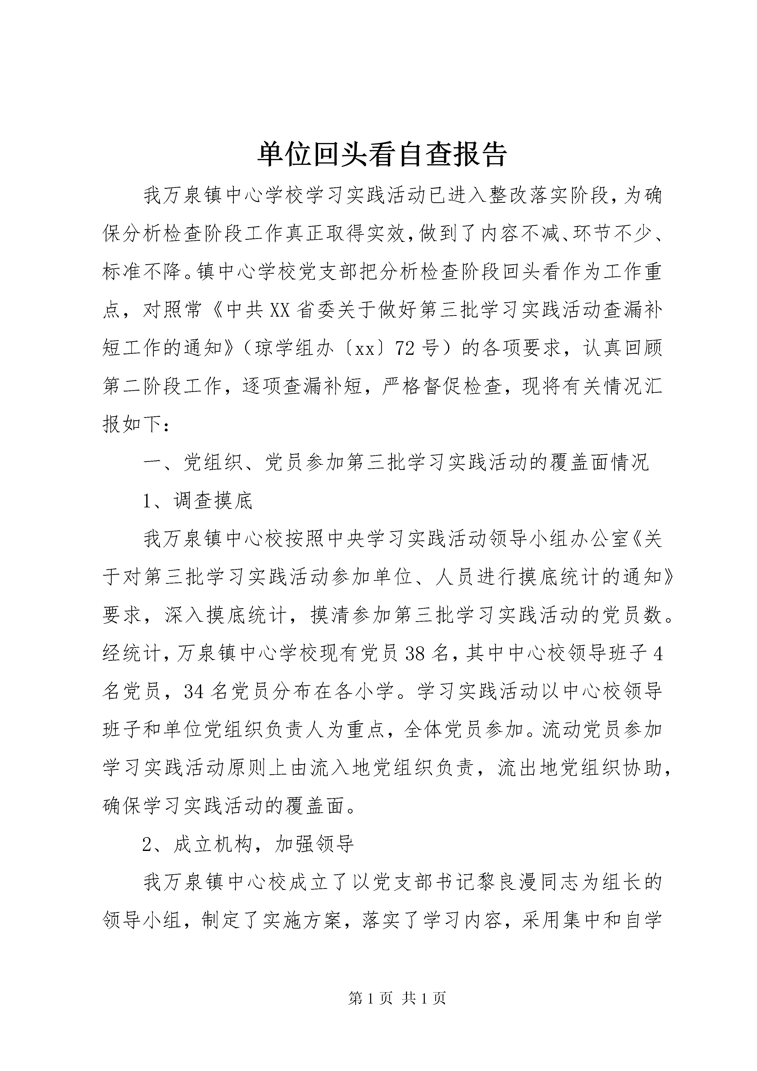 单位回头看自查报告我万泉镇中心学校学习实践活动已进入整改落实阶段,为确保分析检查阶段工作真正取得实效,做到了内容不减、环节不少、标准不降。镇中心学校党支部把分析检查阶段回头看作为工作重点,对照常《中共XX省委关于做好第三批学习实践活动查漏补短工作的通知》(琼学组办〔xx〕72号)的各项要求,认真回顾第二阶段工作,逐项查漏补短,严格督促检查,现将有关情况汇报如下:一、党组织、党员参加第三批学习实践活动的覆盖面情况1、调查摸底我万泉镇中心校按照中央学习实践活动领导小组办公室《关于对第三批学习实践活动参加单位、人员进行摸底统计的通知》要求,深入摸底统计,摸清参加第三批学习实践活动的党员数。经统计,万泉镇中心学校现有党员38名,其中中心校领导班子4名党员,34名党员分布在各小学。学习实践活动以中心校领导班子和单位党组织负责人为重点,全体党员参加。流动党员参加学习实践活动原则上由流入地党组织负责,流出地党组织协助,确保学习实践活动的覆盖面。2、成立机构,加强领导我万泉镇中心校成立了以党支部书记黎良漫同志为组长的领导小组,制定了实施方案,落实了学习内容,采用集中和自学两种形式在全体党员干部中开展学习实践活动。我校于xx年9月18日,召开了学习科学发展观动员大会。会议由工作小组副组长聂世旺同志主持,黎良漫书记做动员报告,万泉镇委李运丰副镇长做重要讲话。黎书记在动员报告中着重强调了此次学习教育活动的意义:首先明确什么是科学发展观,第二通过学习、讨论、整改、提高,发现问题,解决问题,第三增强科学发展意识、提高科学发展能力、全面提升教育教学水平,推进我校教育事业持续健康发展。然后发放《万泉镇中心学校深入学习实践科学发展观活动实施方案》,并对开展此次活动的进程进行了详细的部署,以便使广大党员和教师有的放矢的参与到活动中来。二、学习调研阶段活动开展情况1、有效组织,灵活学习首先是为全体党员提供必备的学习材料。全校党员38名,资料发放一个不漏。其中有:《毛泽东、邓小平、xx论科学发展》、《科学发展观重要论述摘编》、《深入学习实践科学发展观活动领导干部学习文件选编》,并给每个党员发记录本和笔。其次是灵活学习方式,确保学习效果自主学习与集中学习相结合,并用四字法确保学习效果。即读,读必学篇目;听,听专题讲座;议,组织党员干部结合学校实际谈认识;写,学习过程中,党员干部认真记录,学习结束时党员干部每人完成一篇学习心得体会。我们做到学习人员、时间、内容、效果四落实。全面达到规定学时,全面完成学习任务。2、广泛征求意见,组织深入调研为了做好走访调研工作,党支部研究确立了三个专题,即布局调整,优化资源和教师队伍建设、教学管理、学生管理。班子成员就四个方面作了分工调研:影响学校发展的思想认识问题,影响学校发展的现实问题,制约学校发展的体制机制问题,群众关心的热点难点问题,广泛听取了意见。3、舆论宣传、营造氛围抓宣传报道,营造学习实践科学发展观活动浓厚氛围见成效。为加大宣传力度,在学校办公楼前悬挂了醒目宣传条幅,利用黑板报、校园广播、校园网等进行宣传科学发展观,给广大党员提供了一个良好的学习平台。通过大学习、大宣传、大讨论、大造声势,营造了学习实践科学发展良好的氛围。三、分析检查阶段活动开展情况1、高标准召开民主生活会为了更深入的查找个人和班子在深入贯彻落实科学发展观方面存在的突出问题、党性党风党纪方面群众反映强烈的突出问题,我中心学校将民主生活会的主体扩大到全体党员和学校老、中、青教师代表。,并邀请镇检查指导小组的同志参加。会前,领导班子成员分工合作,针对我中心校存在的问题、原因和解决方法深入剖析和调研,并认真撰写发言材料。领导班子成员相互交换看法,努力做到四不上会,即:问题找得不准不上会、原因分析不透不上会、整改措施不实不上会、努力方向不明不上会。10月19日下午,在前期工作准备充分的基础上,我校领导班子专题民主生活会召开。会上,班子成员紧扣科学发展主题,认真开展批评与自我批评,着重针对近年来学校在贯彻落实科学发展观所取得的成绩、存在的突出问题、存在问题的主客观原因以及下步整改的总体思路和主要措施这四个方面,对前段群众提出的建议和意见做出了答复、提出了相应的整改措施。2、高质量撰写分析检查报告分析检查报告的撰写是分析检查阶段的中心环节,也是前段活动成果的集中体现,是整改落实的主要依据。为了写好我中心学校的检查分析报告,我中心校领导做了以下几点工作。一是早准备。通过梳理归纳征求到的意见和建议,进行了详细的调查研究、意见汇总与反馈等前期工作,为撰写分析检查报告奠定了基础。二是严要求。黎良漫书记充分履行第一责任人职责,亲自主持分析检查报告的撰写工作,对具体内容进行分析指导,领导班子成员对分析检查报告内容进行了详细的研究,经过深入讨论和修改完善,