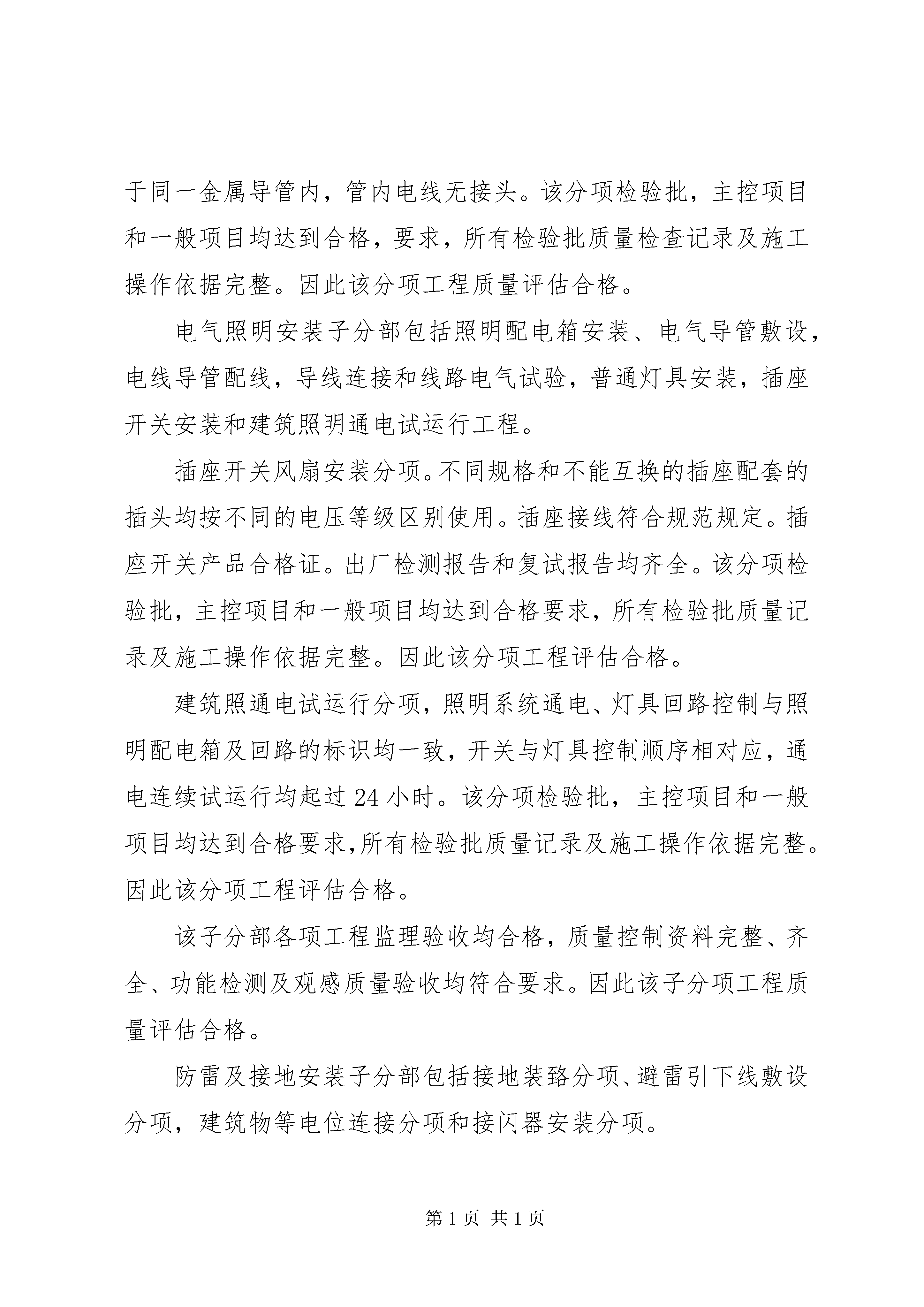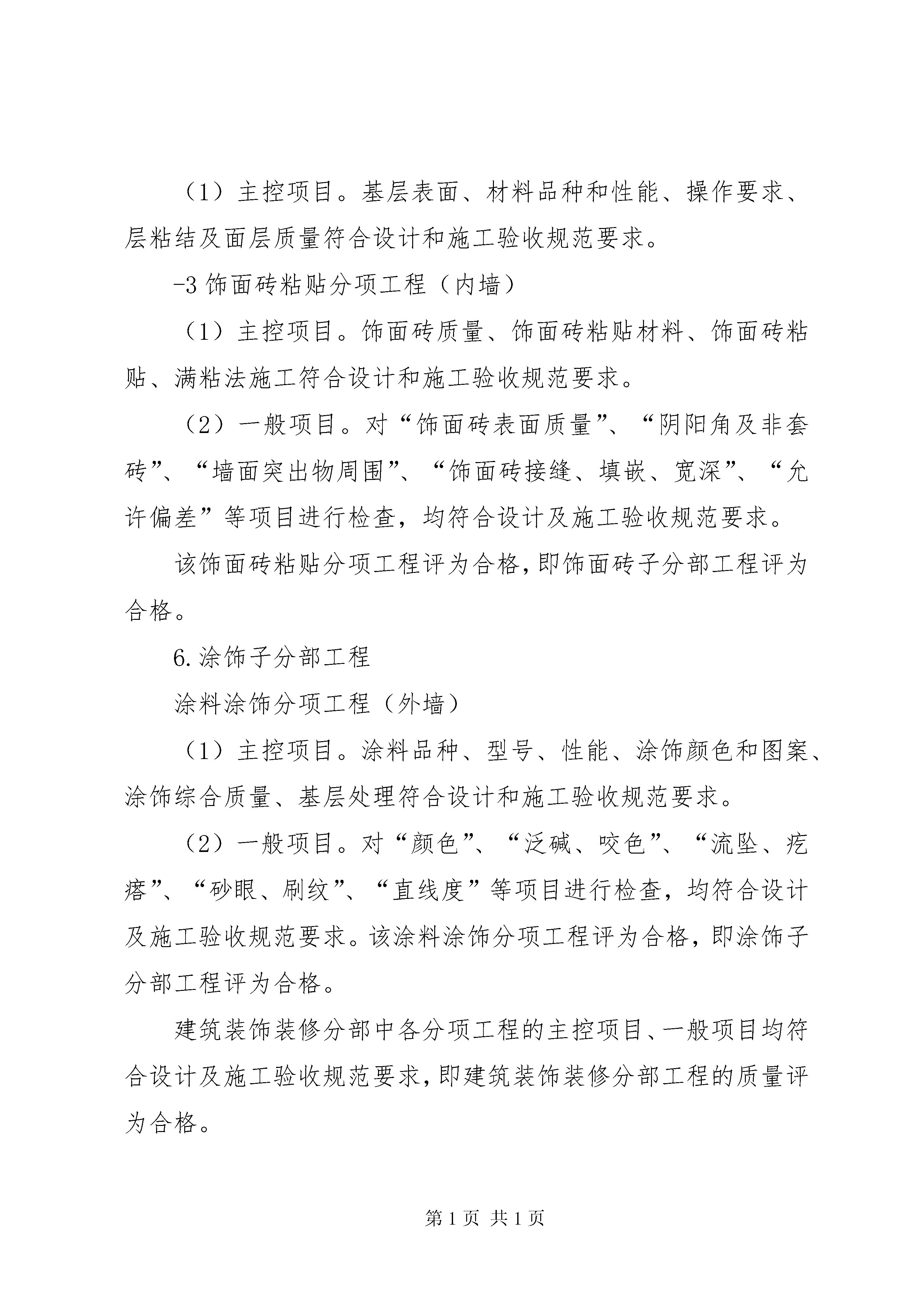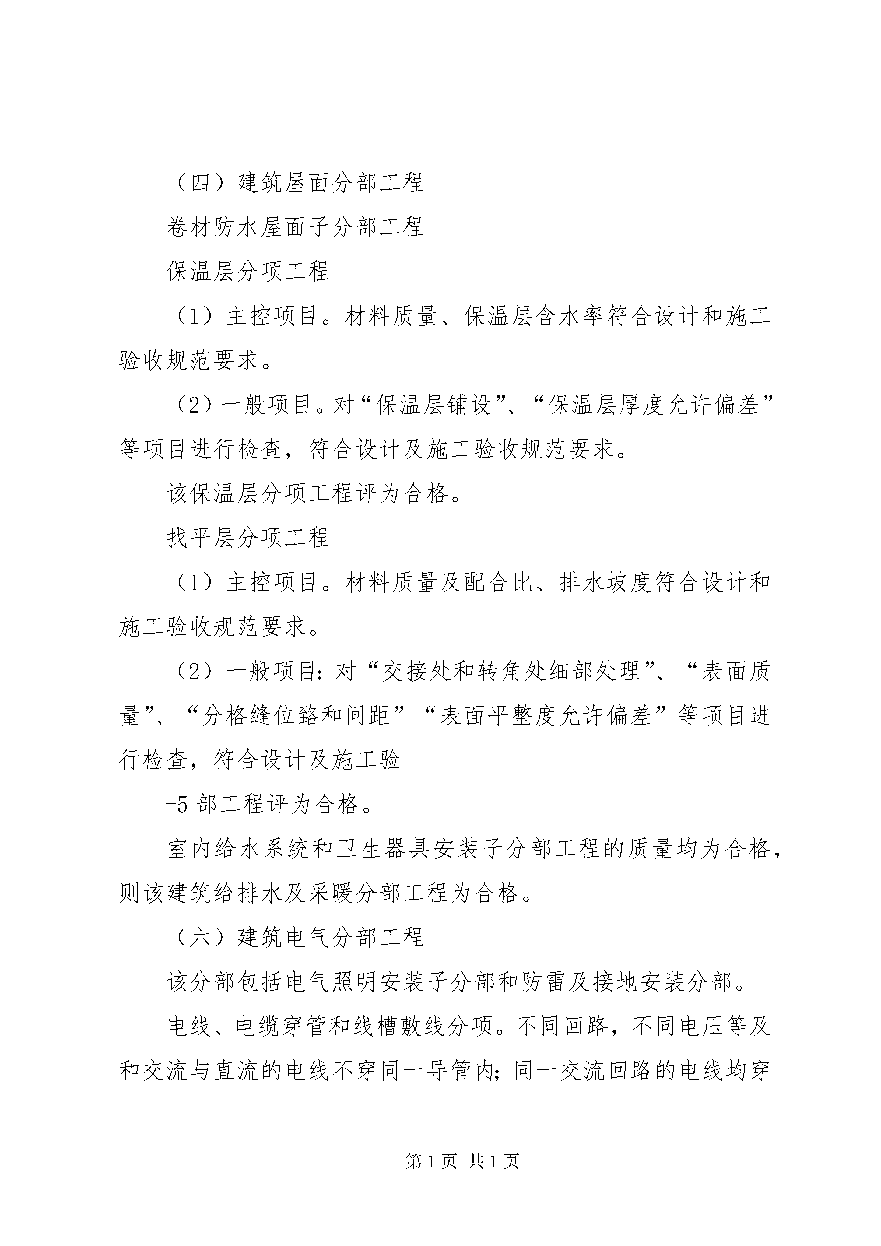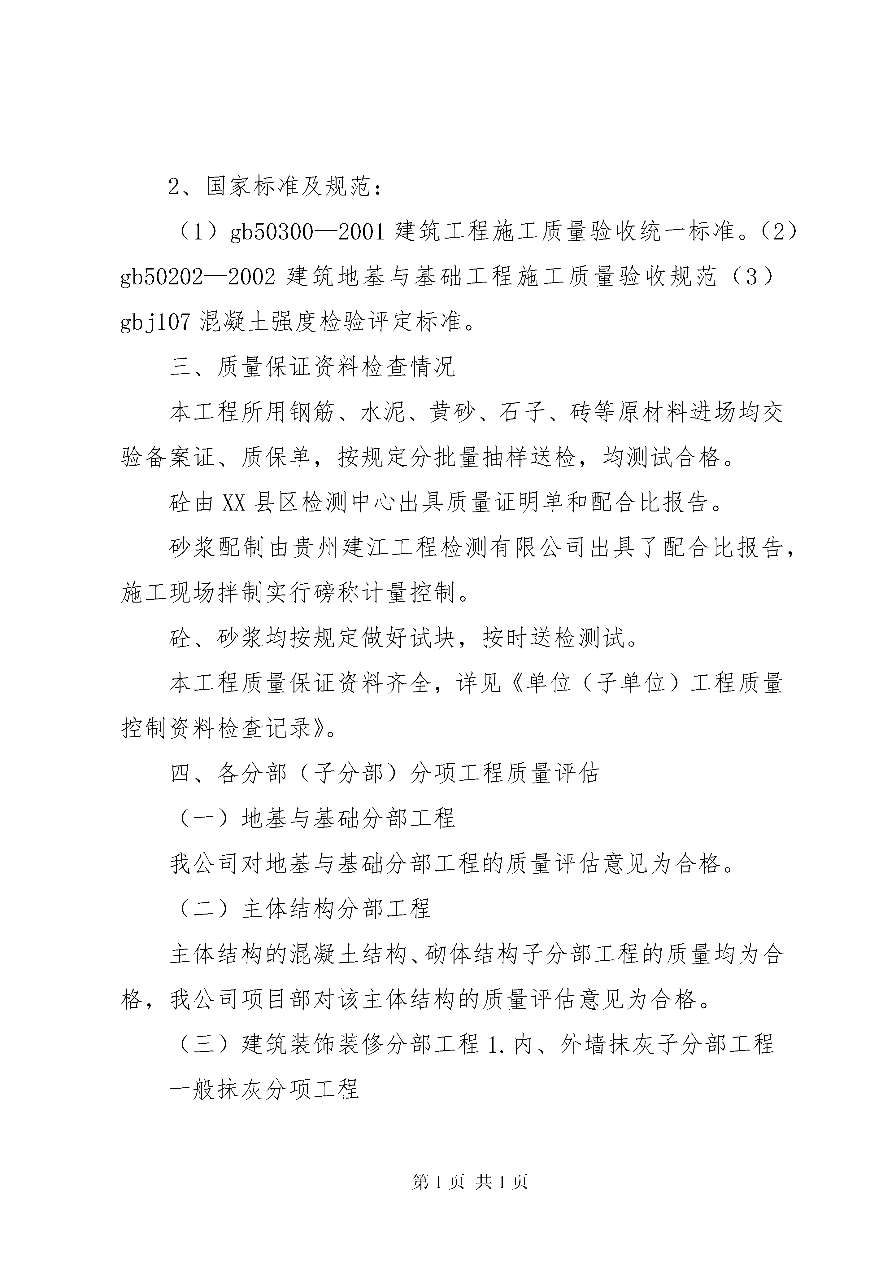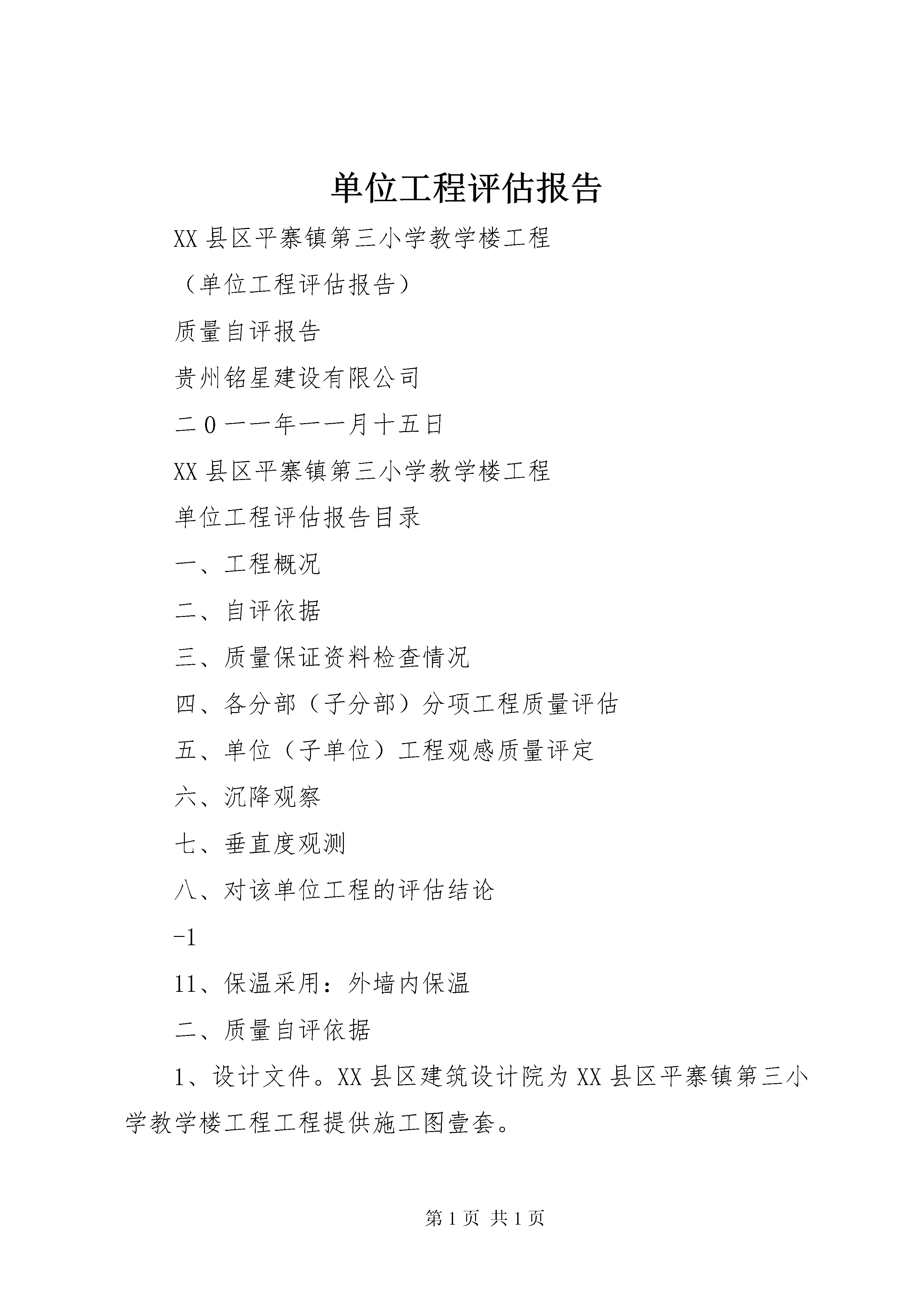 单位工程评估报告XX县区平寨镇第三小学教学楼工程(单位工程评估报告)质量自评报告贵州铭星建设有限公司二0一一年一一月十五日XX县区平寨镇第三小学教学楼工程单位工程评估报告目录一、工程概况二、自评依据三、质量保证资料检查情况四、各分部(子分部)分项工程质量评估五、单位(子单位)工程观感质量评定六、沉降观察七、垂直度观测八、对该单位工程的评估结论-111、保温采用:外墙内保温二、质量自评依据1、设计文件。XX县区建筑设计院为XX县区平寨镇第三小学教学楼工程工程提供施工图壹套。2、国家标准及规范:(1)gb50300—2001建筑工程施工质量验收统一标准。(2)gb50202—2002建筑地基与基础工程施工质量验收规范(3)gbj107混凝土强度检验评定标准。三、质量保证资料检查情况本工程所用钢筋、水泥、黄砂、石子、砖等原材料进场均交验备案证、质保单,按规定分批量抽样送检,均测试合格。砼由XX县区检测中心出具质量证明单和配合比报告。砂浆配制由贵州建江工程检测有限公司出具了配合比报告,施工现场拌制实行磅称计量控制。砼、砂浆均按规定做好试块,按时送检测试。本工程质量保证资料齐全,详见《单位(子单位)工程质量控制资料检查记录》。四、各分部(子分部)分项工程质量评估(一)地基与基础分部工程我公司对地基与基础分部工程的质量评估意见为合格。(二)主体结构分部工程主体结构的混凝土结构、砌体结构子分部工程的质量均为合格,我公司项目部对该主体结构的质量评估意见为合格。(三)建筑装饰装修分部工程1.内、外墙抹灰子分部工程一般抹灰分项工程(1)主控项目。基层表面、材料品种和性能、操作要求、层粘结及面层质量符合设计和施工验收规范要求。-3饰面砖粘贴分项工程(内墙)(1)主控项目。饰面砖质量、饰面砖粘贴材料、饰面砖粘贴、满粘法施工符合设计和施工验收规范要求。(2)一般项目。对“饰面砖表面质量”、“阴阳角及非套砖”、“墙面突出物周围”、“饰面砖接缝、填嵌、宽深”、“允许偏差”等项目进行检查,均符合设计及施工验收规范要求。该饰面砖粘贴分项工程评为合格,即饰面砖子分部工程评为合格。6.涂饰子分部工程涂料涂饰分项工程(外墙)(1)主控项目。涂料品种、型号、性能、涂饰颜色和图案、涂饰综合质量、基层处理符合设计和施工验收规范要求。(2)一般项目。对“颜色”、“泛碱、咬色”、“流坠、疙瘩”、“砂眼、刷纹”、“直线度”等项目进行检查,均符合设计及施工验收规范要求。该涂料涂饰分项工程评为合格,即涂饰子分部工程评为合格。建筑装饰装修分部中各分项工程的主控项目、一般项目均符合设计及施工验收规范要求,即建筑装饰装修分部工程的质量评为合格。(四)建筑屋面分部工程卷材防水屋面子分部工程保温层分项工程(1)主控项目。材料质量、保温层含水率符合设计和施工验收规范要求。(2)一般项目。对“保温层铺设”、“保温层厚度允许偏差”等项目进行检查,符合设计及施工验收规范要求。该保温层分项工程评为合格。找平层分项工程(1)主控项目。材料质量及配合比、排水坡度符合设计和施工验收规范要求。(2)一般项目:对“交接处和转角处细部处理”、“表面质量”、“分格缝位臵和间距”“表面平整度允许偏差”等项目进行检查,符合设计及施工验-5部工程评为合格。室内给水系统和卫生器具安装子分部工程的质量均为合格,则该建筑给排水及采暖分部工程为合格。(六)建筑电气分部工程该分部包括电气照明安装子分部和防雷及接地安装分部。电线、电缆穿管和线槽敷线分项。不同回路,不同电压等及和交流与直流的电线不穿同一导管内;同一交流回路的电线均穿于同一金属导管内,管内电线无接头。该分项检验批,主控项目和一般项目均达到合格,要求,所有检验批质量检查记录及施工操作依据完整。因此该分项工程质量评估合格。电气照明安装子分部包括照明配电箱安装、电气导管敷设,电线导管配线,导线连接和线路电气试验,普通灯具安装,插座开关安装和建筑照明通电试运行工程。插座开关风扇安装分项。不同规格和不能互换的插座配套的插头均按不同的电压等级区别使用。插座接线符合规范规定。插座开关产品合格证。出厂检测报告和复试报告均齐全。该分项检验批,主控项目和一般项目均达到合格要求,所有检验批质量记录及施工操作依据完整。因此该分项工程评估合格。建筑照通电试运行分项,照明系统通电、灯具回路控制与照明配电箱及回路的标识均一致,开关与灯具控制顺序相对应,通电连续试运行均起过24小时。该分项检验批,主控项目和一般项目均达到合格要求,所有检验批质量记录及施工操作依据完整。因此该分项工程评估合格。该子分部各项工程监理验收均合格,质量控制资料完整、齐全、功能检测及观感质量验收均符合要求。因此该子分项工程质量评估合格。防雷及接地安装子分部包括接地装臵分项、避雷引下线敷设分项,建筑物等电