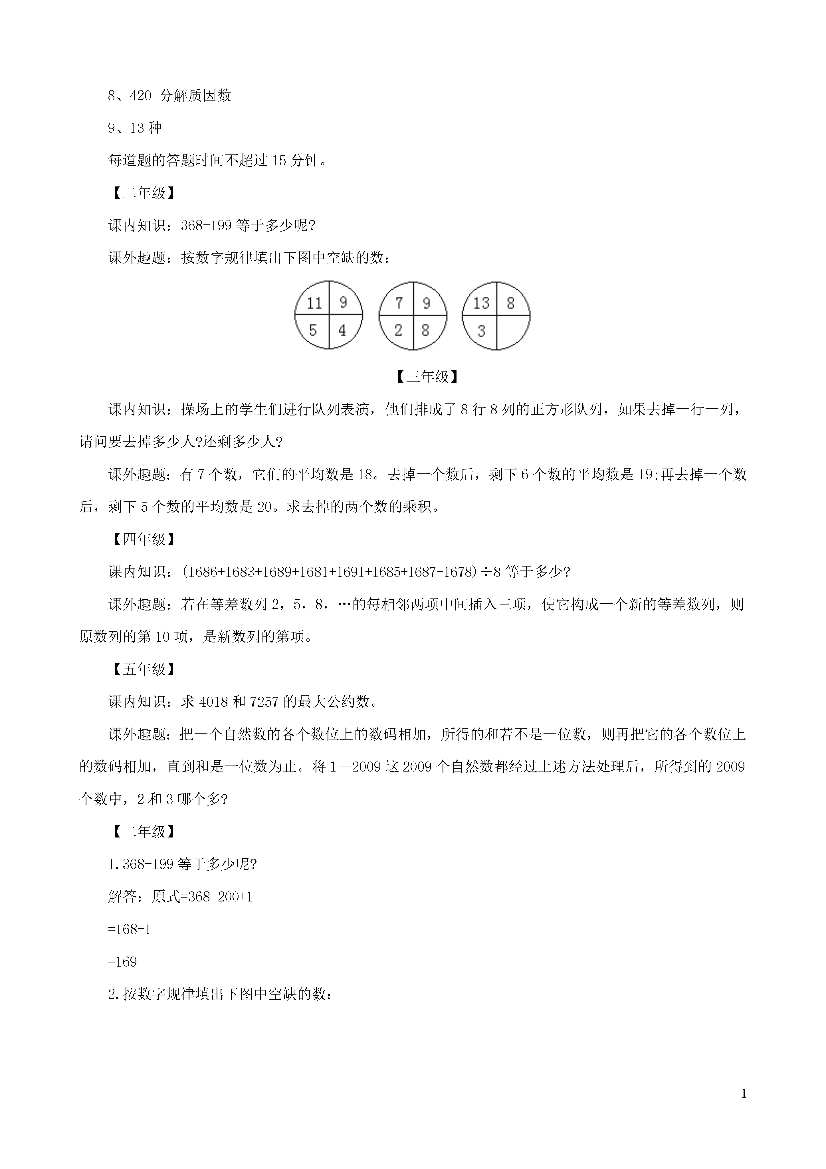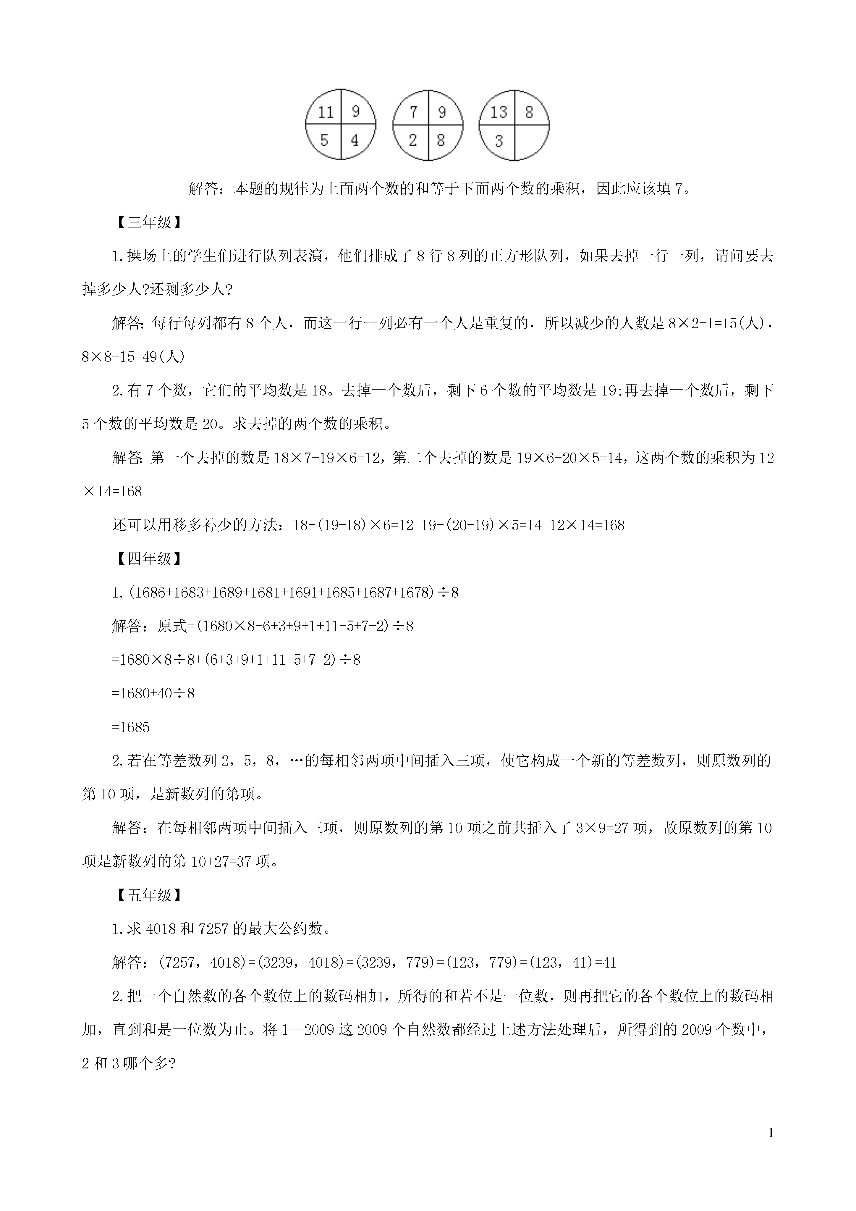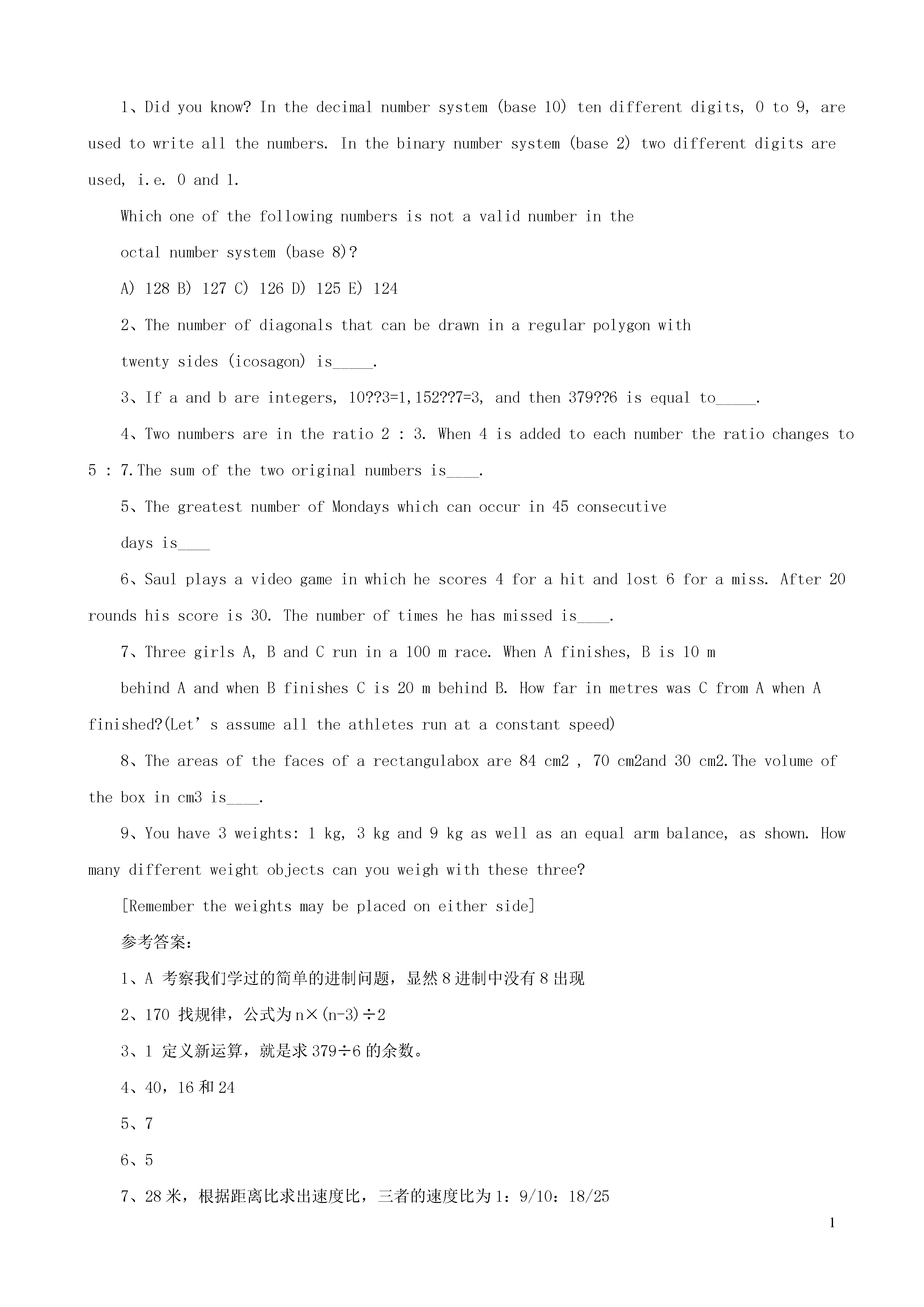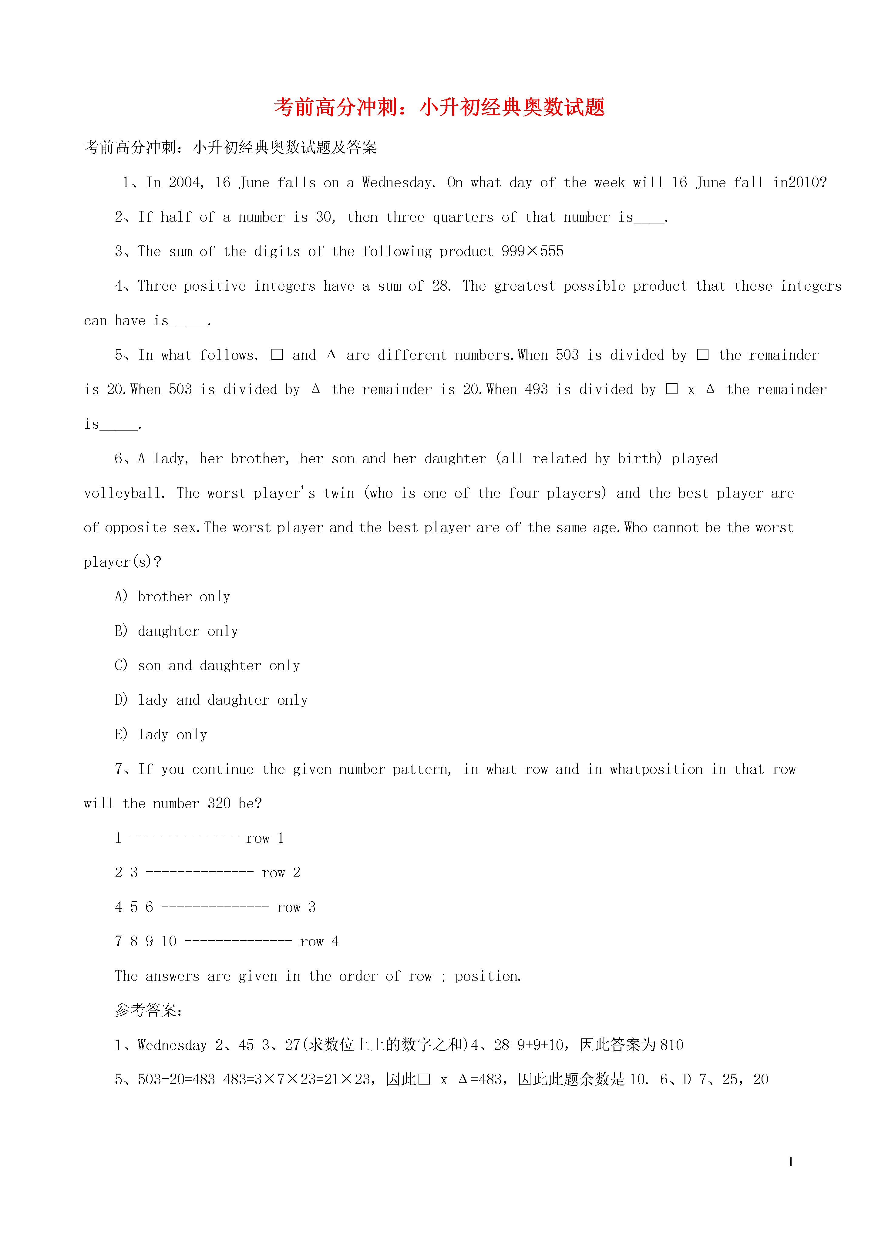 1考前高分冲刺:小升初经典奥数试题考前高分冲刺:小升初经典奥数试题及答案1、In2004,16JunefallsonaWednesday.Onwhatdayoftheweekwill16Junefallin2010?2、Ifhalfofanumberis30,thenthree-quartersofthatnumberis____.3、Thesumofthedigitsofthefollowingproduct999×5554、Threepositiveintegershaveasumof28.Thegreatestpossibleproductthattheseintegerscanhaveis_____.5、Inwhatfollows,□andΔaredifferentnumbers.When503isdividedby□theremainderis20.When503isdividedbyΔtheremainderis20.When493isdividedby□xΔtheremainderis_____.6、Alady,herbrother,hersonandherdaughter(allrelatedbybirth)playedvolleyball.Theworstplayer'stwin(whoisoneofthefourplayers)andthebestplayerareofoppositesex.Theworstplayerandthebestplayerareofthesameage.Whocannotbetheworstplayer(s)?A)brotheronlyB)daughteronlyC)sonanddaughteronlyD)ladyanddaughteronlyE)ladyonly7、Ifyoucontinuethegivennumberpattern,inwhatrowandinwhatpositioninthatrowwillthenumber320be?1--------------row123--------------row2456--------------row378910--------------row4Theanswersaregivenintheorderofrow;position.参考答案:1、Wednesday2、453、27(求数位上上的数字之和)4、28=9+9+10,因此答案为8105、503-20=483483=3×7×23=21×23,因此□xΔ=483,因此此题余数是10.6、D7、25,201、Didyouknow?Inthedecimalnumbersystem(base10)tendifferentdigits,0to9,areusedtowriteallthenumbers.Inthebinarynumbersystem(base2)twodifferentdigitsareused,i.e.0and1.Whichoneofthefollowingnumbersisnotavalidnumberintheoctalnumbersystem(base8)?A)128B)127C)126D)125E)1242、Thenumberofdiagonalsthatcanbedrawninaregularpolygonwithtwentysides(icosagon)is_____.3、Ifaandbareintegers,10??3=1,152??7=3,andthen379??6isequalto_____.4、Twonumbersareintheratio2:3.When4isaddedtoeachnumbertheratiochangesto5:7.Thesumofthetwooriginalnumbersis____.5、ThegreatestnumberofMondayswhichcanoccurin45consecutivedaysis____6、Saulplaysavideogameinwhichhescores4forahitandlost6foramiss.After20roundshisscoreis30.Thenumberoftimeshehasmissedis____.7、ThreegirlsA,BandCrunina100mrace.WhenAfinishes,Bis10mbehindAandwhenBfinishesCis20mbehindB.HowfarinmetreswasCfromAwhenAfinished?(Let’sassumeall