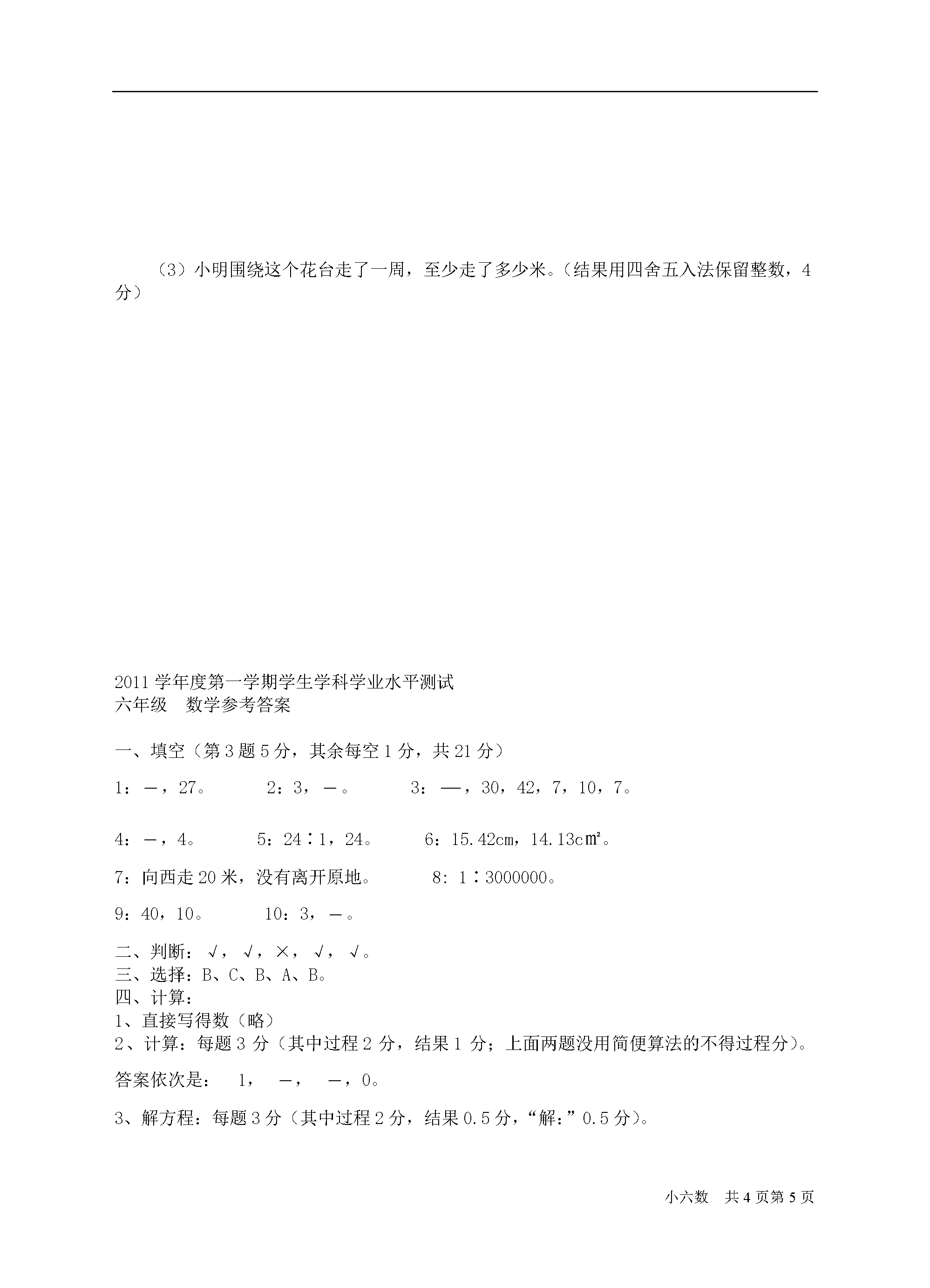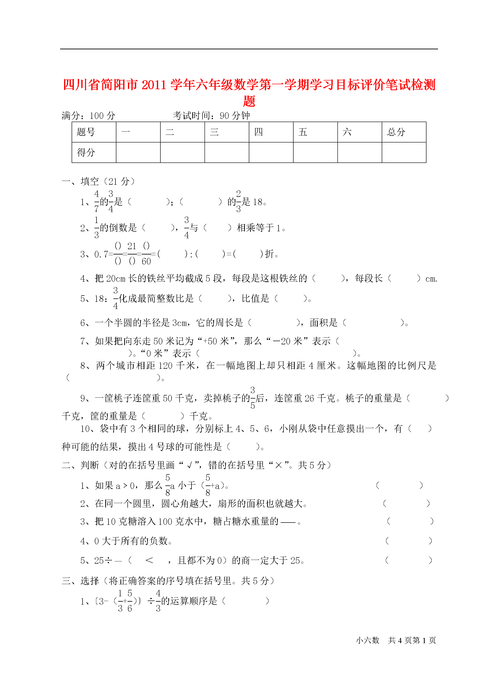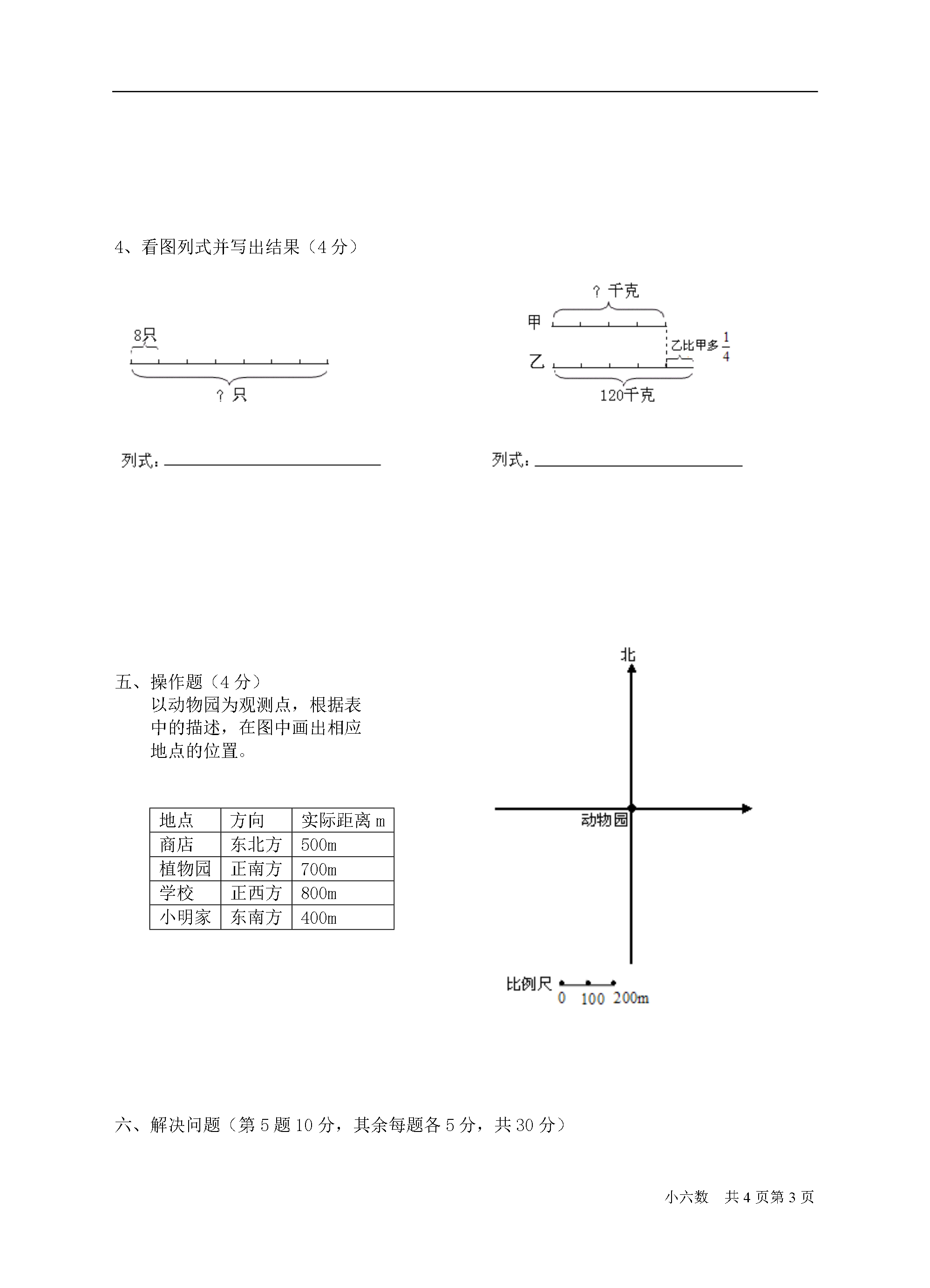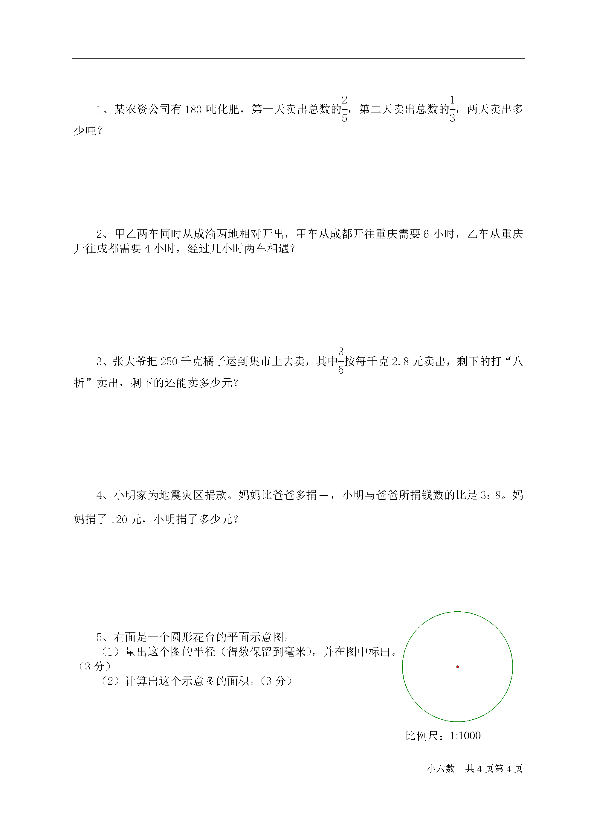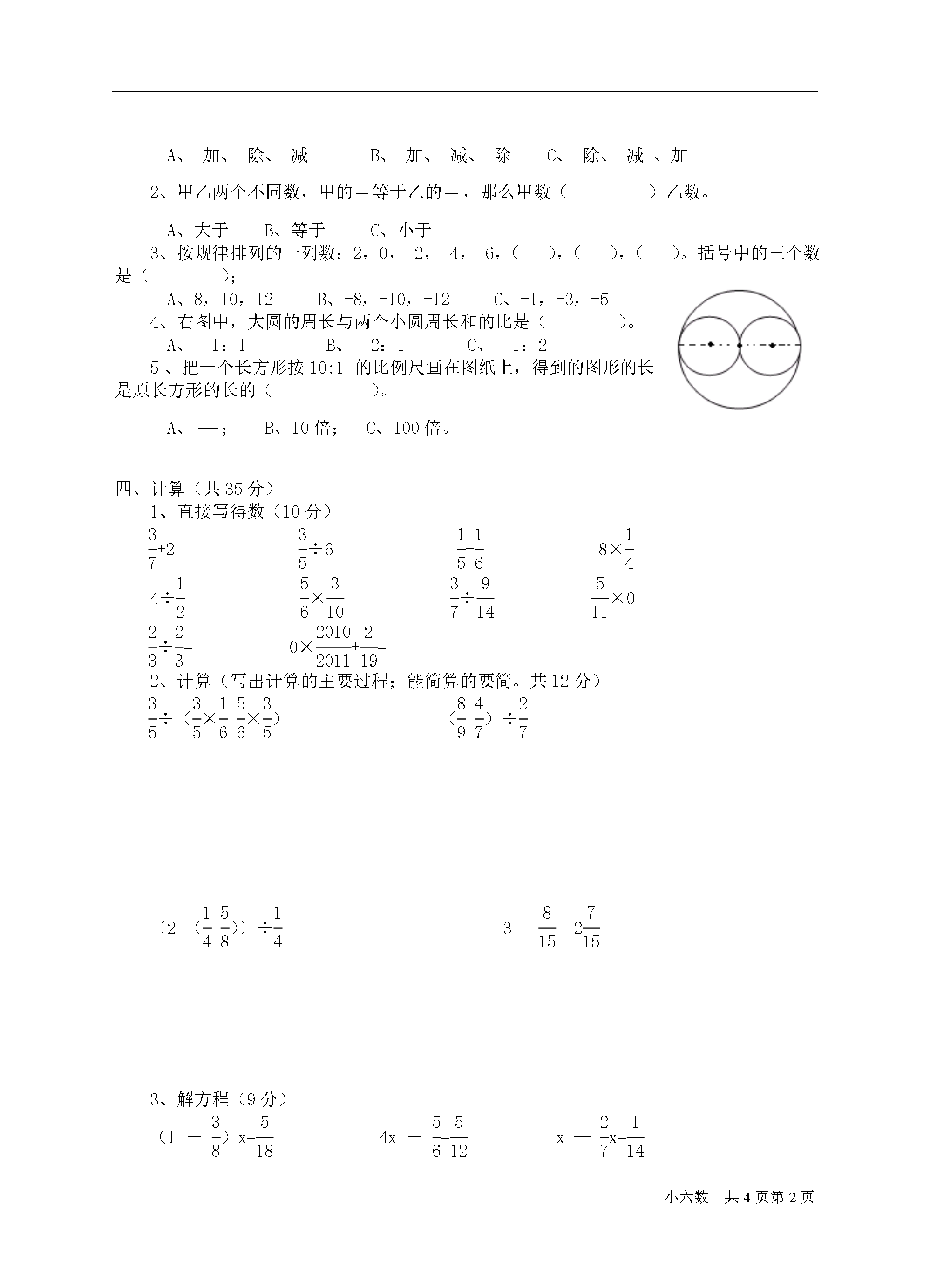小六数四川省简阳市2011学年六年级数学第一学期学习目标评价笔试检测题满分:100分考试时间:90分钟题号一二三四五六总分得分一、填空(21分)1、EQ\F(4,7)的EQ\F(3,4)是();()的EQ\F(2,3)是18。2、EQ\F(1,3)的倒数是(),EQ\F(3,4)与()相乘等于1。3、0.7=EQ\F((),())=EQ\F(21,())=EQ\F((),60)=():()=()折。4、把20cm长的铁丝平均截成5段,每段是这根铁丝的(),每段长()cm.5、18:EQ\F(3,4)化成最简整数比是(),比值是()。6、一个半圆的半径是3cm,它的周长是(),面积是()。7、如果把向东走50米记为“+50米”,那么“-20米”表示()。“0米”表示()。8、两个城市相距120千米,在一幅地图上却只相距4厘米。这幅地图的比例尺是()。9、一筐桃子连筐重50千克,卖掉桃子的EQ\F(3,5)后,连筐重26千克。桃子的重量是()千克,筐的重量是()千克。10、袋中有3个相同的球,分别标上4、5、6,小刚从袋中任意摸出一个,有()种可能的结果,摸出4号球的可能性是()。二、判断(对的在括号里画“√”,错的在括号里“×”。共5分)1、如果a﹥0,那么EQ\F(5,8)a小于(EQ\F(5,8)+a)。()2、在同一个圆里,圆心角越大,扇形的面积也就越大。()3、把10克糖溶入100克水中,糖占糖水重量的。()4、0大于所有的负数。()5、25÷(<,且都不为0)的商一定大于25。()三、选择(将正确答案的序号填在括号里。共5分)1、〔3-(EQ\F(1,3)+EQ\F(5,6))〕÷EQ\F(4,3)的运算顺序是()A、加、除、减B、加、减、除C、除、减、加2、甲乙两个不同数,甲的等于乙的,那么甲数()乙数。A、大于B、等于C、小于3、按规律排列的一列数:2,0,-2,-4,-6,(),(),()。括号中的三个数是();A、8,10,12B、-8,-10,-12C、-1,-3,-54、右图中,大圆的周长与两个小圆周长和的比是()。A、1:1B、2:1C、1:25、把一个长方形按10:1的比例尺画在图纸上,得到的图形的长是原长方形的长的()。A、;B、10倍;C、100倍。四、计算(共35分)1、直接写得数(10分)EQ\F(3,7)+2=EQ\F(3,5)÷6=EQ\F(1,5)-EQ\F(1,6)=8×EQ\F(1,4)=4÷EQ\F(1,2)=EQ\F(5,6)×EQ\F(3,10)=EQ\F(3,7)÷EQ\F(9,14)=EQ\F(5,11)×0=EQ\F(2,3)÷EQ\F(2,3)=0×EQ\F(2010,2011)+EQ\F(2,19)=2、计算(写出计算的主要过程;能简算的要简。共12分)EQ\F(3,5)÷(EQ\F(3,5)×EQ\F(1,6)+EQ\F(5,6)×EQ\F(3,5))(EQ\F(8,9)+EQ\F(4,7))÷EQ\F(2,7)〔2-(EQ\F(1,4)+EQ\F(5,8))〕÷EQ\F(1,4)3-EQ\F(8,15)—2EQ\F(7,15)3、解方程(9分)(1-EQ\F(3,8))x=EQ\F(5,18)4x-EQ\F(5,6)=EQ\F(5,12)x—EQ\F(2,7)x=EQ\F(1,14)4、看图列式并写出结果(4分)五、操作题(4分)以动物园为观测点,根据表中的描述,在图中画出相应地点的位置。地点方向实际距离m商店东北方500m植物园正南方700m学校正西方800m小明家东南方400m六、解决问题(第5题10分,其余每题各5分,共30分)1、某农资公司有180吨化肥,第一天卖出总数的EQ\F(2,5),第二天卖出总数的EQ\F(1,3),两天卖出多少吨?2、甲乙两车同时从成渝两地相对开出,甲车从成都开往重庆需要6小时,乙车从重庆开往成都需要4小时,经过几小时两车相遇?3、张大爷把250千克橘子运到集市上去卖,其中EQ\F(3,5)按每千克2.8元卖出,剩下的打“八折”卖出,剩下的还能卖多少元?4、小明家为地震灾区捐款。妈妈比爸爸多捐,小明与爸爸所捐钱数的比是3:8。妈妈捐了120元,小明捐了多少元?比例尺:1:10005、右面是一个圆形花台的平面示意图。(1)量出这个图的半径(得数保留到毫米),并在图中标出。(3分)(2)计算出这个示意图的面积。(3分)(3)小明