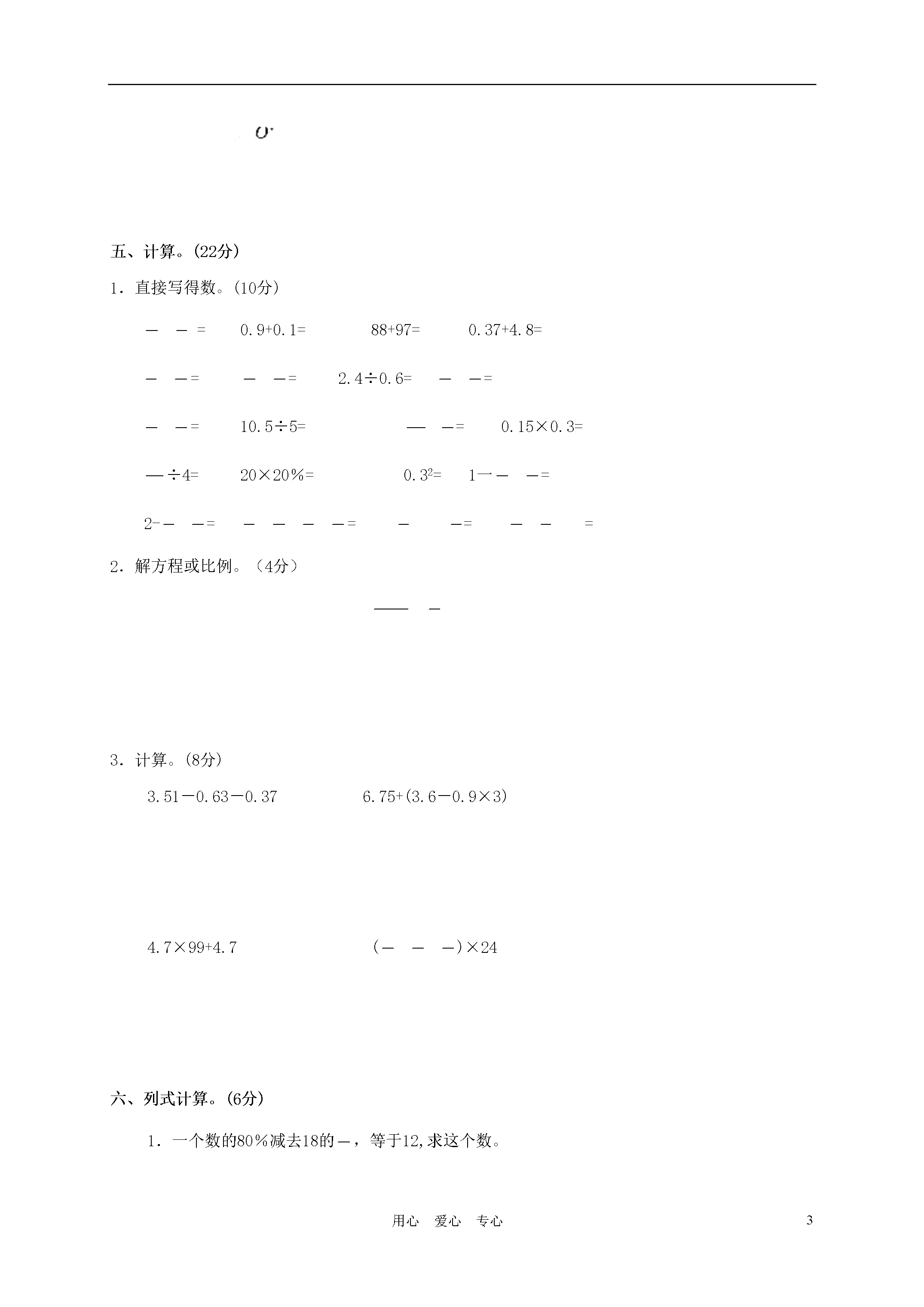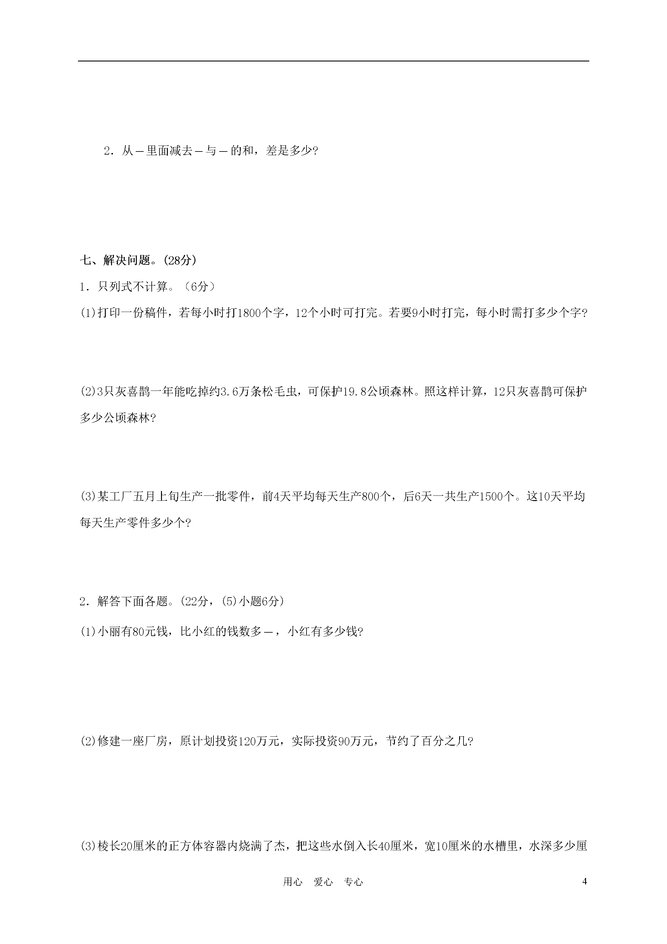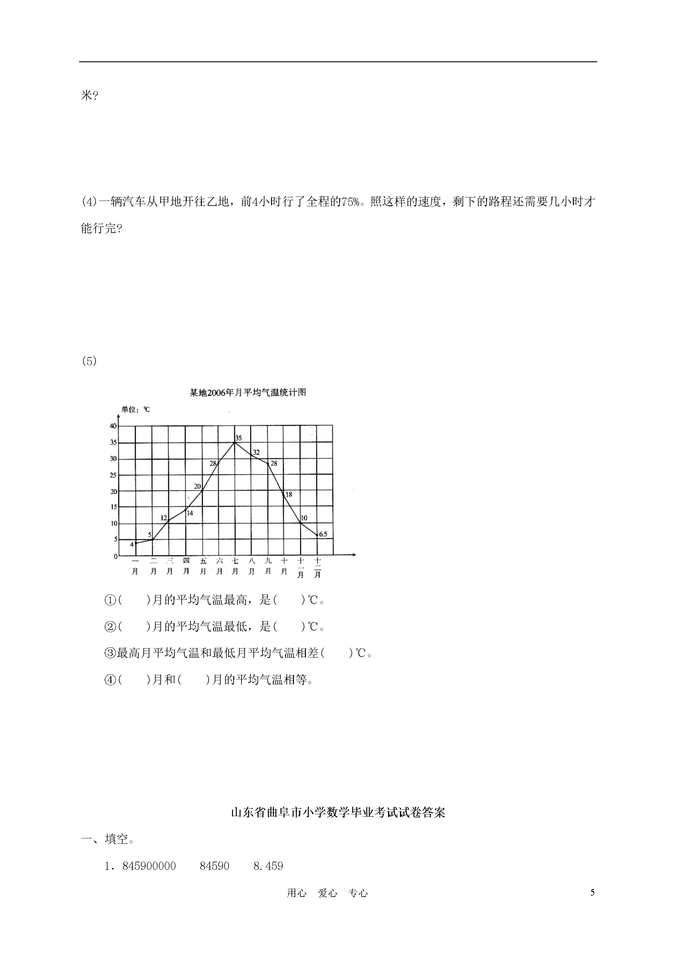 9用心爱心专心山东省曲阜市小学数学毕业考试试卷班级_____姓名_____得分_____一、填空。(20分)1.八亿四千五百九十万写作(),将这个数改写成用“万”作单位的数是()万,省略亿位后面的尾数约是()亿。2.分数单位是的最大真分数是(),再添上()个这样的单位就可以得到最小的质数。3.4.6吨=()千克0.25时=()分4.和()的乘积是1,它们互为()。5.8:5==120÷()=()%=()(填小数)6.一件衣服打了八折后卖168元钱,这件衣服原价是()元。7.正方形的周长和边长成()比例。8.63的是()()的是459.一个零件长5毫米,在一张图纸上画了10厘米,这张图纸的比例尺是()。10.=2×2×3,b=2×3×3,那么和b的最大公约数是(),最小公倍数是()。二、判断。(10分)1.:的比值是3:2。()2.不能化成有限小数。()3.既可以看作分数,也可以看作比。()4.边长是4厘米的正方形,它的周长和面积相等。()5.1米的40%是40%米。()6.整数加、减法的意义对于小数加、减法和分数加、减法同样适用。()7.因为,所以和的大小和分数单位都相同。()8.10克盐放入l00克水中,盐与盐水的比是1:10。()9.等底等高的圆锥体积比圆柱体积少。()10.所有的平行四边形都不是对称图形。()三、选择。(10分)1.如果是假分数,那么()。①大于11②小于11③大于或等于112.1是()。①质数②合数③自然数3.角的两条边是()。①直线②线段③射线4.把5吨煤平均分成8份,每份的重量是()。①②吨③④吨5.圆的周长和直径()。①不成比例②成正比例③成反比例6.一个圆柱体和一个圆锥体底面积和体积分别相等,已知圆锥的高是9厘米,那么圆柱的高是()。①3厘米②9厘米③27厘米7.A,B两圆直径的比是3:1,A,B两圆面积的比是()。①3:1②9:3③6:2④9:18.2.445保留一位小数是()。①2.5②2.0③2.49.一根铁丝长l0米,剪去2米,剪去的是剩下的()。①20%②25%③80%10.下列不是轴对称图形的是()。①长方形②平行四边形③等腰梯形④正三角形四、操作。(4分)1.以顶点A的对边为底,画出三角形的高,并标出高和直角。2.以指定的一点。为圆心,以1.5厘米为半径画一个圆。并用字母、d分别标出半径和直径。五、计算。(22分)1.直接写得数。(10分)=0.9+0.1=88+97=0.37+4.8===2.4÷0.6===10.5÷5==0.15×0.3=÷4=20×20%=0.32=1一=2-====2.解方程或比例。(4分)3.计算。(8分)3.51-0.63-0.376.75+(3.6-0.9×3)4.7×99+4.7()×24六、列式计算。(6分)1.一个数的80%减去18的,等于12,求这个数。2.从里面减去与的和,差是多少?七、解决问题。(28分)1.只列式不计算。(6分)(1)打印一份稿件,若每小时打1800个字,12个小时可打完。若要9小时打完,每小时需打多少个字?(2)3只灰喜鹊一年能吃掉约3.6万条松毛虫,可保护19.8公顷森林。照这样计算,12只灰喜鹊可保护多少公顷森林?(3)某工厂五月上旬生产一批零件,前4天平均每天生产800个,后6天一共生产1500个。这10天平均每天生产零件多少个?2.解答下面各题。(22分,(5)小题6分)(1)小丽有80元钱,比小红的钱数多,小红有多少钱?(2)修建一座厂房,原计划投资120万元,实际投资90万元,节约了百分之几?(3)棱长20厘米的正方体容器内烧满了杰,把这些水倒入长40厘米,宽10厘米的水槽里,水深多少厘米?(4)一辆汽车从甲地开往乙地,前4小时行了全程的75%。照这样的速度,剩下的路程还需要几小时才能行完?(5)①()月的平均气温最高,是()℃。②()月的平均气温最低,是()℃。③最高月平均气温和最低月平均气温相差()℃。④()月和()月的平均气温相等。山东省曲阜市小学数学毕业考试试卷答案一、填空。1.845900000845908.4592.113.4600154.倒数5.48751601.66.2107.正8.35559.20:110.636二、判断。1.×2.×3.√4.×5.×6.√7.×8.×9.×10.×三、选择。1.③2.③3.③4.④5.②6.①7.④8.③9.②l0.②四、操作。1.2.五、计算。1.ll855.17142.10.04540.09132.3(一5)=8.42解:3一15=8.43=8.4+15=7.8解:5=9×0.25=2.25÷5=0.453.3.51—0.63—0.37=3.51(0.63+0.37)=3.511=2.516.75÷(3.60.9×3)=6.75÷(3.62,