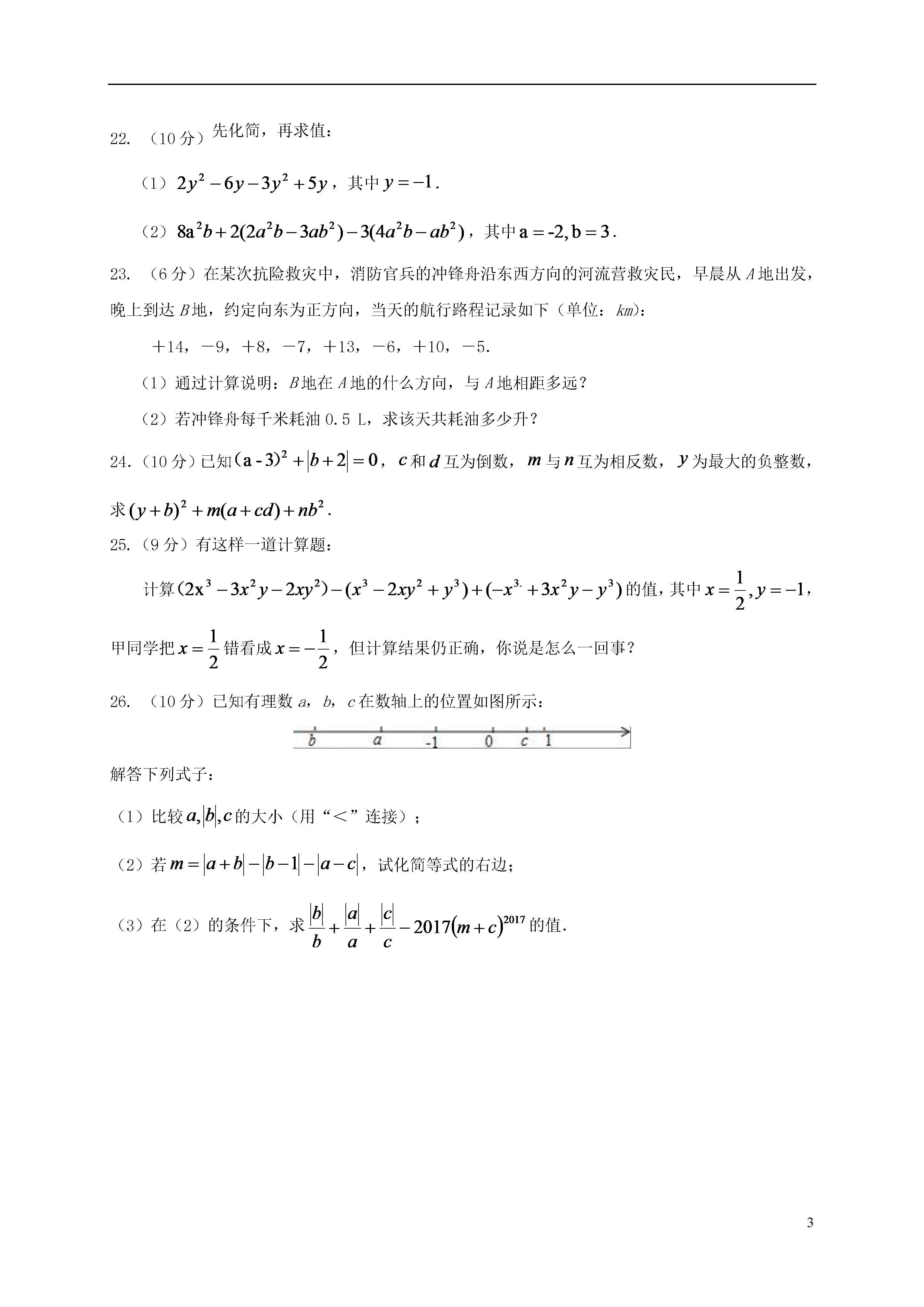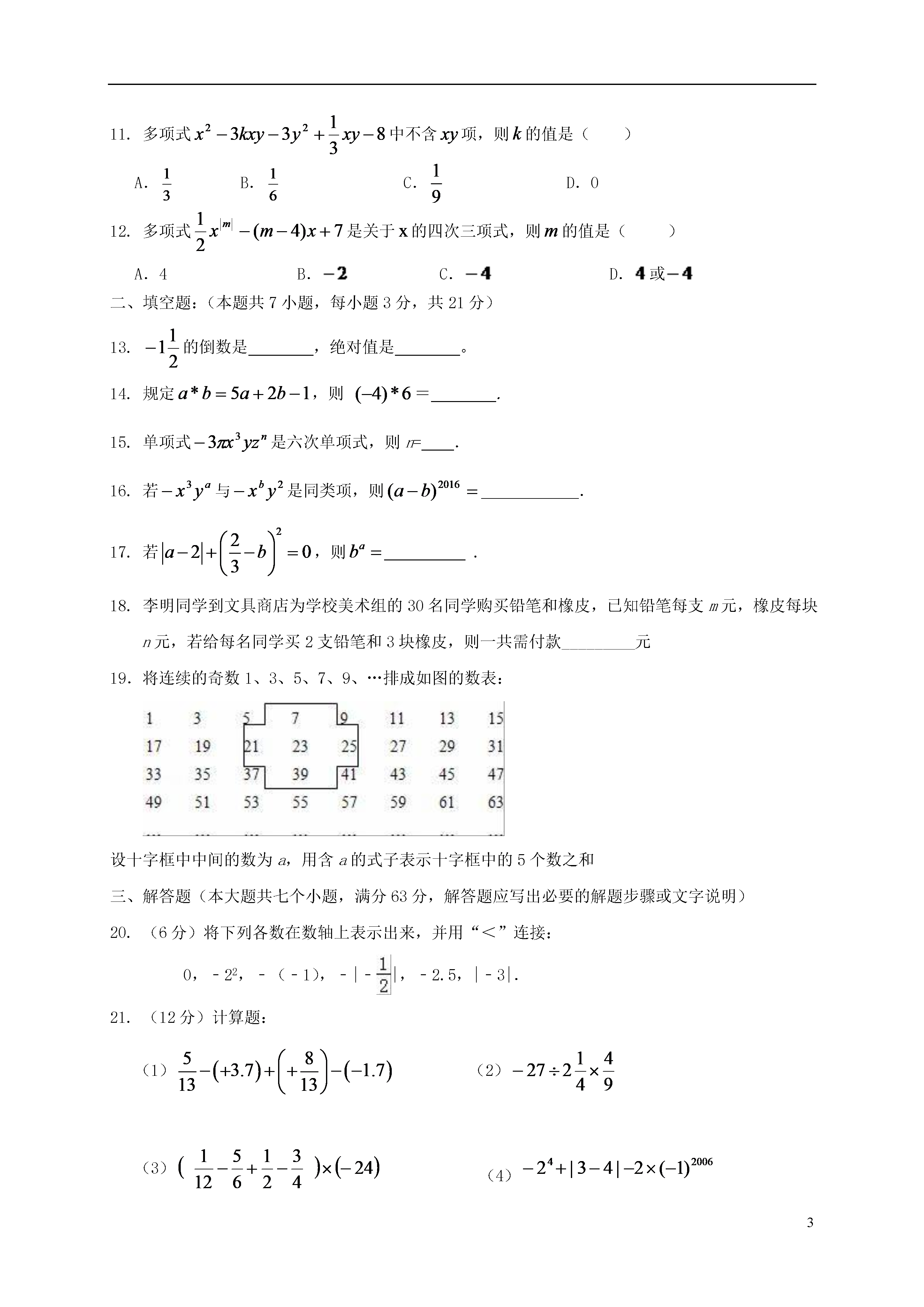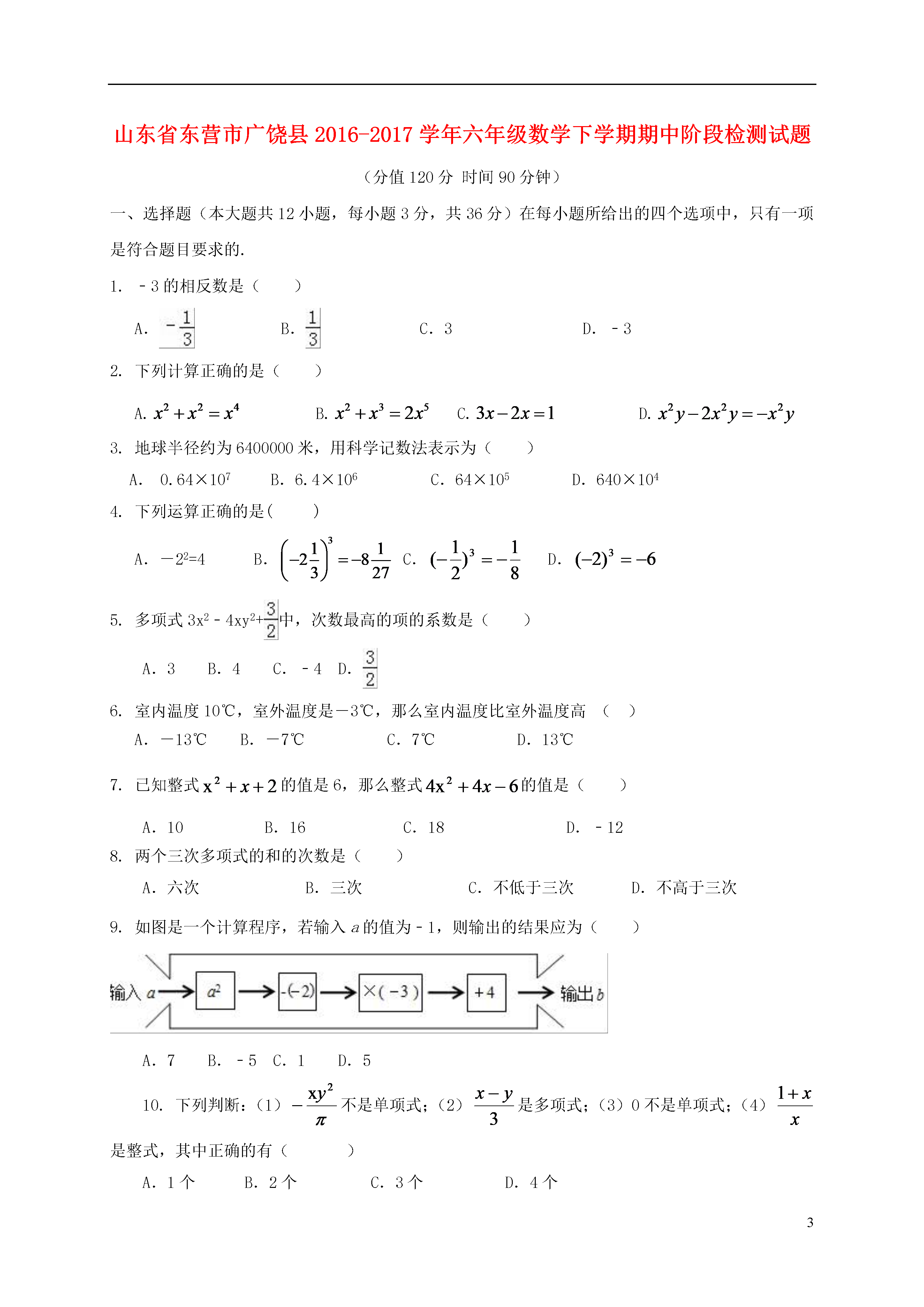 3山东省东营市广饶县2016-2017学年六年级数学下学期期中阶段检测试题(分值120分时间90分钟)一、选择题(本大题共12小题,每小题3分,共36分)在每小题所给出的四个选项中,只有一项是符合题目要求的.1.﹣3的相反数是()A.B.C.3D.﹣32.下列计算正确的是()A.B.C.D.3.地球半径约为6400000米,用科学记数法表示为()A.0.64×107B.6.4×106C.64×105D.640×1044.下列运算正确的是()A.-22=4B.C.D.5.多项式3x2﹣4xy2+中,次数最高的项的系数是()A.3B.4C.﹣4D.6.室内温度10℃,室外温度是-3℃,那么室内温度比室外温度高()A.-13℃B.-7℃C.7℃D.13℃7.已知整式的值是6,那么整式的值是()A.10B.16C.18D.﹣128.两个三次多项式的和的次数是()A.六次B.三次C.不低于三次D.不高于三次9.如图是一个计算程序,若输入a的值为﹣1,则输出的结果应为()A.7B.﹣5C.1D.510.下列判断:(1)不是单项式;(2)是多项式;(3)0不是单项式;(4)是整式,其中正确的有()A.1个B.2个C.3个D.4个11.多项式中不含项,则的值是()A.B.C.D.012.多项式是关于的四次三项式,则的值是()A.4B.C.D.或二、填空题:(本题共7小题,每小题3分,共21分)13.的倒数是,绝对值是。14.规定,则=.15.单项式是六次单项式,则n=.16.若与是同类项,则.17.若,则.18.李明同学到文具商店为学校美术组的30名同学购买铅笔和橡皮,已知铅笔每支m元,橡皮每块n元,若给每名同学买2支铅笔和3块橡皮,则一共需付款_________元19.将连续的奇数1、3、5、7、9、…排成如图的数表:设十字框中中间的数为a,用含a的式子表示十字框中的5个数之和三、解答题(本大题共七个小题,满分63分,解答题应写出必要的解题步骤或文字说明)20.(6分)将下列各数在数轴上表示出来,并用“<”连接:0,﹣22,﹣(﹣1),﹣|﹣|,﹣2.5,|﹣3|.21.(12分)计算题:(1)(2)(3)(4)22.(10分)先化简,再求值:(1),其中.(2),其中.23.(6分)在某次抗险救灾中,消防官兵的冲锋舟沿东西方向的河流营救灾民,早晨从A地出发,晚上到达B地,约定向东为正方向,当天的航行路程记录如下(单位:km):+14,-9,+8,-7,+13,-6,+10,-5.(1)通过计算说明:B地在A地的什么方向,与A地相距多远?(2)若冲锋舟每千米耗油0.5L,求该天共耗油多少升?24.(10分)已知,和互为倒数,与互为相反数,为最大的负整数,求.25.(9分)有这样一道计算题:计算的值,其中,甲同学把错看成,但计算结果仍正确,你说是怎么一回事?26.(10分)已知有理数a,b,c在数轴上的位置如图所示:解答下列式子:(1)比较的大小(用“<”连接);(2)若,试化简等式的右边;(3)在(2)的条件下,求的值.选择题1.C2.D3.B4.C5.C6.D7.A8.D9.B10.A11.C12.C二、填空题13.14.-915.216.117.18.(2m+3n)19.5a三、解答题20、在数轴上表示略21.(1)-1(2)(3)24(4)-1722.(1)原式=(2)原式=23.(1)B地在A地正东方向,相距18千米(2)耗油36升24.原式=925.原式=,与x无关,所以计算结果仍正确26.(1)(2)(3)原式=2016