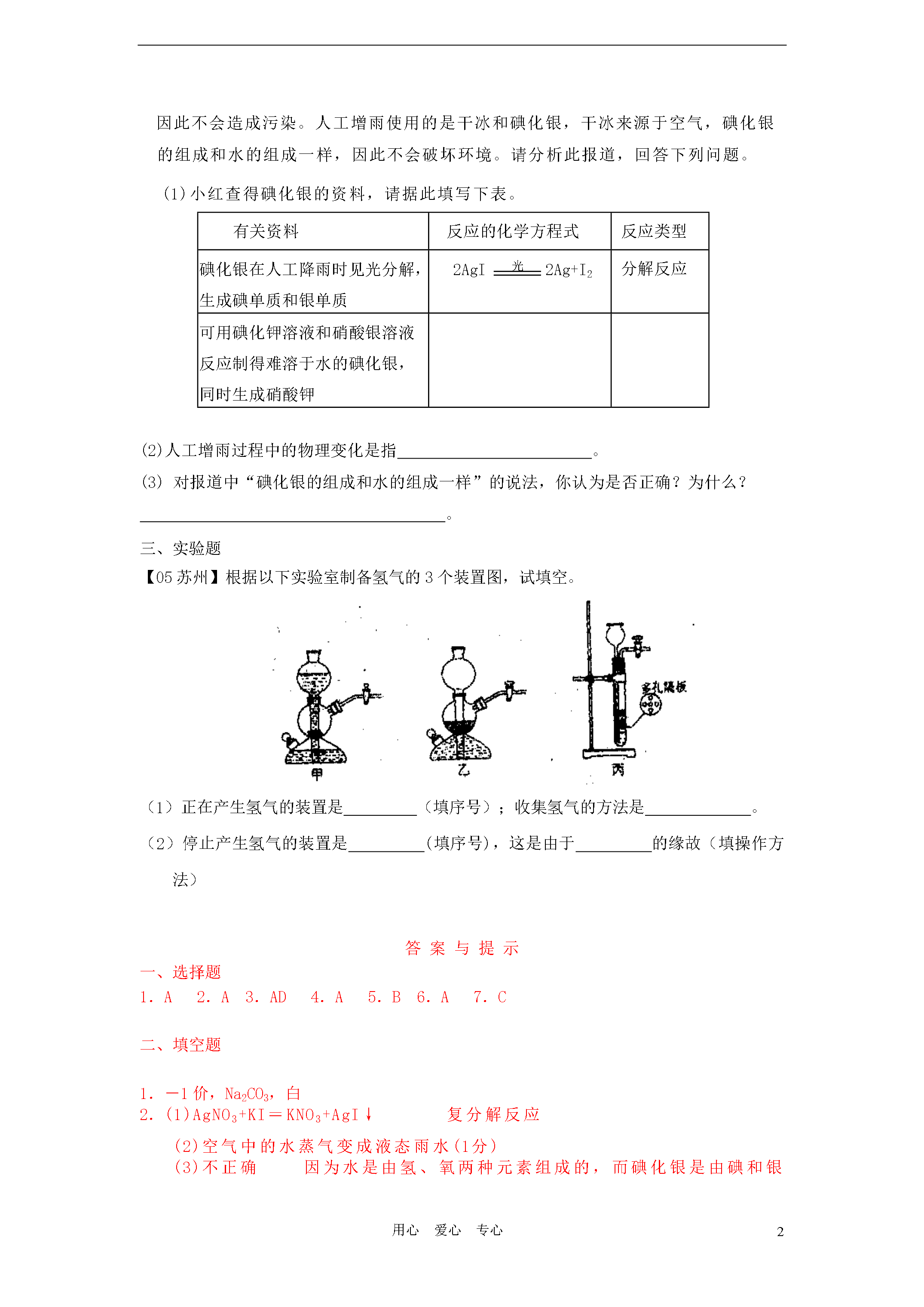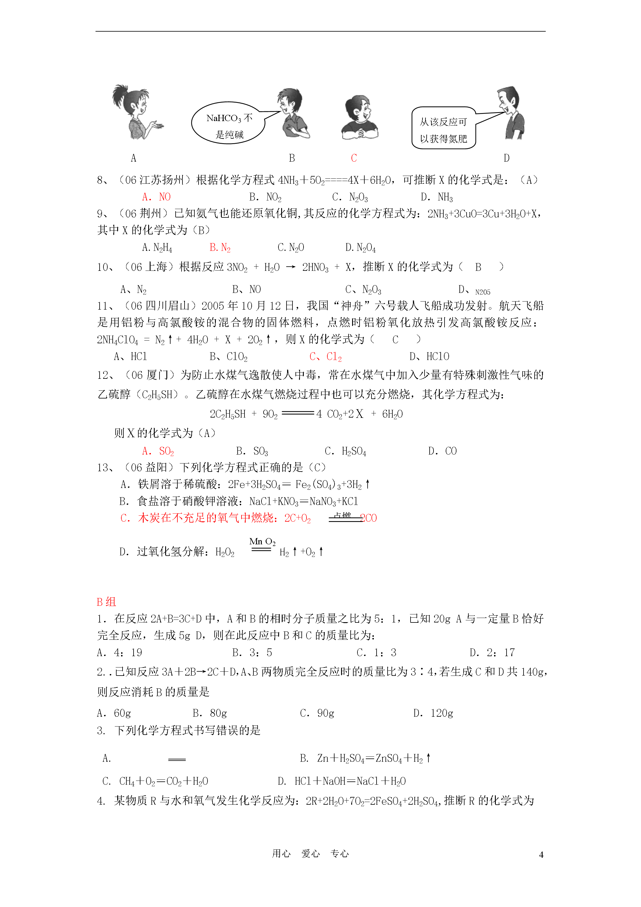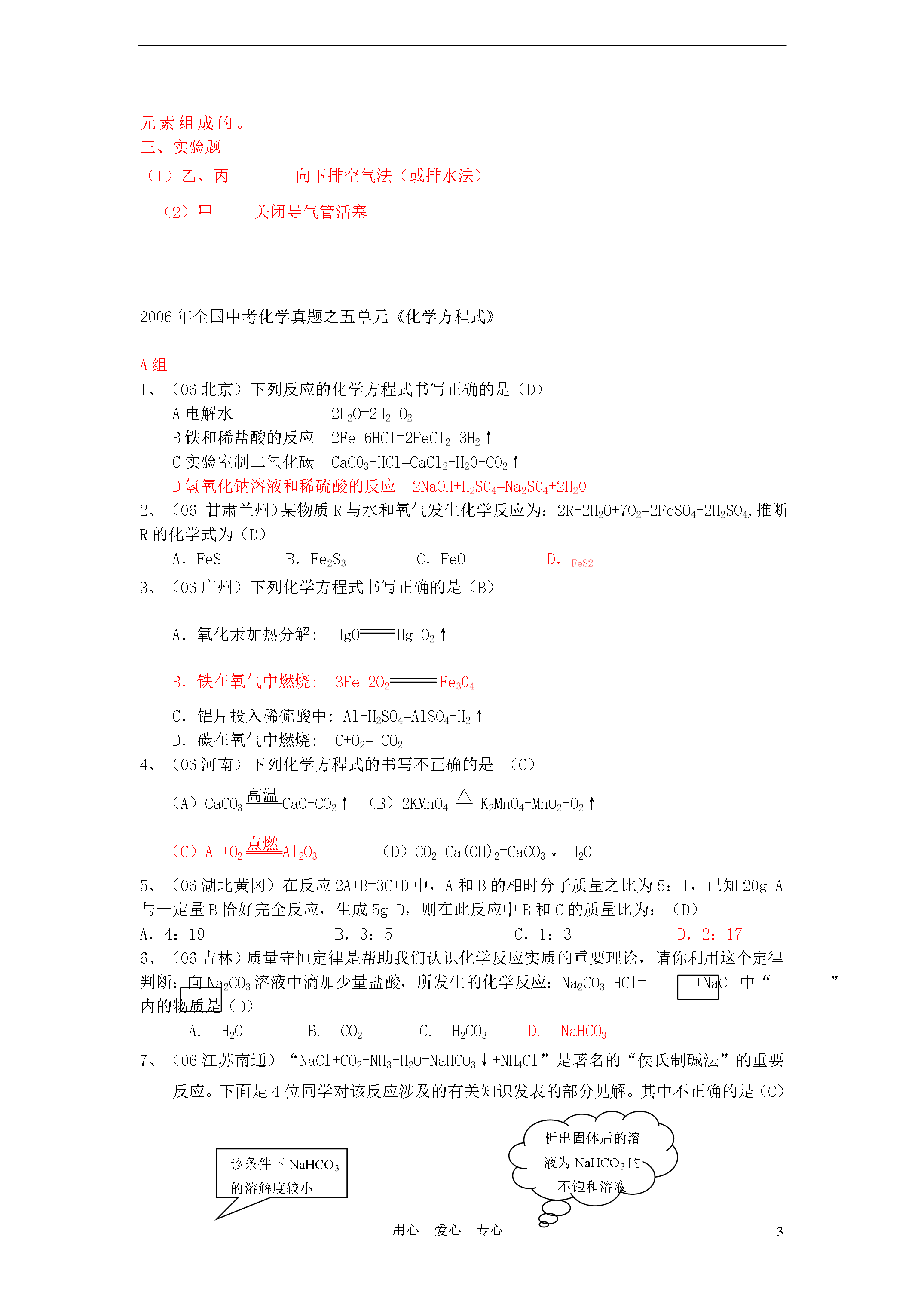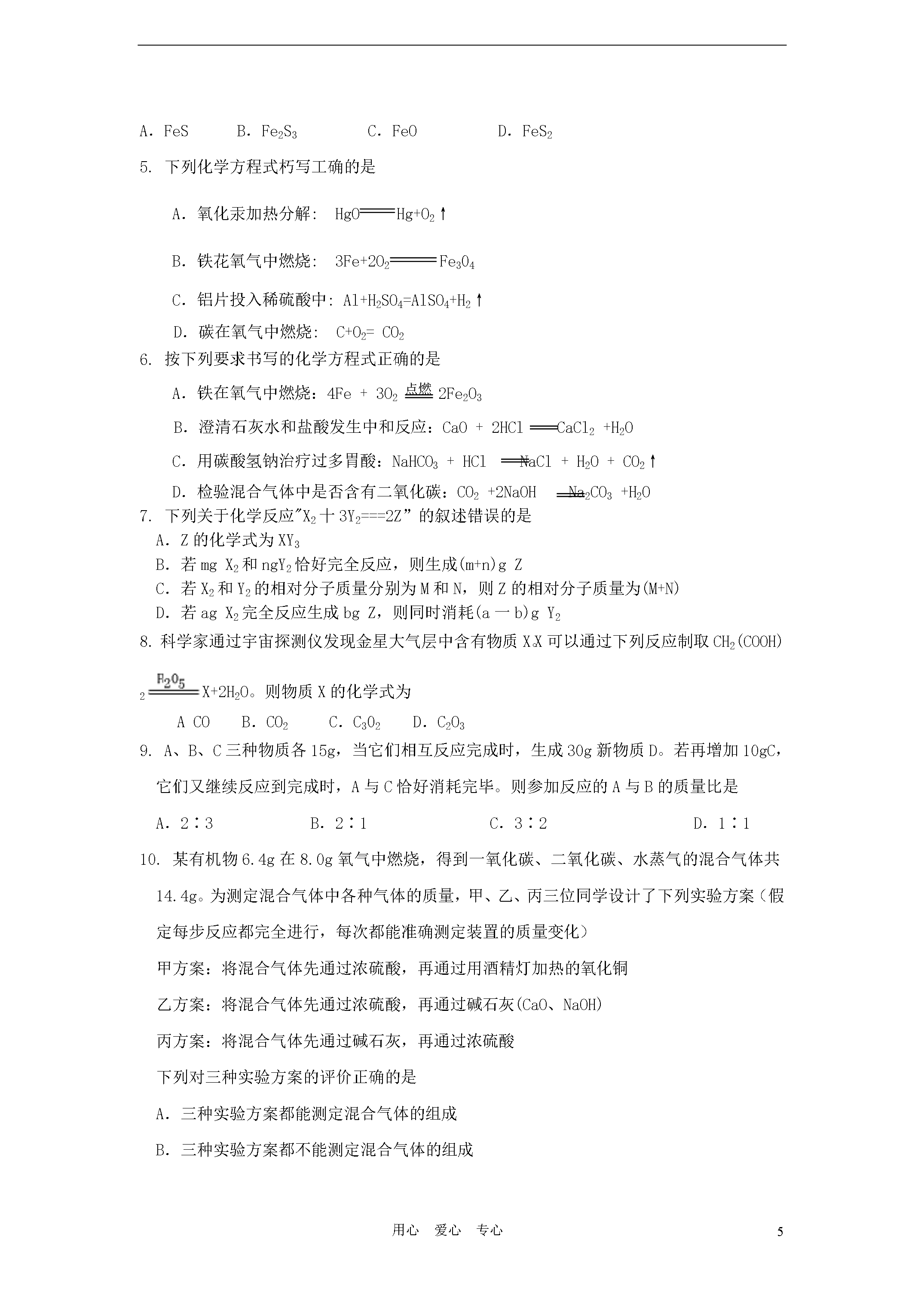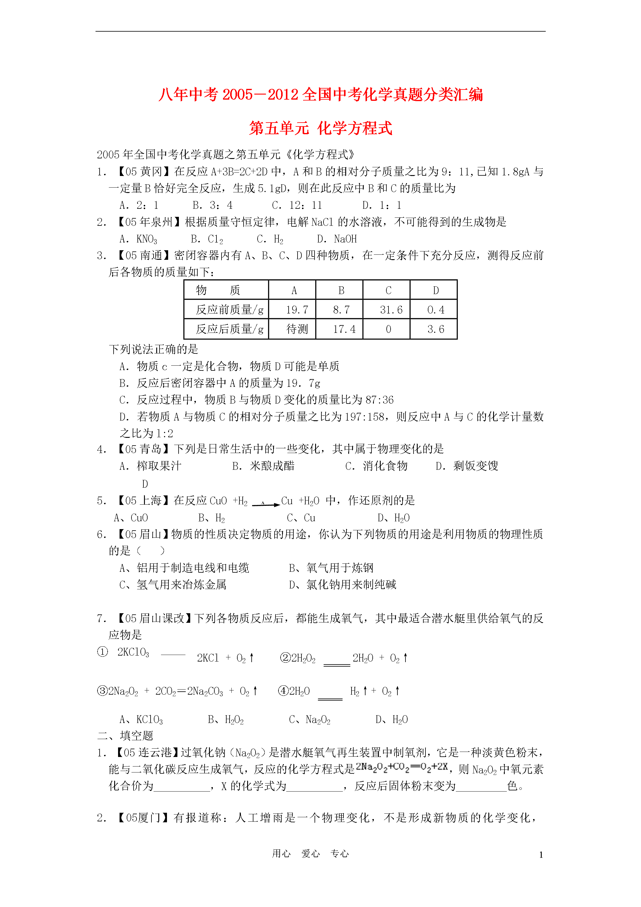 83用心爱心专心八年中考2005-2012全国中考化学真题分类汇编第五单元化学方程式2005年全国中考化学真题之第五单元《化学方程式》1.【05黄冈】在反应A+3B=2C+2D中,A和B的相对分子质量之比为9:11,已知1.8gA与一定量B恰好完全反应,生成5.1gD,则在此反应中B和C的质量比为A.2:1B.3:4C.12:11D.1:12.【05年泉州】根据质量守恒定律,电解NaCl的水溶液,不可能得到的生成物是A.KNO3B.C12C.H2D.NaOH3.【05南通】密闭容器内有A、B、C、D四种物质,在一定条件下充分反应,测得反应前后各物质的质量如下:物质ABCD反应前质量/g19.78.731.6O.4反应后质量/g待测17.403.6下列说法正确的是A.物质c一定是化合物,物质D可能是单质B.反应后密闭容器中A的质量为19.7gC.反应过程中,物质B与物质D变化的质量比为87:36D.若物质A与物质C的相对分子质量之比为197:158,则反应中A与C的化学计量数之比为l:24.【05青岛】下列是日常生活中的一些变化,其中属于物理变化的是A.榨取果汁B.米酿成醋C.消化食物D.剩饭变馊DΔ5.【05上海】在反应CuO+H2Cu+H2O中,作还原剂的是A、CuOB、H2C、CuD、H2O6.【05眉山】物质的性质决定物质的用途,你认为下列物质的用途是利用物质的物理性质的是()A、铝用于制造电线和电缆B、氧气用于炼钢C、氢气用来冶炼金属D、氯化钠用来制纯碱7.【05眉山课改】下列各物质反应后,都能生成氧气,其中最适合潜水艇里供给氧气的反应物是①2KClO32KCl+O2↑②2H2O22H2O+O2↑③2Na2O2+2CO2=2Na2CO3+O2↑④2H2OH2↑+O2↑A、KClO3B、H2O2C、Na2O2D、H2O二、填空题1.【05连云港】过氧化钠(Na2O2)是潜水艇氧气再生装置中制氧剂,它是一种淡黄色粉末,能与二氧化碳反应生成氧气,反应的化学方程式是,则Na2O2中氧元素化合价为__________,X的化学式为__________,反应后固体粉末变为_________色。2.【05厦门】有报道称:人工增雨是一个物理变化,不是形成新物质的化学变化,因此不会造成污染。人工增雨使用的是干冰和碘化银,干冰来源于空气,碘化银的组成和水的组成一样,因此不会破坏环境。请分析此报道,回答下列问题。小红查得碘化银的资料,请据此填写下表。有关资料反应的化学方程式反应类型碘化银在人工降雨时见光分解,生成碘单质和银单质光2AgI2Ag+I2分解反应可用碘化钾溶液和硝酸银溶液反应制得难溶于水的碘化银,同时生成硝酸钾(2)人工增雨过程中的物理变化是指。(3)对报道中“碘化银的组成和水的组成一样”的说法,你认为是否正确?为什么?。三、实验题【05苏州】根据以下实验室制备氢气的3个装置图,试填空。(1)正在产生氢气的装置是(填序号);收集氢气的方法是。(2)停止产生氢气的装置是(填序号),这是由于的缘故(填操作方法)答案与提示一、选择题1.A2.A3.AD4.A5.B6.A7.C二、填空题1.-1价,Na2CO3,白2.(1)AgNO3+KI=KNO3+AgI↓复分解反应(2)空气中的水蒸气变成液态雨水(1分)(3)不正确因为水是由氢、氧两种元素组成的,而碘化银是由碘和银元素组成的。三、实验题(1)乙、丙向下排空气法(或排水法)(2)甲关闭导气管活塞2006年全国中考化学真题之五单元《化学方程式》A组1、(06北京)下列反应的化学方程式书写正确的是(D)A电解水2H2O=2H2+O2B铁和稀盐酸的反应2Fe+6HCl=2FeCI2+3H2↑C实验室制二氧化碳CaC03+HCl=CaCl2+H20+C02↑D氢氧化钠溶液和稀硫酸的反应2NaOH+H2S04=Na2S04+2H202、(06甘肃兰州)某物质R与水和氧气发生化学反应为:2R+2H2O+7O2=2FeSO4+2H2SO4,推断R的化学式为(D)A.FeSB.Fe2S3C.FeOD.FeS23、(06广州)下列化学方程式书写正确的是(B)A.氧化汞加热分解:HgOHg+O2↑B.铁在氧气中燃烧:3Fe+2O2Fe304C.铝片投入稀硫酸中:Al+H2SO4=AlSO4+H2↑D.碳在氧气中燃烧:C+O2=CO24、(06河南)下列化学方程式的书写不正确的是(C)(A)CaCO3高温CaO+CO2↑(B)2KMnO4△K2MnO4+MnO2+O2↑(C)Al+O2点燃Al2O3(D)CO2+Ca(OH)2=CaCO3↓+H2O5、(06湖北黄冈)在反应2A+B=3C+D中,A和B的相时分子质量之比为5:1,已知20gA与一定量B恰好完全反应,生成5gD,则在此反应中B和C的质量比为:(