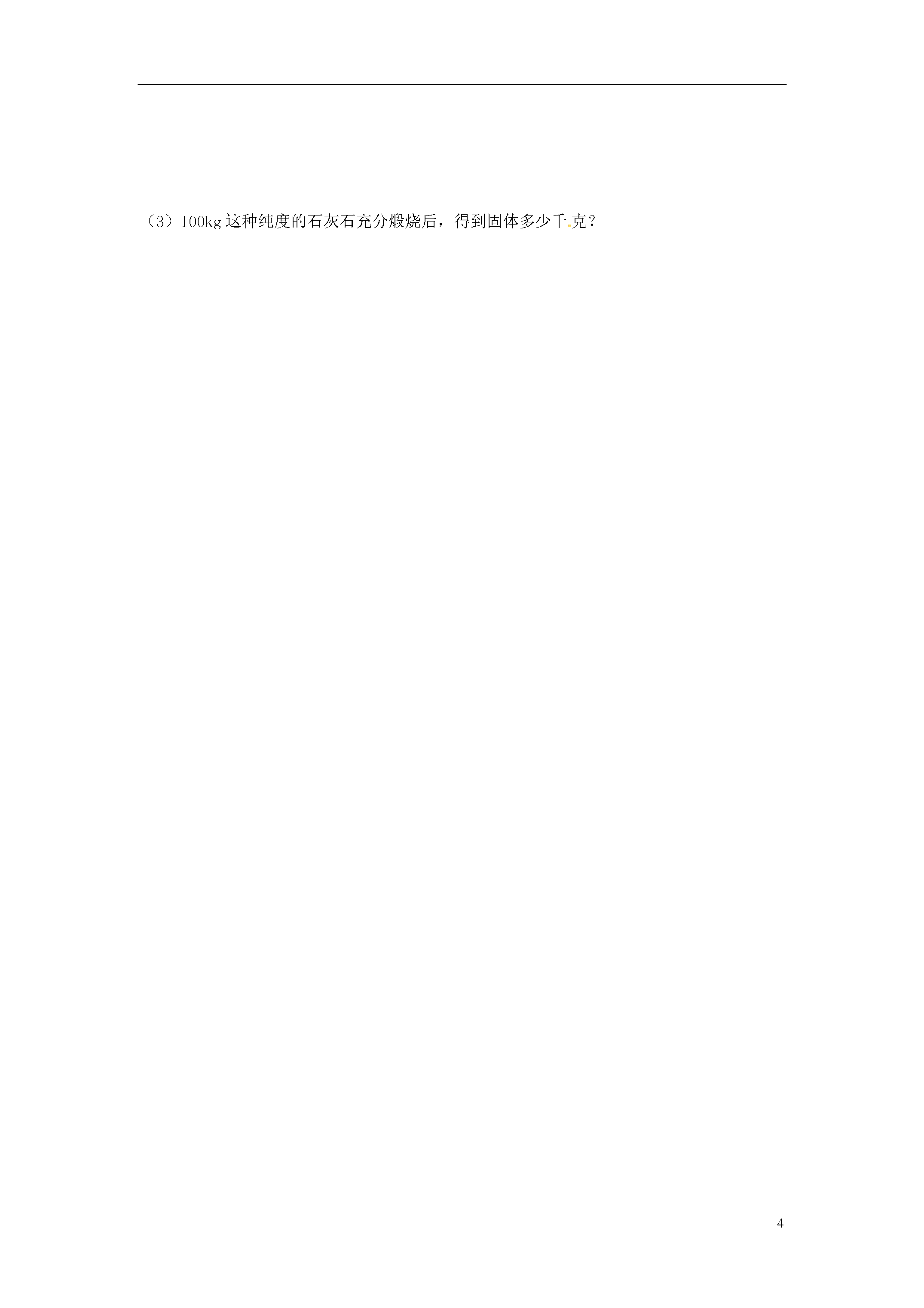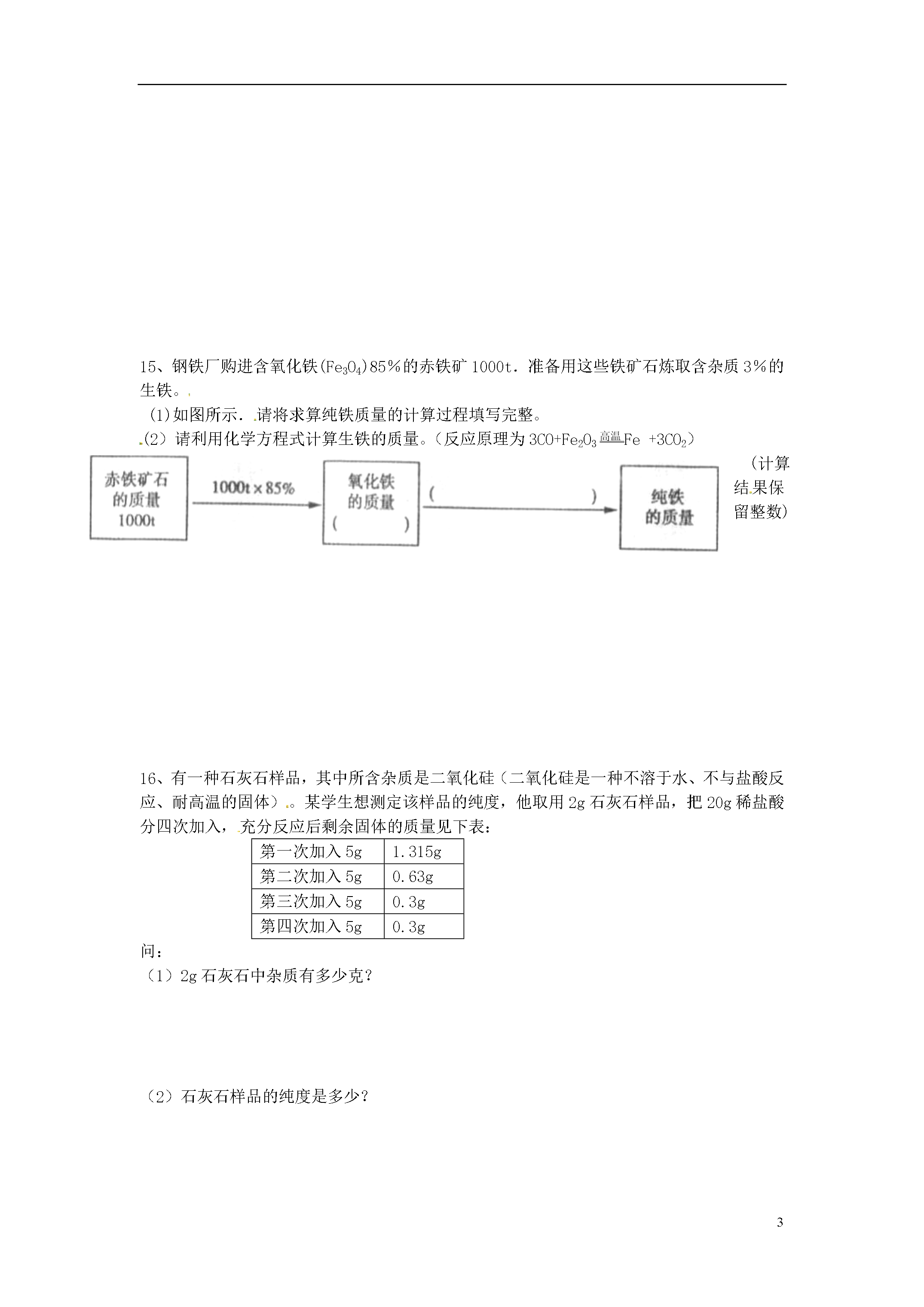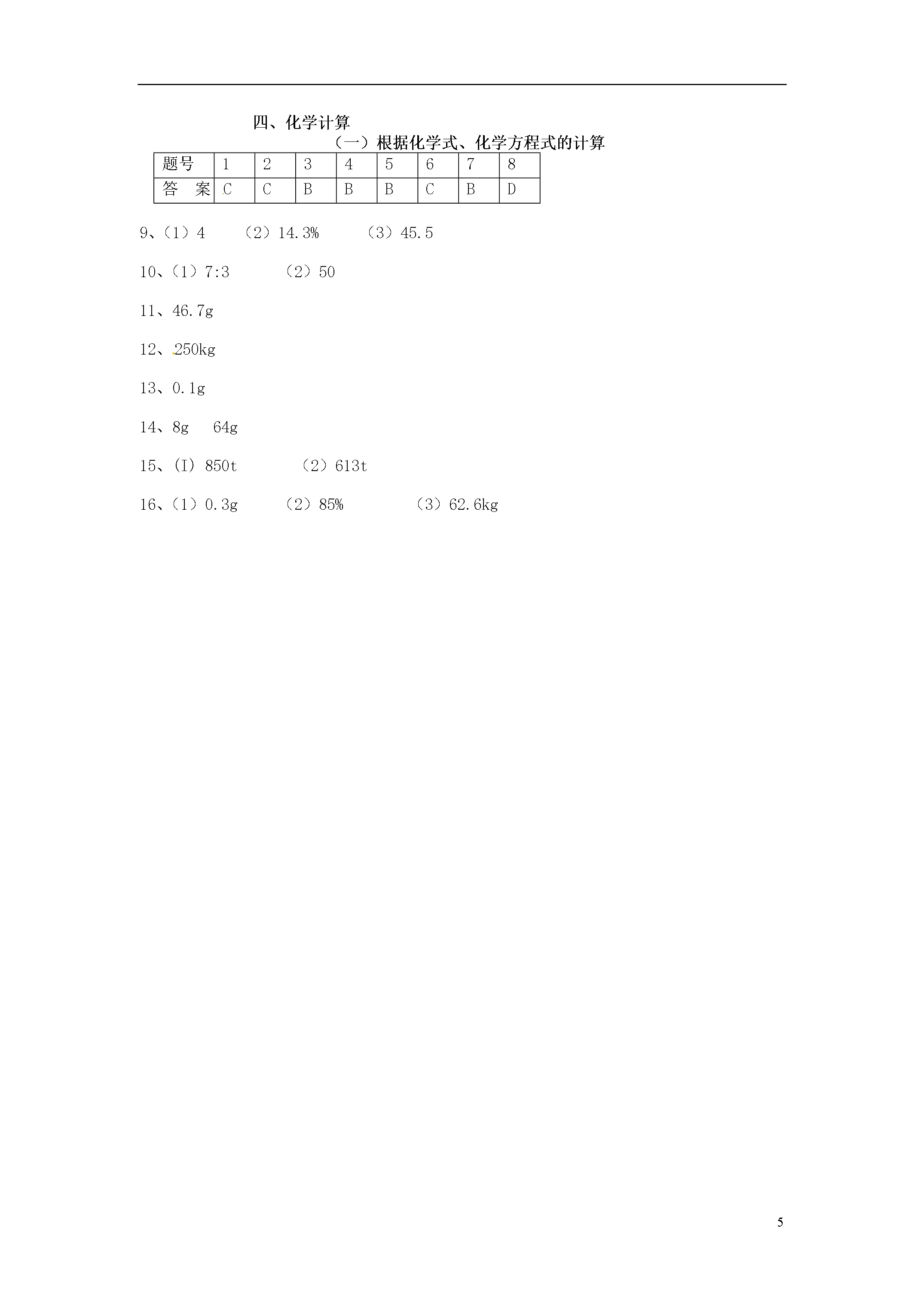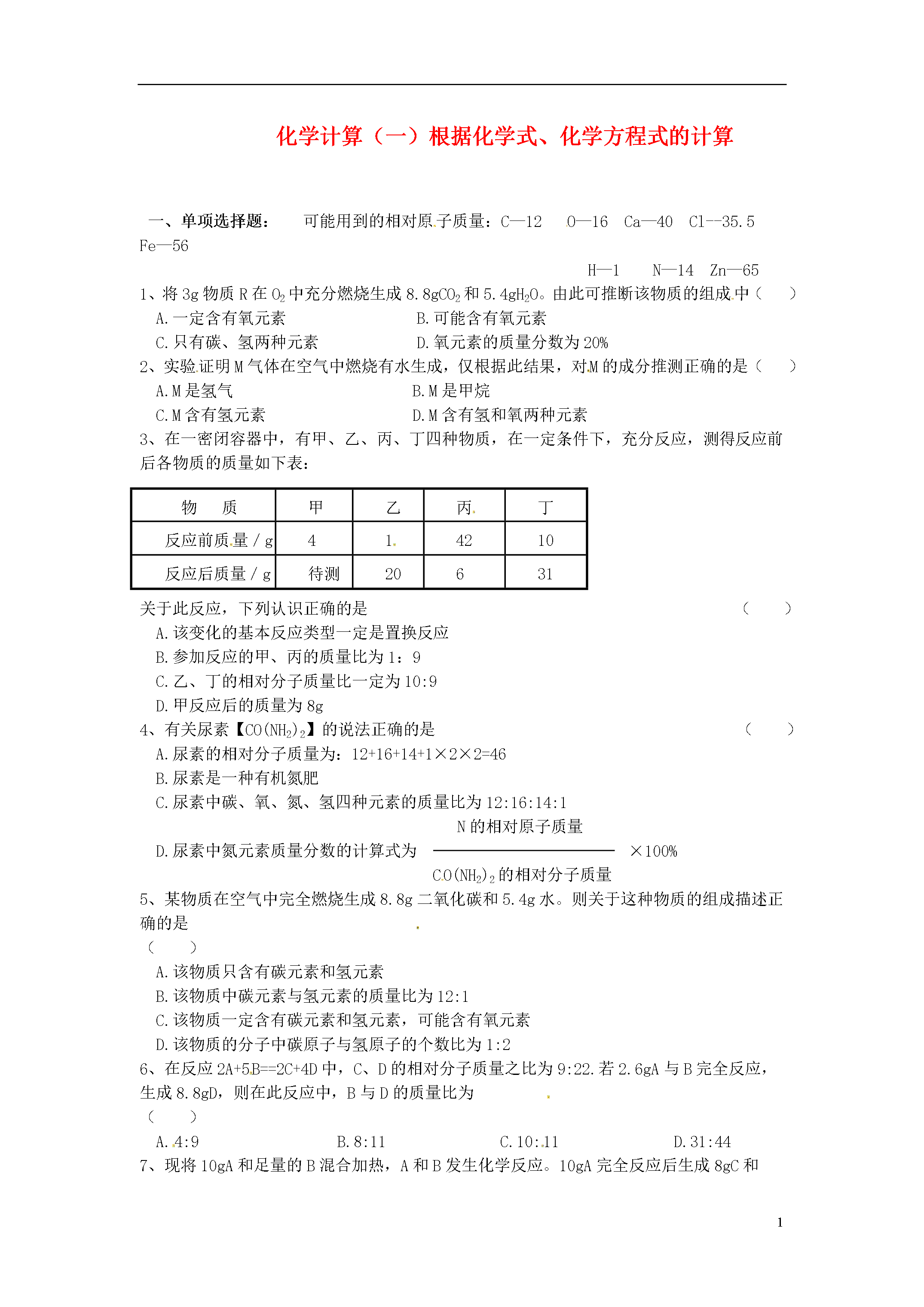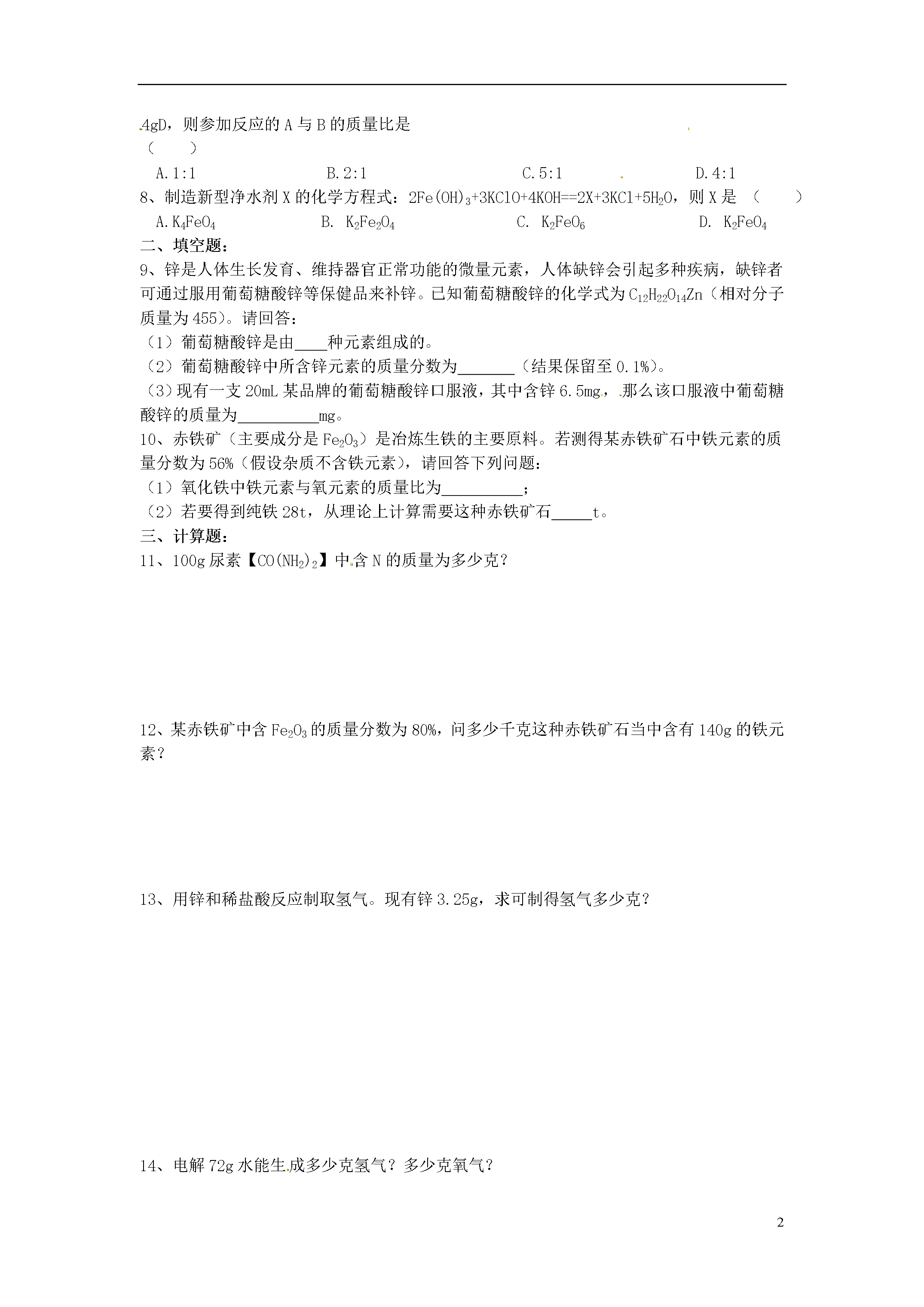 5化学计算(一)根据化学式、化学方程式的计算一、单项选择题:可能用到的相对原子质量:C—12O—16Ca—40Cl--35.5Fe—56H—1N—14Zn—651、将3g物质R在O2中充分燃烧生成8.8gCO2和5.4gH2O。由此可推断该物质的组成中()A.一定含有氧元素B.可能含有氧元素C.只有碳、氢两种元素D.氧元素的质量分数为20%2、实验证明M气体在空气中燃烧有水生成,仅根据此结果,对M的成分推测正确的是()A.M是氢气B.M是甲烷C.M含有氢元素D.M含有氢和氧两种元素3、在一密闭容器中,有甲、乙、丙、丁四种物质,在一定条件下,充分反应,测得反应前后各物质的质量如下表:物质甲乙丙丁反应前质量/g414210反应后质量/g待测20631关于此反应,下列认识正确的是()A.该变化的基本反应类型一定是置换反应B.参加反应的甲、丙的质量比为1:9C.乙、丁的相对分子质量比一定为10:9D.甲反应后的质量为8g4、有关尿素【CO(NH2)2】的说法正确的是()A.尿素的相对分子质量为:12+16+14+1×2×2=46B.尿素是一种有机氮肥C.尿素中碳、氧、氮、氢四种元素的质量比为12:16:14:1N的相对原子质量D.尿素中氮元素质量分数的计算式为×100%CO(NH2)2的相对分子质量5、某物质在空气中完全燃烧生成8.8g二氧化碳和5.4g水。则关于这种物质的组成描述正确的是()A.该物质只含有碳元素和氢元素B.该物质中碳元素与氢元素的质量比为12:1C.该物质一定含有碳元素和氢元素,可能含有氧元素D.该物质的分子中碳原子与氢原子的个数比为1:26、在反应2A+5B==2C+4D中,C、D的相对分子质量之比为9:22.若2.6gA与B完全反应,生成8.8gD,则在此反应中,B与D的质量比为()A.4:9B.8:11C.10:11D.31:447、现将10gA和足量的B混合加热,A和B发生化学反应。10gA完全反应后生成8gC和4gD,则参加反应的A与B的质量比是()A.1:1B.2:1C.5:1D.4:18、制造新型净水剂X的化学方程式:2Fe(OH)3+3KClO+4KOH==2X+3KCl+5H2O,则X是()A.K4FeO4B.K2Fe2O4C.K2FeO6D.K2FeO4二、填空题:9、锌是人体生长发育、维持器官正常功能的微量元素,人体缺锌会引起多种疾病,缺锌者可通过服用葡萄糖酸锌等保健品来补锌。已知葡萄糖酸锌的化学式为C12H22O14Zn(相对分子质量为455)。请回答:(1)葡萄糖酸锌是由种元素组成的。(2)葡萄糖酸锌中所含锌元素的质量分数为(结果保留至0.1%)。(3)现有一支20mL某品牌的葡萄糖酸锌口服液,其中含锌6.5mg,那么该口服液中葡萄糖酸锌的质量为mg。10、赤铁矿(主要成分是Fe2O3)是冶炼生铁的主要原料。若测得某赤铁矿石中铁元素的质量分数为56%(假设杂质不含铁元素),请回答下列问题:(1)氧化铁中铁元素与氧元素的质量比为;(2)若要得到纯铁28t,从理论上计算需要这种赤铁矿石t。三、计算题:11、100g尿素【CO(NH2)2】中含N的质量为多少克?12、某赤铁矿中含Fe2O3的质量分数为80%,问多少千克这种赤铁矿石当中含有140g的铁元素?13、用锌和稀盐酸反应制取氢气。现有锌3.25g,求可制得氢气多少克?14、电解72g水能生成多少克氢气?多少克氧气?15、钢铁厂购进含氧化铁(Fe3O4)85%的赤铁矿1000t.准备用这些铁矿石炼取含杂质3%的生铁。(1)如图所示.请将求算纯铁质量的计算过程填写完整。(2)请利用化学方程式计算生铁的质量。(反应原理为3CO+Fe2O3高温Fe+3CO2)(计算结果保留整数)16、有一种石灰石样品,其中所含杂质是二氧化硅(二氧化硅是一种不溶于水、不与盐酸反应、耐高温的固体)。某学生想测定该样品的纯度,他取用2g石灰石样品,把20g稀盐酸分四次加入,充分反应后剩余固体的质量见下表:第一次加入5g1.315g第二次加入5g0.63g第三次加入5g0.3g第四次加入5g0.3g问:(1)2g石灰石中杂质有多少克?(2)石灰石样品的纯度是多少?(3)100kg这种纯度的石灰石充分煅烧后,得到固体多少千克?四、化学计算(一)根据化学式、化学方程式的计算题号12345678答案CCBBBCBD9、(1)4(2)14.3%(3)45.510、(1)7:3(2)5011、46.7g12、250kg13、0.1g14、8g64g15、(I)850t(2)613t16、(1)0.3g(2)85%(3)62.6kg