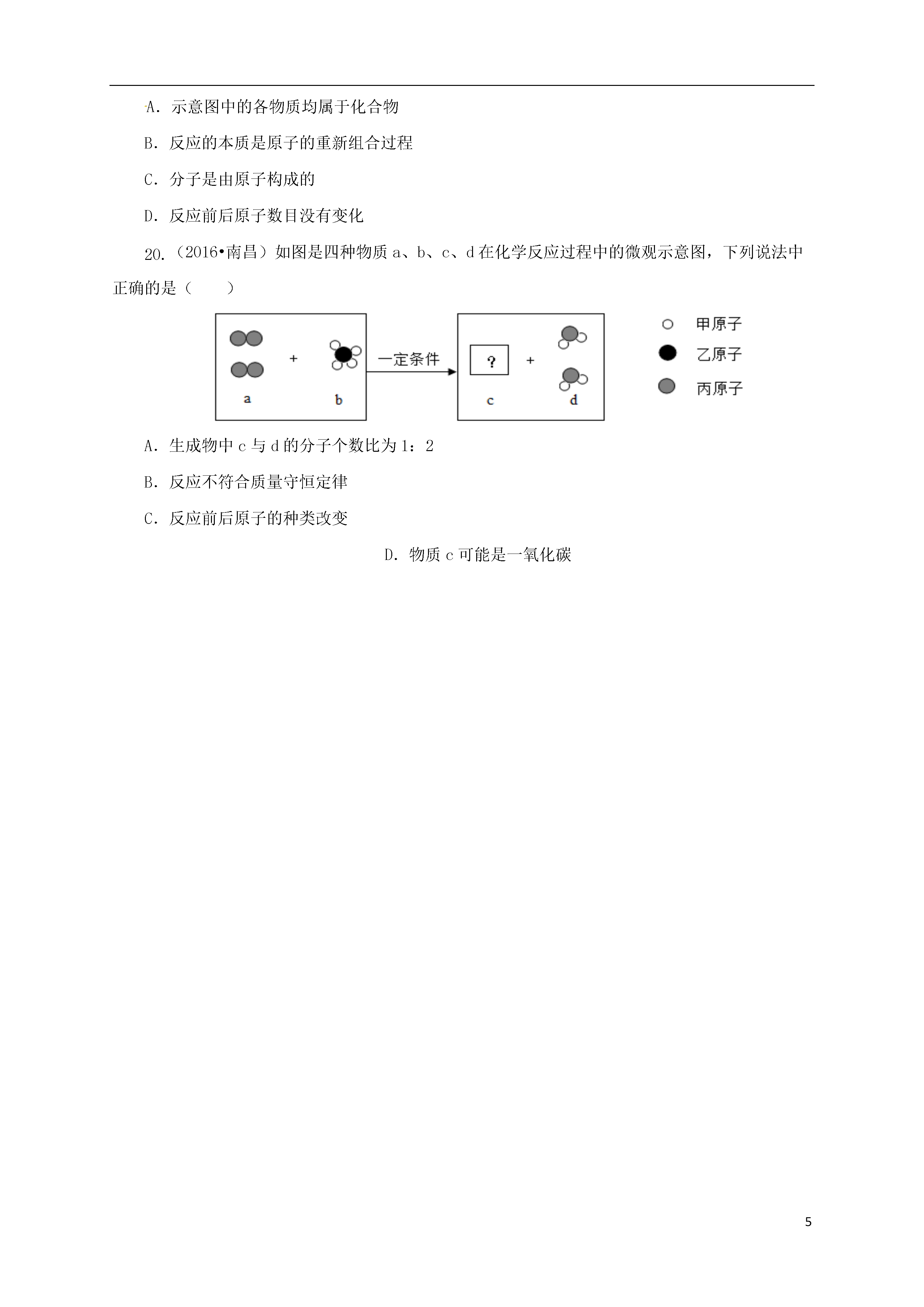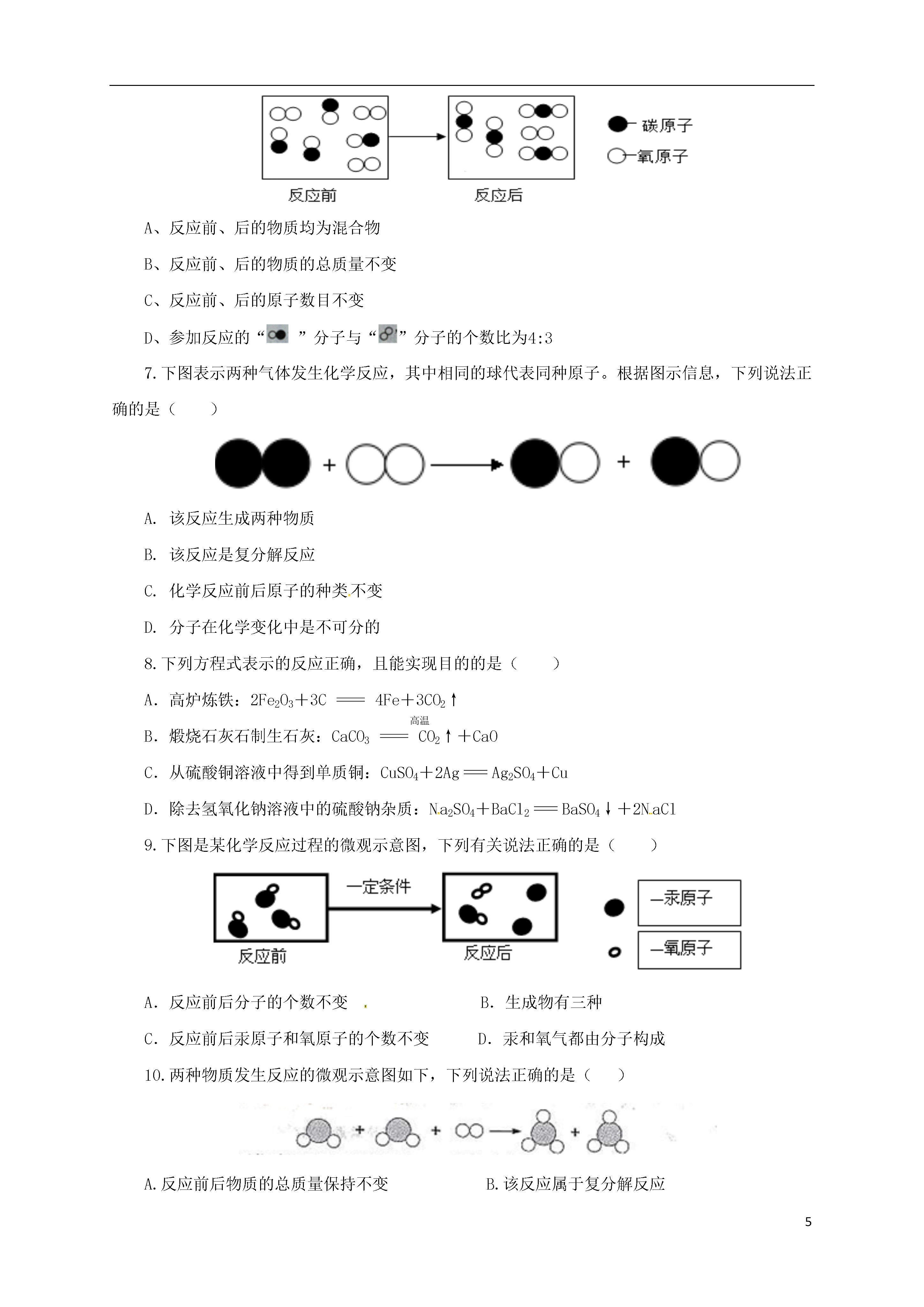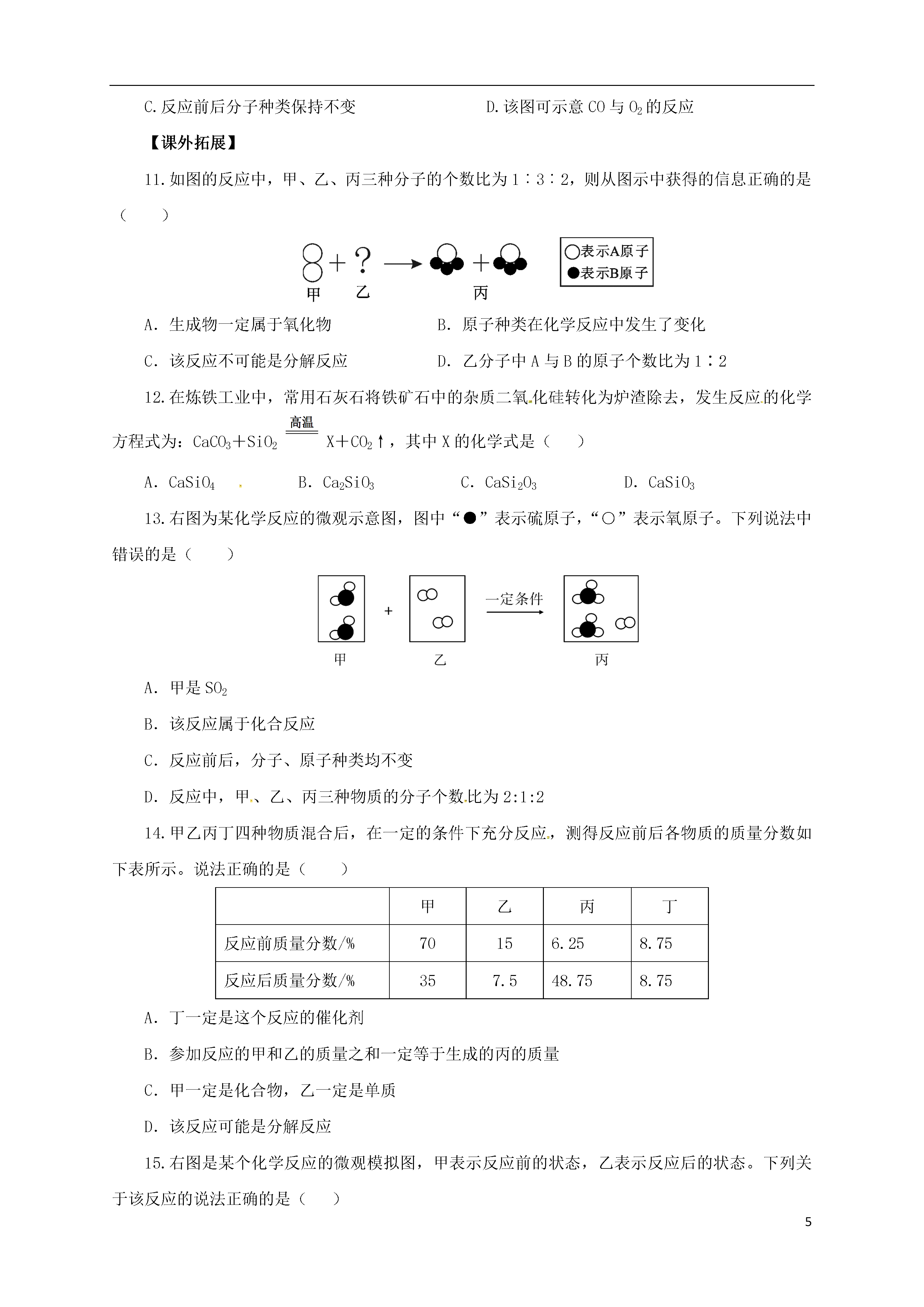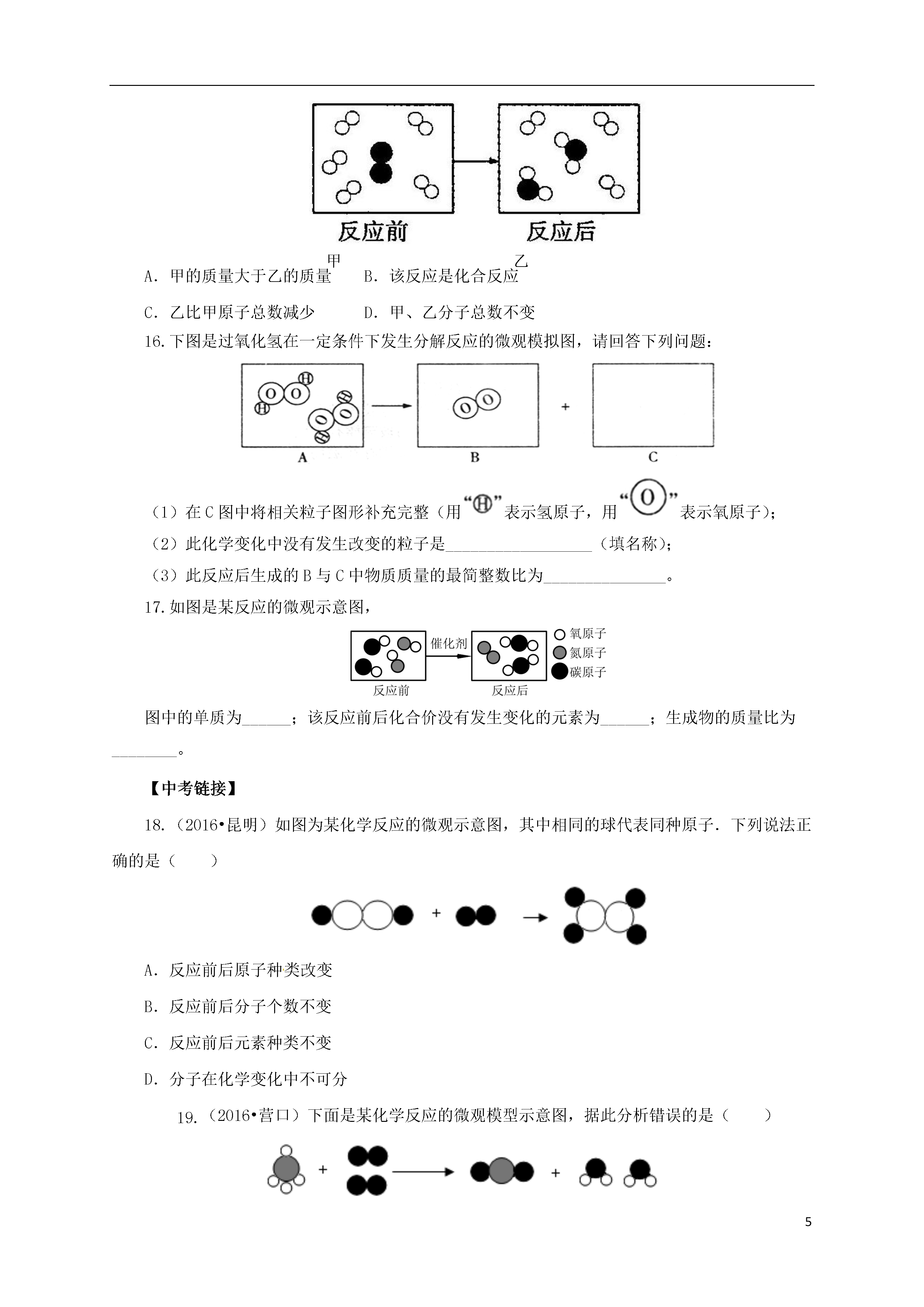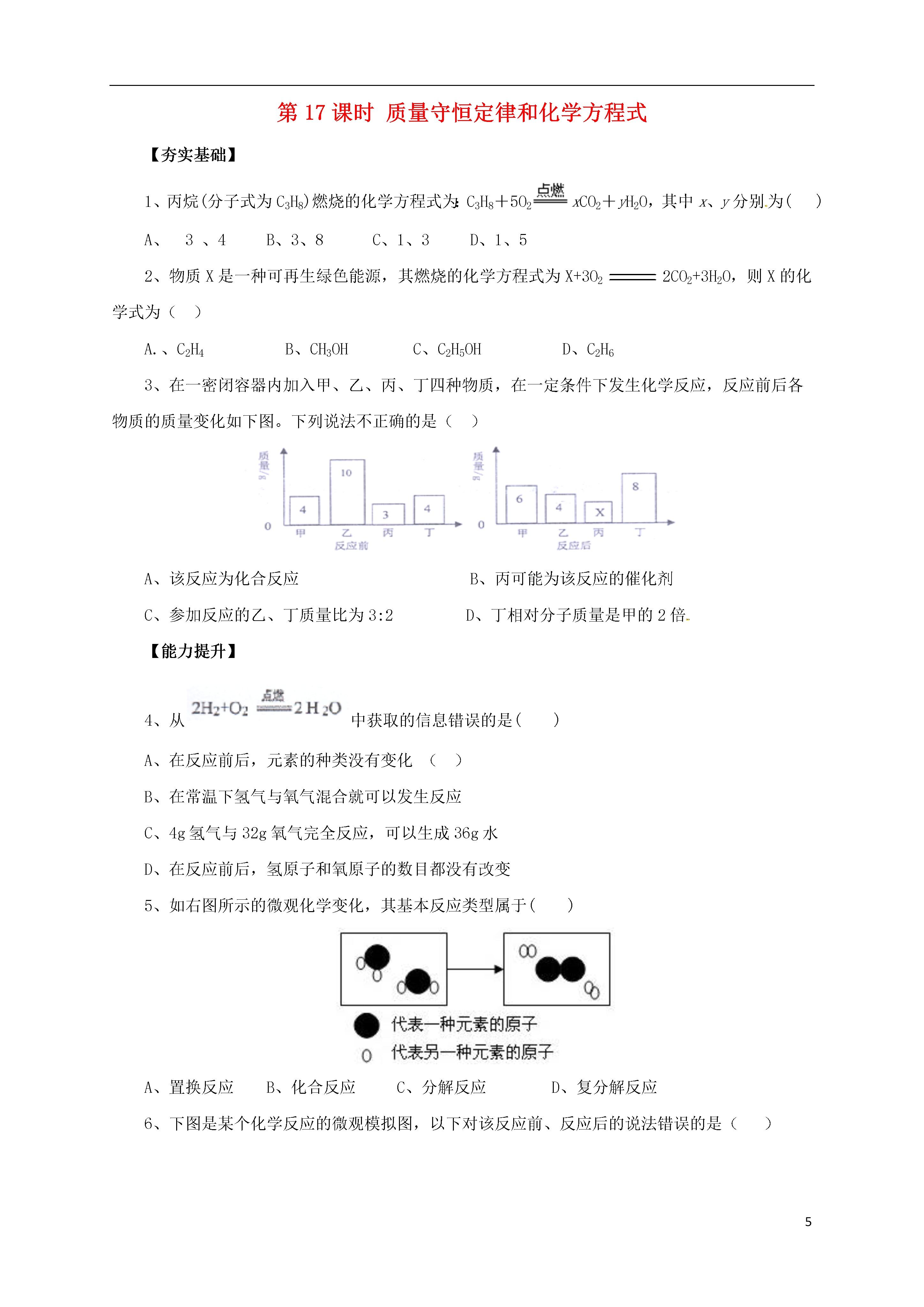 5第17课时质量守恒定律和化学方程式【夯实基础】1、丙烷(分子式为C3H8)燃烧的化学方程式为:C3H8+5O2xCO2+yH2O,其中x、y分别为()A、3、4B、3、8C、1、3D、1、52、物质X是一种可再生绿色能源,其燃烧的化学方程式为X+3O22CO2+3H2O,则X的化学式为()A.、C2H4B、CH3OHC、C2H5OHD、C2H63、在一密闭容器内加入甲、乙、丙、丁四种物质,在一定条件下发生化学反应,反应前后各物质的质量变化如下图。下列说法不正确的是()A、该反应为化合反应B、丙可能为该反应的催化剂C、参加反应的乙、丁质量比为3:2D、丁相对分子质量是甲的2倍【能力提升】4、从中获取的信息错误的是()A、在反应前后,元素的种类没有变化()B、在常温下氢气与氧气混合就可以发生反应C、4g氢气与32g氧气完全反应,可以生成36g水D、在反应前后,氢原子和氧原子的数目都没有改变5、如右图所示的微观化学变化,其基本反应类型属于()A、置换反应B、化合反应C、分解反应D、复分解反应6、下图是某个化学反应的微观模拟图,以下对该反应前、反应后的说法错误的是()A、反应前、后的物质均为混合物B、反应前、后的物质的总质量不变C、反应前、后的原子数目不变D、参加反应的“”分子与“”分子的个数比为4:37.下图表示两种气体发生化学反应,其中相同的球代表同种原子。根据图示信息,下列说法正确的是()A.该反应生成两种物质B.该反应是复分解反应C.化学反应前后原子的种类不变D.分子在化学变化中是不可分的8.下列方程式表示的反应正确,且能实现目的的是()A.高炉炼铁:2Fe2O3+3C=4Fe+3CO2↑高温B.煅烧石灰石制生石灰:CaCO3=CO2↑+CaOC.从硫酸铜溶液中得到单质铜:CuSO4+2Ag=Ag2SO4+CuD.除去氢氧化钠溶液中的硫酸钠杂质:Na2SO4+BaCl2=BaSO4↓+2NaCl9.下图是某化学反应过程的微观示意图,下列有关说法正确的是()A.反应前后分子的个数不变B.生成物有三种C.反应前后汞原子和氧原子的个数不变D.汞和氧气都由分子构成10.两种物质发生反应的微观示意图如下,下列说法正确的是()A.反应前后物质的总质量保持不变B.该反应属于复分解反应C.反应前后分子种类保持不变D.该图可示意CO与O2的反应【课外拓展】11.如图的反应中,甲、乙、丙三种分子的个数比为1︰3︰2,则从图示中获得的信息正确的是()A.生成物一定属于氧化物B.原子种类在化学反应中发生了变化C.该反应不可能是分解反应D.乙分子中A与B的原子个数比为1∶212.在炼铁工业中,常用石灰石将铁矿石中的杂质二氧化硅转化为炉渣除去,发生反应的化学方程式为:CaCO3+SiO2X+CO2↑,其中X的化学式是()A.CaSiO4B.Ca2SiO3C.CaSi2O3D.CaSiO313.右图为某化学反应的微观示意图,图中“●”表示硫原子,“○”表示氧原子。下列说法中错误的是()A.甲是SO2B.该反应属于化合反应C.反应前后,分子、原子种类均不变D.反应中,甲、乙、丙三种物质的分子个数比为2:1:214.甲乙丙丁四种物质混合后,在一定的条件下充分反应,测得反应前后各物质的质量分数如下表所示。说法正确的是()甲乙丙丁反应前质量分数/%70156.258.75反应后质量分数/%357.548.758.75A.丁一定是这个反应的催化剂B.参加反应的甲和乙的质量之和一定等于生成的丙的质量C.甲一定是化合物,乙一定是单质D.该反应可能是分解反应右图是某个化学反应的微观模拟图,甲表示反应前的状态,乙表示反应后的状态。下列关于该反应的说法正确的是()甲乙A.甲的质量大于乙的质量B.该反应是化合反应C.乙比甲原子总数减少D.甲、乙分子总数不变16.下图是过氧化氢在一定条件下发生分解反应的微观模拟图,请回答下列问题:(1)在C图中将相关粒子图形补充完整(用表示氢原子,用表示氧原子);(2)此化学变化中没有发生改变的粒子是__________________(填名称);(3)此反应后生成的B与C中物质质量的最简整数比为_______________。17.如图是某反应的微观示意图,图中的单质为______;该反应前后化合价没有发生变化的元素为______;生成物的质量比为________。【中考链接】(2016•昆明)如图为某化学反应的微观示意图,其中相同的球代表同种原子.下列说法正确的是()A.反应前后原子种类改变B.反应前后分子个数不变C.反应前后元素种类不变D.分子在化学变化中不可分