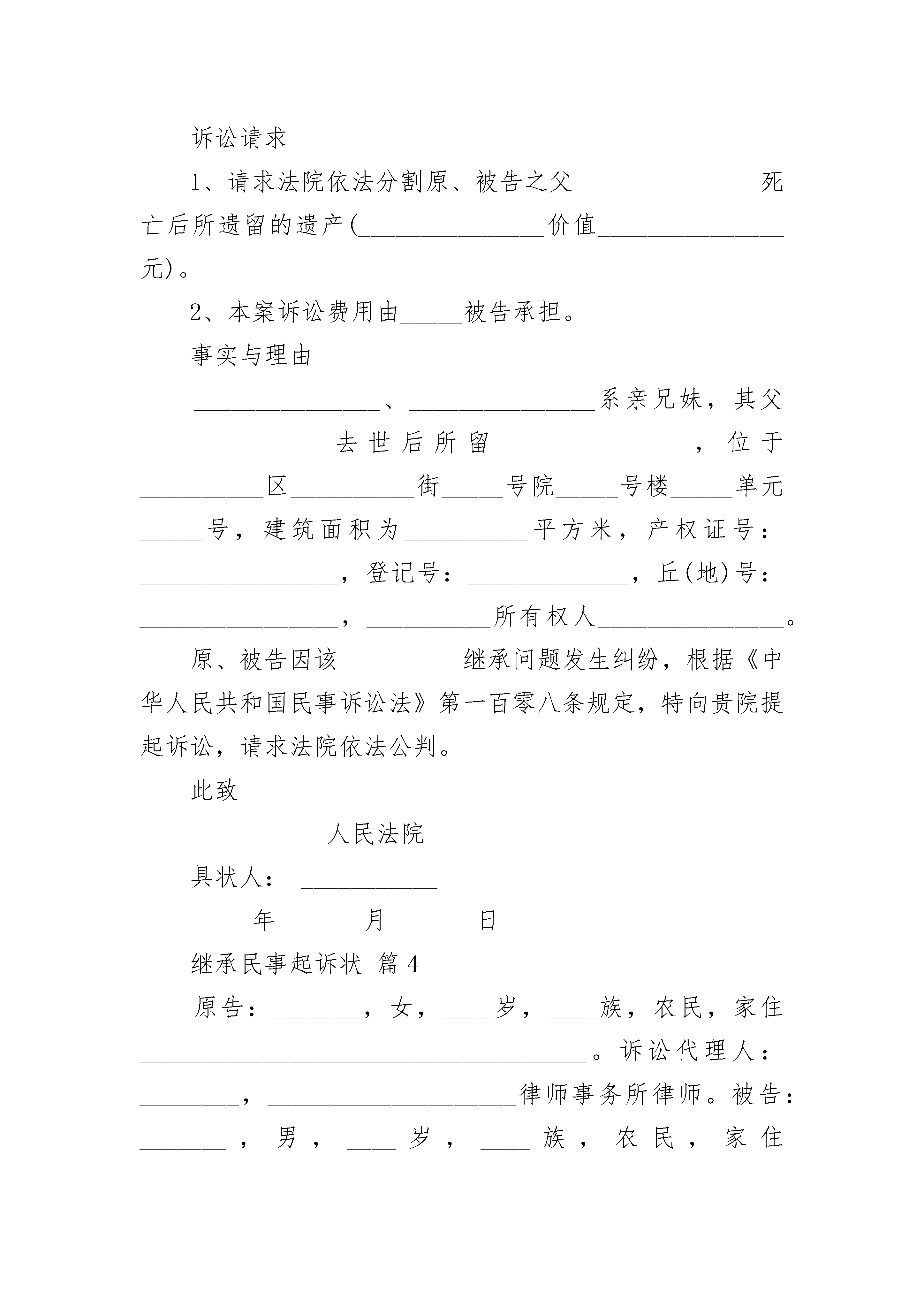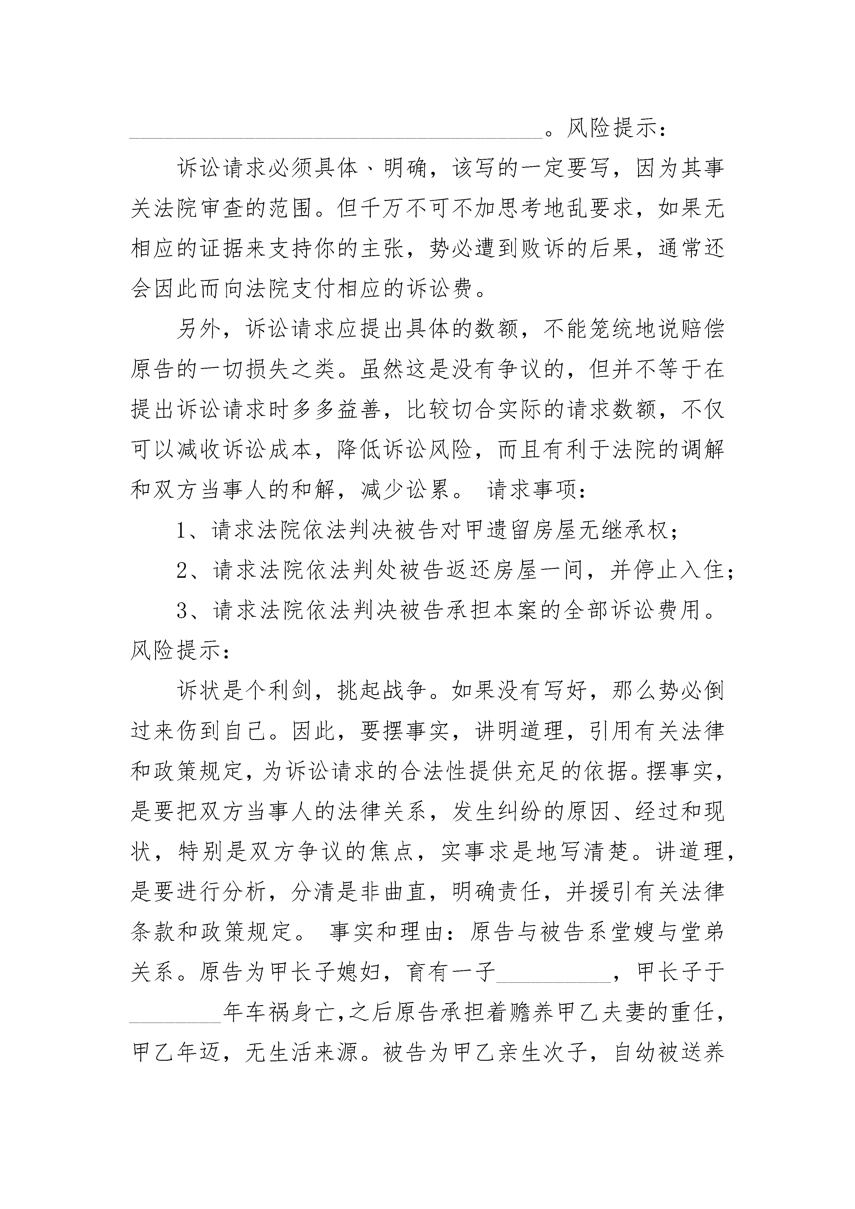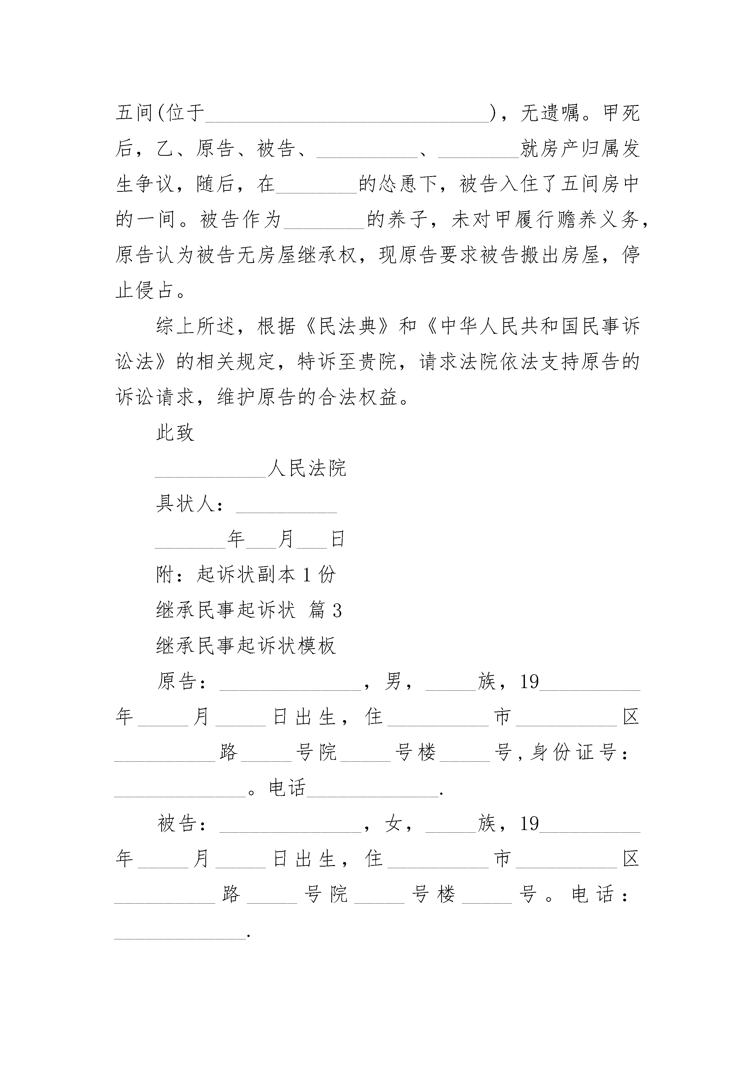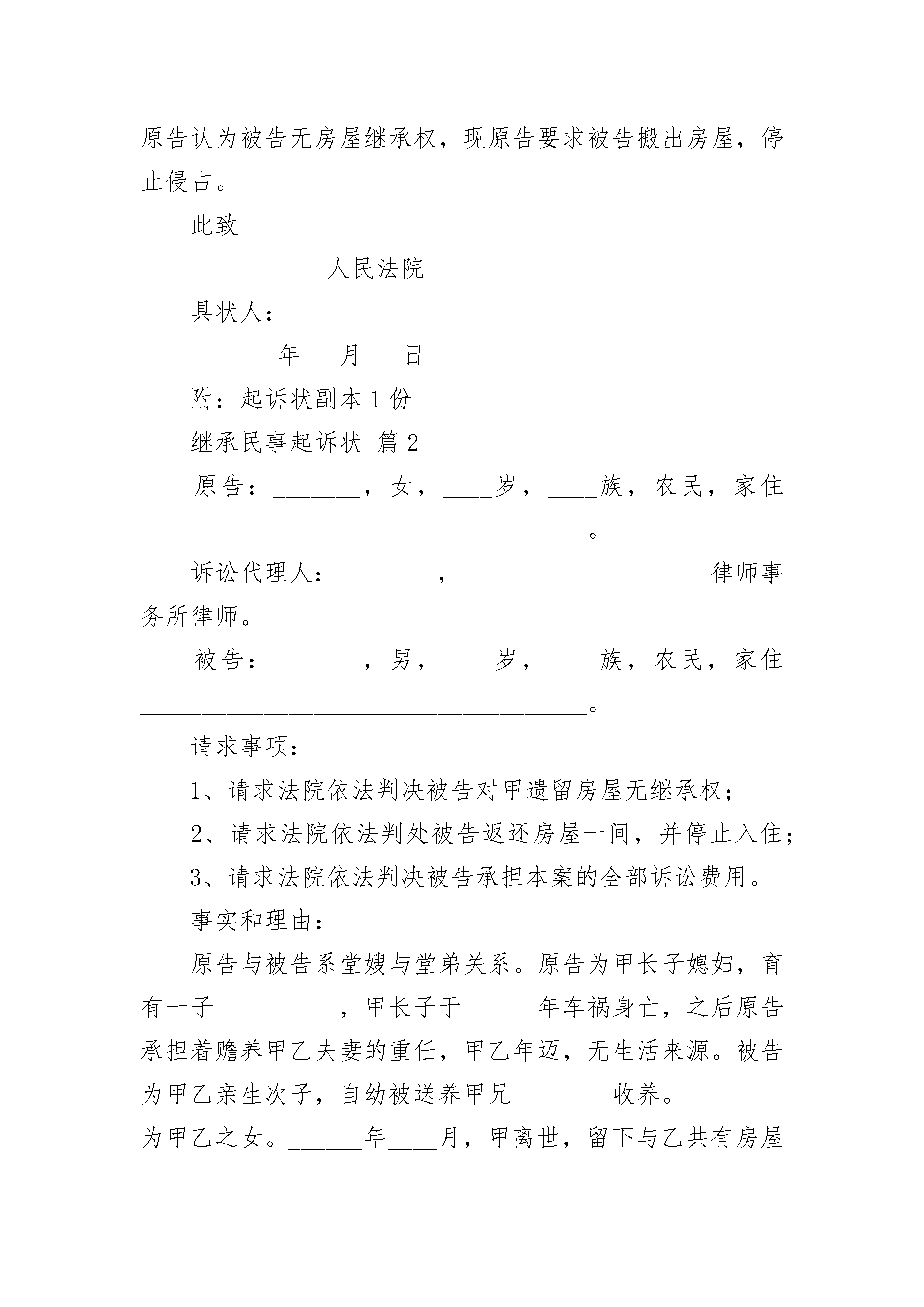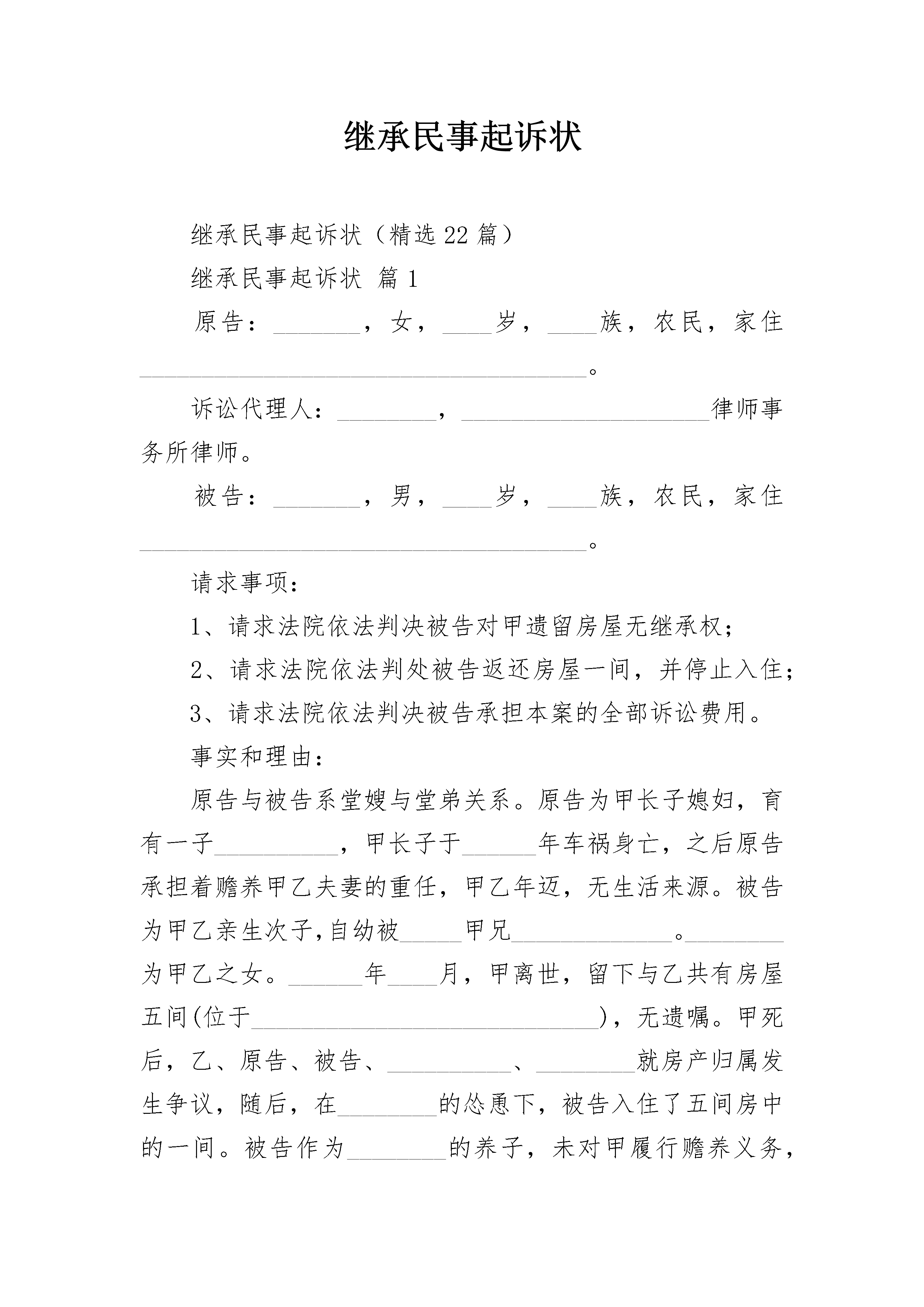 继承民事起诉状继承民事起诉状(精选22篇)继承民事起诉状篇1原告:_______,女,____岁,____族,农民,家住____________________________________。诉讼代理人:________,____________________律师事务所律师。被告:_______,男,____岁,____族,农民,家住____________________________________。请求事项:1、请求法院依法判决被告对甲遗留房屋无继承权;2、请求法院依法判处被告返还房屋一间,并停止入住;3、请求法院依法判决被告承担本案的全部诉讼费用。事实和理由:原告与被告系堂嫂与堂弟关系。原告为甲长子媳妇,育有一子__________,甲长子于______年车祸身亡,之后原告承担着赡养甲乙夫妻的重任,甲乙年迈,无生活来源。被告为甲乙亲生次子,自幼被_____甲兄_____________。________为甲乙之女。______年____月,甲离世,留下与乙共有房屋五间(位于____________________________),无遗嘱。甲死后,乙、原告、被告、__________、________就房产归属发生争议,随后,在________的怂恿下,被告入住了五间房中的一间。被告作为________的养子,未对甲履行赡养义务,原告认为被告无房屋继承权,现原告要求被告搬出房屋,停止侵占。此致___________人民法院具状人:_________________年___月___日附:起诉状副本1份继承民事起诉状篇2原告:_______,女,____岁,____族,农民,家住____________________________________。诉讼代理人:________,____________________律师事务所律师。被告:_______,男,____岁,____族,农民,家住____________________________________。请求事项:1、请求法院依法判决被告对甲遗留房屋无继承权;2、请求法院依法判处被告返还房屋一间,并停止入住;3、请求法院依法判决被告承担本案的全部诉讼费用。事实和理由:原告与被告系堂嫂与堂弟关系。原告为甲长子媳妇,育有一子__________,甲长子于______年车祸身亡,之后原告承担着赡养甲乙夫妻的重任,甲乙年迈,无生活来源。被告为甲乙亲生次子,自幼被送养甲兄________收养。________为甲乙之女。______年____月,甲离世,留下与乙共有房屋五间(位于____________________________),无遗嘱。甲死后,乙、原告、被告、__________、________就房产归属发生争议,随后,在________的怂恿下,被告入住了五间房中的一间。被告作为________的养子,未对甲履行赡养义务,原告认为被告无房屋继承权,现原告要求被告搬出房屋,停止侵占。综上所述,根据《民法典》和《中华人民共和国民事诉讼法》的相关规定,特诉至贵院,请求法院依法支持原告的诉讼请求,维护原告的合法权益。此致___________人民法院具状人:_________________年___月___日附:起诉状副本1份继承民事起诉状篇3继承民事起诉状模板原告:______________,男,_____族,19__________年_____月_____日出生,住__________市__________区__________路_____号院_____号楼_____号,身份证号:_____________。电话_____________.被告:______________,女,_____族,19__________年_____月_____日出生,住__________市__________区__________路_____号院_____号楼_____号。电话:_____________.诉讼请求1、请求法院依法分割原、被告之父_______________死亡后所遗留的遗产(_______________价值_______________元)。2、本案诉讼费用由_____被告承担。事实与理由_______________、_______________系亲兄妹,其父_______________去世后所留_______________,位于__________区__________街_____号院_____号楼_____单元_____号,建筑面积为__________平方米,产权证号:________________,登记号:_____________,丘(地)号:________________,__________所有权人__________