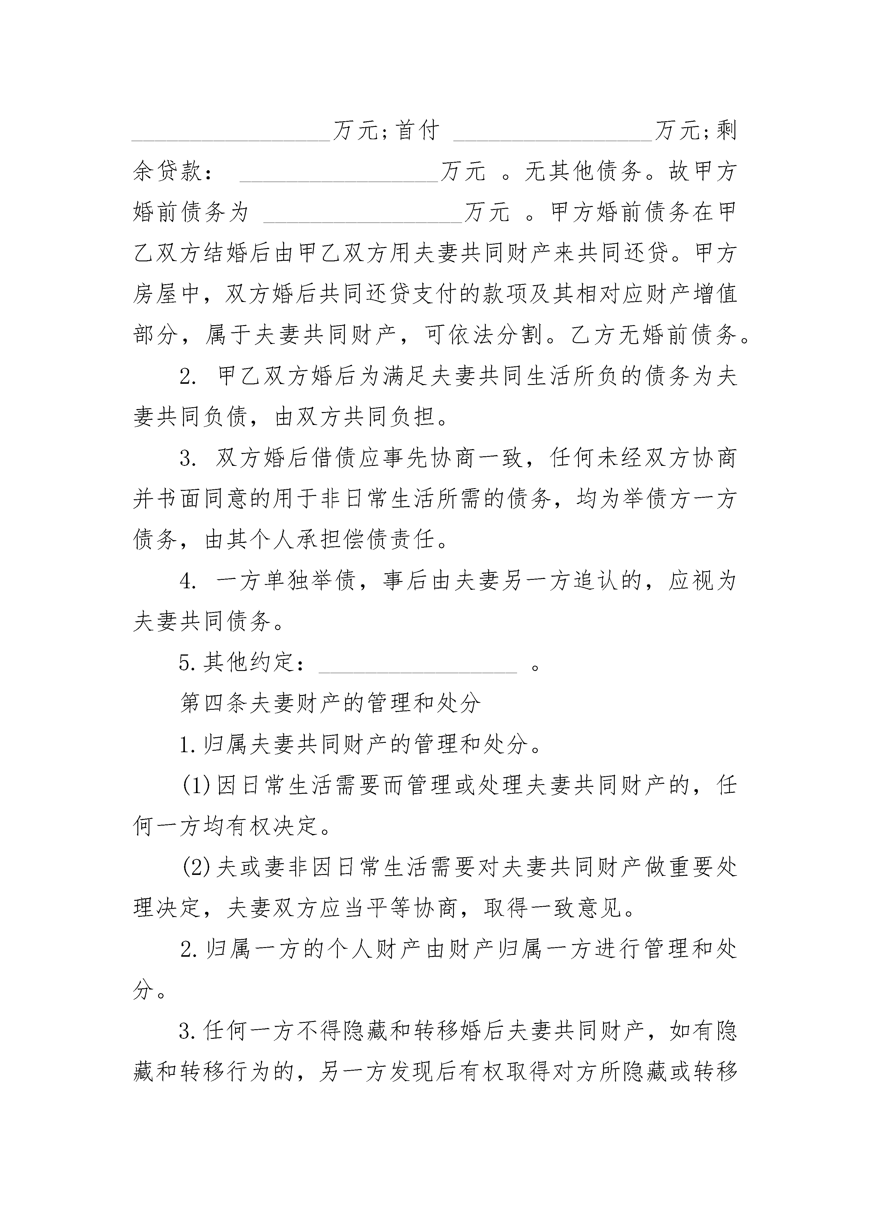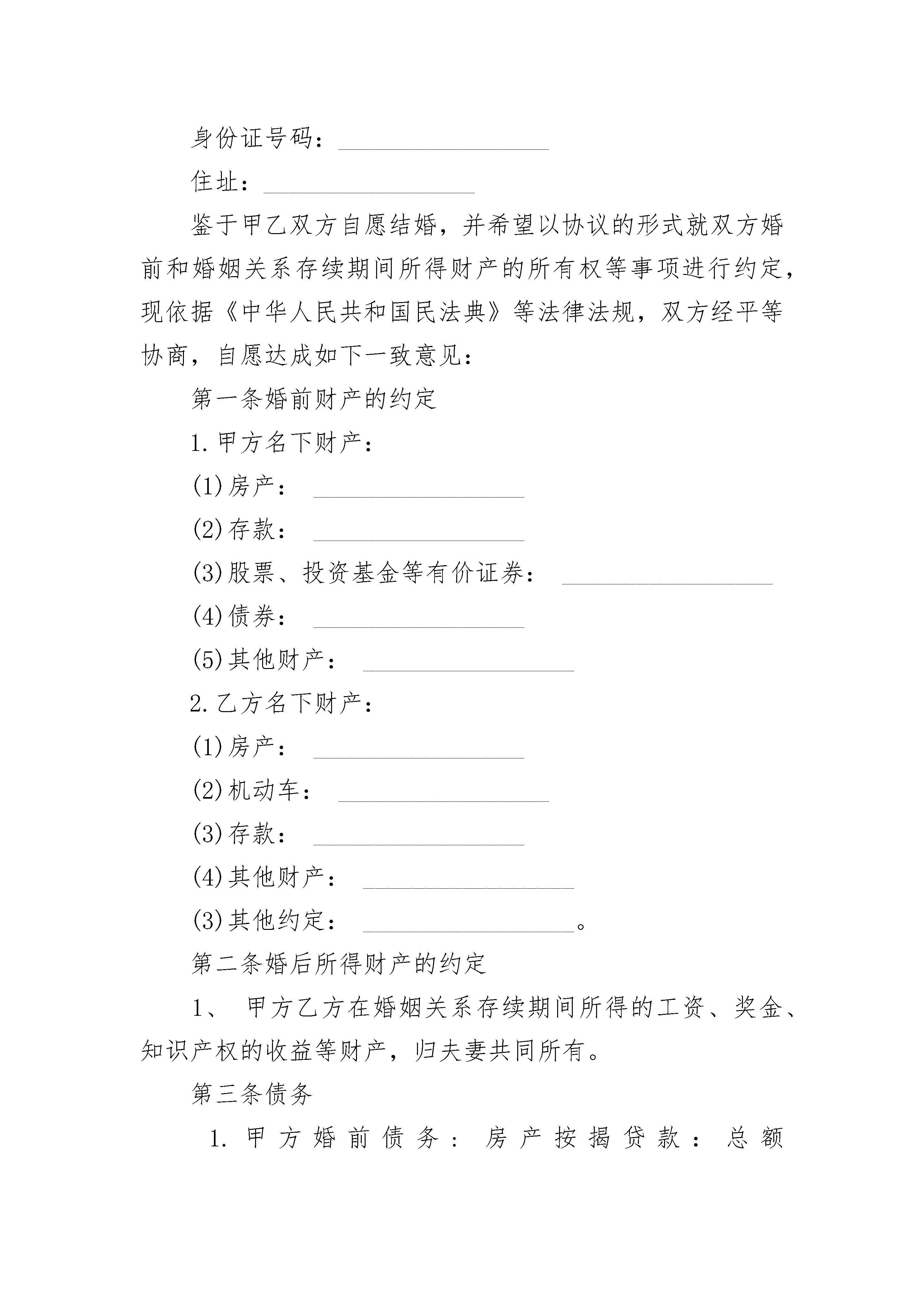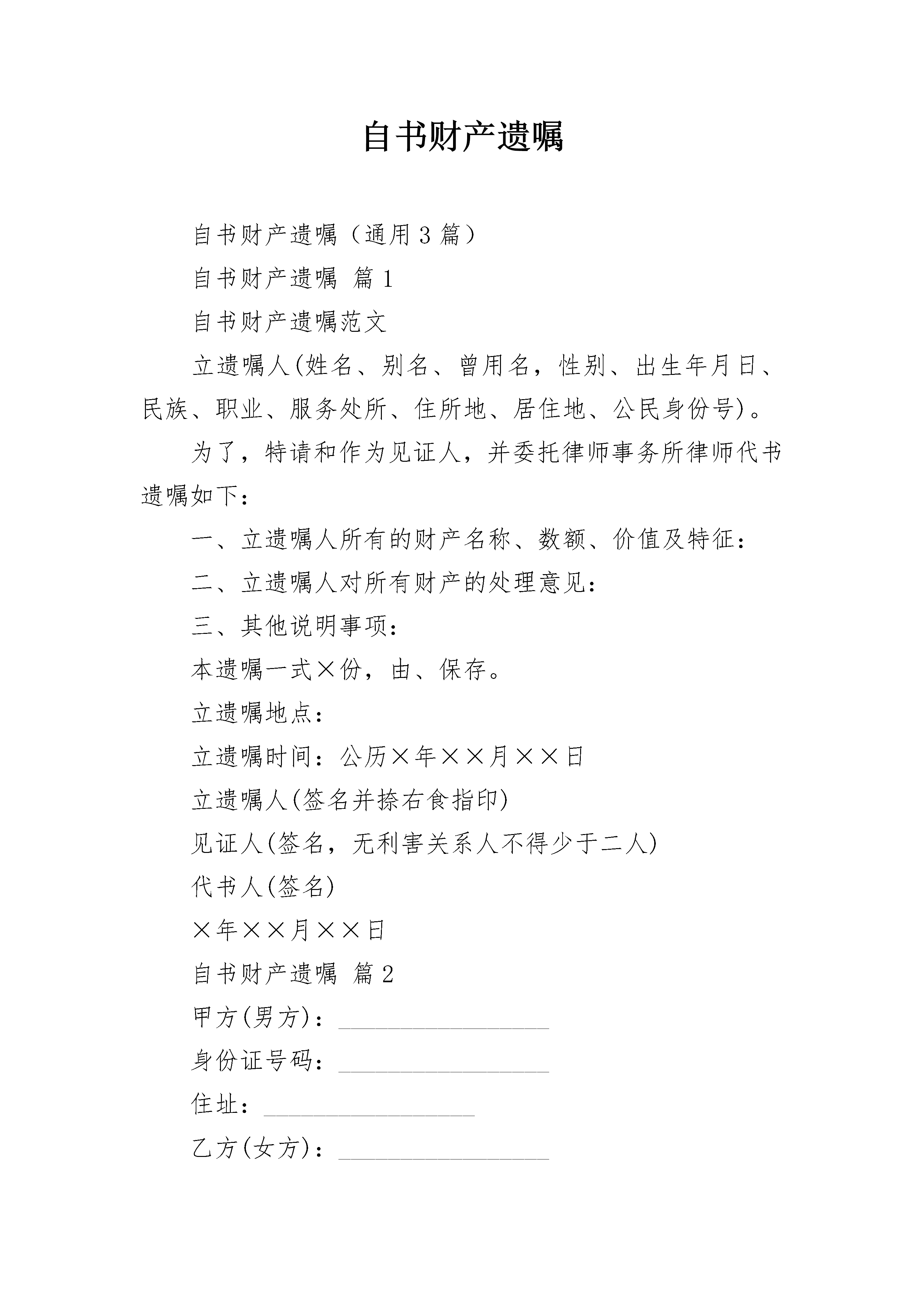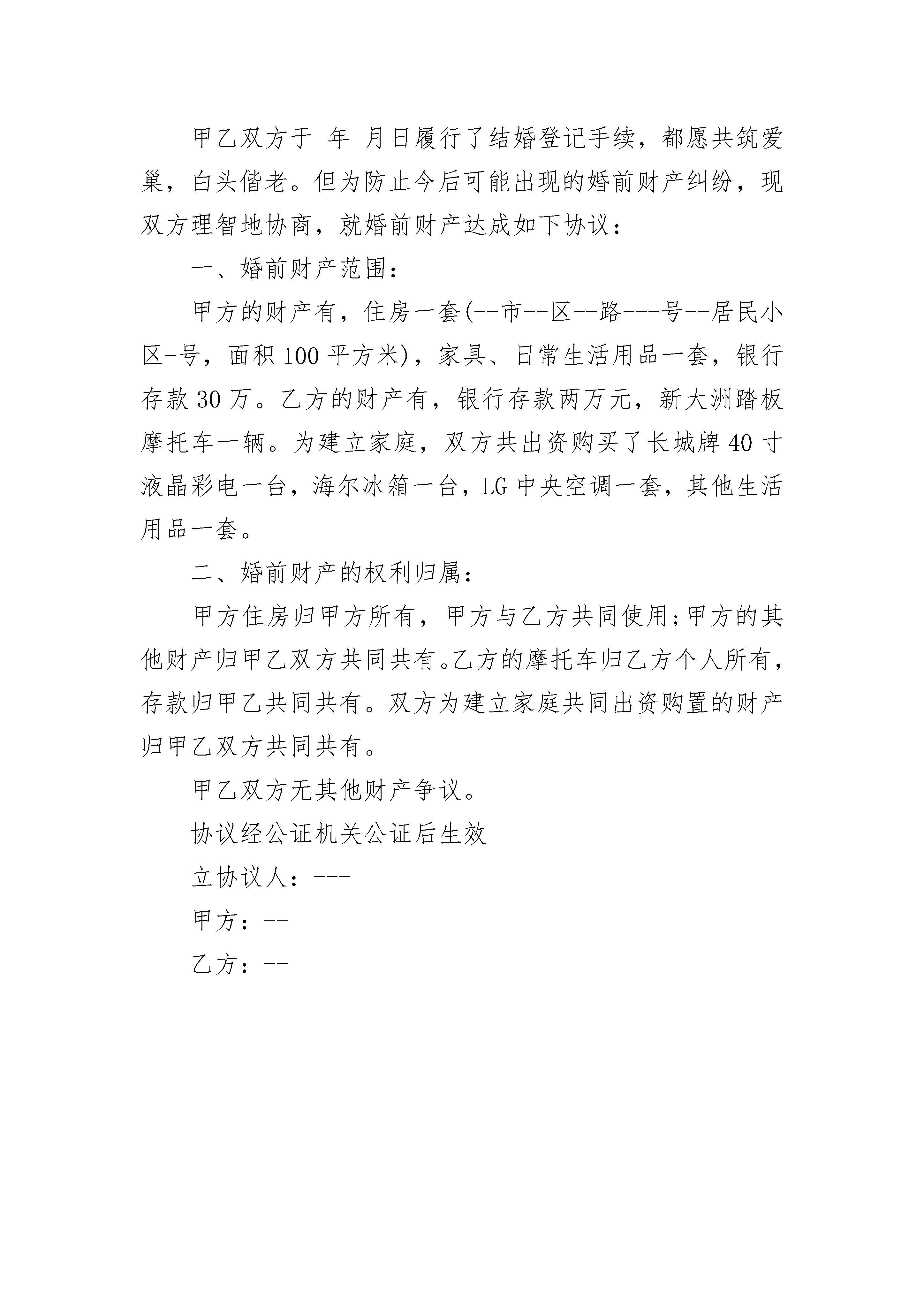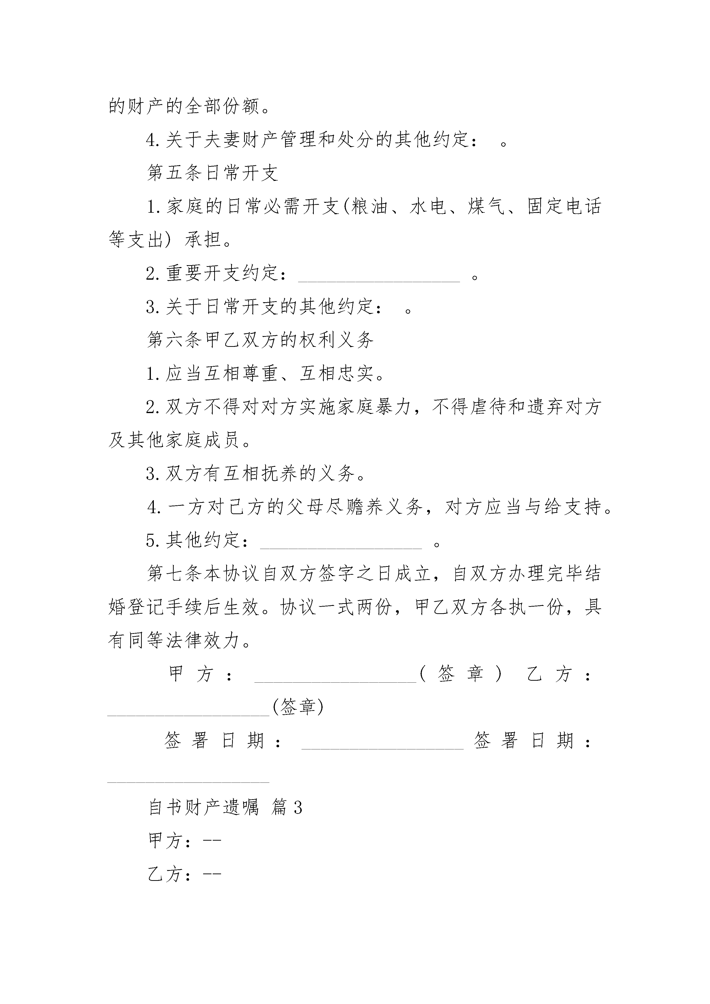 自书财产遗嘱自书财产遗嘱(通用3篇)自书财产遗嘱篇1自书财产遗嘱范文立遗嘱人(姓名、别名、曾用名,性别、出生年月日、民族、职业、服务处所、住所地、居住地、公民身份号)。为了,特请和作为见证人,并委托律师事务所律师代书遗嘱如下:一、立遗嘱人所有的财产名称、数额、价值及特征:二、立遗嘱人对所有财产的处理意见:三、其他说明事项:本遗嘱一式×份,由、保存。立遗嘱地点:立遗嘱时间:公历×年××月××日立遗嘱人(签名并捺右食指印)见证人(签名,无利害关系人不得少于二人)代书人(签名)×年××月××日自书财产遗嘱篇2甲方(男方):_________________身份证号码:_________________住址:_________________乙方(女方):_________________身份证号码:_________________住址:_________________鉴于甲乙双方自愿结婚,并希望以协议的形式就双方婚前和婚姻关系存续期间所得财产的所有权等事项进行约定,现依据《中华人民共和国民法典》等法律法规,双方经平等协商,自愿达成如下一致意见:第一条婚前财产的约定1.甲方名下财产:(1)房产:_________________(2)存款:_________________(3)股票、投资基金等有价证券:_________________(4)债券:_________________(5)其他财产:_________________2.乙方名下财产:(1)房产:_________________(2)机动车:_________________(3)存款:_________________(4)其他财产:_________________(3)其他约定:_________________。第二条婚后所得财产的约定1、甲方乙方在婚姻关系存续期间所得的工资、奖金、知识产权的收益等财产,归夫妻共同所有。第三条债务1.甲方婚前债务:房产按揭贷款:总额_________________万元;首付_________________万元;剩余贷款:_________________万元。无其他债务。故甲方婚前债务为_________________万元。甲方婚前债务在甲乙双方结婚后由甲乙双方用夫妻共同财产来共同还贷。甲方房屋中,双方婚后共同还贷支付的款项及其相对应财产增值部分,属于夫妻共同财产,可依法分割。乙方无婚前债务。2.甲乙双方婚后为满足夫妻共同生活所负的债务为夫妻共同负债,由双方共同负担。3.双方婚后借债应事先协商一致,任何未经双方协商并书面同意的用于非日常生活所需的债务,均为举债方一方债务,由其个人承担偿债责任。4.一方单独举债,事后由夫妻另一方追认的,应视为夫妻共同债务。5.其他约定:_________________。第四条夫妻财产的管理和处分1.归属夫妻共同财产的管理和处分。(1)因日常生活需要而管理或处理夫妻共同财产的,任何一方均有权决定。(2)夫或妻非因日常生活需要对夫妻共同财产做重要处理决定,夫妻双方应当平等协商,取得一致意见。2.归属一方的个人财产由财产归属一方进行管理和处分。3.任何一方不得隐藏和转移婚后夫妻共同财产,如有隐藏和转移行为的,另一方发现后有权取得对方所隐藏或转移的财产的全部份额。4.关于夫妻财产管理和处分的其他约定:。第五条日常开支1.家庭的日常必需开支(粮油、水电、煤气、固定电话等支出)承担。2.重要开支约定:_________________。3.关于日常开支的其他约定:。第六条甲乙双方的权利义务1.应当互相尊重、互相忠实。2.双方不得对对方实施家庭暴力,不得虐待和遗弃对方及其他家庭成员。3.双方有互相抚养的义务。4.一方对己方的父母尽赡养义务,对方应当与给支持。5.其他约定:_________________。第七条本协议自双方签字之日成立,自双方办理完毕结婚登记手续后生效。协议一式两份,甲乙双方各执一份,具有同等法律效力。甲方:_________________(签章)乙方:_________________(签章)签署日期:_________________签署日期:_________________自书财产遗嘱篇3甲方:--乙方:--甲乙双方于年月日履行了结婚登记手续,都愿共筑爱巢,白头偕老。但为防止今后可能出现的婚前财产纠纷,现双方理智地协商,就婚前财产达成如下协议:一、婚前财产范围:甲方的财产有,住房一套(--市--区--路---号--居民小区-号,面积100平方米),家具、日常生活用品一套,银行存款30万。乙方的财产有,银行存款两万元,新大洲踏板摩托车一辆。为建立家庭,双方共出资购买了长城牌40寸液晶彩电一台,海尔冰箱一台,LG中央空调一套,其他生活用品一套。二、婚前财产的权利归属:甲