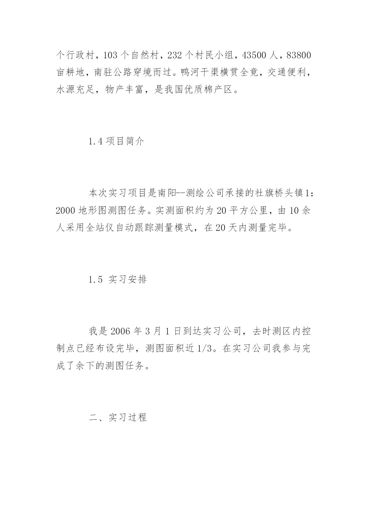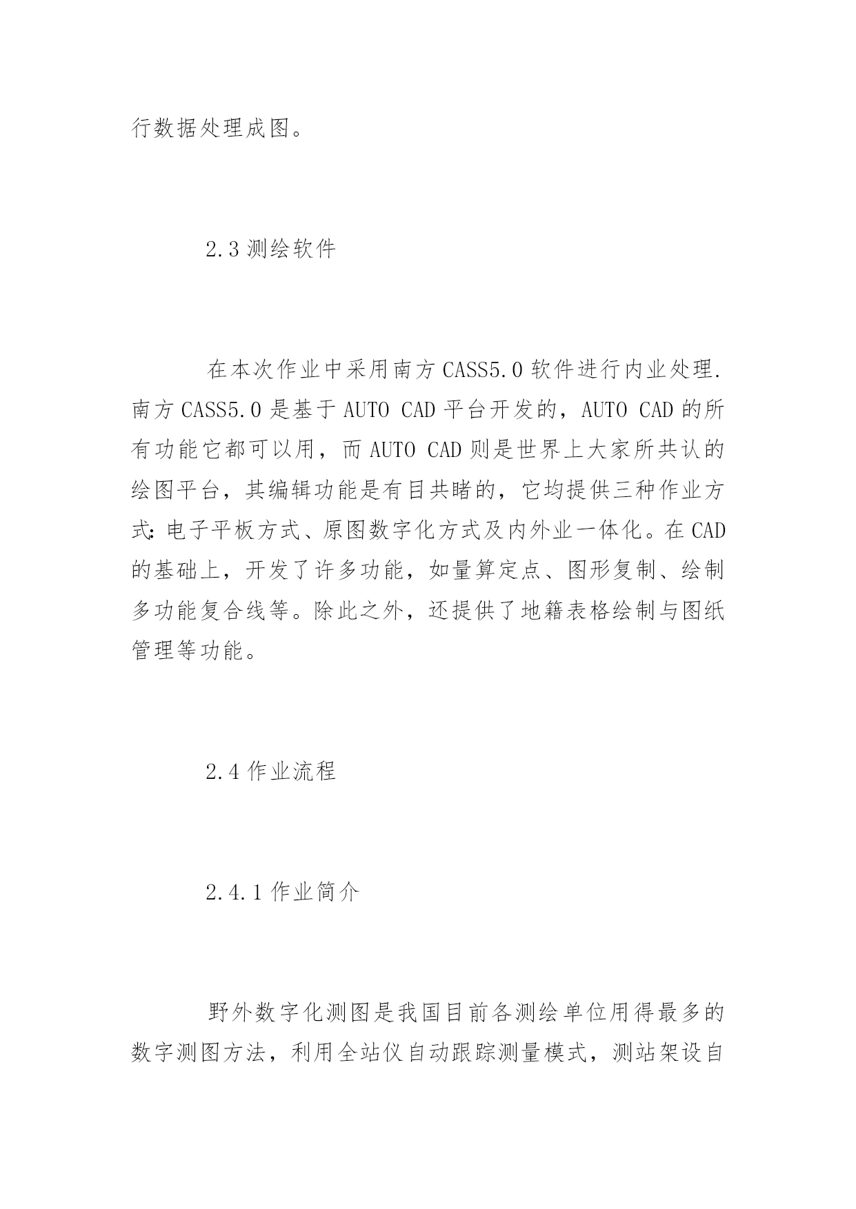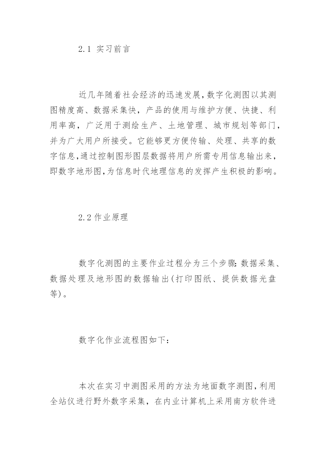 数字化测图实习心得 数字化测图实习心得 数字化测图实习是大家在校内完成教学计划所规定的全部课程和实习、实验、课程设计以后的一次综合性生产技能锻炼实习。其目的是巩固和运用所学的全部知识,特别是测绘专业的理论知识和课程实践,通过参加实际工作,了解和掌握本专业的基本知识,锻炼分析问题和解决问题的实际能力。下面搜集了数字化测图实习心得,欢迎阅读! 数字化测图实习心得【1】 一、实习安排 1.1性质目的 毕业实习是我们在校内完成教学计划所规定的全部课程和实习、实验、课程设计以后的一次综合性生产技能锻炼实习。其目的是巩固和运用所学的全部知识,特别是测绘专业的理论知识和课程实践,通过参加实际工作,了解和掌握本专业的基本知识,锻炼分析问题和解决问题的实际能力。 1.2实习单位 南阳--测绘有限公司 南阳--测绘公司位于南阳市工业南路,成立于2005年,注册资金100万元,年产值150万元。是南阳市仅有的两家具有乙级测绘资质的公司之一。主要承担南阳区县地形地籍测绘、国土技术、国土资源信息、土地评估、登记代理、房地产、规划设计等测绘任务。公司同时还是日本宾得河南代理,索佳特约经销商,拓普康特约经销商,科力达南方河南代理。 1.3实习地点 本次实习地点位于河南南阳社旗桥头镇。桥头镇是社旗县西部重镇,位于社旗、宛城、方城三县交接处。辖16个行政村,103个自然村,232个村民小组,43500人,83800亩耕地,南驻公路穿境而过。鸭河干渠横贯全竟,交通便利,水源充足,物产丰富,是我国优质棉产区。 1.4项目简介 本次实习项目是南阳--测绘公司承接的社旗桥头镇1:2000地形图测图任务。实测面积约为20平方公里,由10余人采用全站仪自动跟踪测量模式,在20天内测量完毕。 1.5实习安排 我是2006年3月1日到达实习公司,去时测区内控制点已经布设完毕,测图面积近1/3。在实习公司我参与完成了余下的测图任务。 二、实习过程 2.1实习前言 近几年随着社会经济的迅速发展,数字化测图以其测图精度高、数据采集快,产品的使用与维护方便、快捷、利用率高,广泛用于测绘生产、土地管理、城市规划等部门,并为广大用户所接受。它能够更方便传输、处理、共享的数字信息,通过控制图形图层数据将用户所需专用信息输出来,即数字地形图,为信息时代地理信息的发挥产生积极的影响。 2.2作业原理 数字化测图的主要作业过程分为三个步骤:数据采集、数据处理及地形图的数据输出(打印图纸、提供数据光盘等)。 数字化作业流程图如下: 本次在实习中测图采用的方法为地面数字测图,利用全站仪进行野外数字采集,在内业计算机上采用南方软件进行数据处理成图。 2.3测绘软件 在本次作业中采用南方CASS5.0软件进行内业处理.南方CASS5.0是基于AUTOCAD平台开发的,AUTOCAD的所有功能它都可以用,而AUTOCAD则是世界上大家所共认的绘图平台,其编辑功能是有目共睹的,它均提供三种作业方式:电子平板方式、原图数字化方式及内外业一体化。在CAD的基础上,开发了许多功能,如量算定点、图形复制、绘制多功能复合线等。除此之外,还提供了地籍表格绘制与图纸管理等功能。 2.4作业流程 2.4.1作业简介 野外数字化测图是我国目前各测绘单位用得最多的数字测图方法,利用全站仪自动跟踪测量模式,测站架设自动跟踪式全站仪,选择日本拓普康(Topcon)测量仪器。 2.4.2作业过程 我们在测图中也采用外业草图+室内交互编缉来完成测图工作。我们在测绘过程中共分3个地形测绘小组,每个小组3—4人不等,一人观测并在全站仪上作记录并编码,两人跑尺并内业绘图。 在点号的编码方式中,我们一个测区一个编码的方式。根据控制点的位置和实际的每天工作量,人工实地绘制草图,在草图上标明,每隔10个点和测站互通点号,防止出错。当在外业完成各点的编号(编码)后,回到室内就可以把传输到计算机的各点在计算机屏幕上以展绘编码的方式出来,再根据跑尺人员自己所走过的线路,辅以这些点号编码,则可比较方便地把这些点连接起来。或者通过编制编码引导文件,实现自动连线。当完成这项工作后,再把这些图拿到实地对照,量取实地没有测到的各种数据,再在计算机上进行交互编缉,从而得最终的地形图。 2.4.3注意事项 2.4.3.1司尺要点 采用以上方法,对观测及司尺人员的要求是比较高的。第一配合要默契,这一点测完了,下一点应测什么应心灵相通;对观测人员的输入数字及字母的熟练程度要求较高,一般应在10秒内完成。第二司尺人员担负着室内绘图的工作,是测图过程中的主要人员,所以对于地物(貌)的综合取舍等要心中有数,并且应在跑尺前确定好跑尺的线路,尽量避免走冤枉路。 采用这样的测量方法要省事、快捷。测站上所需要的仅是编码及照准两个过程,而司尺人员所需要做的仅是通过对讲机报