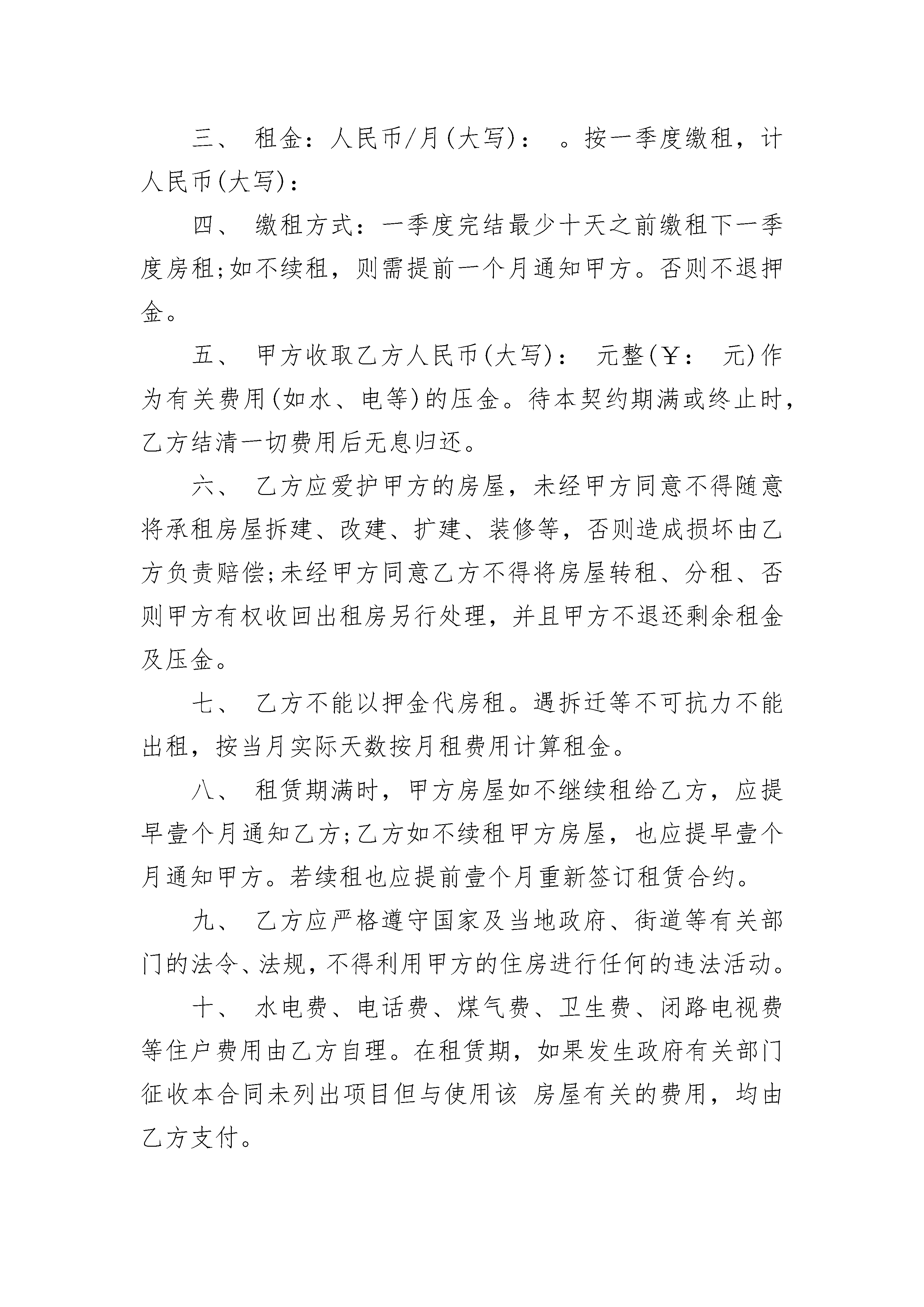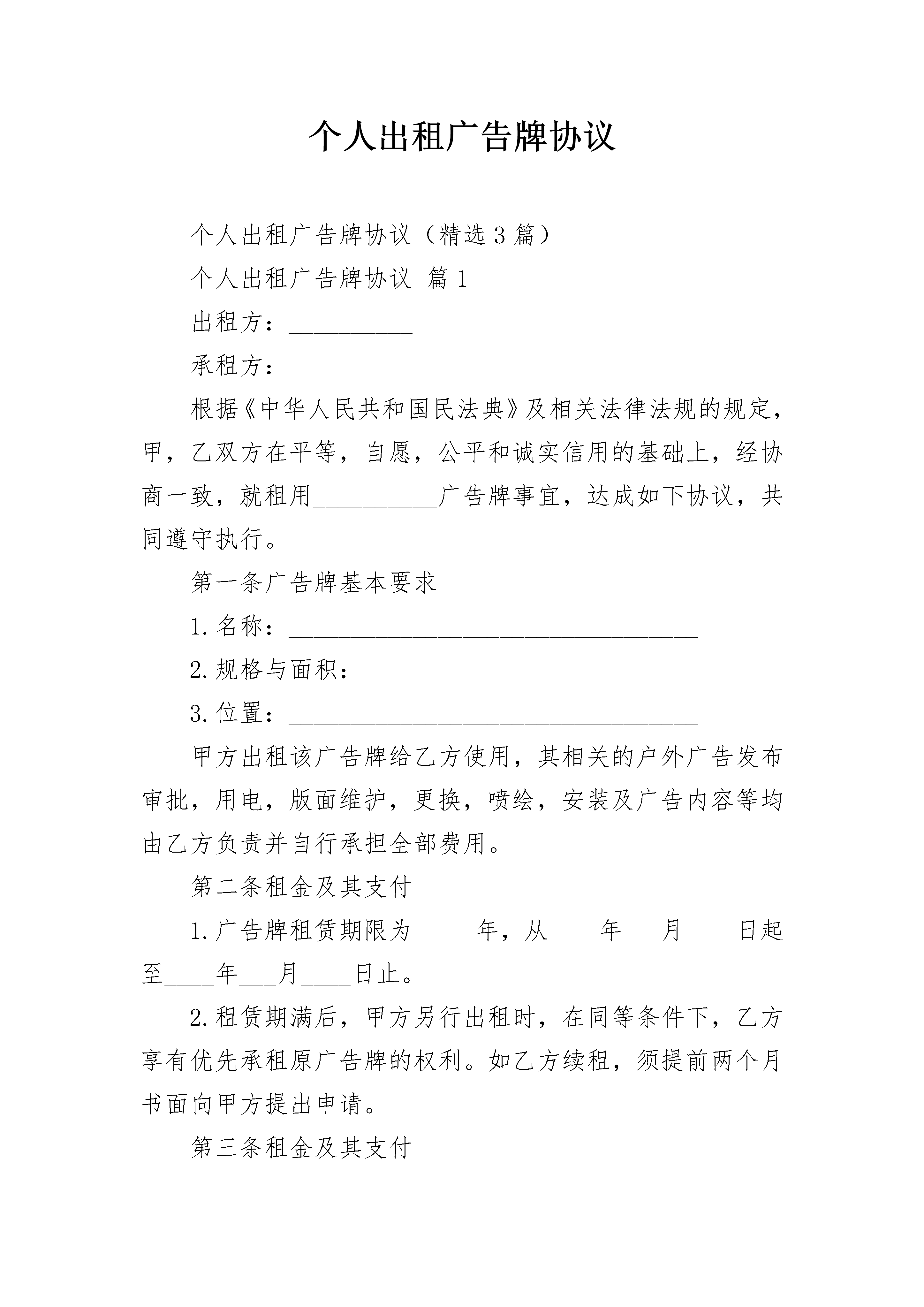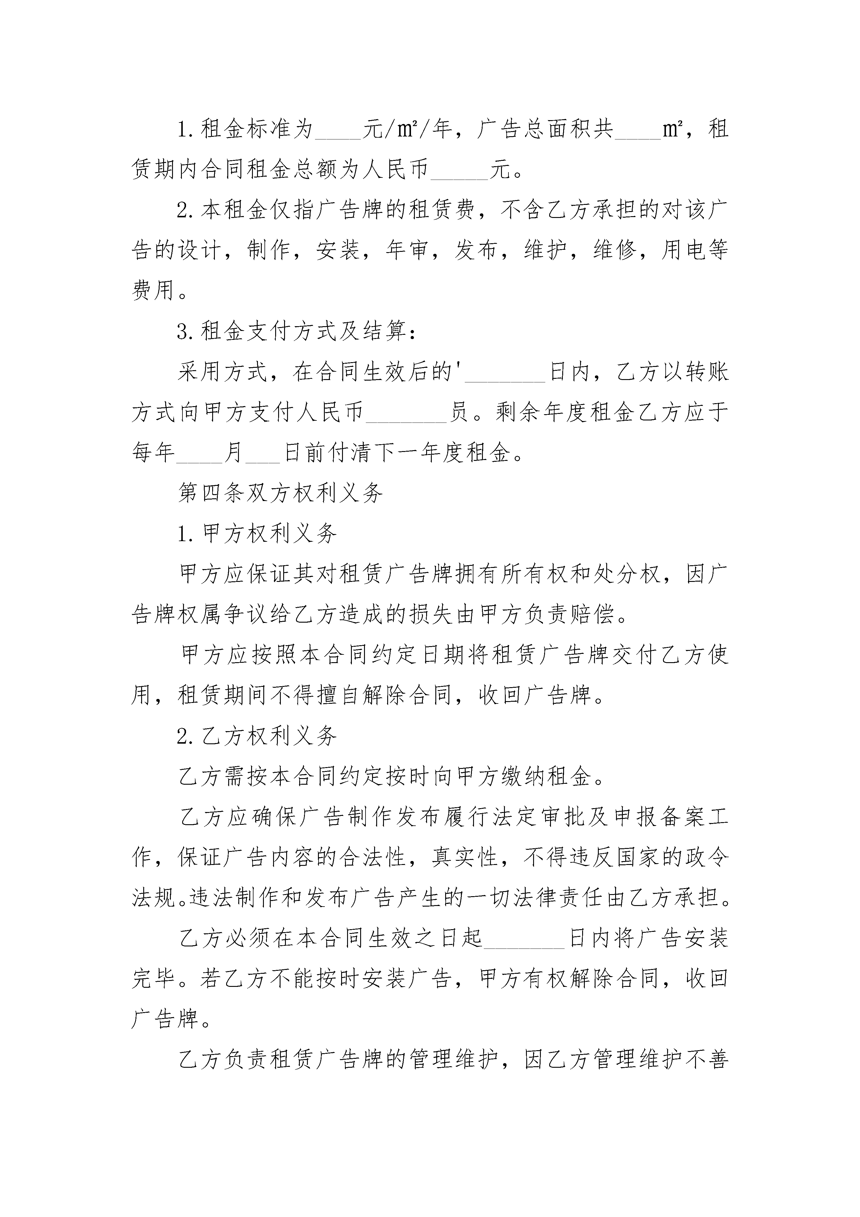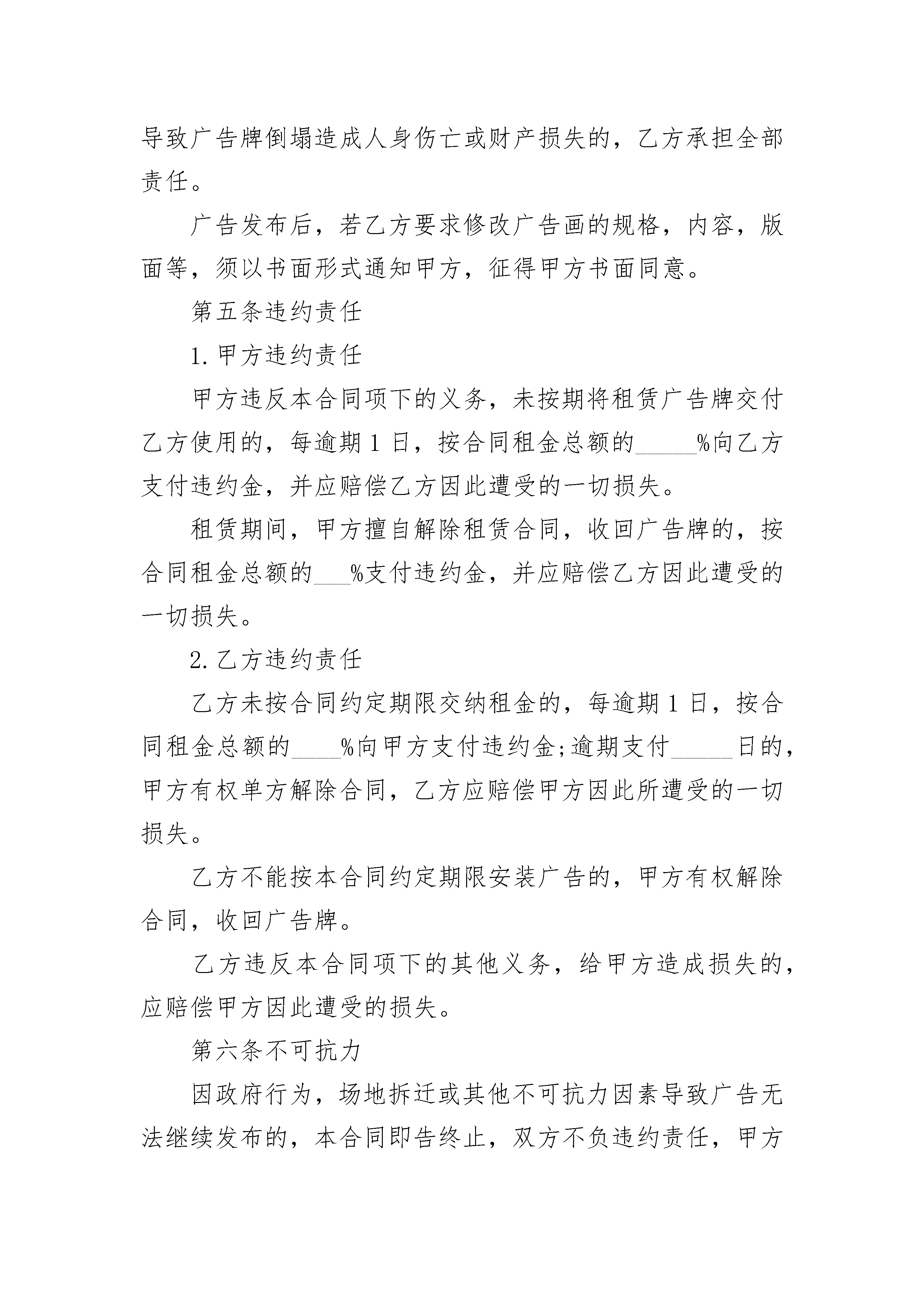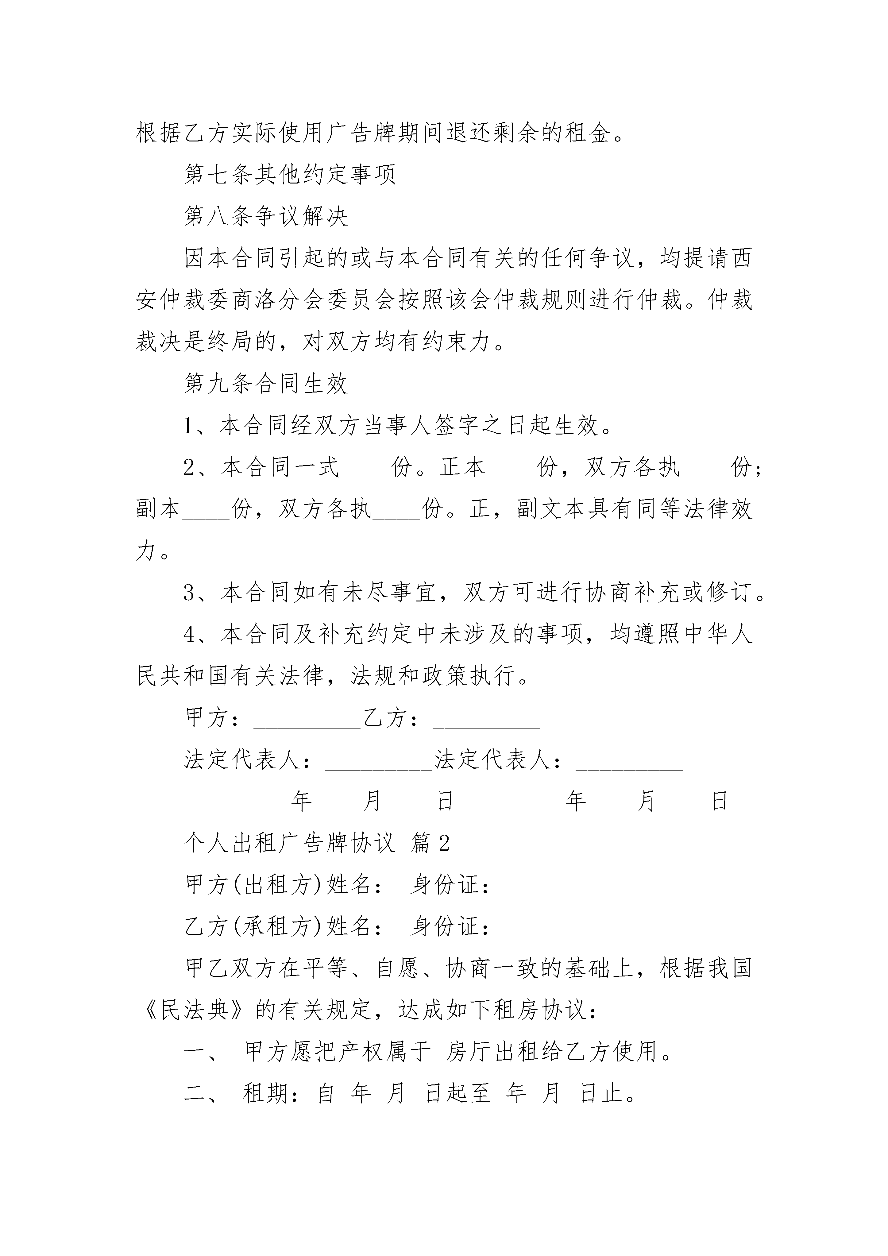 个人出租广告牌协议个人出租广告牌协议(精选3篇)个人出租广告牌协议篇1出租方:__________承租方:__________根据《中华人民共和国民法典》及相关法律法规的规定,甲,乙双方在平等,自愿,公平和诚实信用的基础上,经协商一致,就租用__________广告牌事宜,达成如下协议,共同遵守执行。第一条广告牌基本要求1.名称:_________________________________2.规格与面积:______________________________3.位置:_________________________________甲方出租该广告牌给乙方使用,其相关的户外广告发布审批,用电,版面维护,更换,喷绘,安装及广告内容等均由乙方负责并自行承担全部费用。第二条租金及其支付1.广告牌租赁期限为_____年,从____年___月____日起至____年___月____日止。2.租赁期满后,甲方另行出租时,在同等条件下,乙方享有优先承租原广告牌的权利。如乙方续租,须提前两个月书面向甲方提出申请。第三条租金及其支付1.租金标准为____元/㎡/年,广告总面积共____㎡,租赁期内合同租金总额为人民币_____元。2.本租金仅指广告牌的租赁费,不含乙方承担的对该广告的设计,制作,安装,年审,发布,维护,维修,用电等费用。3.租金支付方式及结算:采用方式,在合同生效后的'_______日内,乙方以转账方式向甲方支付人民币_______员。剩余年度租金乙方应于每年____月___日前付清下一年度租金。第四条双方权利义务1.甲方权利义务甲方应保证其对租赁广告牌拥有所有权和处分权,因广告牌权属争议给乙方造成的损失由甲方负责赔偿。甲方应按照本合同约定日期将租赁广告牌交付乙方使用,租赁期间不得擅自解除合同,收回广告牌。2.乙方权利义务乙方需按本合同约定按时向甲方缴纳租金。乙方应确保广告制作发布履行法定审批及申报备案工作,保证广告内容的合法性,真实性,不得违反国家的政令法规。违法制作和发布广告产生的一切法律责任由乙方承担。乙方必须在本合同生效之日起_______日内将广告安装完毕。若乙方不能按时安装广告,甲方有权解除合同,收回广告牌。乙方负责租赁广告牌的管理维护,因乙方管理维护不善导致广告牌倒塌造成人身伤亡或财产损失的,乙方承担全部责任。广告发布后,若乙方要求修改广告画的规格,内容,版面等,须以书面形式通知甲方,征得甲方书面同意。第五条违约责任1.甲方违约责任甲方违反本合同项下的义务,未按期将租赁广告牌交付乙方使用的,每逾期1日,按合同租金总额的_____%向乙方支付违约金,并应赔偿乙方因此遭受的一切损失。租赁期间,甲方擅自解除租赁合同,收回广告牌的,按合同租金总额的___%支付违约金,并应赔偿乙方因此遭受的一切损失。2.乙方违约责任乙方未按合同约定期限交纳租金的,每逾期1日,按合同租金总额的____%向甲方支付违约金;逾期支付_____日的,甲方有权单方解除合同,乙方应赔偿甲方因此所遭受的一切损失。乙方不能按本合同约定期限安装广告的,甲方有权解除合同,收回广告牌。乙方违反本合同项下的其他义务,给甲方造成损失的,应赔偿甲方因此遭受的损失。第六条不可抗力因政府行为,场地拆迁或其他不可抗力因素导致广告无法继续发布的,本合同即告终止,双方不负违约责任,甲方根据乙方实际使用广告牌期间退还剩余的租金。第七条其他约定事项第八条争议解决因本合同引起的或与本合同有关的任何争议,均提请西安仲裁委商洛分会委员会按照该会仲裁规则进行仲裁。仲裁裁决是终局的,对双方均有约束力。第九条合同生效1、本合同经双方当事人签字之日起生效。2、本合同一式____份。正本____份,双方各执____份;副本____份,双方各执____份。正,副文本具有同等法律效力。3、本合同如有未尽事宜,双方可进行协商补充或修订。4、本合同及补充约定中未涉及的事项,均遵照中华人民共和国有关法律,法规和政策执行。甲方:_________乙方:_________法定代表人:_________法定代表人:__________________年____月____日_________年____月____日个人出租广告牌协议篇2甲方(出租方)姓名:身份证:乙方(承租方)姓名:身份证:甲乙双方在平等、自愿、协商一致的基础上,根据我国《民法典》的有关规定,达成如下租房协议:一、甲方愿把产权属于房厅出租给乙方使用。二、租期:自年月日起至年月日止。三、租金:人民币/月(大写):。按一季度缴租,计人民币(大写):四、缴租方式:一季度完结最少十天之前缴租下一季度房租;如不续租,则需提前一个月通知甲方。否则不退押金。五、甲方收取乙方人民币(大写):元整(¥:元)作为有关费用(如水、电等)的压金。待本契约期满或