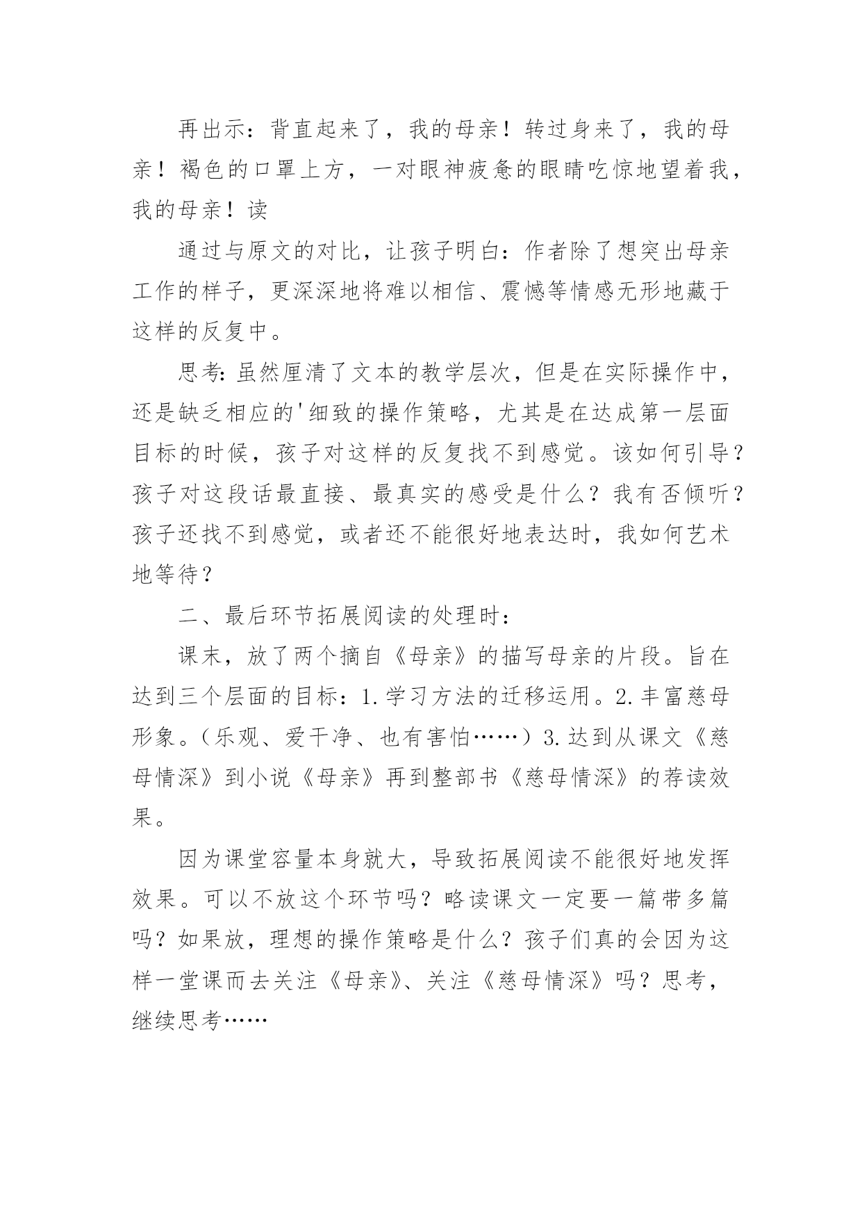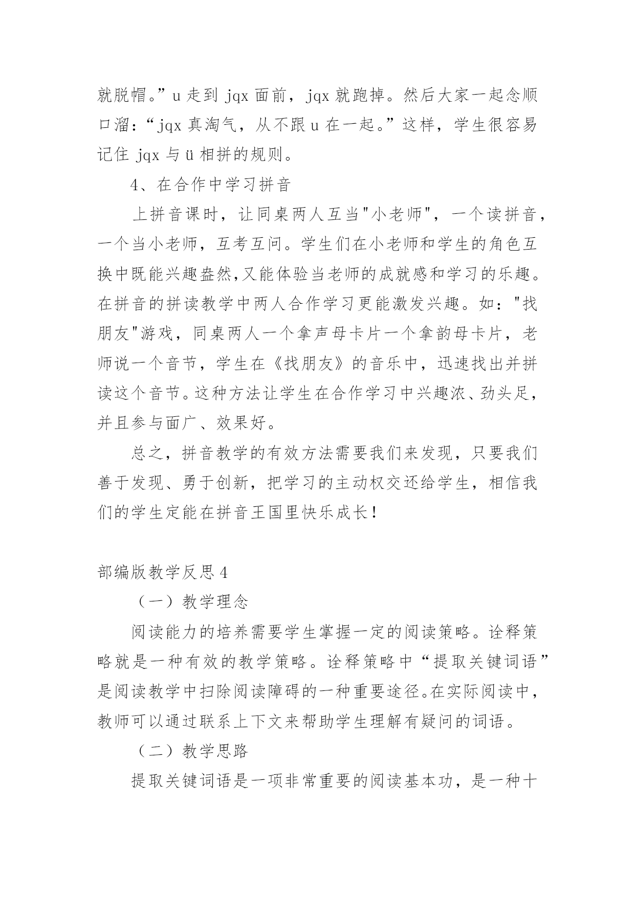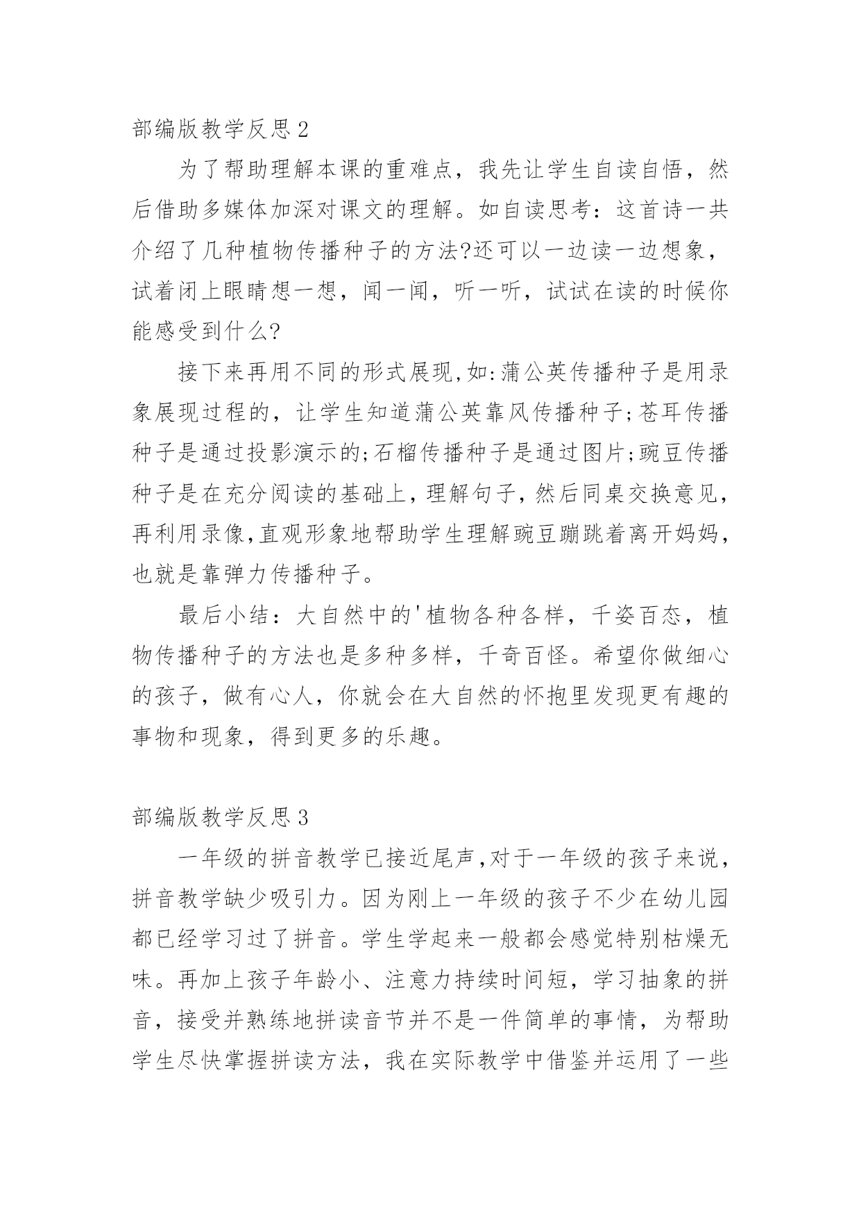 部编版教学反思 部编版教学反思身为一名刚到岗的教师,课堂教学是我们的工作之一,借助教学反思可以快速提升我们的教学能力,那么问题来了,教学反思应该怎么写?下面是小编帮大家整理的部编版教学反思,仅供参考,希望能够帮助到大家。部编版教学反思1急需改进的两个环节:一、特殊的言语表达形式教学时:背直起来了,我的母亲。转过身来了,我的母亲。褐色的口罩上方,一对眼神疲惫的眼睛吃惊地望着我,我的母亲……本段文字的教学预期达到两个层面目标:1.出示:背直起来了,转过身来了,褐色的口罩上方,一对眼神疲惫的眼睛吃惊地望着我,我的母亲……读再出示:我的母亲,背直起来了,转过身来了,褐色的口罩上方,一对眼神疲惫的眼睛吃惊地望着我……读通过与原文的对比,让孩子明白:这样的反复,秘妙在于强调了母亲工作的样子和状态。2.出示:背直起来了,这是我的母亲?转过身来了,这是我的母亲?褐色的口罩上方,一对眼神疲惫的眼睛吃惊地望着我,这是我的母亲?读再出示:背直起来了,我的母亲!转过身来了,我的母亲!褐色的口罩上方,一对眼神疲惫的眼睛吃惊地望着我,我的母亲!读通过与原文的对比,让孩子明白:作者除了想突出母亲工作的样子,更深深地将难以相信、震憾等情感无形地藏于这样的反复中。思考:虽然厘清了文本的教学层次,但是在实际操作中,还是缺乏相应的'细致的操作策略,尤其是在达成第一层面目标的时候,孩子对这样的反复找不到感觉。该如何引导?孩子对这段话最直接、最真实的感受是什么?我有否倾听?孩子还找不到感觉,或者还不能很好地表达时,我如何艺术地等待?二、最后环节拓展阅读的处理时:课末,放了两个摘自《母亲》的描写母亲的片段。旨在达到三个层面的目标:1.学习方法的迁移运用。2.丰富慈母形象。(乐观、爱干净、也有害怕……)3.达到从课文《慈母情深》到小说《母亲》再到整部书《慈母情深》的荐读效果。因为课堂容量本身就大,导致拓展阅读不能很好地发挥效果。可以不放这个环节吗?略读课文一定要一篇带多篇吗?如果放,理想的操作策略是什么?孩子们真的会因为这样一堂课而去关注《母亲》、关注《慈母情深》吗?思考,继续思考……部编版教学反思2为了帮助理解本课的重难点,我先让学生自读自悟,然后借助多媒体加深对课文的理解。如自读思考:这首诗一共介绍了几种植物传播种子的方法?还可以一边读一边想象,试着闭上眼睛想一想,闻一闻,听一听,试试在读的时候你能感受到什么?接下来再用不同的形式展现,如:蒲公英传播种子是用录象展现过程的,让学生知道蒲公英靠风传播种子;苍耳传播种子是通过投影演示的;石榴传播种子是通过图片;豌豆传播种子是在充分阅读的基础上,理解句子,然后同桌交换意见,再利用录像,直观形象地帮助学生理解豌豆蹦跳着离开妈妈,也就是靠弹力传播种子。最后小结:大自然中的'植物各种各样,千姿百态,植物传播种子的方法也是多种多样,千奇百怪。希望你做细心的孩子,做有心人,你就会在大自然的怀抱里发现更有趣的事物和现象,得到更多的乐趣。部编版教学反思3一年级的拼音教学已接近尾声,对于一年级的孩子来说,拼音教学缺少吸引力。因为刚上一年级的孩子不少在幼儿园都已经学习过了拼音。学生学起来一般都会感觉特别枯燥无味。再加上孩子年龄小、注意力持续时间短,学习抽象的拼音,接受并熟练地拼读音节并不是一件简单的事情,为帮助学生尽快掌握拼读方法,我在实际教学中借鉴并运用了一些形象生动的方法,取得了较好的效果。1、在游戏中记忆拼音一年级学生的记忆特点是记得快、忘得快。根据学生年龄小,活泼好动、喜欢表现、记忆力强的特点,我将枯燥无味的'拼音学习换成找朋友、开火车、比赛、猜谜语、变魔术等形式,激发学生的学习兴趣。通过趣味性强的游戏活动,学生对字母的音、形掌握得更牢固,对拼音音节的拼读积极性更高,学得轻松,学得扎实。2、在比较中巩固拼音汉语拼音是符号文字,由一些固定的字母笔画组成,包括左半圆、右半圆、长竖、短竖等等。在教由这些笔画组成的b、p、d、q等字母时,将这四个字母分成两组启发学生采用比较的方法学习。这组形近字母在比较时,可以引导学生想:b-p都是右半圆,听广播(b)天线往上拉,泼水(p)水往下流;d-q都是左半圆,马蹄(d)向上带土,气球(q)下边拉绳。还可同时加上手势和口诀:右下半圆b,左下半圆d,右上半圆p,左上半圆q。学生在边看、边说边动手的过程中加深了对这两组字母的记忆。两个相近字母一目了然,使学生模糊的形象得以清晰。3、在表演中掌握拼音表演活动形象直观、生动有趣,能够帮助学生在玩中获得知识,形成记忆,如学习jqx和ü相拼的规则时,让五个小朋友戴着标有jqxüu的头饰表演,ü走到jqx面前就去掉头饰,然后大家一起念顺口溜:“小ü小ü有礼貌,见到jqx就脱帽。”u走到jqx面前,jqx就跑掉。然后大家一起念顺口溜:“jqx真淘气,从不跟u在一起。”