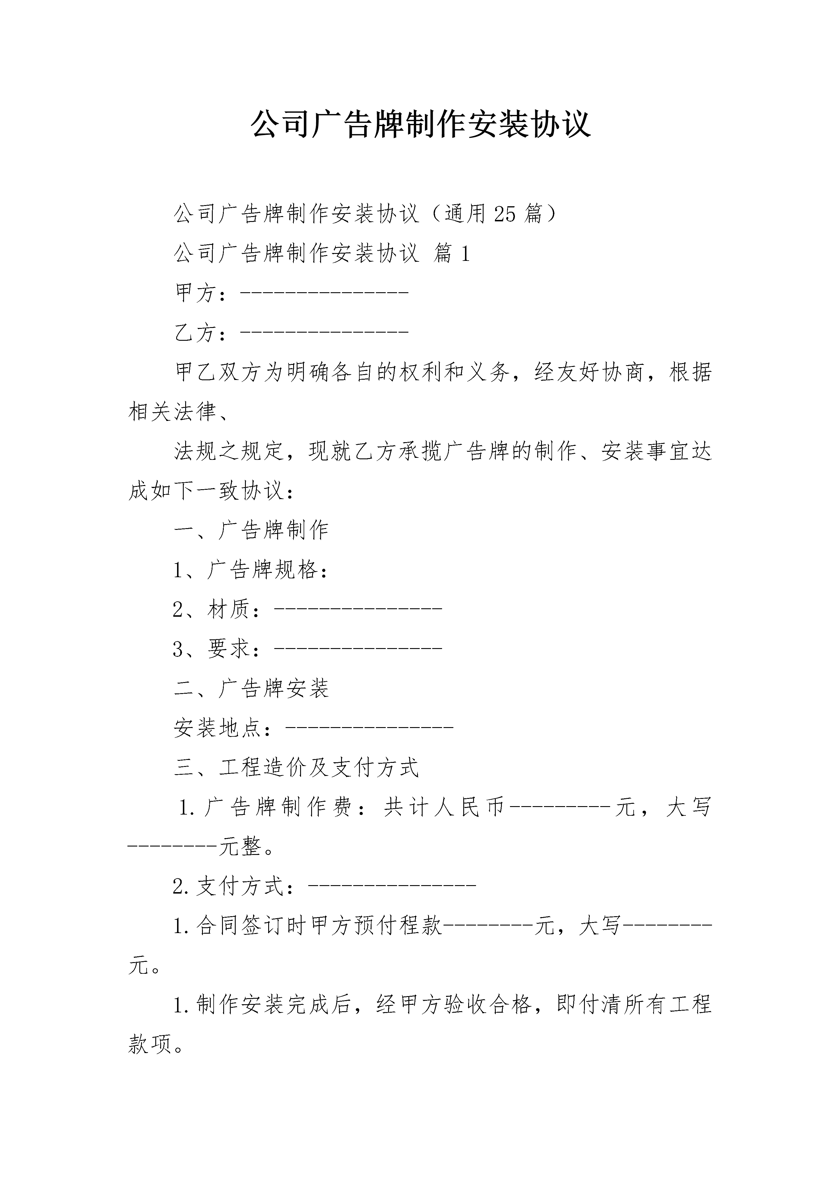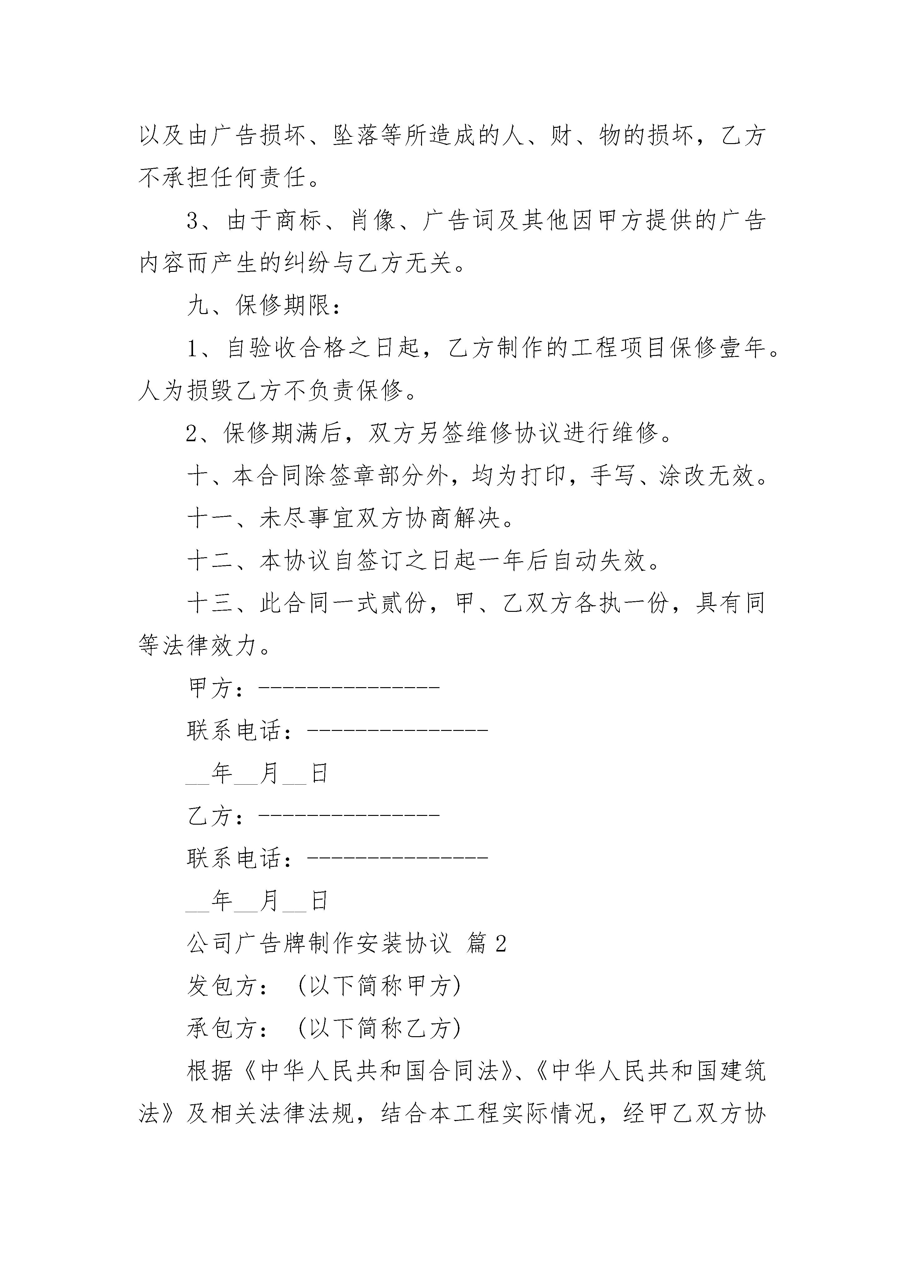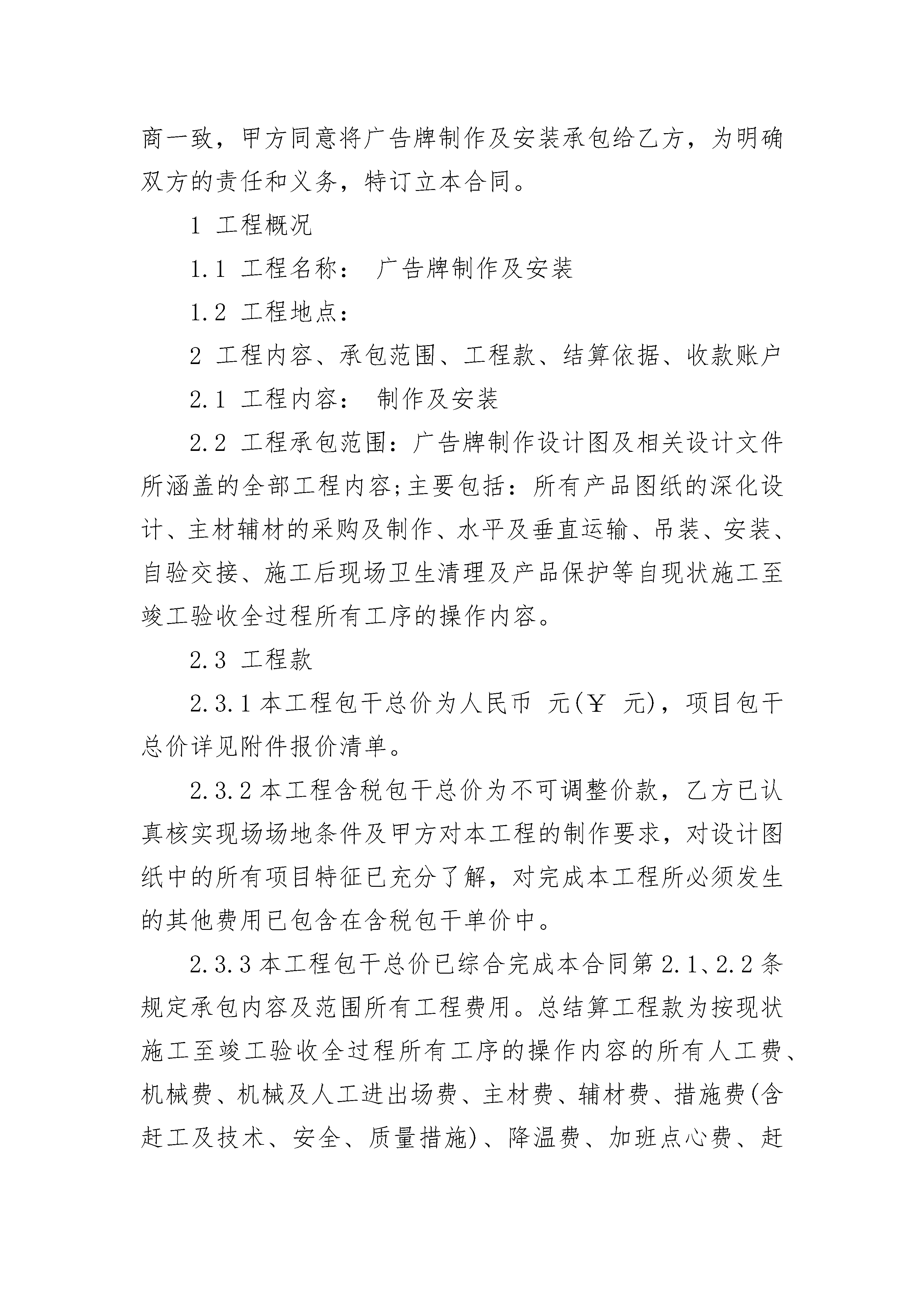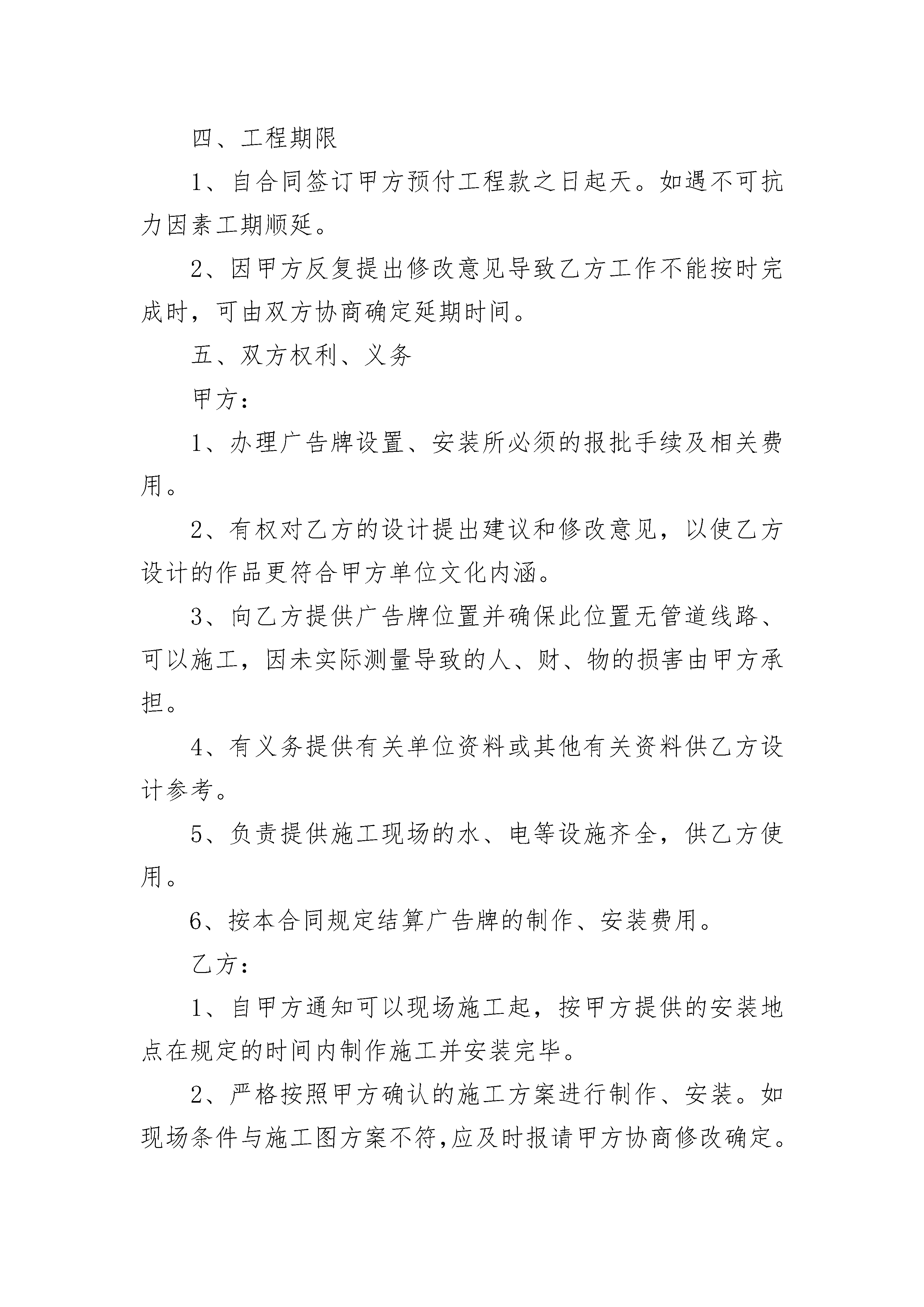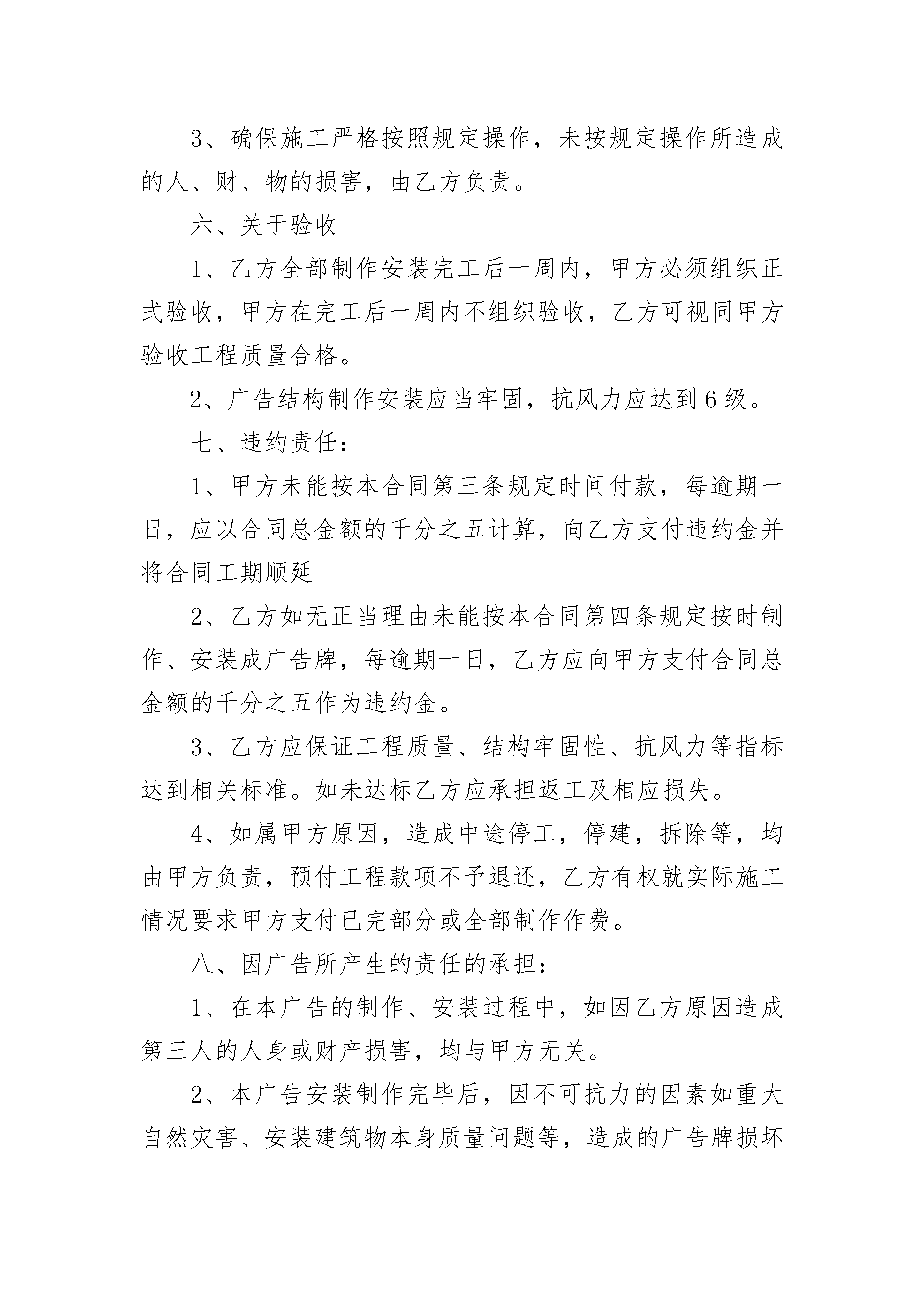 公司广告牌制作安装协议公司广告牌制作安装协议(通用25篇)公司广告牌制作安装协议篇1甲方:---------------乙方:---------------甲乙双方为明确各自的权利和义务,经友好协商,根据相关法律、法规之规定,现就乙方承揽广告牌的制作、安装事宜达成如下一致协议:一、广告牌制作1、广告牌规格:2、材质:---------------3、要求:---------------二、广告牌安装安装地点:---------------三、工程造价及支付方式1.广告牌制作费:共计人民币---------元,大写--------元整。2.支付方式:---------------1.合同签订时甲方预付程款--------元,大写--------元。1.制作安装完成后,经甲方验收合格,即付清所有工程款项。四、工程期限1、自合同签订甲方预付工程款之日起天。如遇不可抗力因素工期顺延。2、因甲方反复提出修改意见导致乙方工作不能按时完成时,可由双方协商确定延期时间。五、双方权利、义务甲方:1、办理广告牌设置、安装所必须的报批手续及相关费用。2、有权对乙方的设计提出建议和修改意见,以使乙方设计的作品更符合甲方单位文化内涵。3、向乙方提供广告牌位置并确保此位置无管道线路、可以施工,因未实际测量导致的人、财、物的损害由甲方承担。4、有义务提供有关单位资料或其他有关资料供乙方设计参考。5、负责提供施工现场的水、电等设施齐全,供乙方使用。6、按本合同规定结算广告牌的制作、安装费用。乙方:1、自甲方通知可以现场施工起,按甲方提供的安装地点在规定的时间内制作施工并安装完毕。2、严格按照甲方确认的施工方案进行制作、安装。如现场条件与施工图方案不符,应及时报请甲方协商修改确定。3、确保施工严格按照规定操作,未按规定操作所造成的人、财、物的损害,由乙方负责。六、关于验收1、乙方全部制作安装完工后一周内,甲方必须组织正式验收,甲方在完工后一周内不组织验收,乙方可视同甲方验收工程质量合格。2、广告结构制作安装应当牢固,抗风力应达到6级。七、违约责任:1、甲方未能按本合同第三条规定时间付款,每逾期一日,应以合同总金额的千分之五计算,向乙方支付违约金并将合同工期顺延2、乙方如无正当理由未能按本合同第四条规定按时制作、安装成广告牌,每逾期一日,乙方应向甲方支付合同总金额的千分之五作为违约金。3、乙方应保证工程质量、结构牢固性、抗风力等指标达到相关标准。如未达标乙方应承担返工及相应损失。4、如属甲方原因,造成中途停工,停建,拆除等,均由甲方负责,预付工程款项不予退还,乙方有权就实际施工情况要求甲方支付已完部分或全部制作作费。八、因广告所产生的责任的承担:1、在本广告的制作、安装过程中,如因乙方原因造成第三人的人身或财产损害,均与甲方无关。2、本广告安装制作完毕后,因不可抗力的因素如重大自然灾害、安装建筑物本身质量问题等,造成的广告牌损坏以及由广告损坏、坠落等所造成的人、财、物的损坏,乙方不承担任何责任。3、由于商标、肖像、广告词及其他因甲方提供的广告内容而产生的纠纷与乙方无关。九、保修期限:1、自验收合格之日起,乙方制作的工程项目保修壹年。人为损毁乙方不负责保修。2、保修期满后,双方另签维修协议进行维修。十、本合同除签章部分外,均为打印,手写、涂改无效。十一、未尽事宜双方协商解决。十二、本协议自签订之日起一年后自动失效。十三、此合同一式贰份,甲、乙双方各执一份,具有同等法律效力。甲方:---------------联系电话:---------------__年__月__日乙方:---------------联系电话:---------------__年__月__日公司广告牌制作安装协议篇2发包方:(以下简称甲方)承包方:(以下简称乙方)根据《中华人民共和国合同法》、《中华人民共和国建筑法》及相关法律法规,结合本工程实际情况,经甲乙双方协商一致,甲方同意将广告牌制作及安装承包给乙方,为明确双方的责任和义务,特订立本合同。1工程概况1.1工程名称:广告牌制作及安装1.2工程地点:2工程内容、承包范围、工程款、结算依据、收款账户2.1工程内容:制作及安装2.2工程承包范围:广告牌制作设计图及相关设计文件所涵盖的全部工程内容;主要包括:所有产品图纸的深化设计、主材辅材的采购及制作、水平及垂直运输、吊装、安装、自验交接、施工后现场卫生清理及产品保护等自现状施工至竣工验收全过程所有工序的操作内容。2.3工程款2.3.1本工程包干总价为人民币元(¥元),项目包干总价详见附件报价清单。2.3.2本工程含税包干总价为不可调整价款,乙方已认真核实现场场地条件及甲方对本工程的制作要求,对设计图纸中的所有项目特征已充分了解,对完成本工程所必须发生的其他费用已包含在含税包干单价中。2.3.3
