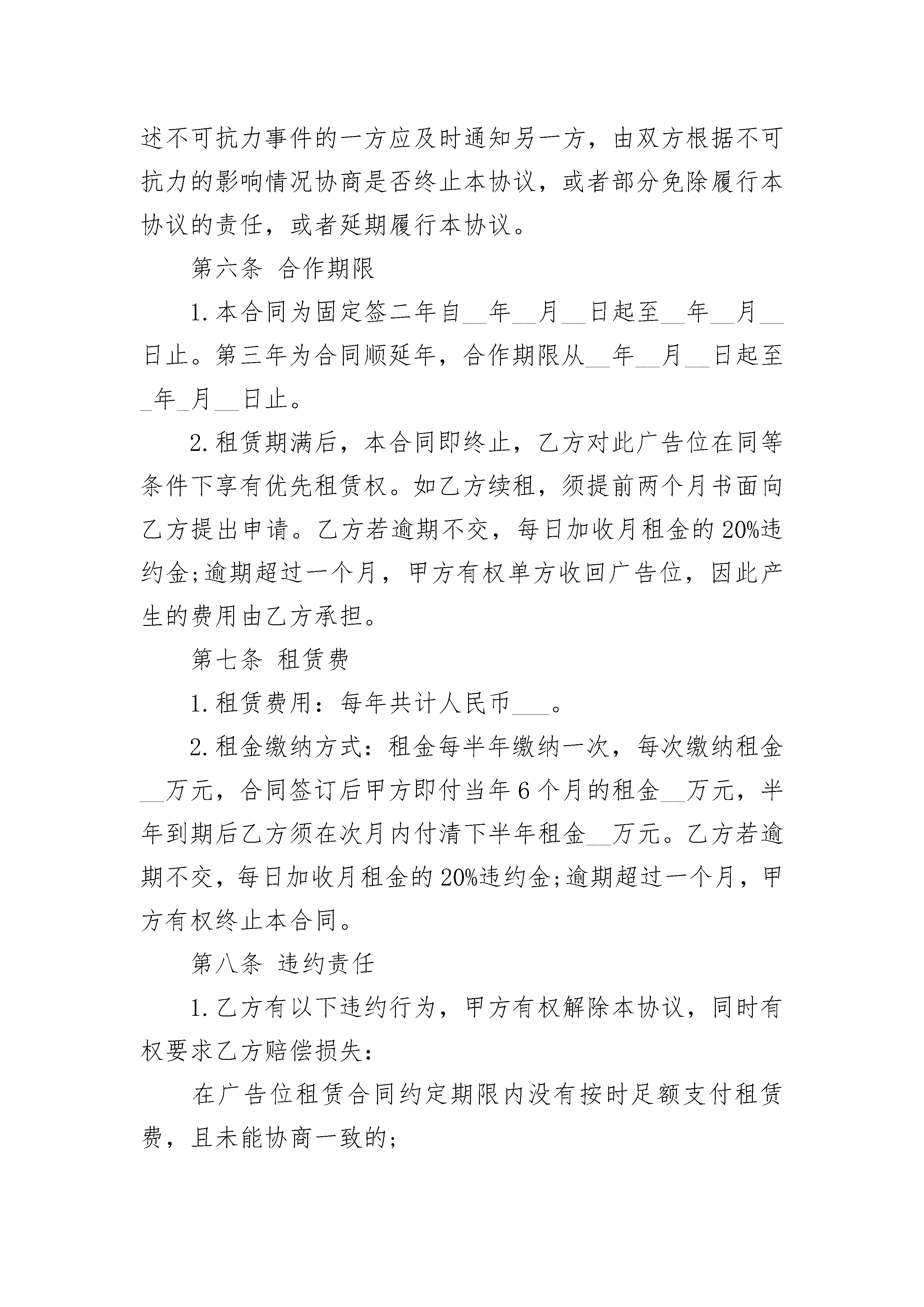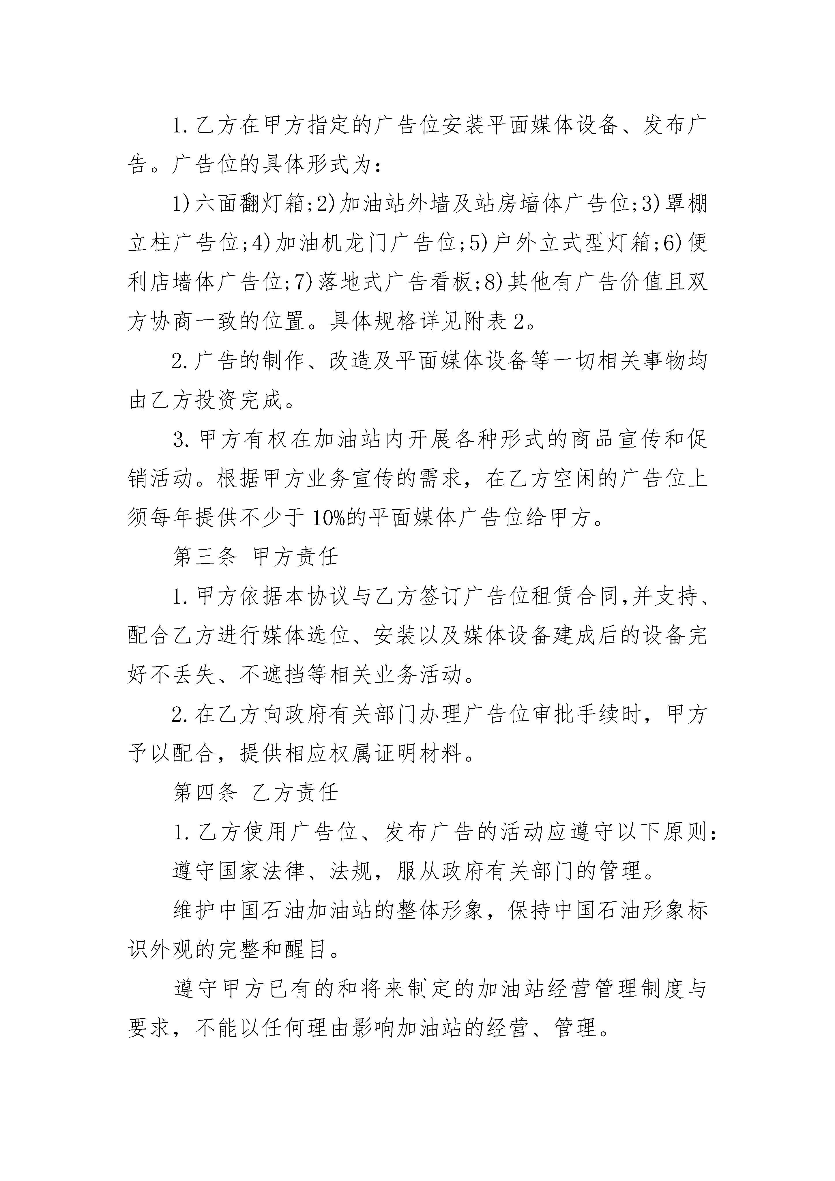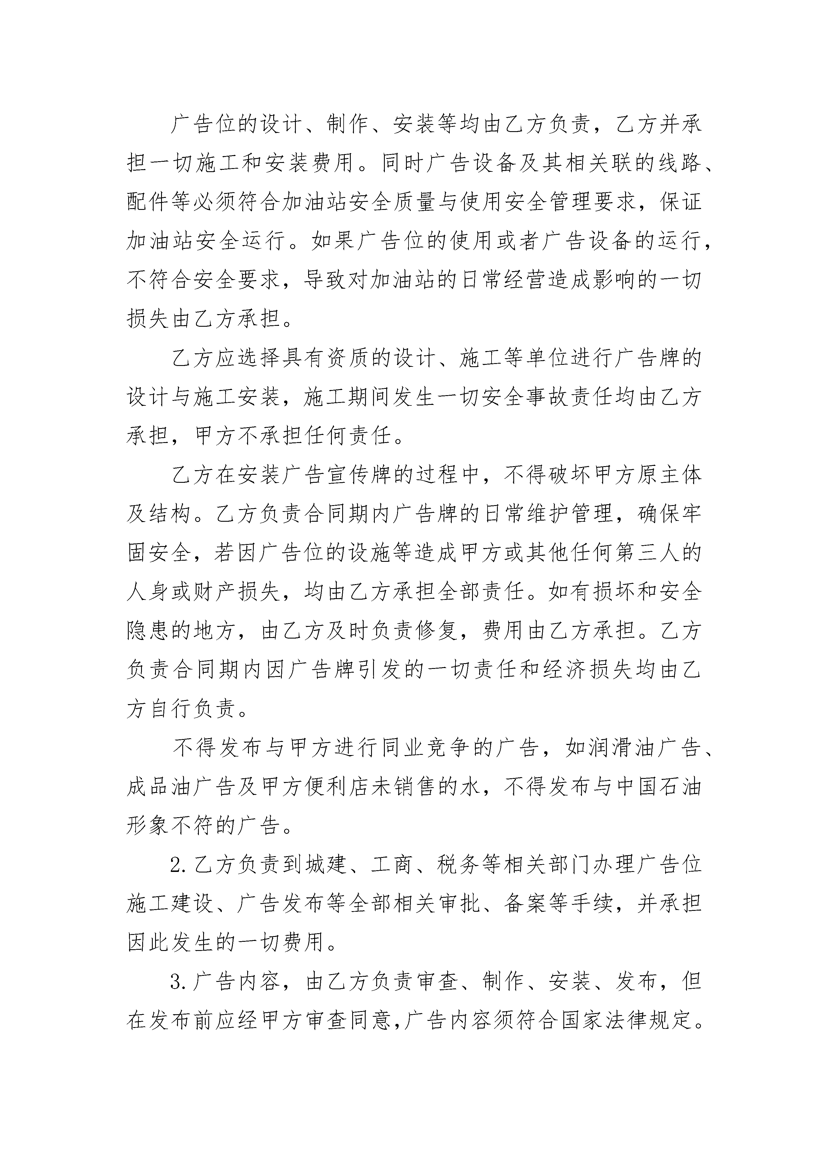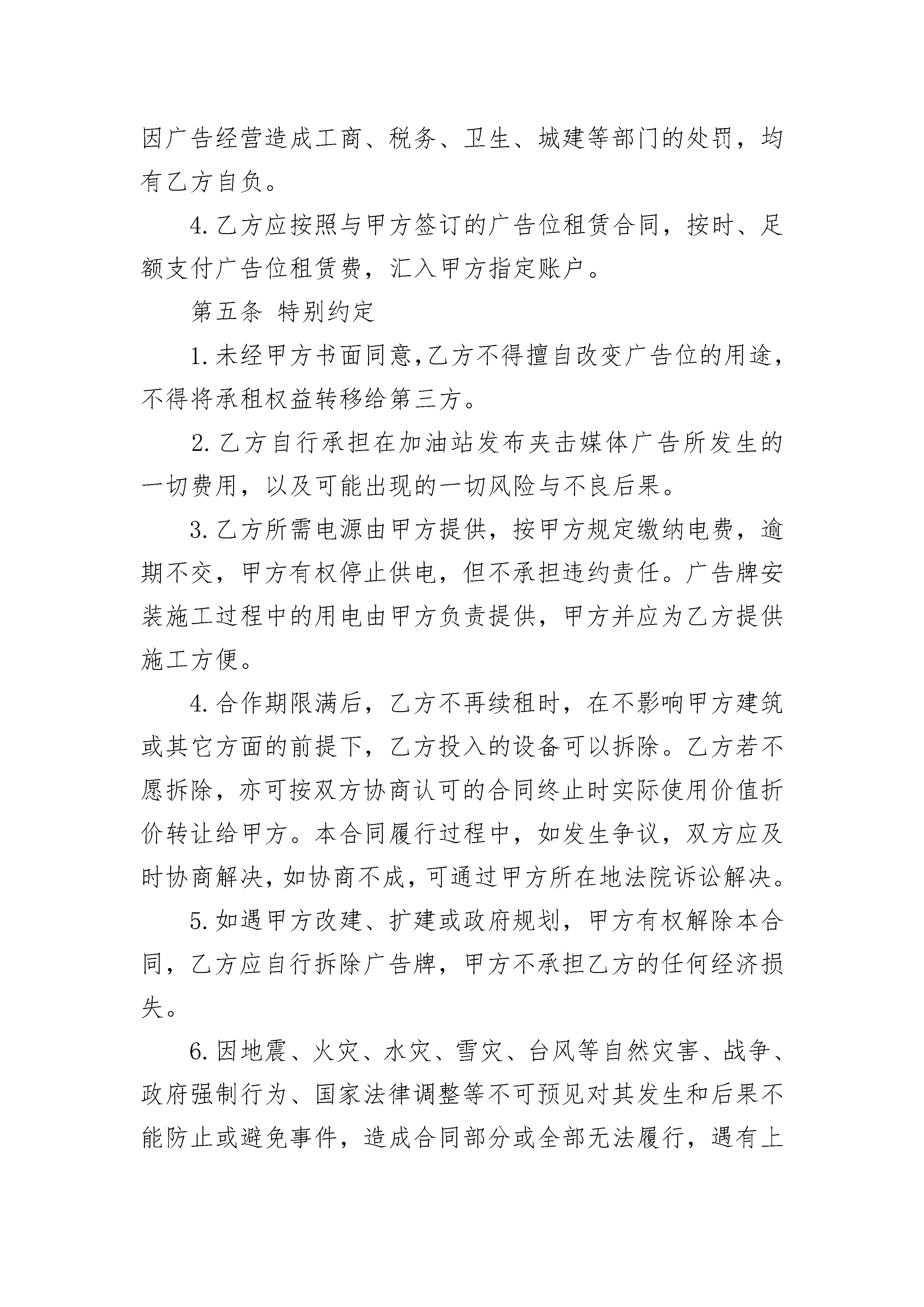 加油站广告租赁合同加油站广告租赁合同(精选3篇)加油站广告租赁合同篇1合同编号甲方:中国石油天然气股份有限公司__分公司乙方:签订时间:年月日签订地点:根据《中华人民共和国民法典》及相关法律法规规定,在平等、自愿、协商一致的基础上,甲乙双方就加油站广告位的租赁达成以下协议:第一条广告位基本情况1.甲方租赁给乙方广告位的位置:中国石油__销售分公司下属协议内签订的加油站场所,共46座加油站,具体详见附表1。2.“广告位”是指甲方指定的加油站内固定场地,由乙方用于建设、安装平面媒体设备,发布经政府相关部门及其他有权机关许可或批准的广告。第二条广告位的使用甲方将下属辖区范围内46座加油站的广告位出租给乙方。但是部分加油站由于地理位置、设施差异等各种原因无法提供场地,甲方不保证其下属的每座加油站都能有固定、同样的场所。1.乙方在甲方指定的广告位安装平面媒体设备、发布广告。广告位的具体形式为:1)六面翻灯箱;2)加油站外墙及站房墙体广告位;3)罩棚立柱广告位;4)加油机龙门广告位;5)户外立式型灯箱;6)便利店墙体广告位;7)落地式广告看板;8)其他有广告价值且双方协商一致的位置。具体规格详见附表2。2.广告的制作、改造及平面媒体设备等一切相关事物均由乙方投资完成。3.甲方有权在加油站内开展各种形式的商品宣传和促销活动。根据甲方业务宣传的需求,在乙方空闲的广告位上须每年提供不少于10%的平面媒体广告位给甲方。第三条甲方责任1.甲方依据本协议与乙方签订广告位租赁合同,并支持、配合乙方进行媒体选位、安装以及媒体设备建成后的设备完好不丢失、不遮挡等相关业务活动。2.在乙方向政府有关部门办理广告位审批手续时,甲方予以配合,提供相应权属证明材料。第四条乙方责任1.乙方使用广告位、发布广告的活动应遵守以下原则:遵守国家法律、法规,服从政府有关部门的管理。维护中国石油加油站的整体形象,保持中国石油形象标识外观的完整和醒目。遵守甲方已有的和将来制定的加油站经营管理制度与要求,不能以任何理由影响加油站的经营、管理。广告位的设计、制作、安装等均由乙方负责,乙方并承担一切施工和安装费用。同时广告设备及其相关联的线路、配件等必须符合加油站安全质量与使用安全管理要求,保证加油站安全运行。如果广告位的使用或者广告设备的运行,不符合安全要求,导致对加油站的日常经营造成影响的一切损失由乙方承担。乙方应选择具有资质的设计、施工等单位进行广告牌的设计与施工安装,施工期间发生一切安全事故责任均由乙方承担,甲方不承担任何责任。乙方在安装广告宣传牌的过程中,不得破坏甲方原主体及结构。乙方负责合同期内广告牌的日常维护管理,确保牢固安全,若因广告位的设施等造成甲方或其他任何第三人的人身或财产损失,均由乙方承担全部责任。如有损坏和安全隐患的地方,由乙方及时负责修复,费用由乙方承担。乙方负责合同期内因广告牌引发的一切责任和经济损失均由乙方自行负责。不得发布与甲方进行同业竞争的广告,如润滑油广告、成品油广告及甲方便利店未销售的水,不得发布与中国石油形象不符的广告。2.乙方负责到城建、工商、税务等相关部门办理广告位施工建设、广告发布等全部相关审批、备案等手续,并承担因此发生的一切费用。3.广告内容,由乙方负责审查、制作、安装、发布,但在发布前应经甲方审查同意,广告内容须符合国家法律规定。因广告经营造成工商、税务、卫生、城建等部门的处罚,均有乙方自负。4.乙方应按照与甲方签订的广告位租赁合同,按时、足额支付广告位租赁费,汇入甲方指定账户。第五条特别约定1.未经甲方书面同意,乙方不得擅自改变广告位的用途,不得将承租权益转移给第三方。2.乙方自行承担在加油站发布夹击媒体广告所发生的一切费用,以及可能出现的一切风险与不良后果。3.乙方所需电源由甲方提供,按甲方规定缴纳电费,逾期不交,甲方有权停止供电,但不承担违约责任。广告牌安装施工过程中的用电由甲方负责提供,甲方并应为乙方提供施工方便。4.合作期限满后,乙方不再续租时,在不影响甲方建筑或其它方面的前提下,乙方投入的设备可以拆除。乙方若不愿拆除,亦可按双方协商认可的合同终止时实际使用价值折价转让给甲方。本合同履行过程中,如发生争议,双方应及时协商解决,如协商不成,可通过甲方所在地法院诉讼解决。5.如遇甲方改建、扩建或政府规划,甲方有权解除本合同,乙方应自行拆除广告牌,甲方不承担乙方的任何经济损失。6.因地震、火灾、水灾、雪灾、台风等自然灾害、战争、政府强制行为、国家法律调整等不可预见对其发生和后果不能防止或避免事件,造成合同部分或全部无法履行,遇有上述不可抗力事件的一方应及时通知另一方,由双方根据不可抗力的影响情况协商是否终止本协议,或者部分免除履行本协议的责任,或者延期履行本协议。第六条合作期限1.本合同为固定签二年自__年__月__日起至_