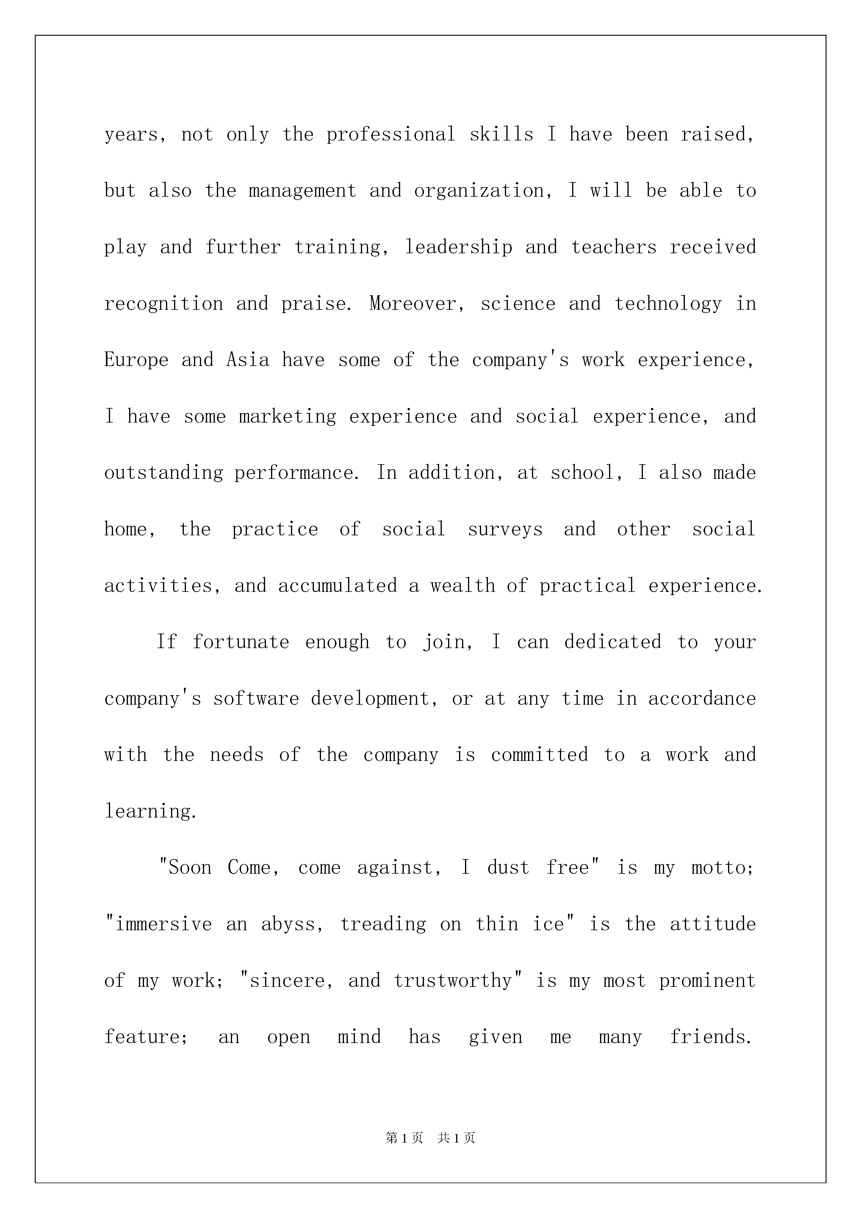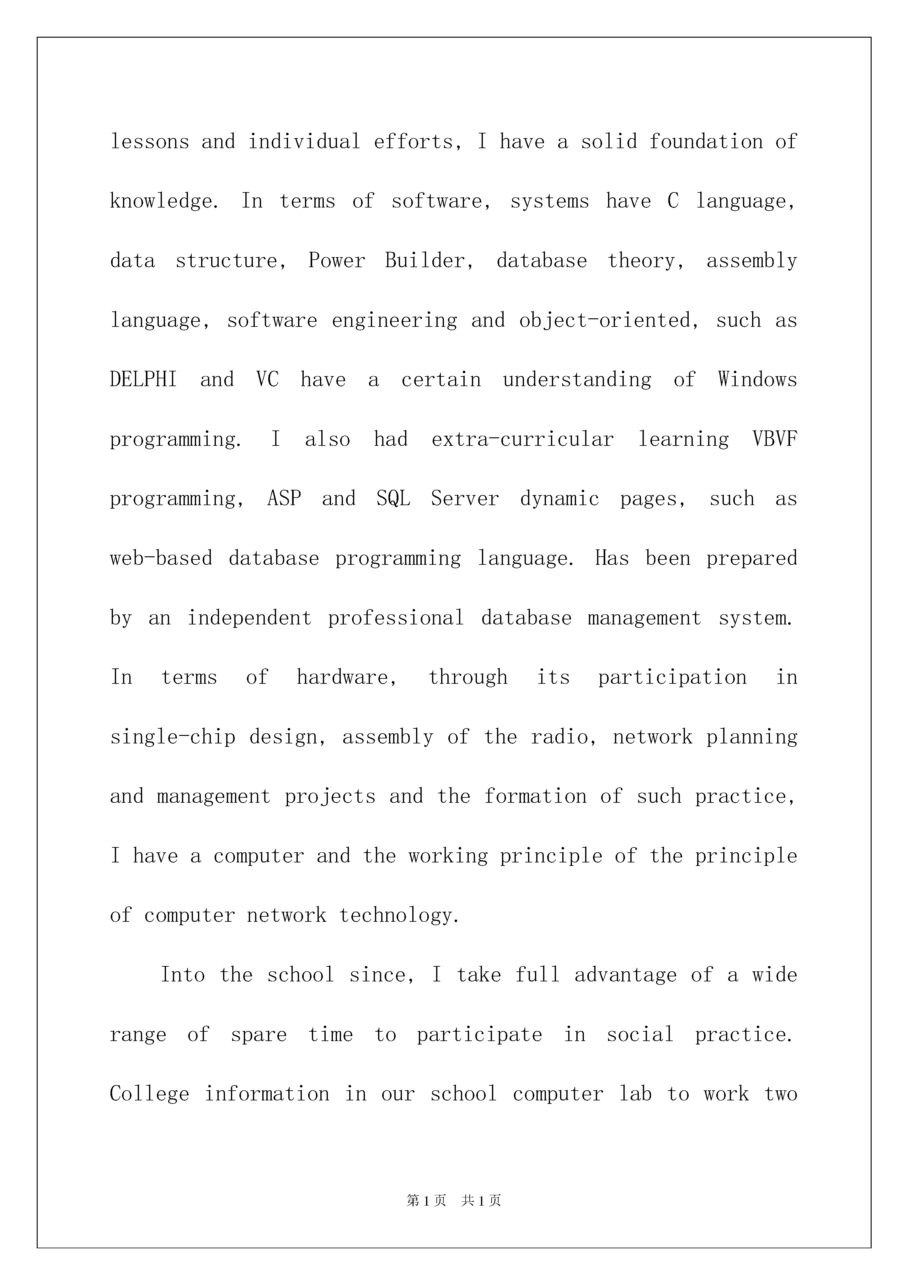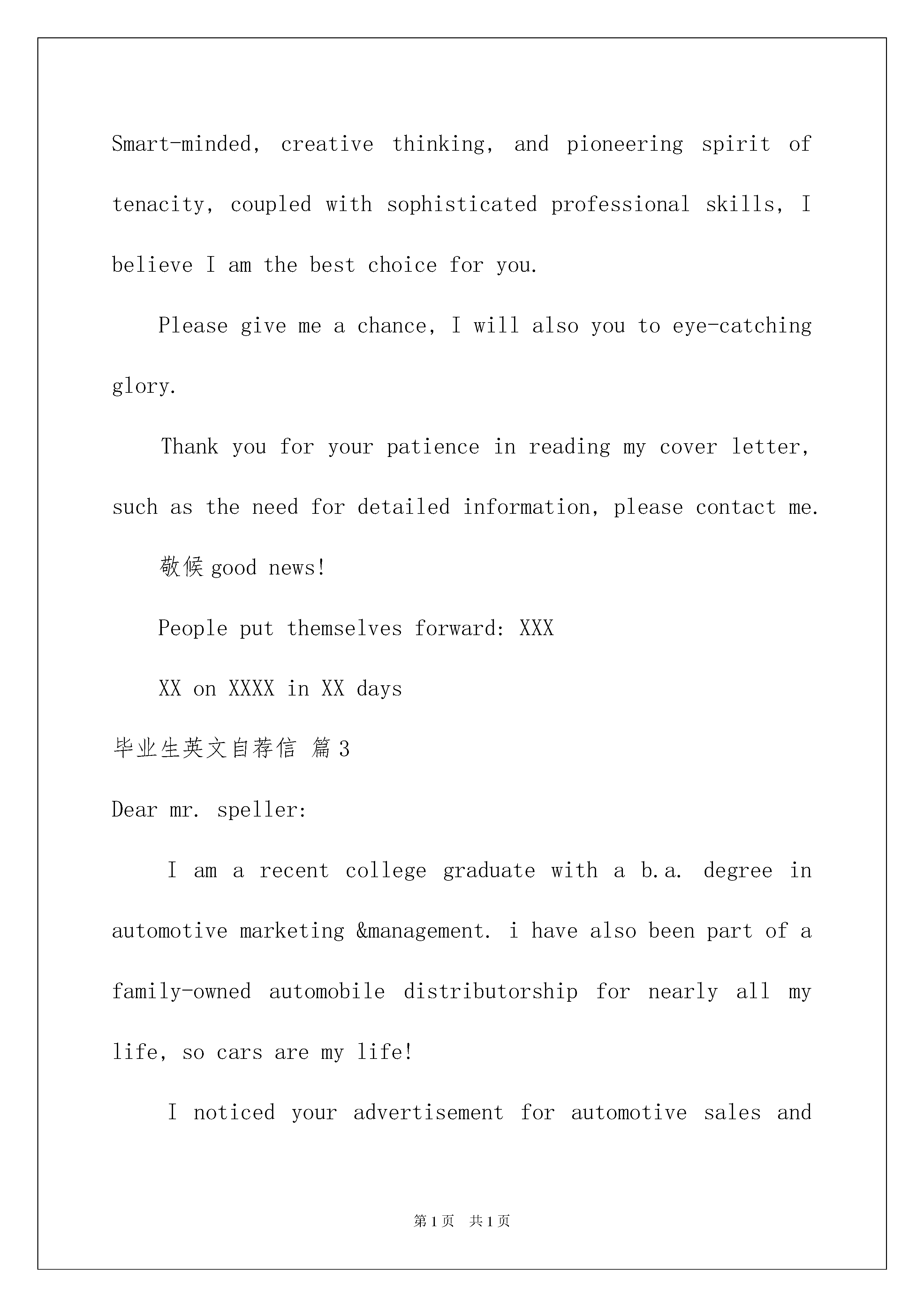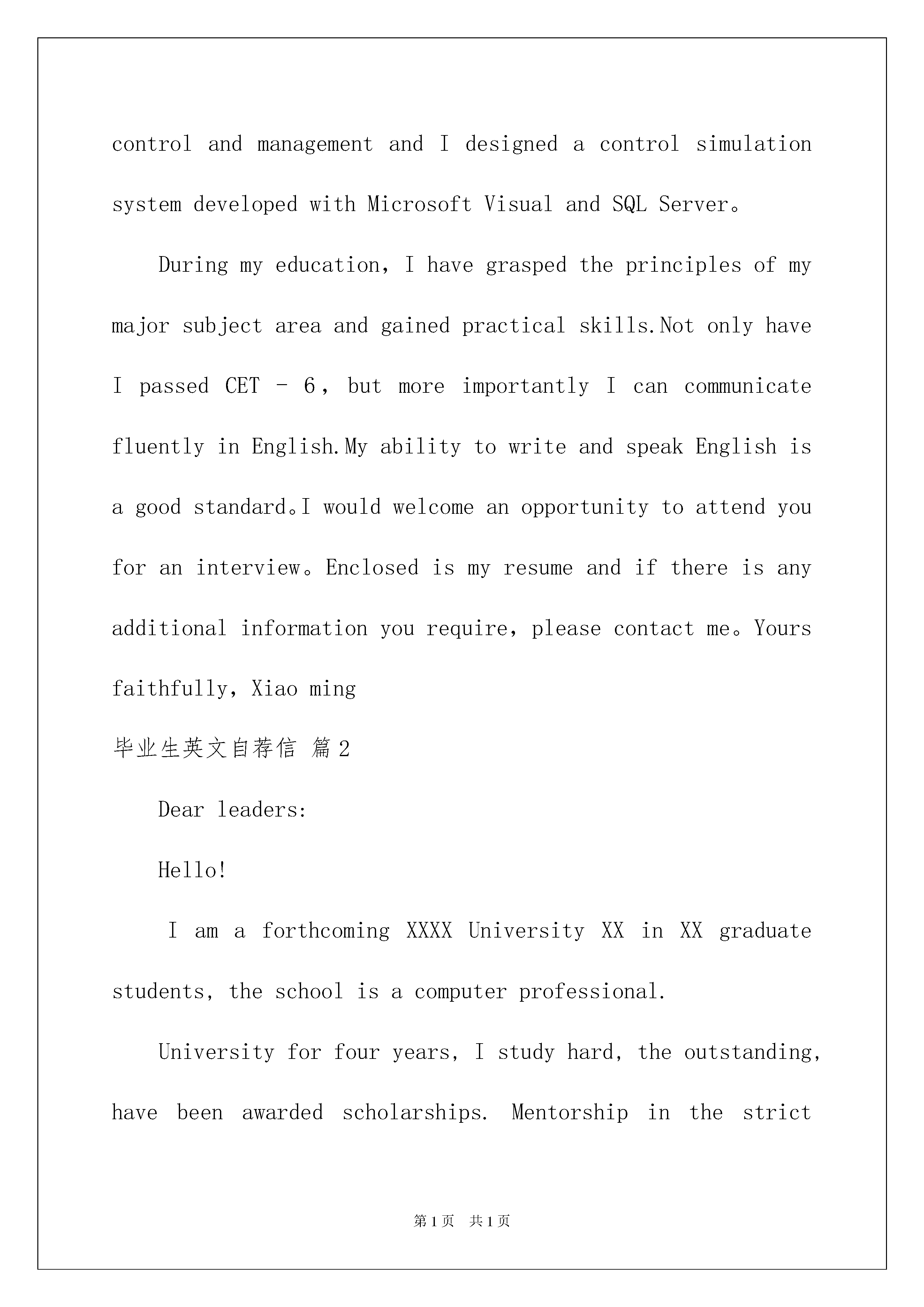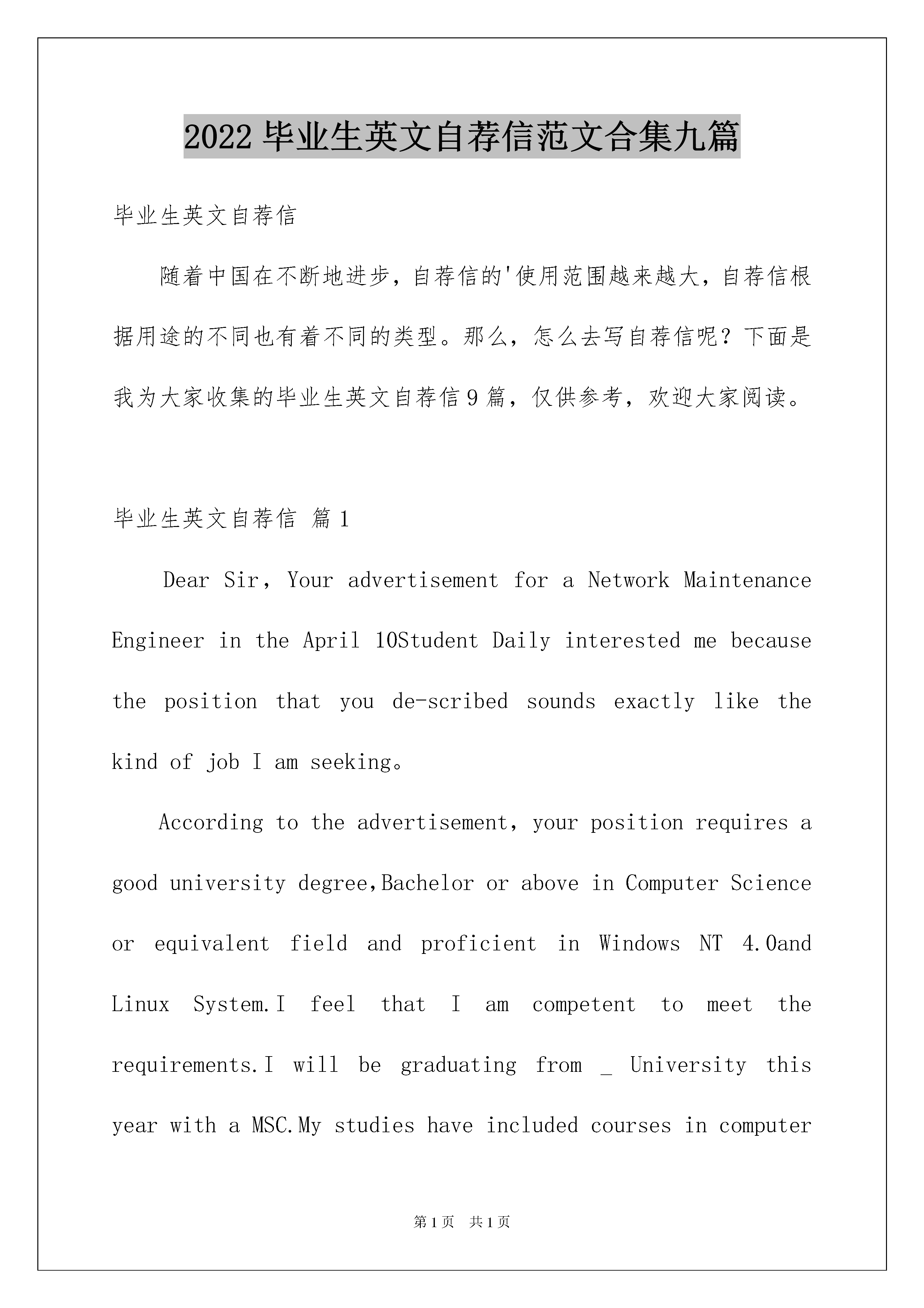 2022毕业生英文自荐信范文合集九篇毕业生英文自荐信随着中国在不断地进步,自荐信的'使用范围越来越大,自荐信根据用途的不同也有着不同的类型。那么,怎么去写自荐信呢?下面是我为大家收集的毕业生英文自荐信9篇,仅供参考,欢迎大家阅读。毕业生英文自荐信篇1DearSir,YouradvertisementforaNetworkMaintenanceEngineerintheApril10StudentDailyinterestedmebecausethepositionthatyoude-scribedsoundsexactlylikethekindofjobIamseeking。Accordingtotheadvertisement,yourpositionrequiresagooduniversitydegree,BachelororaboveinComputerScienceorequivalentfieldandproficientinWindowsNT4.0andLinuxSystem.IfeelthatIamcompetenttomeettherequirements.Iwillbegraduatingfrom_UniversitythisyearwithaMSC.MystudieshaveincludedcoursesincomputercontrolandmanagementandIdesignedacontrolsimulationsystemdevelopedwithMicrosoftVisualandSQLServer。Duringmyeducation,Ihavegraspedtheprinciplesofmymajorsubjectareaandgainedpracticalskills.NotonlyhaveIpassedCET-6,butmoreimportantlyIcancommunicatefluentlyinEnglish.MyabilitytowriteandspeakEnglishisagoodstandard。Iwouldwelcomeanopportunitytoattendyouforaninterview。Enclosedismyresumeandifthereisanyadditionalinformationyourequire,pleasecontactme。Yoursfaithfully,Xiaoming毕业生英文自荐信篇2Dearleaders:Hello!IamaforthcomingXXXXUniversityXXinXXgraduatestudents,theschoolisacomputerprofessional.Universityforfouryears,Istudyhard,theoutstanding,havebeenawardedscholarships.Mentorshipinthestrictlessonsandindividualefforts,Ihaveasolidfoundationofknowledge.Intermsofsoftware,systemshaveClanguage,datastructure,PowerBuilder,databasetheory,assemblylanguage,softwareengineeringandobject-oriented,suchasDELPHIandVChaveacertainunderstandingofWindowsprogramming.Ialsohadextra-curricularlearningVBVFprogramming,ASPandSQLServerdynamicpages,suchasweb-baseddatabaseprogramminglanguage.Hasbeenpreparedbyanindependentprofessionaldatabasemanagementsystem.Intermsofhardware,throughitsparticipationinsingle-chipdesign,assemblyoftheradio,networkplanningandmanagementprojectsandtheformationofsuchpractice,Ihaveacomputerandtheworkingprincipleoftheprincipleofcomputernetworktechn