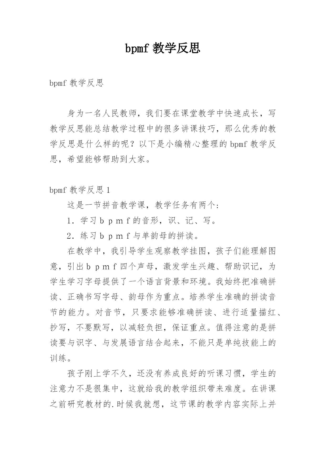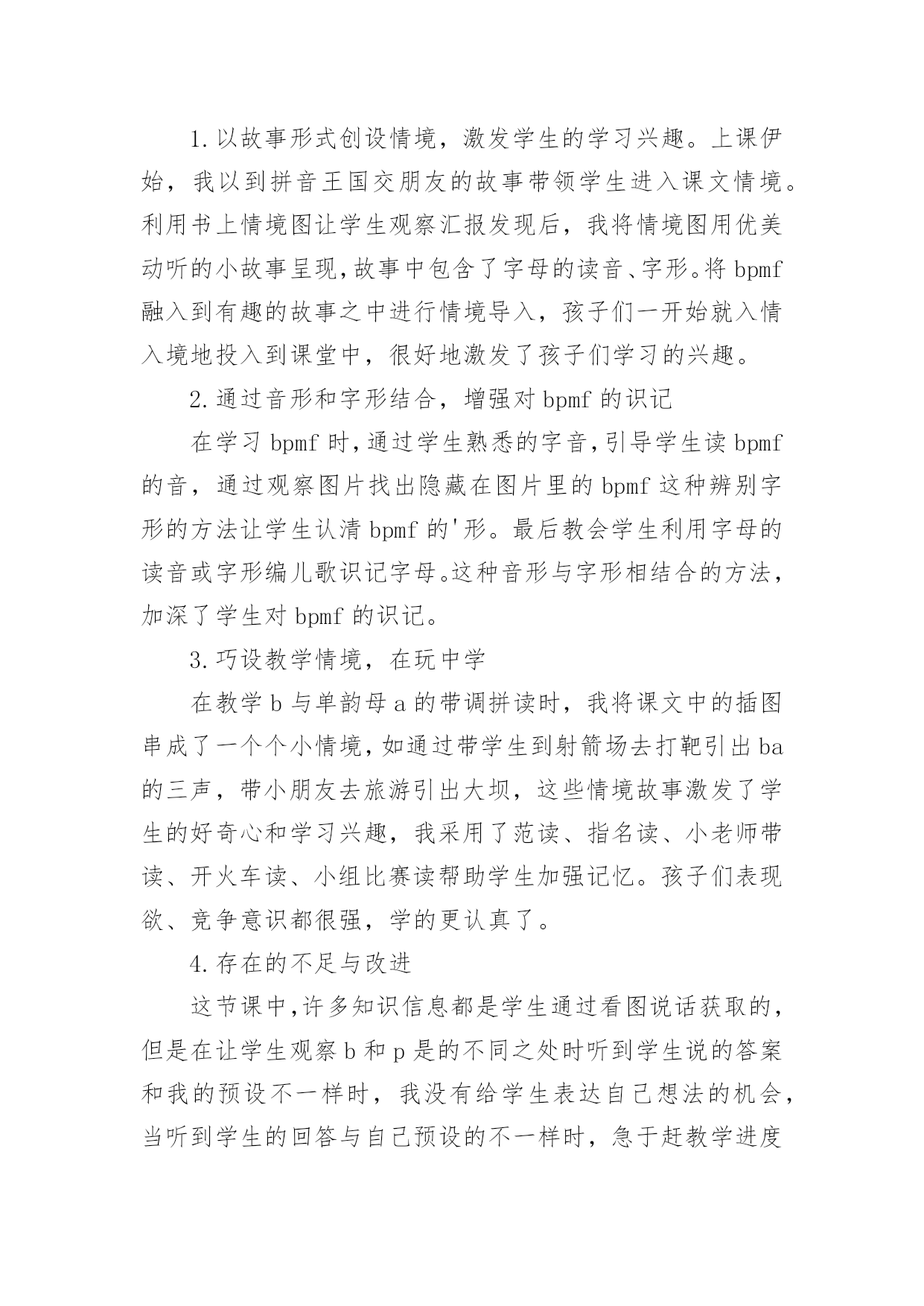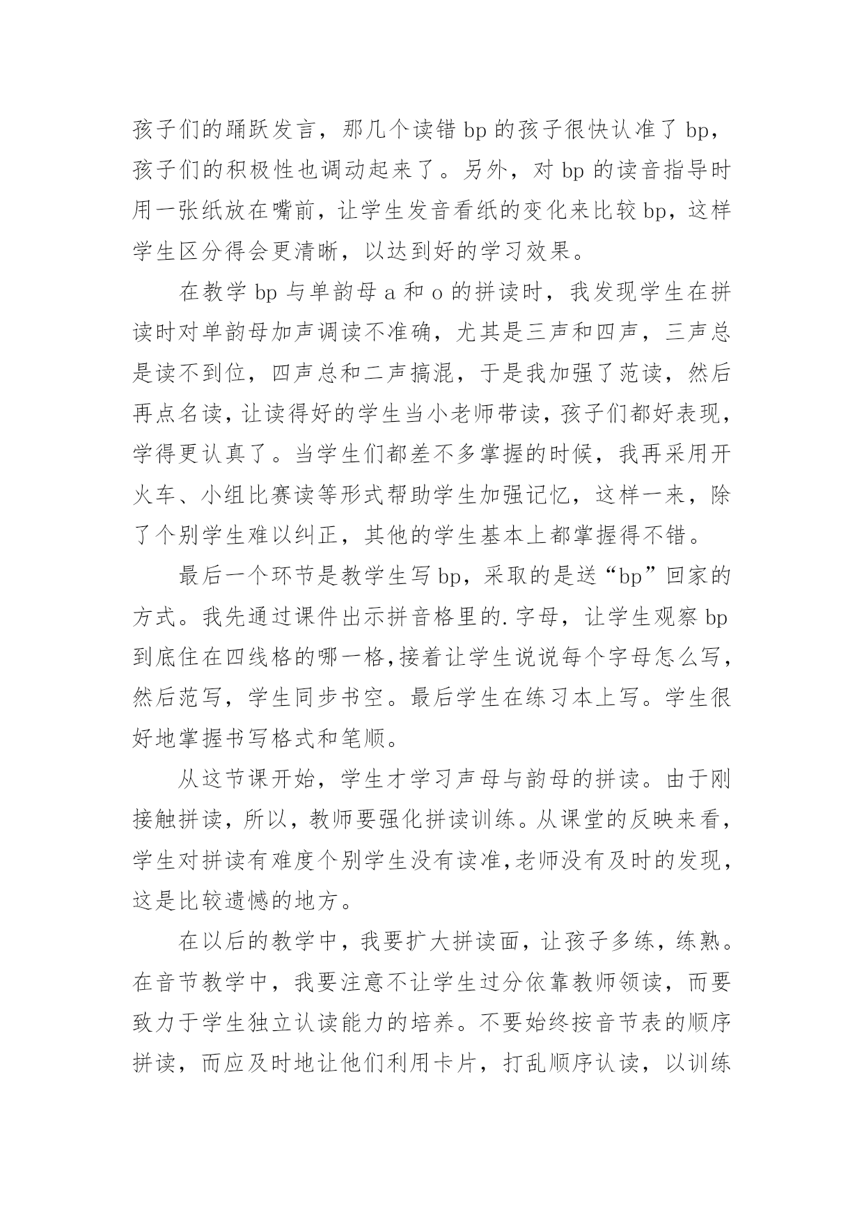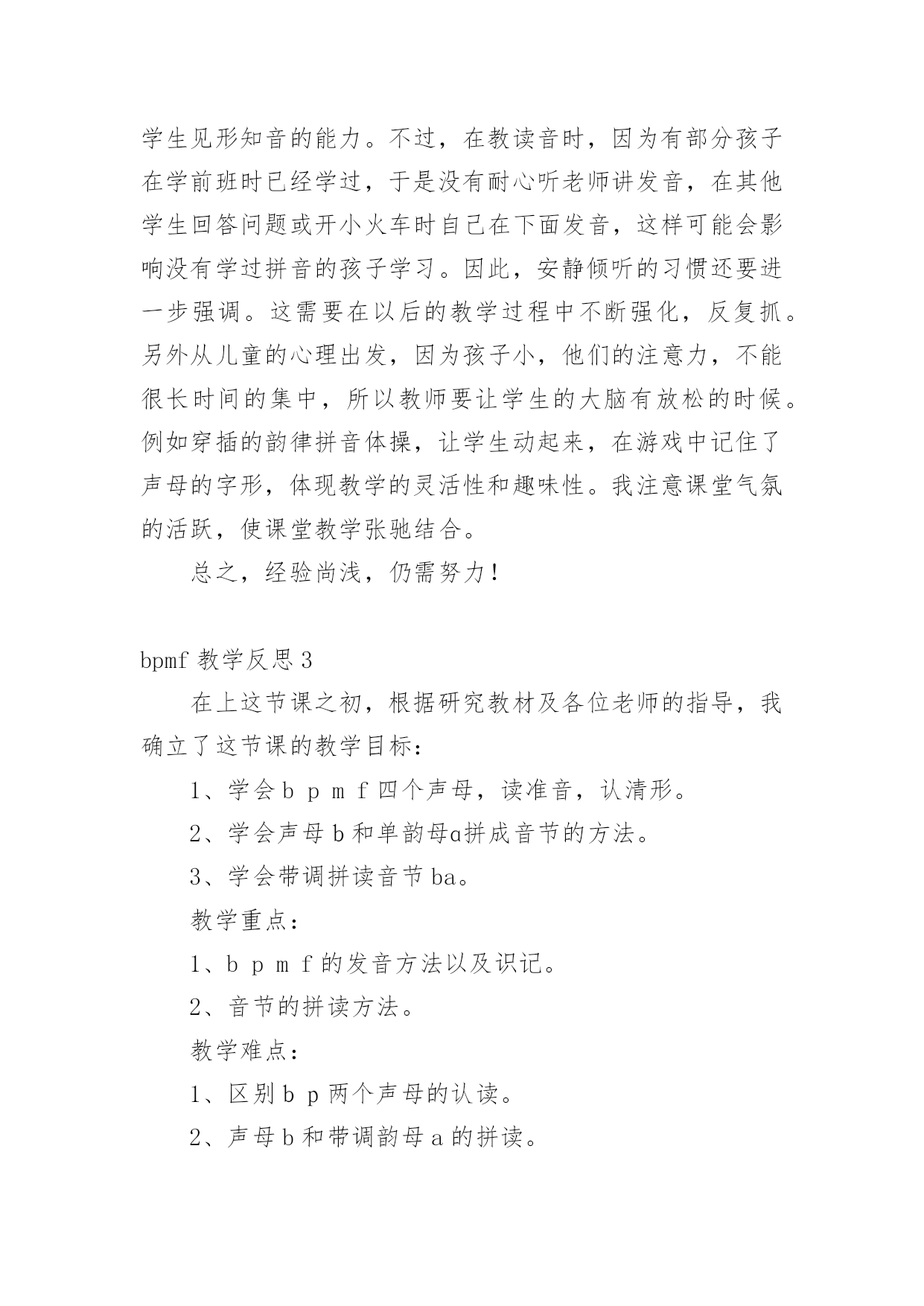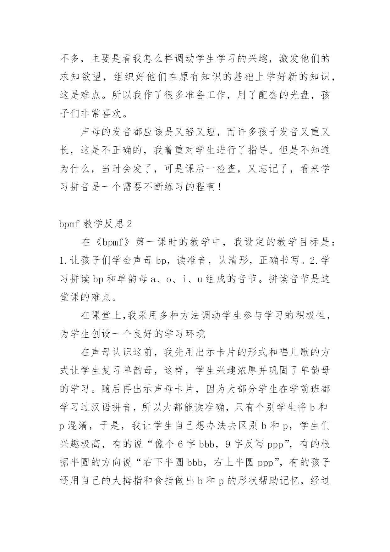 bpmf教学反思 bpmf教学反思身为一名人民教师,我们要在课堂教学中快速成长,写教学反思能总结教学过程中的很多讲课技巧,那么优秀的教学反思是什么样的呢?以下是小编精心整理的bpmf教学反思,希望能够帮助到大家。bpmf教学反思1这是一节拼音教学课,教学任务有两个:1.学习bpmf的音形,识、记、写。2.练习bpmf与单韵母的拼读。在教学中,我引导学生观察教学挂图,孩子们能理解图意,引出bpmf四个声母,激发学生兴趣、帮助识记,为学生学习字母提供了一个语言背景和环境。我始终把准确拼读、正确书写字母、韵母作为重点。培养学生准确的拼读音节的能力。对音节,只要求能够准确拼读、进行适量描红、抄写,不要默写,以减轻负担,保证重点。值得注意的是拼读要与识字、与发展语言结合起来,不能只是单纯技能上的训练。孩子刚上学不久,还没有养成良好的听课习惯,学生的注意力不是很集中,这就给我的教学组织带来难度。在讲课之前研究教材的.时候我就想,这节课的教学内容实际上并不多,主要是看我怎么样调动学生学习的兴趣,激发他们的求知欲望,组织好他们在原有知识的基础上学好新的知识,这是难点。所以我作了很多准备工作,用了配套的光盘,孩子们非常喜欢。声母的发音都应该是又轻又短,而许多孩子发音又重又长,这是不正确的,我着重对学生进行了指导。但是不知道为什么,当时会发了,可是课后一检查,又忘记了,看来学习拼音是一个需要不断练习的程啊!bpmf教学反思2在《bpmf》第一课时的教学中,我设定的教学目标是:1.让孩子们学会声母bp,读准音,认清形,正确书写。2.学习拼读bp和单韵母a、o、i、u组成的音节。拼读音节是这堂课的难点。在课堂上,我采用多种方法调动学生参与学习的积极性,为学生创设一个良好的学习环境在声母认识这前,我先用出示卡片的形式和唱儿歌的方式让学生复习单韵母,这样,学生兴趣浓厚并巩固了单韵母的学习。随后再出示声母卡片,因为大部分学生在学前班都学习过汉语拼音,所以大都能读准确,只有个别学生将b和p混淆,于是,我让学生自己想办法去区别b和p,学生们兴趣极高,有的说“像个6字bbb,9字反写ppp”,有的根据半圆的方向说“右下半圆bbb,右上半圆ppp”,有的孩子还用自己的大拇指和食指做出b和p的形状帮助记忆,经过孩子们的踊跃发言,那几个读错bp的孩子很快认准了bp,孩子们的积极性也调动起来了。另外,对bp的读音指导时用一张纸放在嘴前,让学生发音看纸的变化来比较bp,这样学生区分得会更清晰,以达到好的学习效果。在教学bp与单韵母a和o的拼读时,我发现学生在拼读时对单韵母加声调读不准确,尤其是三声和四声,三声总是读不到位,四声总和二声搞混,于是我加强了范读,然后再点名读,让读得好的学生当小老师带读,孩子们都好表现,学得更认真了。当学生们都差不多掌握的时候,我再采用开火车、小组比赛读等形式帮助学生加强记忆,这样一来,除了个别学生难以纠正,其他的学生基本上都掌握得不错。最后一个环节是教学生写bp,采取的是送“bp”回家的方式。我先通过课件出示拼音格里的.字母,让学生观察bp到底住在四线格的哪一格,接着让学生说说每个字母怎么写,然后范写,学生同步书空。最后学生在练习本上写。学生很好地掌握书写格式和笔顺。从这节课开始,学生才学习声母与韵母的拼读。由于刚接触拼读,所以,教师要强化拼读训练。从课堂的反映来看,学生对拼读有难度个别学生没有读准,老师没有及时的发现,这是比较遗憾的地方。在以后的教学中,我要扩大拼读面,让孩子多练,练熟。在音节教学中,我要注意不让学生过分依靠教师领读,而要致力于学生独立认读能力的培养。不要始终按音节表的顺序拼读,而应及时地让他们利用卡片,打乱顺序认读,以训练学生见形知音的能力。不过,在教读音时,因为有部分孩子在学前班时已经学过,于是没有耐心听老师讲发音,在其他学生回答问题或开小火车时自己在下面发音,这样可能会影响没有学过拼音的孩子学习。因此,安静倾听的习惯还要进一步强调。这需要在以后的教学过程中不断强化,反复抓。另外从儿童的心理出发,因为孩子小,他们的注意力,不能很长时间的集中,所以教师要让学生的大脑有放松的时候。例如穿插的韵律拼音体操,让学生动起来,在游戏中记住了声母的字形,体现教学的灵活性和趣味性。我注意课堂气氛的活跃,使课堂教学张驰结合。总之,经验尚浅,仍需努力!bpmf教学反思3在上这节课之初,根据研究教材及各位老师的指导,我确立了这节课的教学目标:1、学会bpmf四个声母,读准音,认清形。2、学会声母b和单韵母ɑ拼成音节的方法。3、学会带调拼读音节ba。教学重点:1、bpmf的发音方法以及识记。2、音节的拼读方法。教学难点:1、区别bp两个声母的认读。2、声母b和带调韵母a的拼读。1.以故事形式创设情境,激发学生的学习兴趣。上课伊始,我以到拼音王