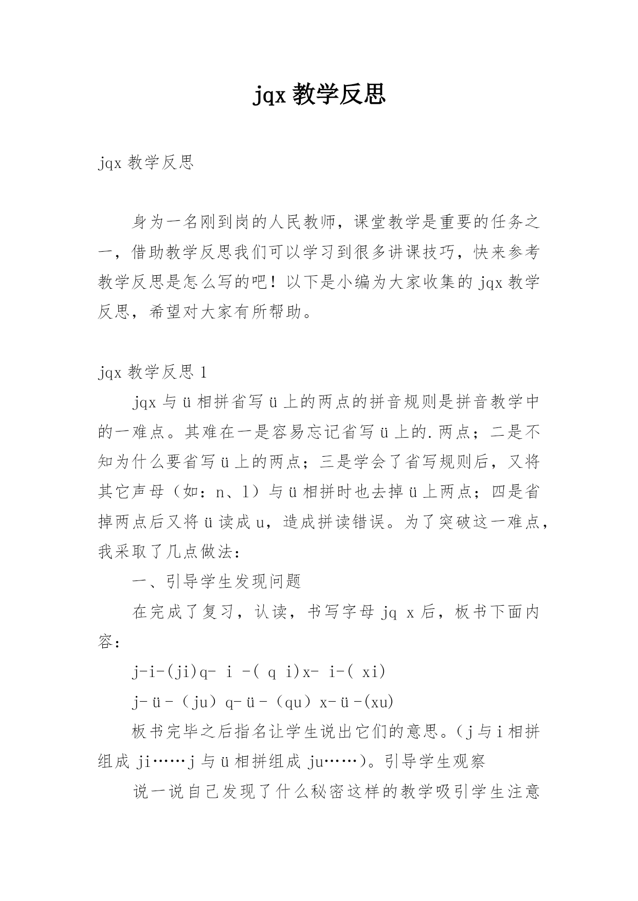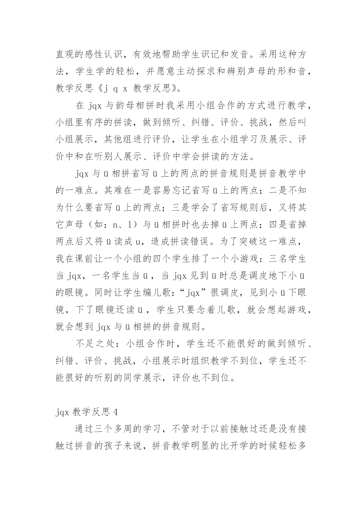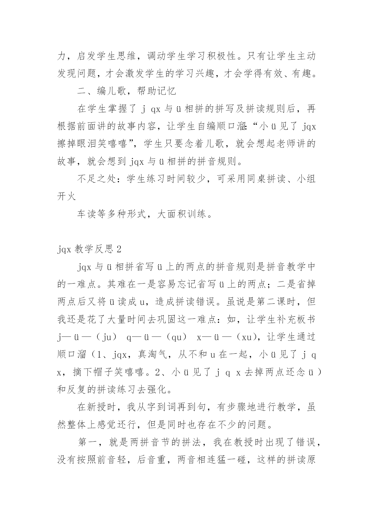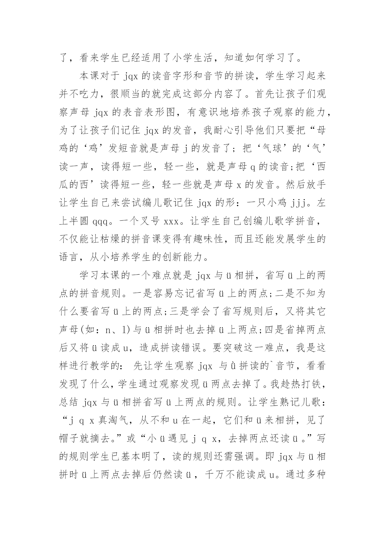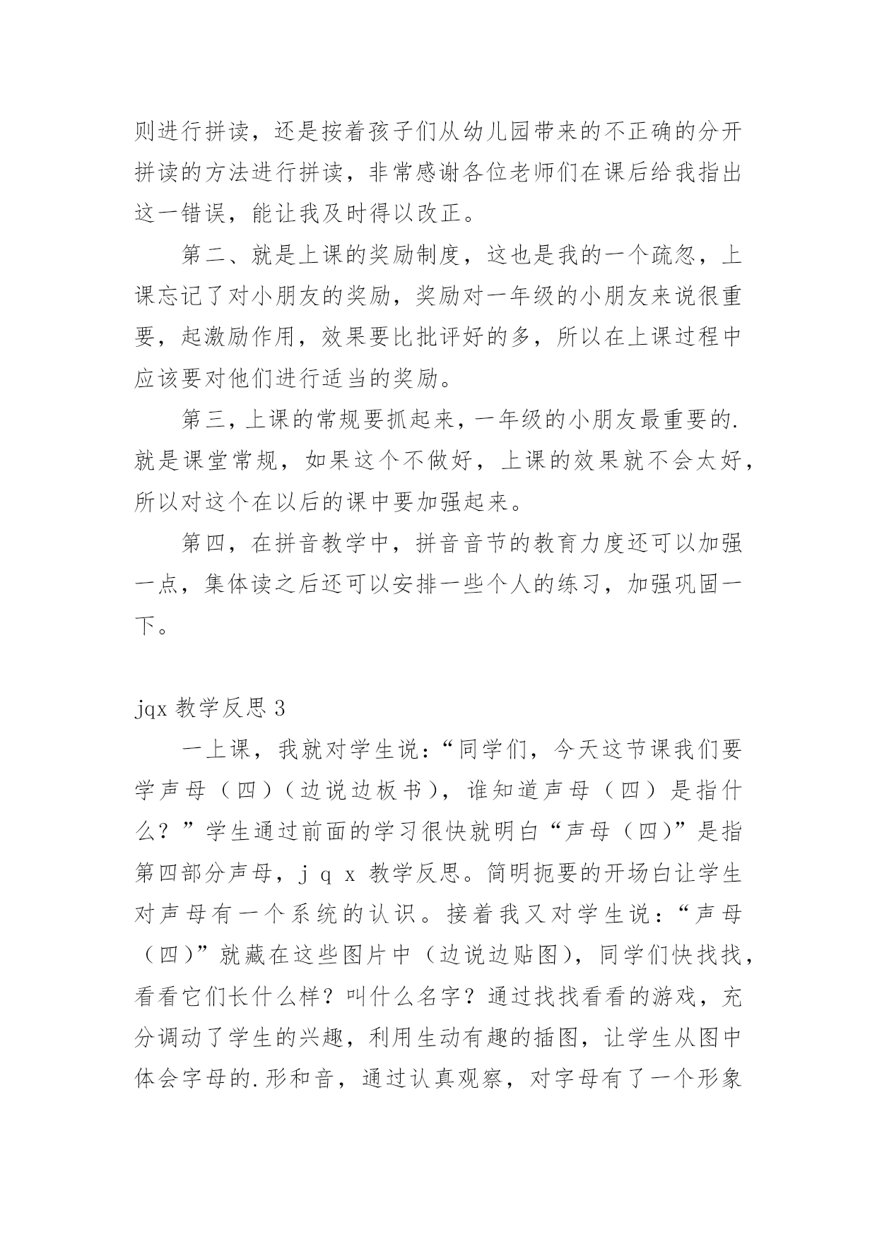 jqx教学反思 jqx教学反思身为一名刚到岗的人民教师,课堂教学是重要的任务之一,借助教学反思我们可以学习到很多讲课技巧,快来参考教学反思是怎么写的吧!以下是小编为大家收集的jqx教学反思,希望对大家有所帮助。jqx教学反思1jqx与ü相拼省写ü上的两点的拼音规则是拼音教学中的一难点。其难在一是容易忘记省写ü上的.两点;二是不知为什么要省写ü上的两点;三是学会了省写规则后,又将其它声母(如:n、l)与ü相拼时也去掉ü上两点;四是省掉两点后又将ü读成u,造成拼读错误。为了突破这一难点,我采取了几点做法:一、引导学生发现问题在完成了复习,认读,书写字母jqx后,板书下面内容:j-i-(ji)q-i-(qi)x-i-(xi)j-ü-(ju)q-ü-(qu)x-ü-(xu)板书完毕之后指名让学生说出它们的意思。(j与i相拼组成ji……j与ü相拼组成ju……)。引导学生观察说一说自己发现了什么秘密这样的教学吸引学生注意力,启发学生思维,调动学生学习积极性。只有让学生主动发现问题,才会激发学生的学习兴趣,才会学得有效、有趣。二、编儿歌,帮助记忆在学生掌握了jqx与ü相拼的拼写及拼读规则后,再根据前面讲的故事内容,让学生自编顺口溜:“小ü见了jqx擦掉眼泪笑嘻嘻”,学生只要念着儿歌,就会想起老师讲的故事,就会想到jqx与ü相拼的拼音规则。不足之处:学生练习时间较少,可采用同桌拼读、小组开火车读等多种形式,大面积训练。jqx教学反思2jqx与ü相拼省写ü上的两点的拼音规则是拼音教学中的一难点。其难在一是容易忘记省写ü上的两点;二是省掉两点后又将ü读成u,造成拼读错误。虽说是第二课时,但我还是花了大量时间去巩固这一难点:如,让学生补充板书j—ü—(ju)q—ü—(qu)x—ü—(xu),让学生通过顺口溜(1、jqx,真淘气,从不和u在一起,小ü见了jqx,摘下帽子笑嘻嘻。2、小ü见了jqx去掉两点还念ü)和反复的拼读练习去强化。在新授时,我从字到词再到句,有步骤地进行教学,虽然整体上感觉还行,但是同时也存在不少的问题。第一,就是两拼音节的拼法,我在教授时出现了错误,没有按照前音轻,后音重,两音相连猛一碰,这样的拼读原则进行拼读,还是按着孩子们从幼儿园带来的不正确的分开拼读的方法进行拼读,非常感谢各位老师们在课后给我指出这一错误,能让我及时得以改正。第二、就是上课的奖励制度,这也是我的一个疏忽,上课忘记了对小朋友的奖励,奖励对一年级的小朋友来说很重要,起激励作用,效果要比批评好的多,所以在上课过程中应该要对他们进行适当的奖励。第三,上课的常规要抓起来,一年级的小朋友最重要的.就是课堂常规,如果这个不做好,上课的效果就不会太好,所以对这个在以后的课中要加强起来。第四,在拼音教学中,拼音音节的教育力度还可以加强一点,集体读之后还可以安排一些个人的练习,加强巩固一下。jqx教学反思3一上课,我就对学生说:“同学们,今天这节课我们要学声母(四)(边说边板书),谁知道声母(四)是指什么?”学生通过前面的学习很快就明白“声母(四)”是指第四部分声母,jqx教学反思。简明扼要的开场白让学生对声母有一个系统的认识。接着我又对学生说:“声母(四)”就藏在这些图片中(边说边贴图),同学们快找找,看看它们长什么样?叫什么名字?通过找找看看的游戏,充分调动了学生的兴趣,利用生动有趣的插图,让学生从图中体会字母的.形和音,通过认真观察,对字母有了一个形象直观的感性认识,有效地帮助学生识记和发音。采用这种方法,学生学的轻松,并愿意主动探求和辨别声母的形和音,教学反思《jqx教学反思》。在jqx与韵母相拼时我采用小组合作的方式进行教学,小组里有序的拼读,做到倾听、纠错、评价、挑战,然后叫小组展示,其他组进行评价,让学生在小组学习及展示、评价中和在听别人展示、评价中学会拼读的方法。jqx与ü相拼省写ü上的两点的拼音规则是拼音教学中的一难点。其难在一是容易忘记省写ü上的两点;二是不知为什么要省写ü上的两点;三是学会了省写规则后,又将其它声母(如:n、l)与ü相拼时也去掉ü上两点;四是省掉两点后又将ü读成u,造成拼读错误。为了突破这一难点,我在课前让一个小组的四个学生排了一个小游戏:三名学生当jqx,一名学生当ü,当jqx见到ü时总是调皮地下小ü的眼镜。同时让学生编儿歌:“jqx”很调皮,见到小ü下眼镜,下了眼镜还读ü,学生只要念着儿歌,就会想起游戏,就会想到jqx与ü相拼的拼音规则。不足之处:小组合作时,学生还不能很好的做到倾听、纠错、评价、挑战,小组展示时组织教学不到位,学生还不能很好的听别的同学展示,评价也不到位。jqx教学反思4通过三个多周的学习,不管对于以前接触过还是没有接触过拼音的孩子来说,拼音教学明显的比开学的时候轻松多了,看来学生已经适用了小学生活,知道如何学习了