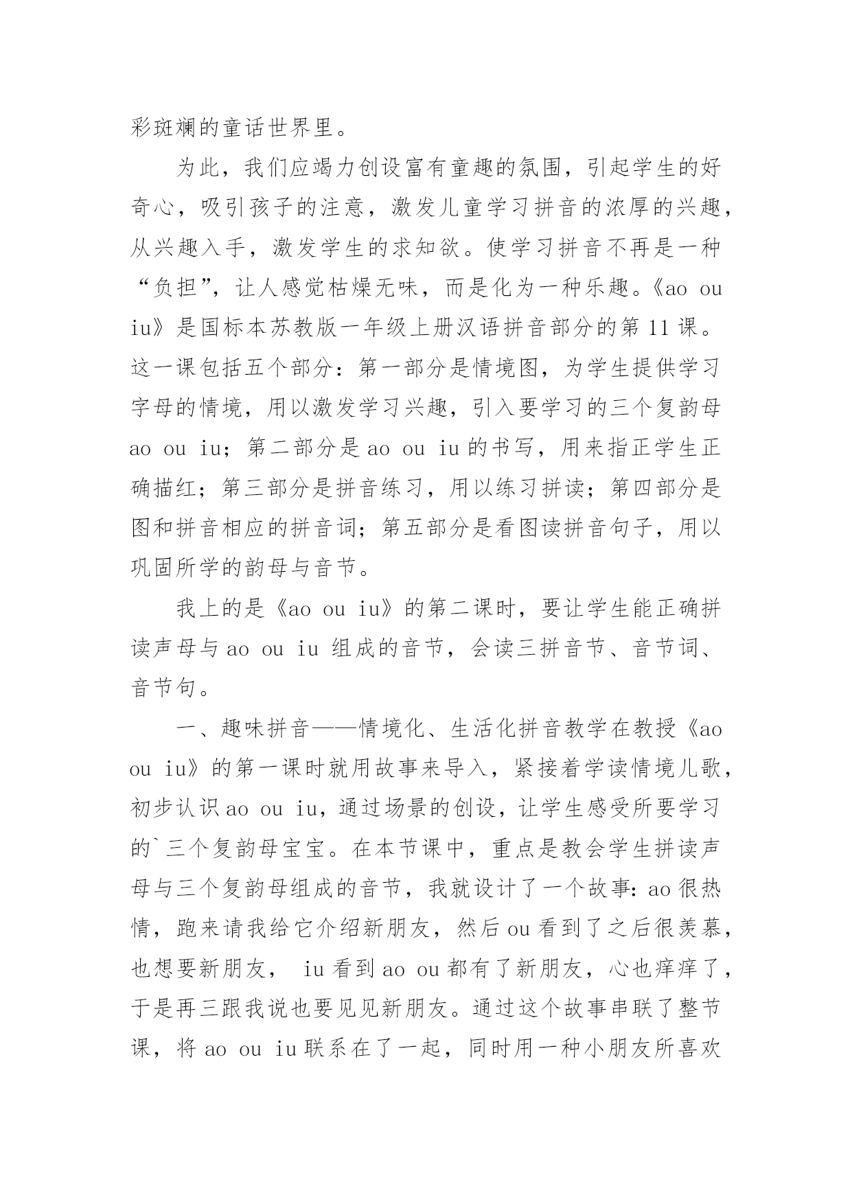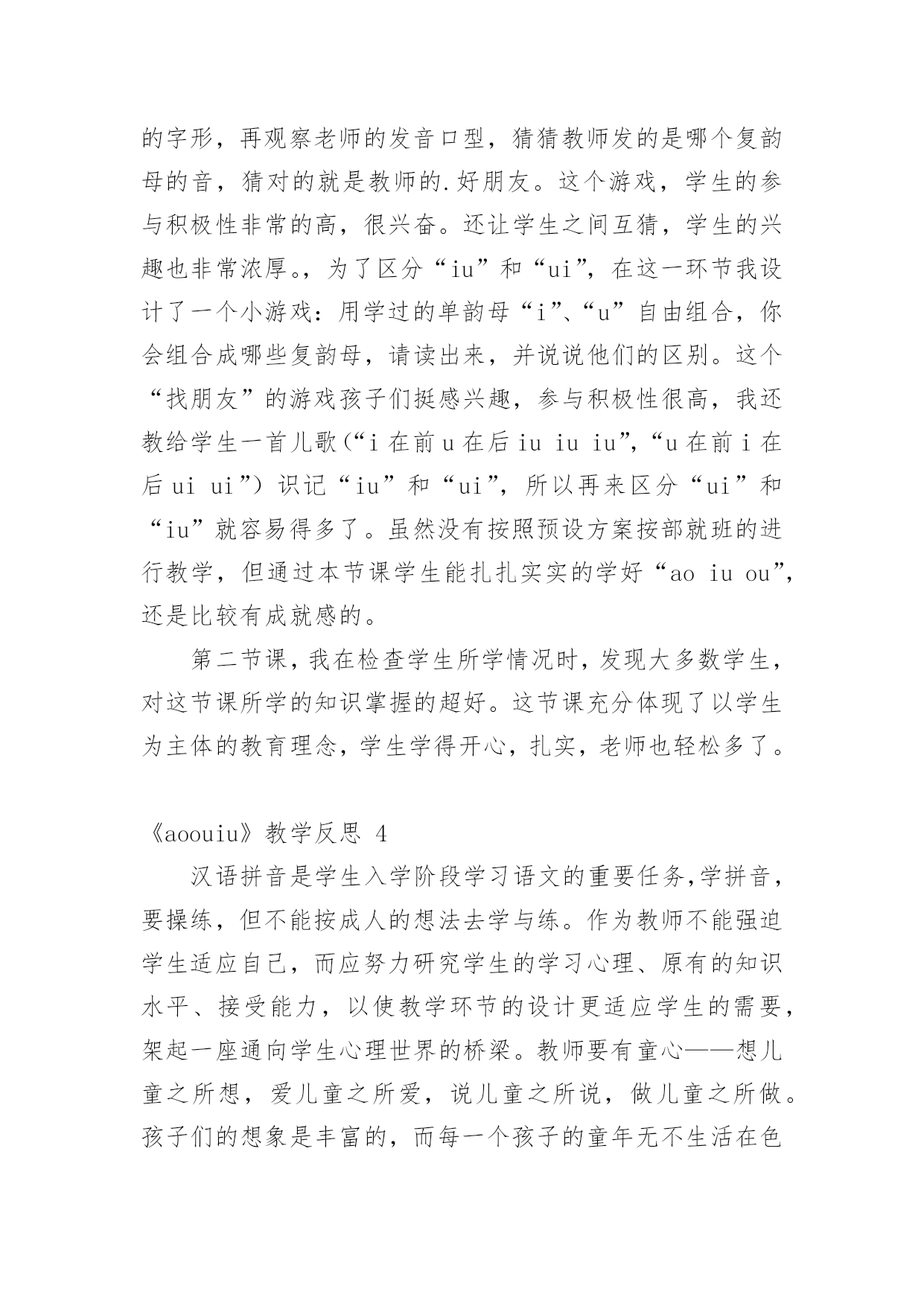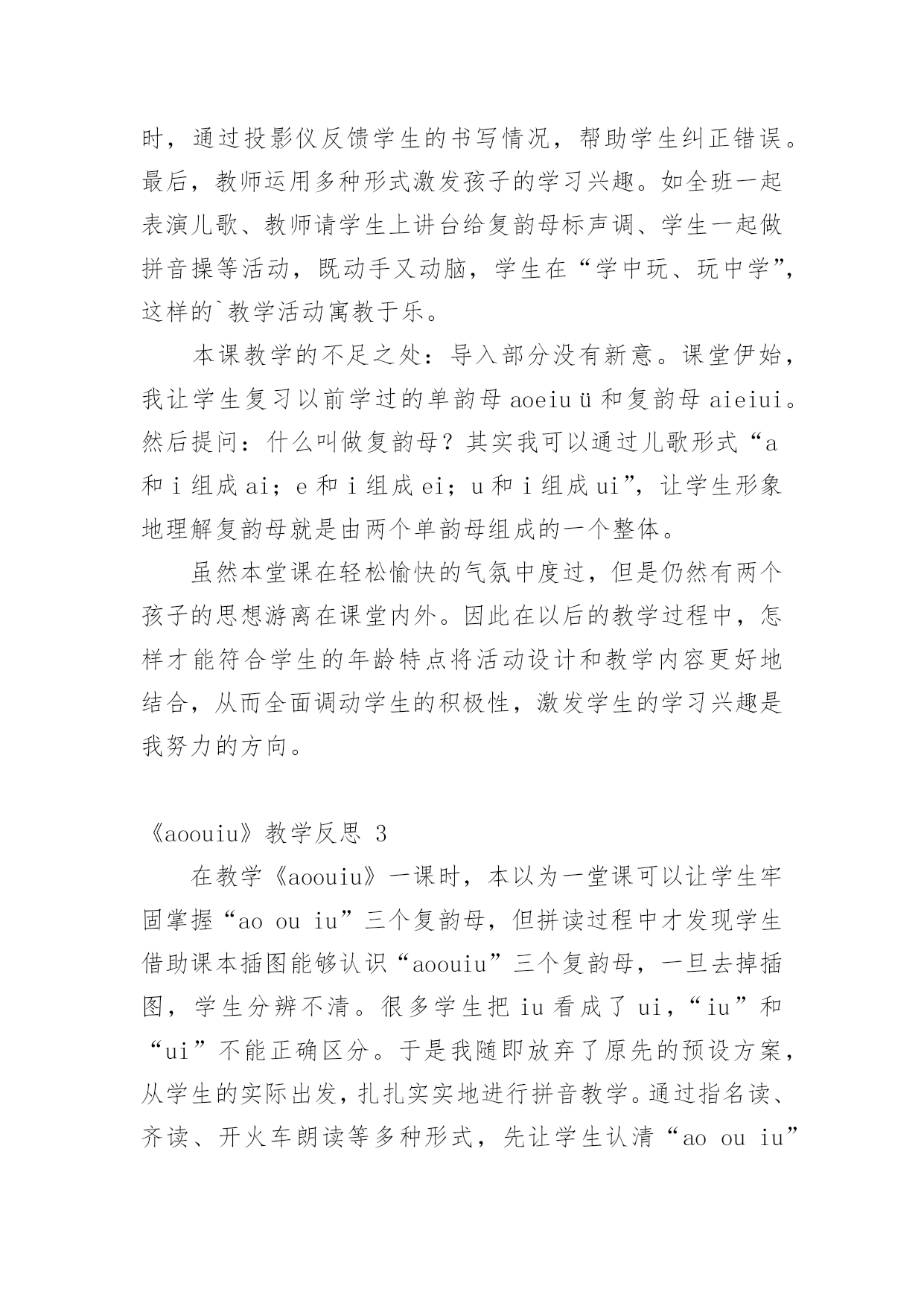 《aoouiu》教学反思 《aoouiu》教学反思身为一名人民老师,课堂教学是重要的工作之一,对教学中的新发现可以写在教学反思中,那么问题来了,教学反思应该怎么写?以下是小编收集整理的《aoouiu》教学反思,欢迎大家借鉴与参考,希望对大家有所帮助。《aoouiu》教学反思1在教学“aoouiu”这一课时,我充分利用了情境图、生活背景、游戏,让学生体会到学习拼音的乐趣。在观察情境图时,让学生说完整的话,把拼音和发展语言紧密结合起来。在标声调时,有了前一课的基础,今天就让学生作主,“你认为帽子应该给谁戴?”学生通过复习标调歌,知道了正确标调方法。由于学生已有的学习经验,声调的读法相对于大多数学生来说,已不是难题,因此,按顺序读就一带而过,主要让学生打乱顺序读,在这儿,我用上激励的语言,“谁来挑战一下?”学生好胜心被调动起来,都抢着读。而在巩固的过程中,让学生玩捉迷藏的游戏,让他们喊出红花上出现的带调韵母的名字,学生也很活跃,小手直举,这一环节既巩固了韵母的四声,又调动了学生的兴趣,可谓一举两得。新课标上强调在游戏中学习拼音,也就是游戏是学习拼音的最佳方法,此话一点都不假。生活是拼音学习的`源头。在“抢苹果”环节中,把学生生活中常见的动物用音标出来,让学生自己拼读,我用语言调动他们的积极性,“小动物们也来到了我们的课堂,想知道它们是谁吗?”学生的好奇心被调动了,我随机出示了“māogǒuniú”等音节,学生纷纷举手,小老师带大家读一遍之后,就把“红苹果”送给他。分辨混淆是拼音学习的难点。在这一课中,iu和之前学的ui很相似,因此就让学生自己想办法记住它们,并加以区别。学生们思考之后开始向自己的小伙伴介绍自己区别这两个韵母的好方法,可以说把课堂真正还给了学生们。能把自己的发现告诉大家,别提有多激动、多高兴了。通过这一环节,不仅培养了学生们的自信心,而且还激发了他们学习的主动性,更好地提高了学生们学习的效果。《aoouiu》教学反思2本课教学的成功之处在于:首先,本课的教学目标基本达到,学生学得比较扎实:学生能够准确认读、正确书写复韵母aoouiu;教师通过复习标调规则:“有a就找a,没a找oe,iu并列标在后”,引导学生给复韵母标声调。联系以前学过的内容,学生能够准确辨别复韵母iu和ui,再请学生标声调,达到巩固“iu并列标在后”这一标调规则的'效果。其次,教师注重培养学生养成良好的书写习惯。学生在书写《习字册》时,教师及时提醒注意“三个一”,在巡视指导时,通过投影仪反馈学生的书写情况,帮助学生纠正错误。最后,教师运用多种形式激发孩子的学习兴趣。如全班一起表演儿歌、教师请学生上讲台给复韵母标声调、学生一起做拼音操等活动,既动手又动脑,学生在“学中玩、玩中学”,这样的`教学活动寓教于乐。本课教学的不足之处:导入部分没有新意。课堂伊始,我让学生复习以前学过的单韵母aoeiuü和复韵母aieiui。然后提问:什么叫做复韵母?其实我可以通过儿歌形式“a和i组成ai;e和i组成ei;u和i组成ui”,让学生形象地理解复韵母就是由两个单韵母组成的一个整体。虽然本堂课在轻松愉快的气氛中度过,但是仍然有两个孩子的思想游离在课堂内外。因此在以后的教学过程中,怎样才能符合学生的年龄特点将活动设计和教学内容更好地结合,从而全面调动学生的积极性,激发学生的学习兴趣是我努力的方向。《aoouiu》教学反思3在教学《aoouiu》一课时,本以为一堂课可以让学生牢固掌握“aoouiu”三个复韵母,但拼读过程中才发现学生借助课本插图能够认识“aoouiu”三个复韵母,一旦去掉插图,学生分辨不清。很多学生把iu看成了ui,“iu”和“ui”不能正确区分。于是我随即放弃了原先的预设方案,从学生的实际出发,扎扎实实地进行拼音教学。通过指名读、齐读、开火车朗读等多种形式,先让学生认清“aoouiu”的字形,再观察老师的发音口型,猜猜教师发的是哪个复韵母的音,猜对的就是教师的.好朋友。这个游戏,学生的参与积极性非常的高,很兴奋。还让学生之间互猜,学生的兴趣也非常浓厚。,为了区分“iu”和“ui”,在这一环节我设计了一个小游戏:用学过的单韵母“i”、“u”自由组合,你会组合成哪些复韵母,请读出来,并说说他们的区别。这个“找朋友”的游戏孩子们挺感兴趣,参与积极性很高,我还教给学生一首儿歌(“i在前u在后iuiuiu”,“u在前i在后uiui”)识记“iu”和“ui”,所以再来区分“ui”和“iu”就容易得多了。虽然没有按照预设方案按部就班的进行教学,但通过本节课学生能扎扎实实的学好“aoiuou”,还是比较有成就感的。第二节课,我在检查学生所学情况时,发现大多数学生,对这节课所学的知识掌握的超好。这节课充分体现了以学生为主体的教育理念,学生学得开心,扎实,老师也轻松多了。《a