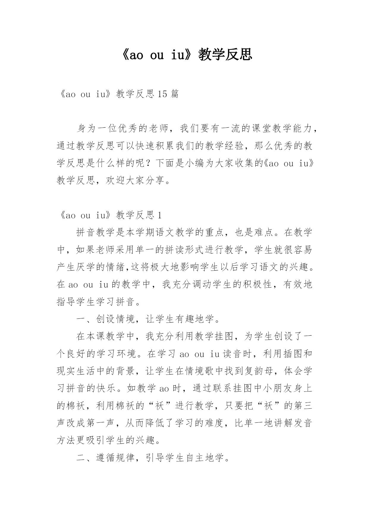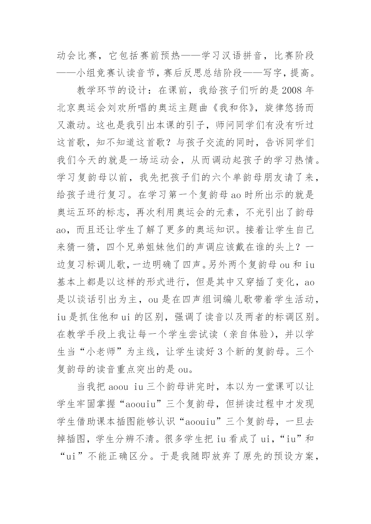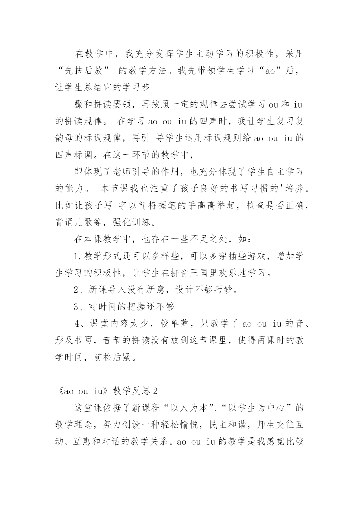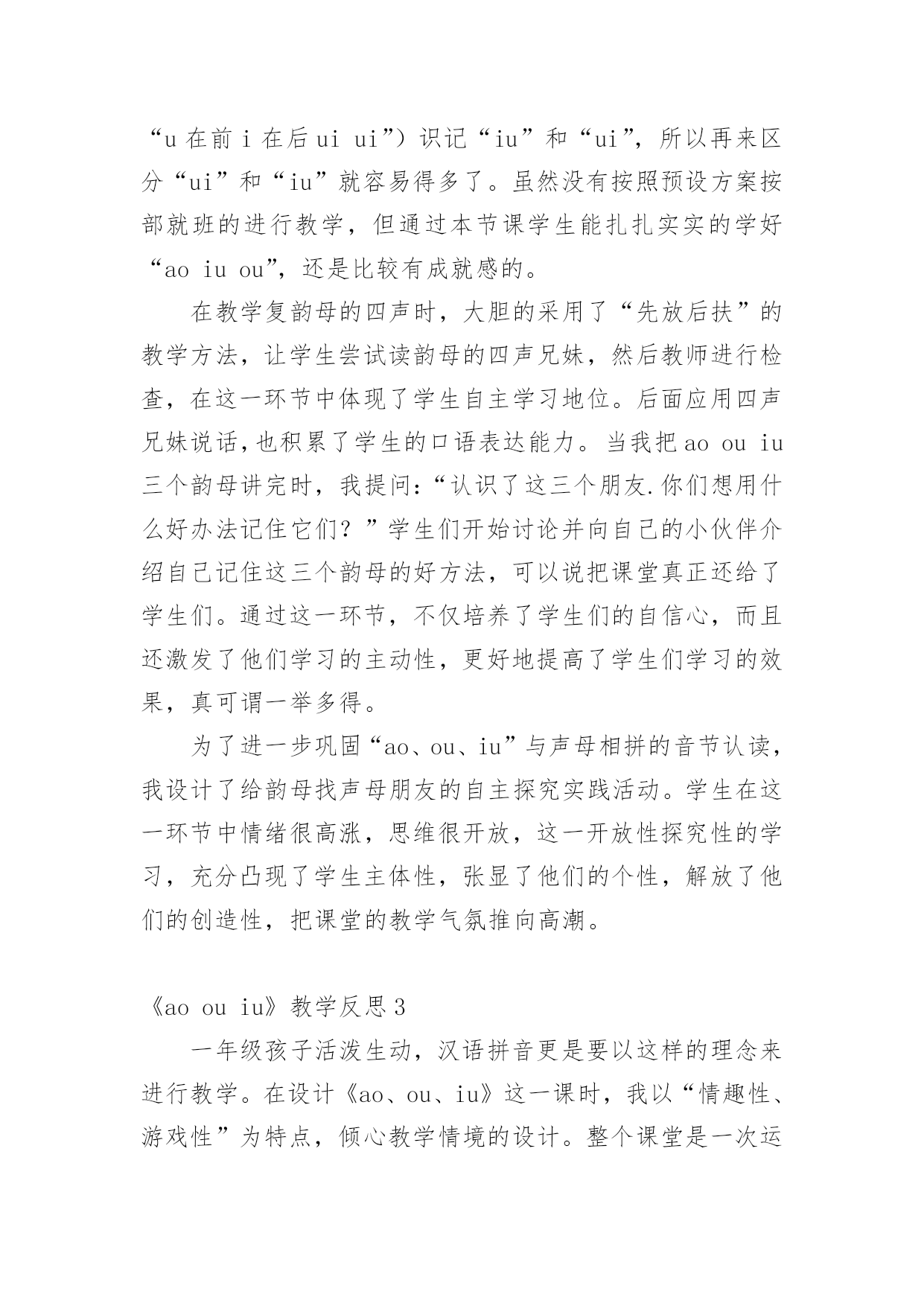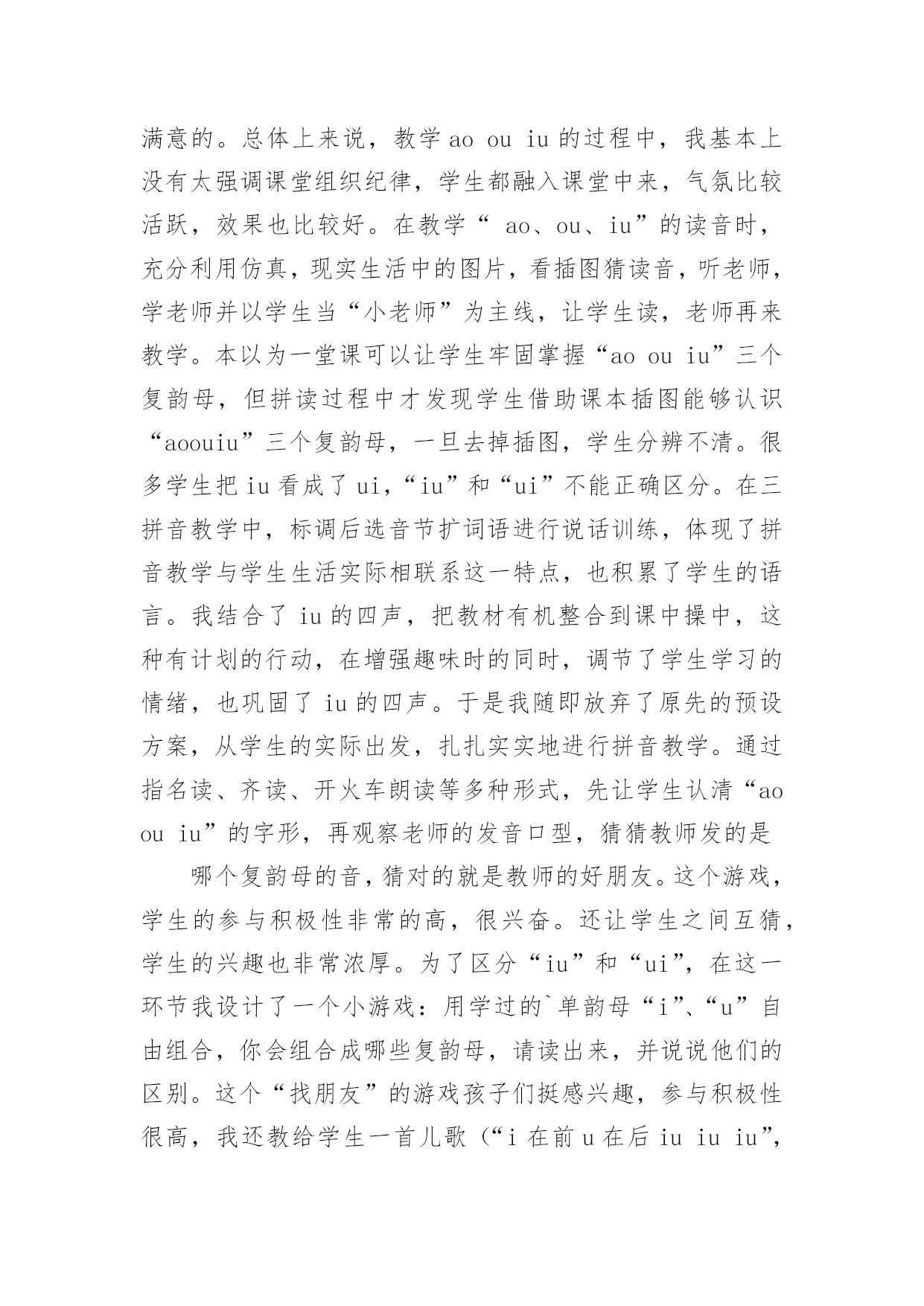 《aoouiu》教学反思 《aoouiu》教学反思15篇身为一位优秀的老师,我们要有一流的课堂教学能力,通过教学反思可以快速积累我们的教学经验,那么优秀的教学反思是什么样的呢?下面是小编为大家收集的《aoouiu》教学反思,欢迎大家分享。《aoouiu》教学反思1拼音教学是本学期语文教学的重点,也是难点。在教学中,如果老师采用单一的拼读形式进行教学,学生就很容易产生厌学的情绪,这将极大地影响学生以后学习语文的兴趣。在aoouiu的教学中,我充分调动学生的积极性,有效地指导学生学习拼音。一、创设情境,让学生有趣地学。在本课教学中,我充分利用教学挂图,为学生创设了一个良好的学习环境。在学习aoouiu读音时,利用插图和现实生活中的背景,让学生在情境歌中找到复韵母,体会学习拼音的快乐。如教学ao时,通过联系挂图中小朋友身上的棉袄,利用棉袄的“袄”进行教学,只要把“袄”的第三声改成第一声,从而降低了学习的难度,比单一地讲解发音方法更吸引学生的兴趣。二、遵循规律,引导学生自主地学。在教学中,我充分发挥学生主动学习的积极性,采用“先扶后放”的教学方法。我先带领学生学习“ao”后,让学生总结它的学习步骤和拼读要领,再按照一定的规律去尝试学习ou和iu的拼读规律。在学习aoouiu的四声时,我让学生复习复韵母的标调规律,再引导学生运用标调规则给aoouiu的四声标调。在这一环节的教学中,即体现了老师引导的作用,也充分体现了学生自主学习的能力。本节课我也注重了孩子良好的书写习惯的'培养。比如让孩子写字以前将握笔的手高高举起,检查是否正确,背诵儿歌等,强化训练。在本课教学中,也存在一些不足之处,如:1.教学形式还可以多样些,可以多穿插些游戏,增加学生学习的积极性,让学生在拼音王国里欢乐地学习。2、新课导入没有新意,设计不够巧妙。3、对时间的把握还不够4、课堂内容太少,较单薄,只教学了aoouiu的音、形及书写,音节的拼读没有放到这节课里,使得两课时的教学时间,前松后紧。《aoouiu》教学反思2这堂课依据了新课程“以人为本”、“以学生为中心”的教学理念,努力创设一种轻松愉悦,民主和谐,师生交往互动、互惠和对话的教学关系。aoouiu的教学是我感觉比较满意的。总体上来说,教学aoouiu的过程中,我基本上没有太强调课堂组织纪律,学生都融入课堂中来,气氛比较活跃,效果也比较好。在教学“ao、ou、iu”的读音时,充分利用仿真,现实生活中的图片,看插图猜读音,听老师,学老师并以学生当“小老师”为主线,让学生读,老师再来教学。本以为一堂课可以让学生牢固掌握“aoouiu”三个复韵母,但拼读过程中才发现学生借助课本插图能够认识“aoouiu”三个复韵母,一旦去掉插图,学生分辨不清。很多学生把iu看成了ui,“iu”和“ui”不能正确区分。在三拼音教学中,标调后选音节扩词语进行说话训练,体现了拼音教学与学生生活实际相联系这一特点,也积累了学生的语言。我结合了iu的四声,把教材有机整合到课中操中,这种有计划的行动,在增强趣味时的同时,调节了学生学习的情绪,也巩固了iu的四声。于是我随即放弃了原先的预设方案,从学生的实际出发,扎扎实实地进行拼音教学。通过指名读、齐读、开火车朗读等多种形式,先让学生认清“aoouiu”的字形,再观察老师的发音口型,猜猜教师发的是哪个复韵母的音,猜对的就是教师的好朋友。这个游戏,学生的参与积极性非常的高,很兴奋。还让学生之间互猜,学生的兴趣也非常浓厚。为了区分“iu”和“ui”,在这一环节我设计了一个小游戏:用学过的`单韵母“i”、“u”自由组合,你会组合成哪些复韵母,请读出来,并说说他们的区别。这个“找朋友”的游戏孩子们挺感兴趣,参与积极性很高,我还教给学生一首儿歌(“i在前u在后iuiuiu”,“u在前i在后uiui”)识记“iu”和“ui”,所以再来区分“ui”和“iu”就容易得多了。虽然没有按照预设方案按部就班的进行教学,但通过本节课学生能扎扎实实的学好“aoiuou”,还是比较有成就感的。在教学复韵母的四声时,大胆的采用了“先放后扶”的教学方法,让学生尝试读韵母的四声兄妹,然后教师进行检查,在这一环节中体现了学生自主学习地位。后面应用四声兄妹说话,也积累了学生的口语表达能力。当我把aoouiu三个韵母讲完时,我提问:“认识了这三个朋友.你们想用什么好办法记住它们?”学生们开始讨论并向自己的小伙伴介绍自己记住这三个韵母的好方法,可以说把课堂真正还给了学生们。通过这一环节,不仅培养了学生们的自信心,而且还激发了他们学习的主动性,更好地提高了学生们学习的效果,真可谓一举多得。为了进一步巩固“ao、ou、iu”与声母相拼的音节认读,我设计了给韵母找声母朋友的自主探究实践活动。学生在这一环节中情绪很高涨,思维很开放,这一开放性探究