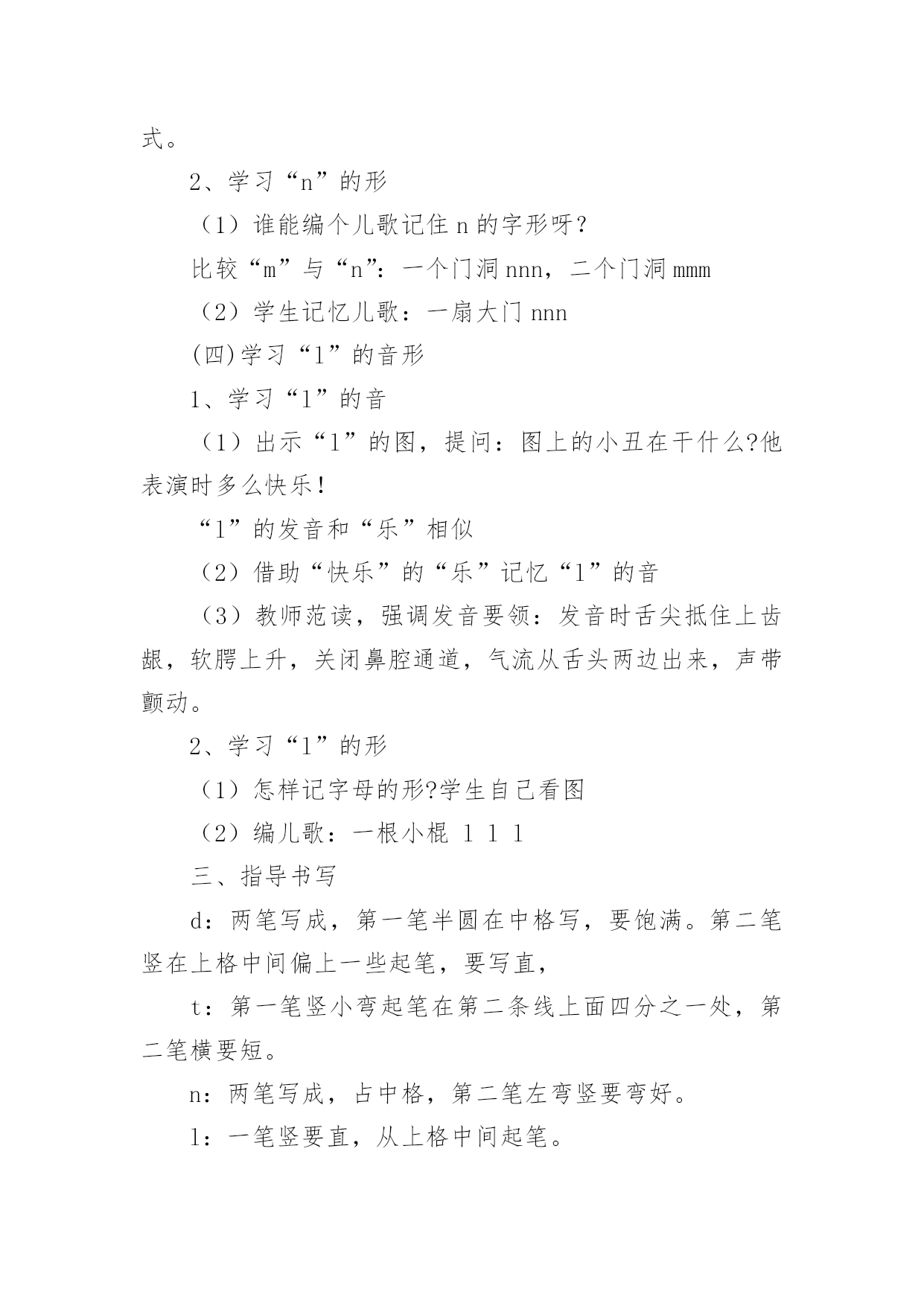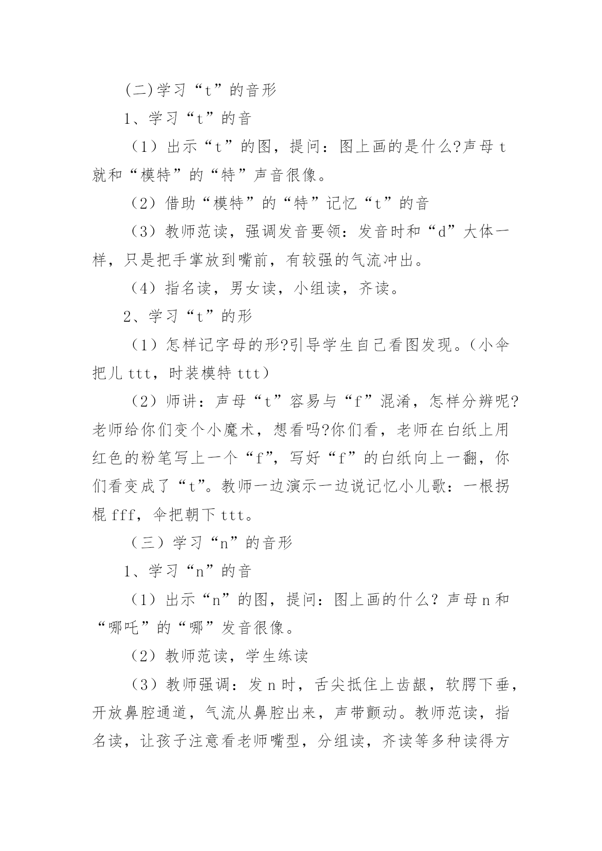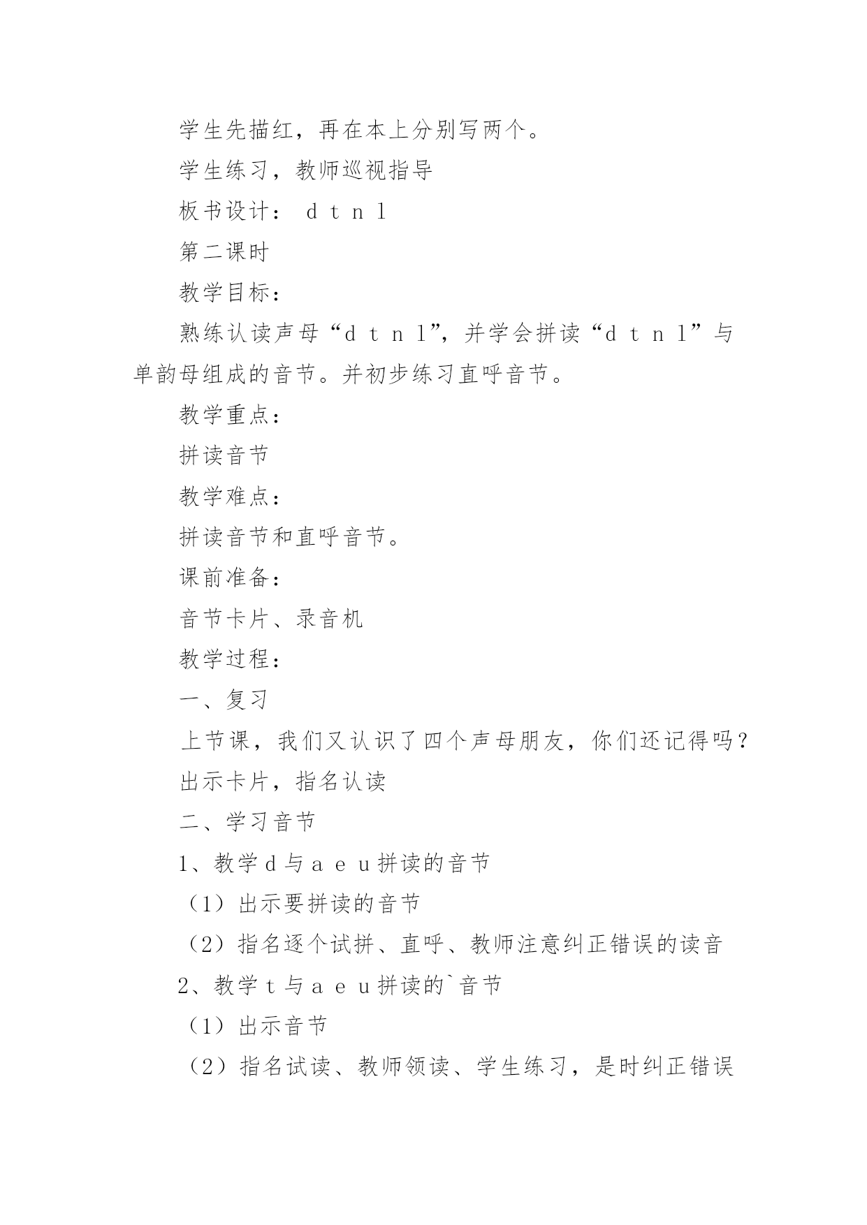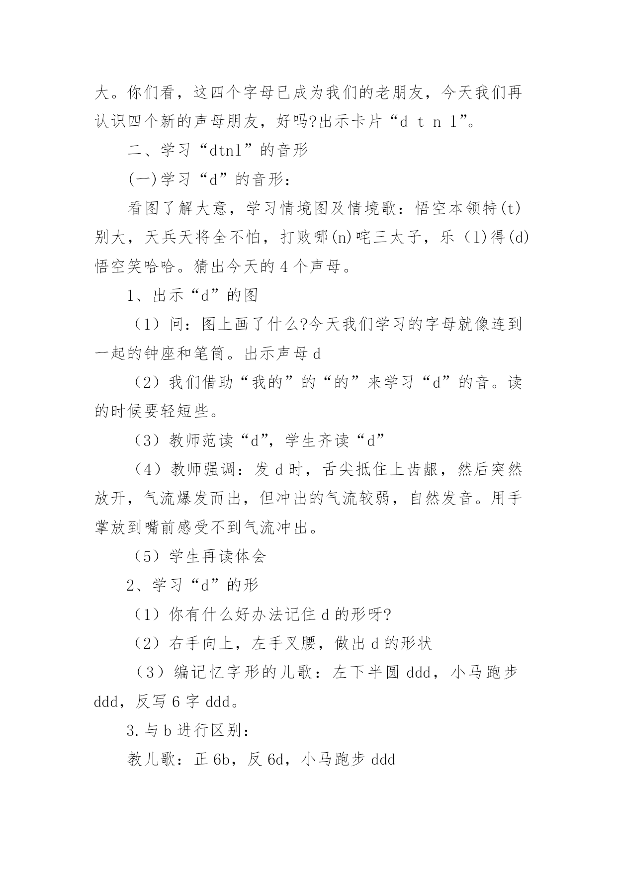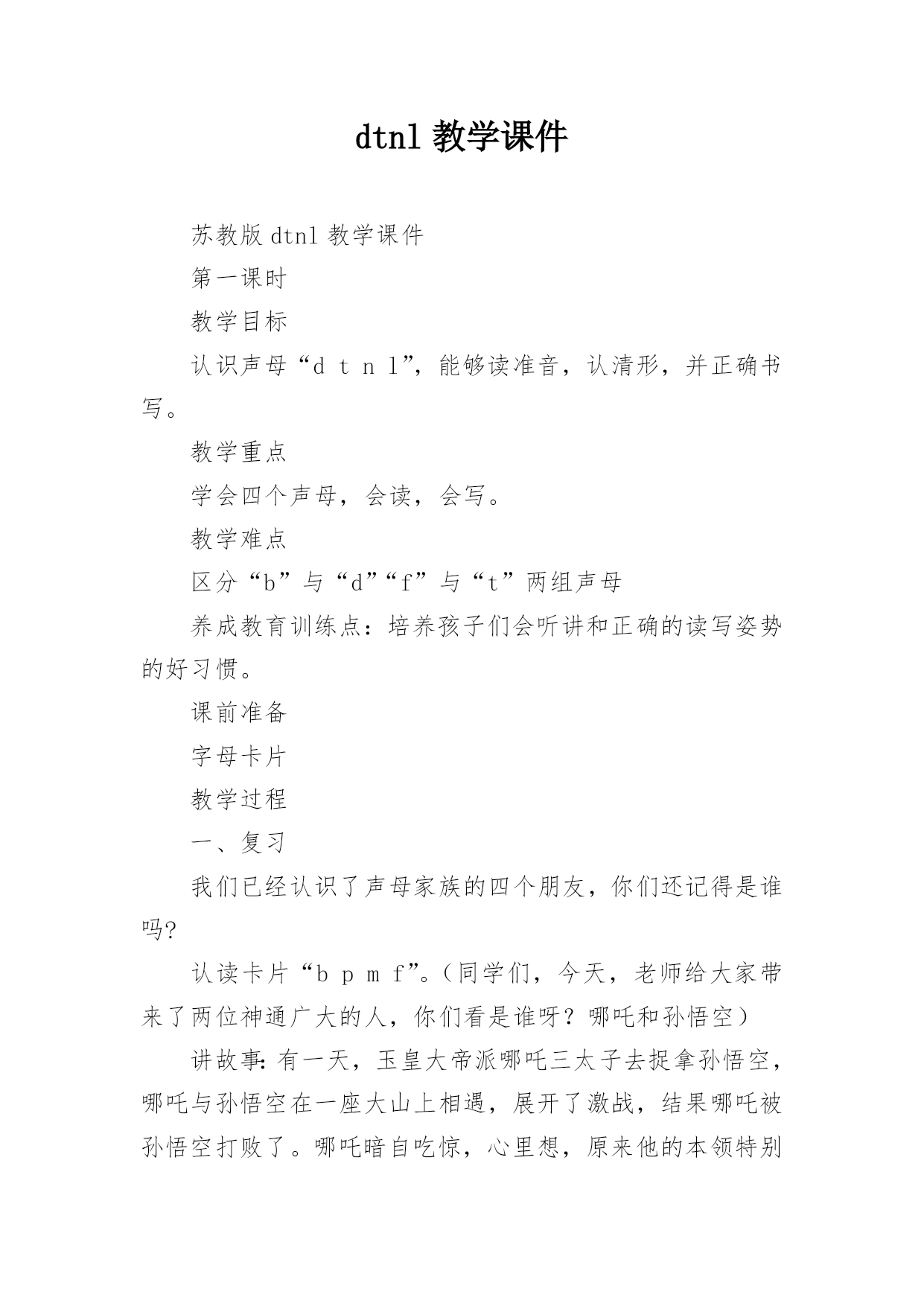 dtnl教学课件 苏教版dtnl教学课件第一课时教学目标认识声母“dtnl”,能够读准音,认清形,并正确书写。教学重点学会四个声母,会读,会写。教学难点区分“b”与“d”“f”与“t”两组声母养成教育训练点:培养孩子们会听讲和正确的读写姿势的好习惯。课前准备字母卡片教学过程一、复习我们已经认识了声母家族的四个朋友,你们还记得是谁吗?认读卡片“bpmf”。(同学们,今天,老师给大家带来了两位神通广大的人,你们看是谁呀?哪吒和孙悟空)讲故事:有一天,玉皇大帝派哪吒三太子去捉拿孙悟空,哪吒与孙悟空在一座大山上相遇,展开了激战,结果哪吒被孙悟空打败了。哪吒暗自吃惊,心里想,原来他的本领特别大。你们看,这四个字母已成为我们的老朋友,今天我们再认识四个新的声母朋友,好吗?出示卡片“dtnl”。二、学习“dtnl”的音形(一)学习“d”的音形:看图了解大意,学习情境图及情境歌:悟空本领特(t)别大,天兵天将全不怕,打败哪(n)咤三太子,乐(l)得(d)悟空笑哈哈。猜出今天的4个声母。1、出示“d”的图(1)问:图上画了什么?今天我们学习的字母就像连到一起的钟座和笔筒。出示声母d(2)我们借助“我的”的“的”来学习“d”的音。读的时候要轻短些。(3)教师范读“d”,学生齐读“d”(4)教师强调:发d时,舌尖抵住上齿龈,然后突然放开,气流爆发而出,但冲出的气流较弱,自然发音。用手掌放到嘴前感受不到气流冲出。(5)学生再读体会2、学习“d”的形(1)你有什么好办法记住d的形呀?(2)右手向上,左手叉腰,做出d的形状(3)编记忆字形的儿歌:左下半圆ddd,小马跑步ddd,反写6字ddd。3.与b进行区别:教儿歌:正6b,反6d,小马跑步ddd(二)学习“t”的音形1、学习“t”的音(1)出示“t”的图,提问:图上画的是什么?声母t就和“模特”的“特”声音很像。(2)借助“模特”的“特”记忆“t”的音(3)教师范读,强调发音要领:发音时和“d”大体一样,只是把手掌放到嘴前,有较强的气流冲出。(4)指名读,男女读,小组读,齐读。2、学习“t”的形(1)怎样记字母的形?引导学生自己看图发现。(小伞把儿ttt,时装模特ttt)(2)师讲:声母“t”容易与“f”混淆,怎样分辨呢?老师给你们变个小魔术,想看吗?你们看,老师在白纸上用红色的粉笔写上一个“f”,写好“f”的白纸向上一翻,你们看变成了“t”。教师一边演示一边说记忆小儿歌:一根拐棍fff,伞把朝下ttt。(三)学习“n”的音形1、学习“n”的音(1)出示“n”的图,提问:图上画的什么?声母n和“哪吒”的“哪”发音很像。(2)教师范读,学生练读(3)教师强调:发n时,舌尖抵住上齿龈,软腭下垂,开放鼻腔通道,气流从鼻腔出来,声带颤动。教师范读,指名读,让孩子注意看老师嘴型,分组读,齐读等多种读得方式。2、学习“n”的形(1)谁能编个儿歌记住n的字形呀?比较“m”与“n”:一个门洞nnn,二个门洞mmm(2)学生记忆儿歌:一扇大门nnn(四)学习“l”的音形1、学习“l”的音(1)出示“l”的图,提问:图上的小丑在干什么?他表演时多么快乐!“l”的发音和“乐”相似(2)借助“快乐”的“乐”记忆“l”的音(3)教师范读,强调发音要领:发音时舌尖抵住上齿龈,软腭上升,关闭鼻腔通道,气流从舌头两边出来,声带颤动。2、学习“l”的形(1)怎样记字母的形?学生自己看图(2)编儿歌:一根小棍lll三、指导书写d:两笔写成,第一笔半圆在中格写,要饱满。第二笔竖在上格中间偏上一些起笔,要写直,t:第一笔竖小弯起笔在第二条线上面四分之一处,第二笔横要短。n:两笔写成,占中格,第二笔左弯竖要弯好。l:一笔竖要直,从上格中间起笔。学生先描红,再在本上分别写两个。学生练习,教师巡视指导板书设计:dtnl第二课时教学目标:熟练认读声母“dtnl”,并学会拼读“dtnl”与单韵母组成的音节。并初步练习直呼音节。教学重点:拼读音节教学难点:拼读音节和直呼音节。课前准备:音节卡片、录音机教学过程:一、复习上节课,我们又认识了四个声母朋友,你们还记得吗?出示卡片,指名认读二、学习音节1、教学d与aeu拼读的音节(1)出示要拼读的音节(2)指名逐个试拼、直呼、教师注意纠正错误的读音2、教学t与aeu拼读的`音节(1)出示音节(2)指名试读、教师领读、学生练习,是时纠正错误的发音。3、教学n与aei拼读的音节(1)出示音节(2)指名试读、教师领读、学生练习,是时纠正错误的发音。4、教学l与aei拼读的音节(1)出示音节(2)指名试读、教师领读、学生练习,是时纠正错误的发音。三、巩固练习1、学生自由练习拼读、指名逐个拼读、打乱顺序读2、“找朋友”的游戏:把音节卡片发到学生手里,教师读到哪个音节,拿到的学生就上台领读,教师与之握手,证明是教师的朋