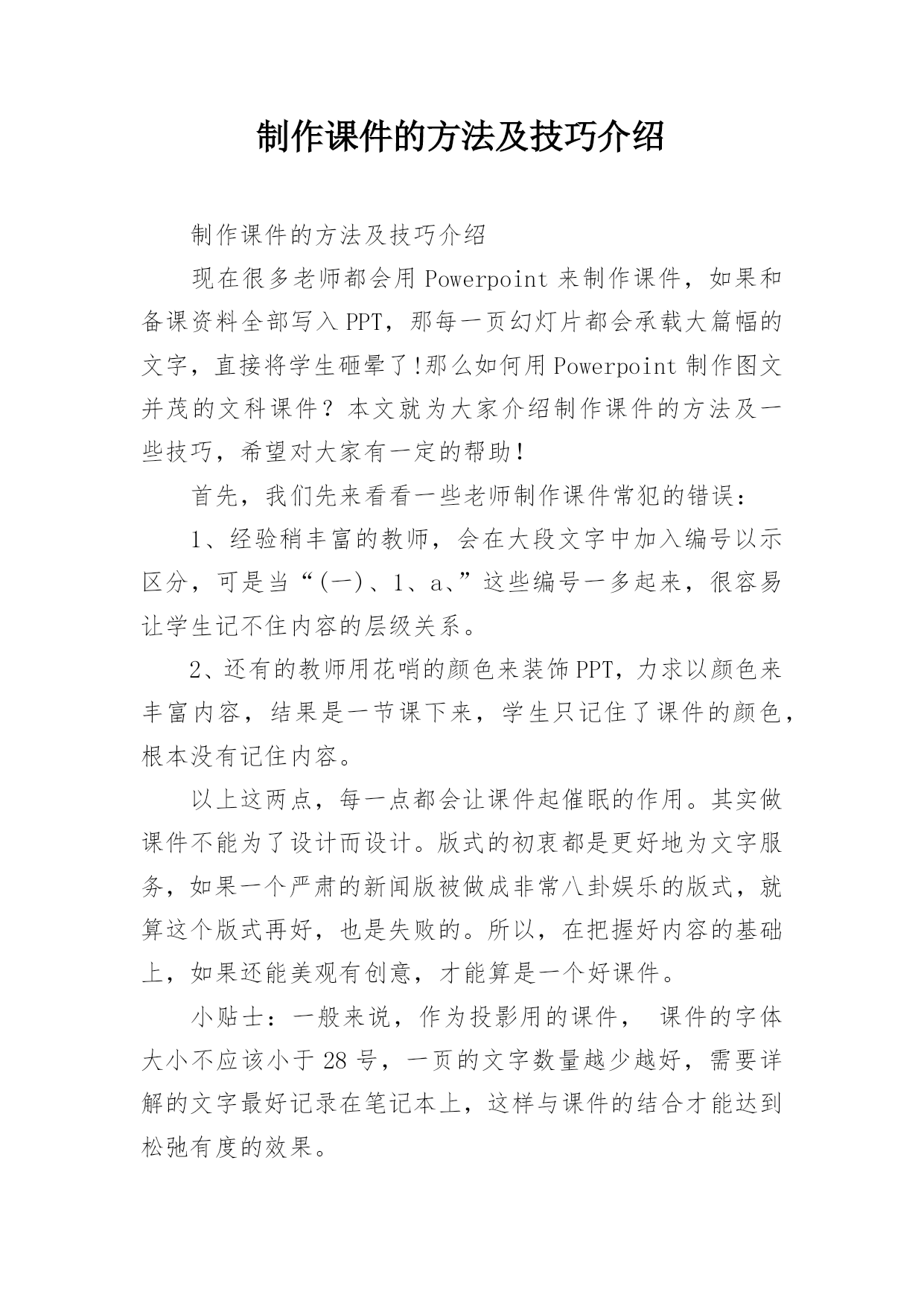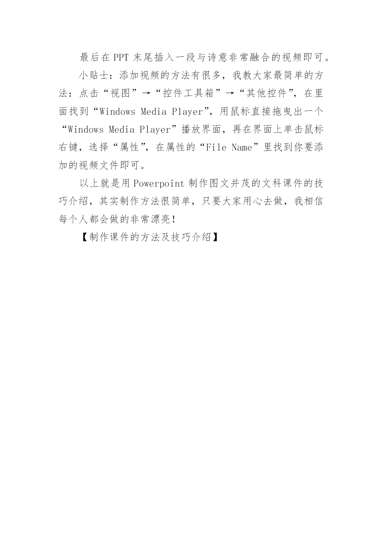 制作课件的方法及技巧介绍 制作课件的方法及技巧介绍现在很多老师都会用Powerpoint来制作课件,如果和备课资料全部写入PPT,那每一页幻灯片都会承载大篇幅的文字,直接将学生砸晕了!那么如何用Powerpoint制作图文并茂的文科课件?本文就为大家介绍制作课件的方法及一些技巧,希望对大家有一定的帮助!首先,我们先来看看一些老师制作课件常犯的错误:1、经验稍丰富的教师,会在大段文字中加入编号以示区分,可是当“(一)、1、a、”这些编号一多起来,很容易让学生记不住内容的层级关系。2、还有的教师用花哨的颜色来装饰PPT,力求以颜色来丰富内容,结果是一节课下来,学生只记住了课件的颜色,根本没有记住内容。以上这两点,每一点都会让课件起催眠的作用。其实做课件不能为了设计而设计。版式的初衷都是更好地为文字服务,如果一个严肃的新闻版被做成非常八卦娱乐的版式,就算这个版式再好,也是失败的。所以,在把握好内容的基础上,如果还能美观有创意,才能算是一个好课件。小贴士:一般来说,作为投影用的课件,课件的字体大小不应该小于28号,一页的文字数量越少越好,需要详解的文字最好记录在笔记本上,这样与课件的结合才能达到松弛有度的效果。制作图文并茂课件技巧:文科类的课件,例如语文、英语、历史、美术鉴赏等,都可以有一个通用标准:页面字少,突出重点:尽量在教案中归纳出关键词,在课件中只放关键词即可。有创意的文字处理:可以试着把某些重点文字放大,某些文字只出现半边,甚至某些文字翻转90°等,会有意想不到的效果。活用多媒体:添加些背景音乐,视频,来增加课件的乐趣,让学生可以全方位感受课件的内容。以《古典文学》为例,相信很多学生一听到这4个字,都会感到头疼,因为古人的文字浓缩技术非常了得,一首七言绝句仅仅28个字,包含大量的信息,解读出来足可以写一篇500字的'小作文了,学生能有兴趣吗?有没有想过把它变成一个赏析片呢?一起试试吧?首先介绍出场人物,可以选择相应的画作为背景,接着将字体换成书法字(更能烘托古诗的意境),再把诗句和译句分句并添加动画,逐行演示出来然后把需要重点分析的诗句单独提出来,以关键词作为引导,利用PPT里的箭头等符号工具,清晰的表达出重点内容。此外,还需要添加一曲优美的背景音乐,让学生在音乐中放松地阅读。小贴士:添加背景音乐十分简单,点击“插入”→“声音”→“文件中的声音”,找到你想要添加的背景音乐即可。此外,还可以在自定义动画的“声音设置”里面隐藏“小喇叭”图标。最后在PPT末尾插入一段与诗意非常融合的视频即可。小贴士:添加视频的方法有很多,我教大家最简单的方法:点击“视图”→“控件工具箱”→“其他控件”,在里面找到“WindowsMediaPlayer”,用鼠标直接拖曳出一个“WindowsMediaPlayer”播放界面,再在界面上单击鼠标右键,选择“属性”,在属性的“FileName”里找到你要添加的视频文件即可。以上就是用Powerpoint制作图文并茂的文科课件的技巧介绍,其实制作方法很简单,只要大家用心去做,我相信每个人都会做的非常漂亮!【制作课件的方法及技巧介绍】