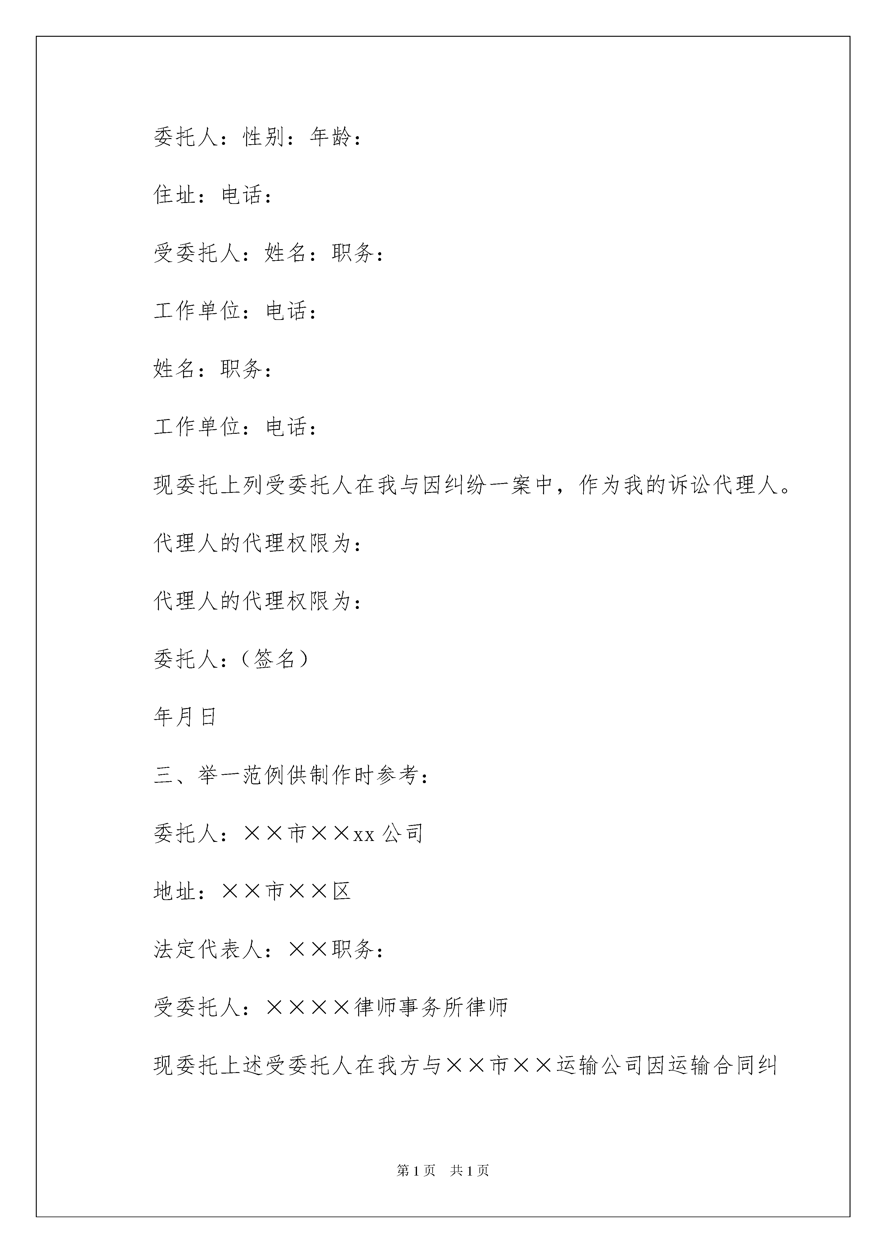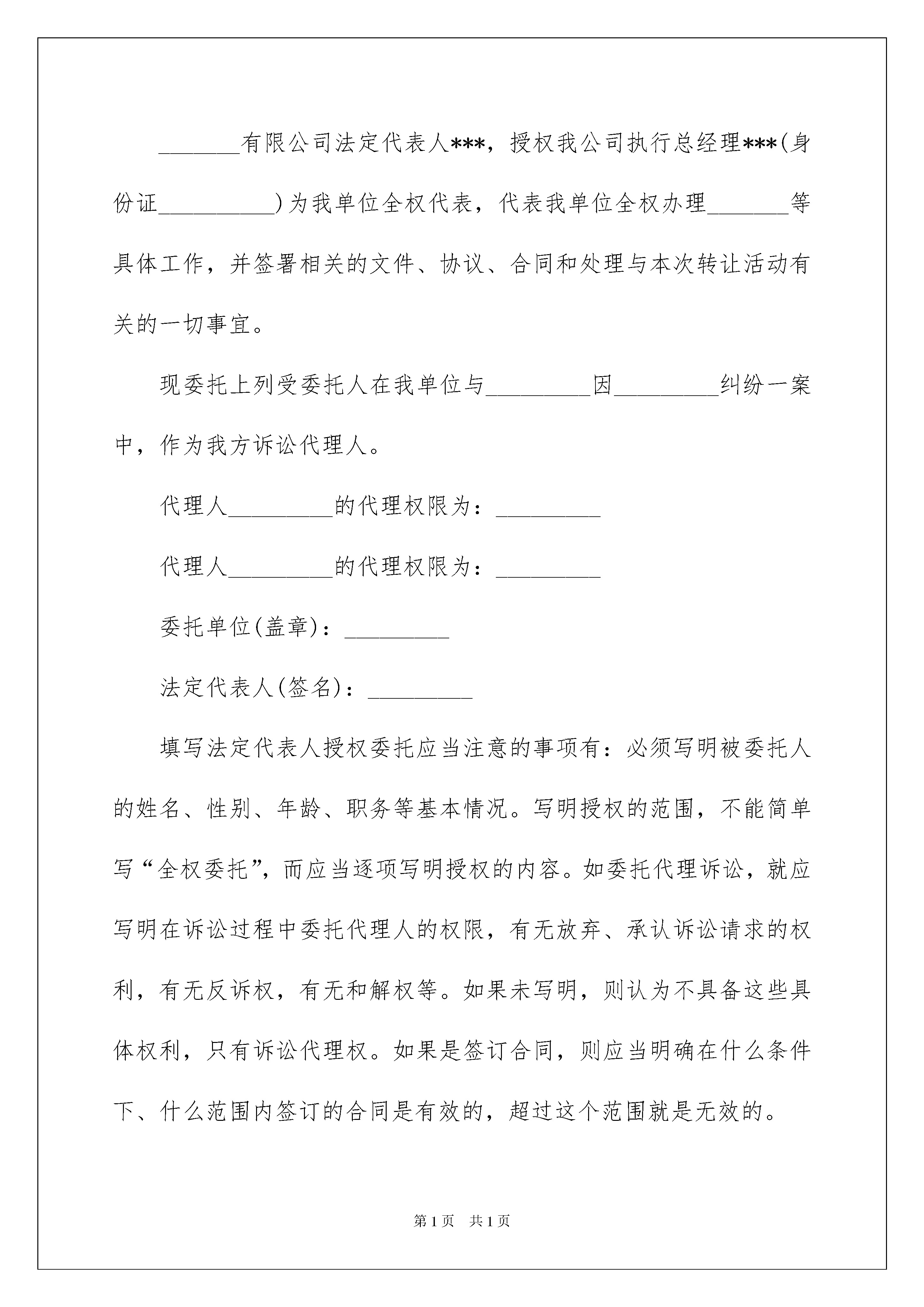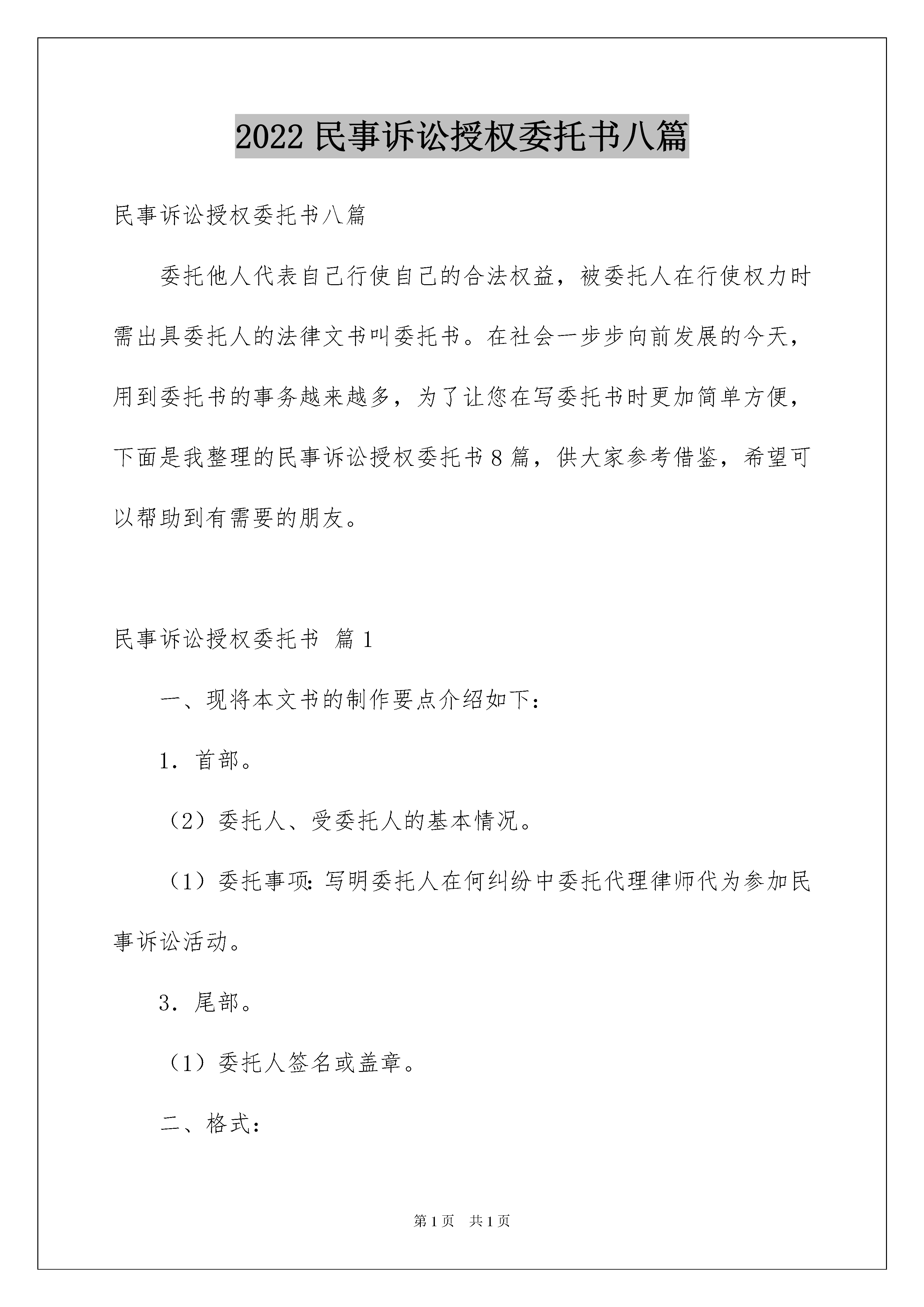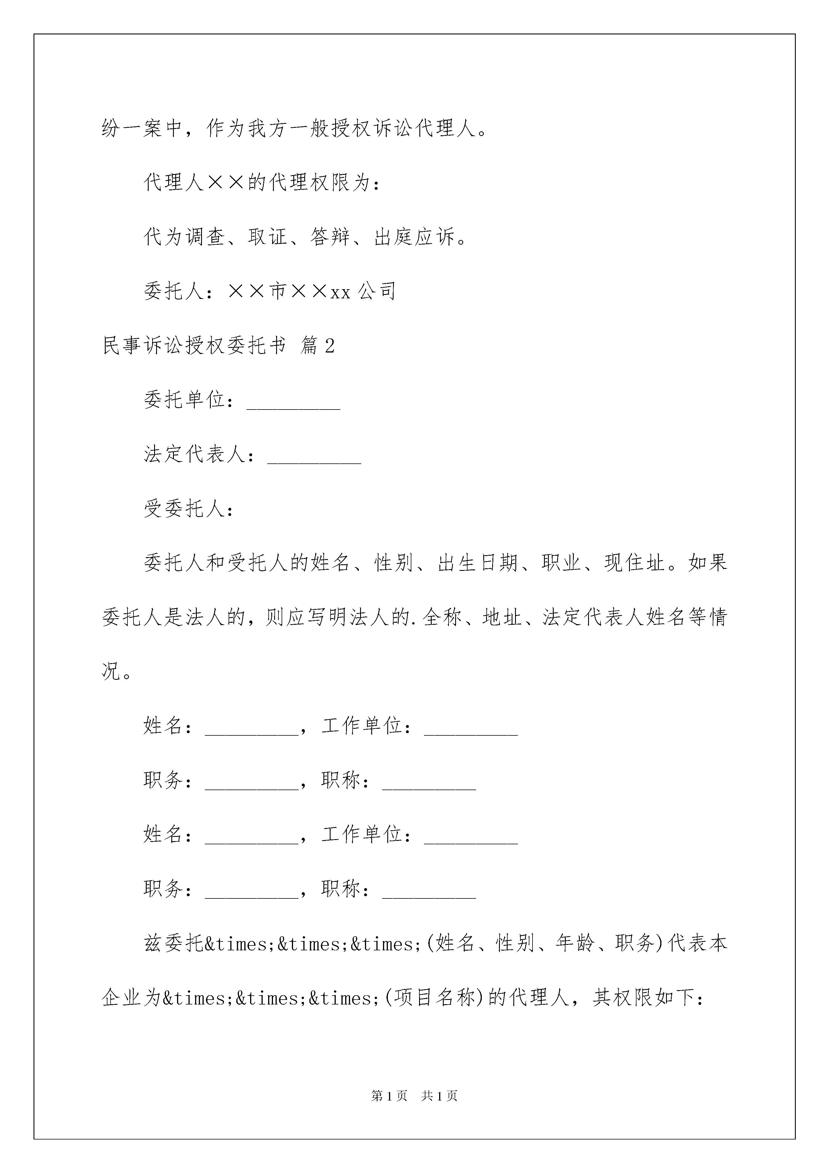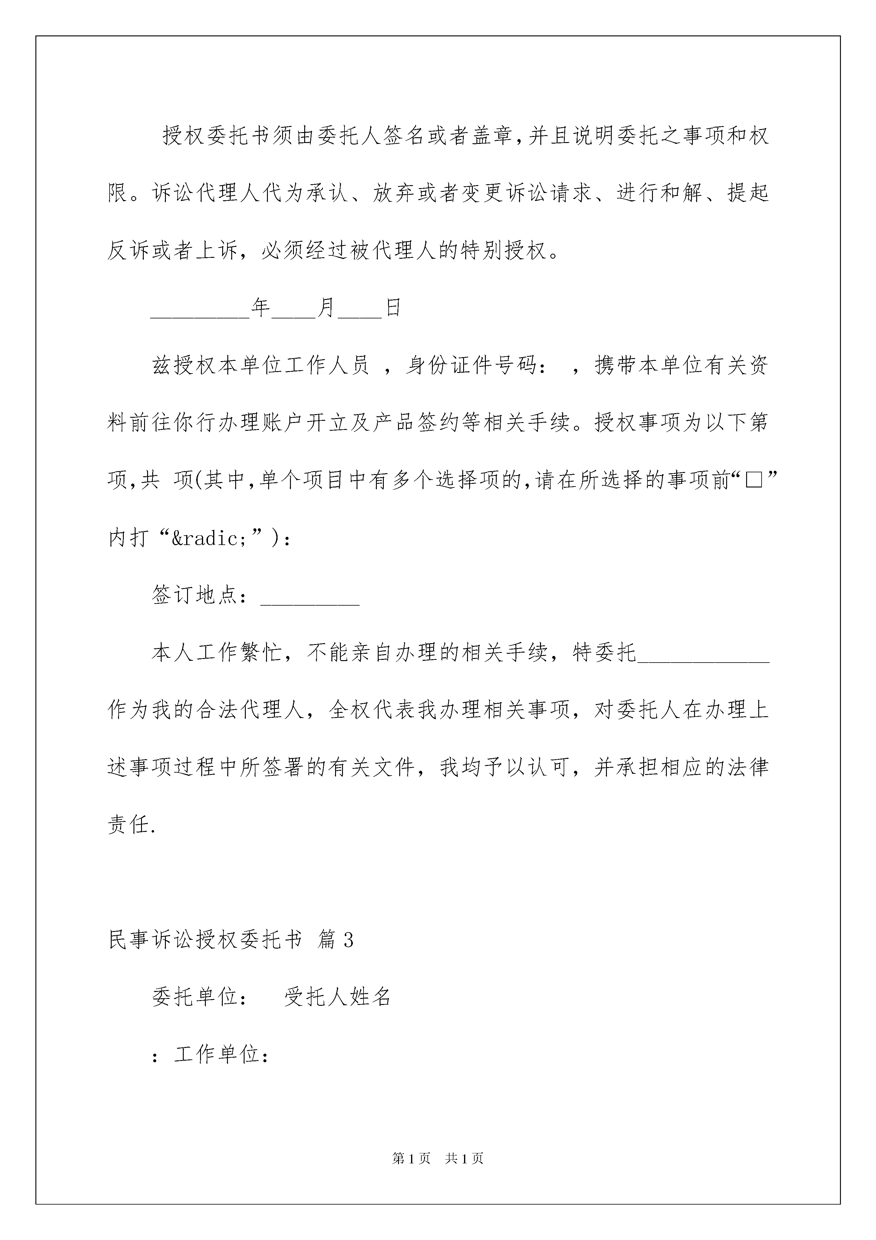 2022民事诉讼授权委托书八篇民事诉讼授权委托书八篇委托他人代表自己行使自己的合法权益,被委托人在行使权力时需出具委托人的法律文书叫委托书。在社会一步步向前发展的今天,用到委托书的事务越来越多,为了让您在写委托书时更加简单方便,下面是我整理的民事诉讼授权委托书8篇,供大家参考借鉴,希望可以帮助到有需要的朋友。民事诉讼授权委托书篇1一、现将本文书的制作要点介绍如下:1.首部。(2)委托人、受委托人的基本情况。(1)委托事项:写明委托人在何纠纷中委托代理律师代为参加民事诉讼活动。3.尾部。(1)委托人签名或盖章。二、格式:委托人:性别:年龄:住址:电话:受委托人:姓名:职务:工作单位:电话:姓名:职务:工作单位:电话:现委托上列受委托人在我与因纠纷一案中,作为我的诉讼代理人。代理人的代理权限为:代理人的代理权限为:委托人:(签名)年月日三、举一范例供制作时参考:委托人:××市××xx公司地址:××市××区法定代表人:××职务:受委托人:××××律师事务所律师现委托上述受委托人在我方与××市××运输公司因运输合同纠纷一案中,作为我方一般授权诉讼代理人。代理人××的代理权限为:代为调查、取证、答辩、出庭应诉。委托人:××市××xx公司民事诉讼授权委托书篇2委托单位:_________法定代表人:_________受委托人:委托人和受托人的姓名、性别、出生日期、职业、现住址。如果委托人是法人的,则应写明法人的.全称、地址、法定代表人姓名等情况。姓名:_________,工作单位:_________职务:_________,职称:_________姓名:_________,工作单位:_________职务:_________,职称:_________兹委托×××(姓名、性别、年龄、职务)代表本企业为×××(项目名称)的代理人,其权限如下:_______有限公司法定代表人***,授权我公司执行总经理***(身份证__________)为我单位全权代表,代表我单位全权办理_______等具体工作,并签署相关的文件、协议、合同和处理与本次转让活动有关的一切事宜。现委托上列受委托人在我单位与_________因_________纠纷一案中,作为我方诉讼代理人。代理人_________的代理权限为:_________代理人_________的代理权限为:_________委托单位(盖章):_________法定代表人(签名):_________填写法定代表人授权委托应当注意的事项有:必须写明被委托人的姓名、性别、年龄、职务等基本情况。写明授权的范围,不能简单写“全权委托”,而应当逐项写明授权的内容。如委托代理诉讼,就应写明在诉讼过程中委托代理人的权限,有无放弃、承认诉讼请求的权利,有无反诉权,有无和解权等。如果未写明,则认为不具备这些具体权利,只有诉讼代理权。如果是签订合同,则应当明确在什么条件下、什么范围内签订的合同是有效的,超过这个范围就是无效的。授权委托书须由委托人签名或者盖章,并且说明委托之事项和权限。诉讼代理人代为承认、放弃或者变更诉讼请求、进行和解、提起反诉或者上诉,必须经过被代理人的特别授权。_________年____月____日兹授权本单位工作人员,身份证件号码:,携带本单位有关资料前往你行办理账户开立及产品签约等相关手续。授权事项为以下第项,共项(其中,单个项目中有多个选择项的,请在所选择的事项前“□”内打“√”):签订地点:_________本人工作繁忙,不能亲自办理的相关手续,特委托____________作为我的合法代理人,全权代表我办理相关事项,对委托人在办理上述事项过程中所签署的有关文件,我均予以认可,并承担相应的法律责任.民事诉讼授权委托书篇3委托单位:受托人姓名:工作单位:职务:联系方式:姓名:工作单位:职务:联系方式:现委托上列受托人在我单位与因纠纷一案中,作为我方一审诉讼代理人。代理人的代理权限为:代为起诉,申请保全,陈述案情,调查取证,举证质证,进行辩论,承认、放弃或变更诉讼请求,代为和(调)解,代为签收法律文书,代为上诉,代为撤诉,代收款项及共项。代理人的代理权限为:同上委托单位:年月日民事诉讼授权委托书篇4委托人根据法律的规定,特聘请河南陈州律师事务所耿立广律师为案件附带民事诉讼的诉讼代理人。委托律师代理权限:《刑事诉讼法》规定的全部权限本委托书有效期自即日起至止。委托人:年月日联系电话:xx收件地址:周口市大闸路与滨河路交叉口滨江国际酒店1208室。民事诉讼授权委托