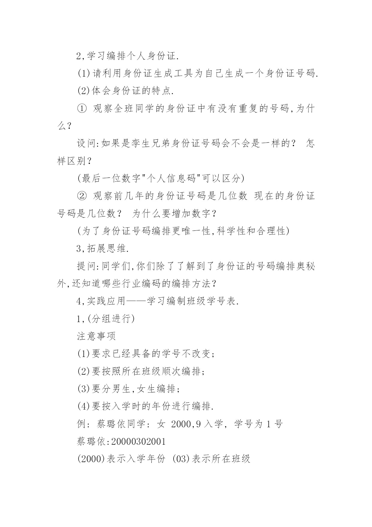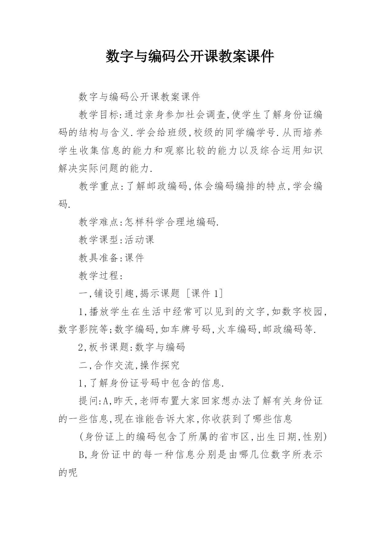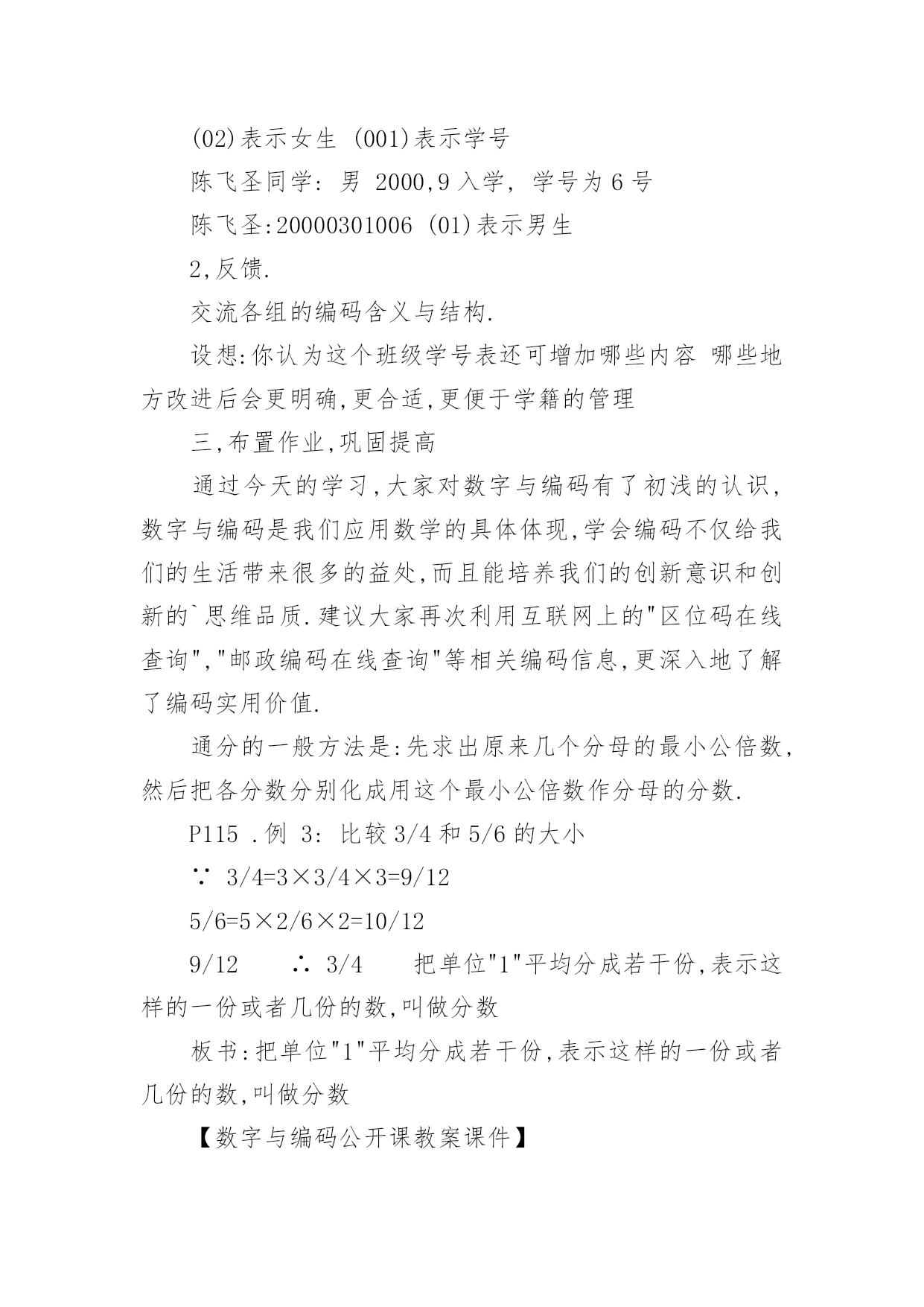 数字与编码公开课教案课件 数字与编码公开课教案课件教学目标:通过亲身参加社会调查,使学生了解身份证编码的结构与含义.学会给班级,校级的同学编学号.从而培养学生收集信息的能力和观察比较的能力以及综合运用知识解决实际问题的能力.教学重点:了解邮政编码,体会编码编排的特点,学会编码.教学难点:怎样科学合理地编码.教学课型:活动课教具准备:课件教学过程:一,铺设引趣,揭示课题[课件1]1,播放学生在生活中经常可以见到的文字,如数字校园,数字影院等;数字编码,如车牌号码,火车编码,邮政编码等.2,板书课题:数字与编码二,合作交流,操作探究1,了解身份证号码中包含的信息.提问:A,昨天,老师布置大家回家想办法了解有关身份证的一些信息,现在谁能告诉大家,你收获到了哪些信息(身份证上的编码包含了所属的省市区,出生日期,性别)B,身份证中的每一种信息分别是由哪几位数字所表示的呢2,学习编排个人身份证.(1)请利用身份证生成工具为自己生成一个身份证号码.(2)体会身份证的特点.①观察全班同学的身份证中有没有重复的号码,为什么?设问:如果是孪生兄弟身份证号码会不会是一样的?怎样区别?(最后一位数字"个人信息码"可以区分)②观察前几年的身份证号码是几位数现在的身份证号码是几位数?为什么要增加数字?(为了身份证号码编排更唯一性,科学性和合理性)3,拓展思维.提问:同学们,你们除了了解到了身份证的号码编排奥秘外,还知道哪些行业编码的编排方法?4,实践应用——学习编制班级学号表.1,(分组进行)注意事项(1)要求已经具备的学号不改变;(2)要按照所在班级顺次编排;(3)要分男生,女生编排;(4)要按入学时的年份进行编排.例:蔡璐依同学:女2000,9入学,学号为1号蔡璐依:20000302001(2000)表示入学年份(03)表示所在班级(02)表示女生(001)表示学号陈飞圣同学:男2000,9入学,学号为6号陈飞圣:20000301006(01)表示男生2,反馈.交流各组的编码含义与结构.设想:你认为这个班级学号表还可增加哪些内容哪些地方改进后会更明确,更合适,更便于学籍的管理三,布置作业,巩固提高通过今天的学习,大家对数字与编码有了初浅的认识,数字与编码是我们应用数学的具体体现,学会编码不仅给我们的生活带来很多的益处,而且能培养我们的创新意识和创新的`思维品质.建议大家再次利用互联网上的"区位码在线查询","邮政编码在线查询"等相关编码信息,更深入地了解了编码实用价值.通分的一般方法是:先求出原来几个分母的最小公倍数,然后把各分数分别化成用这个最小公倍数作分母的分数.P115.例3:比较3/4和5/6的大小∵3/4=3×3/4×3=9/125/6=5×2/6×2=10/129/12∴3/4把单位"1"平均分成若干份,表示这样的一份或者几份的数,叫做分数板书:把单位"1"平均分成若干份,表示这样的一份或者几份的数,叫做分数【数字与编码公开课教案课件】
