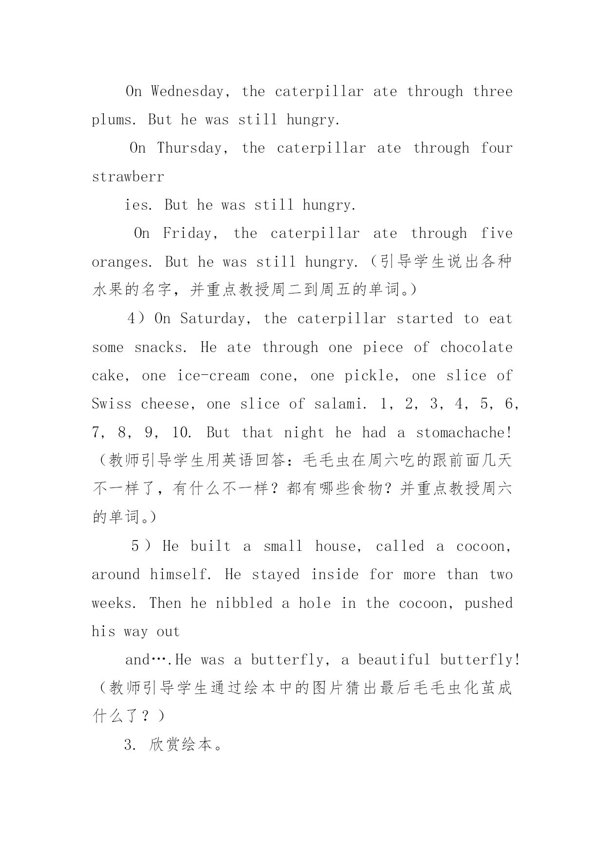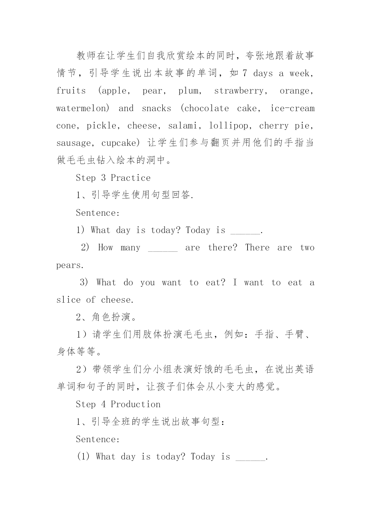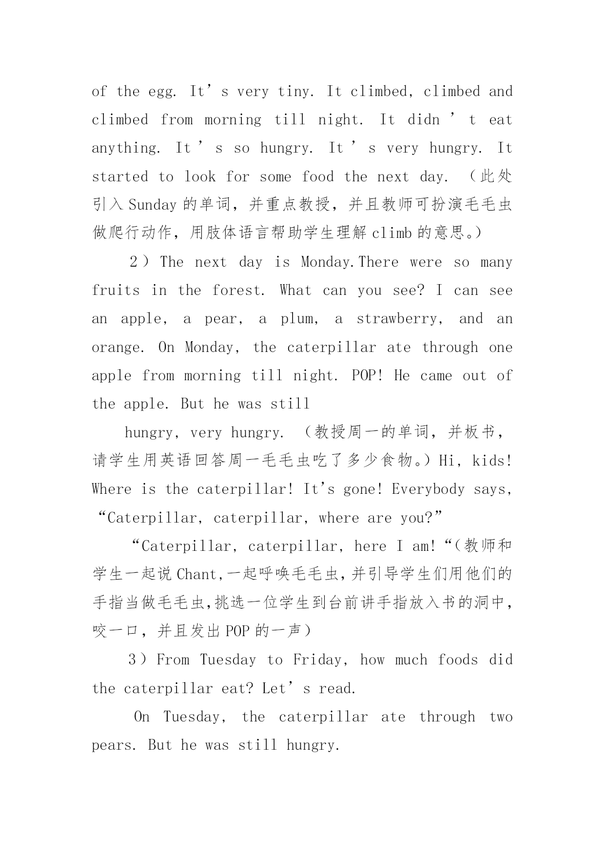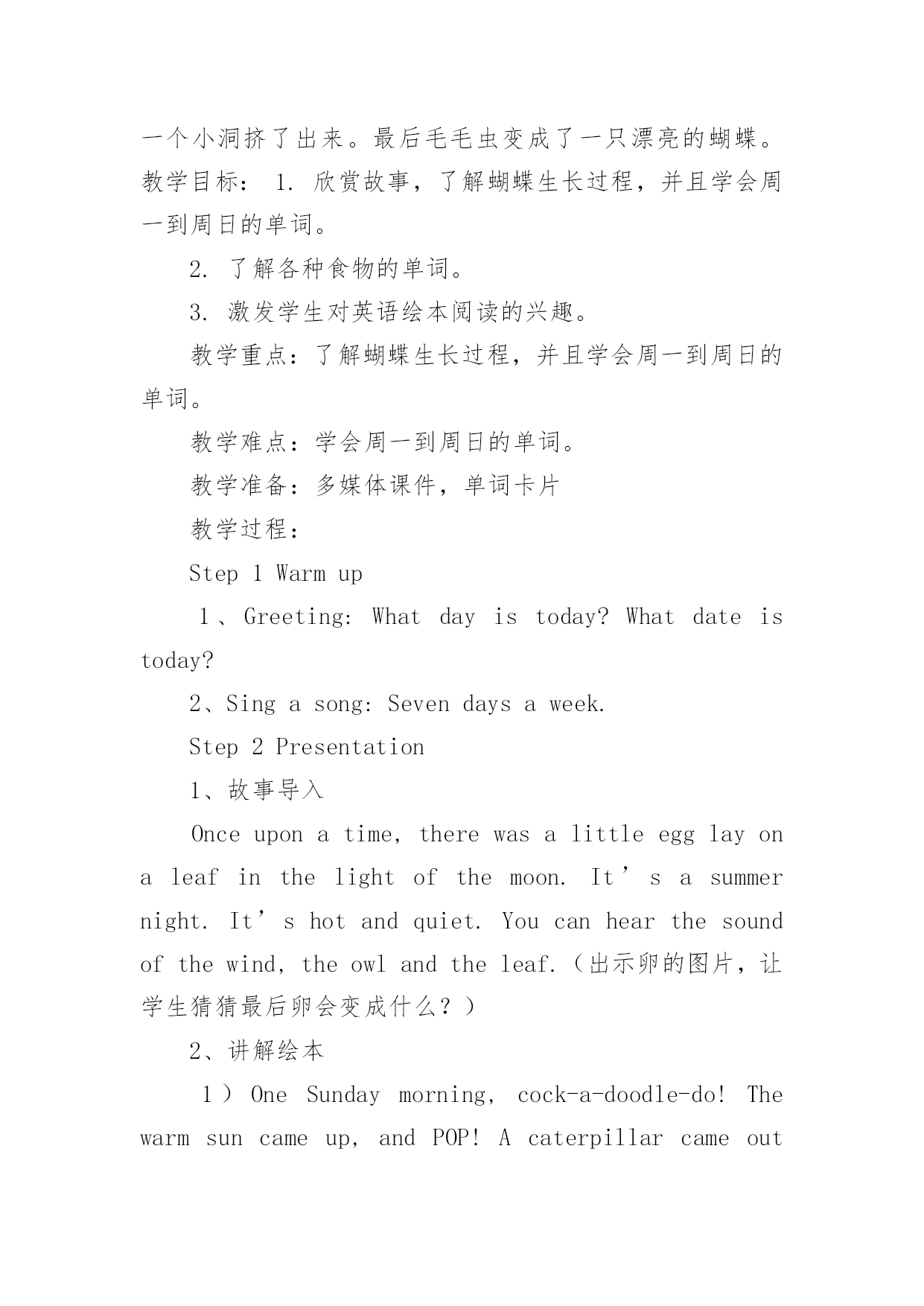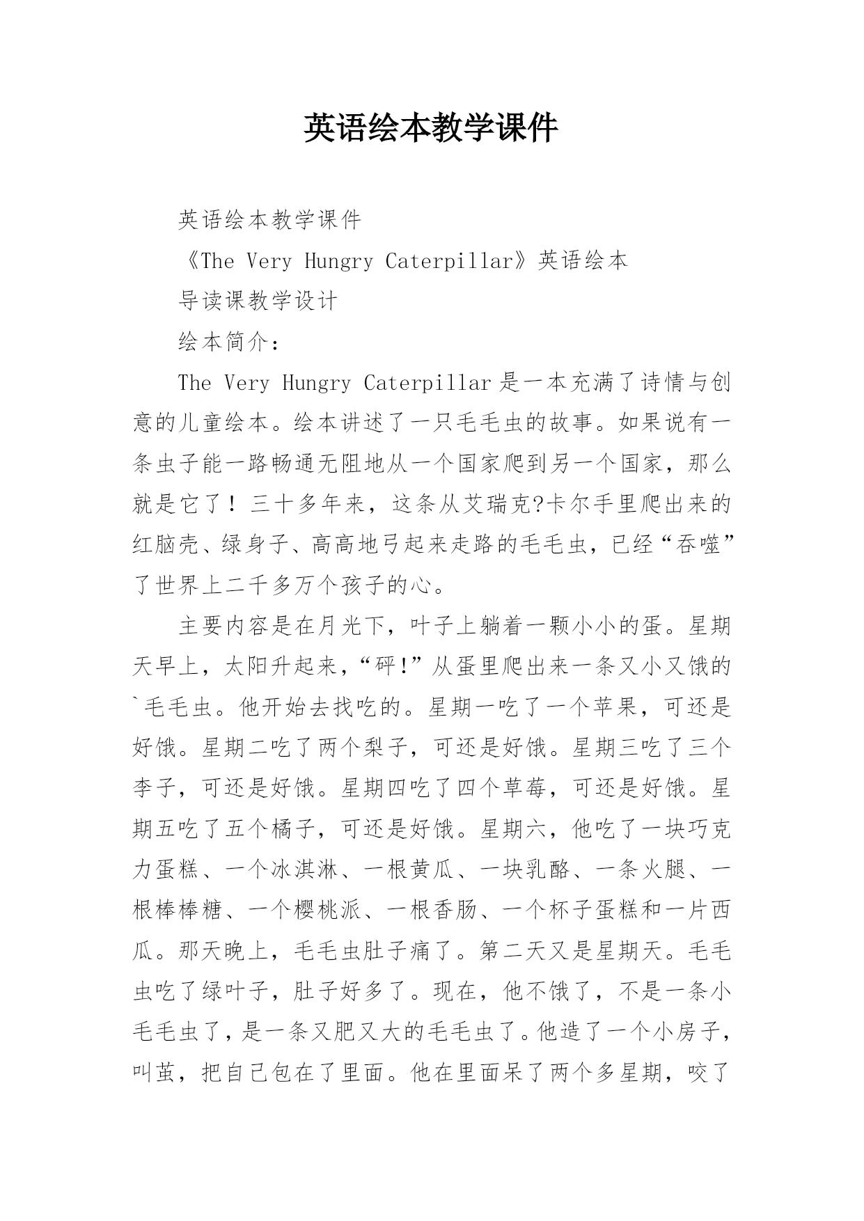 英语绘本教学课件 英语绘本教学课件《TheVeryHungryCaterpillar》英语绘本导读课教学设计绘本简介:TheVeryHungryCaterpillar是一本充满了诗情与创意的儿童绘本。绘本讲述了一只毛毛虫的故事。如果说有一条虫子能一路畅通无阻地从一个国家爬到另一个国家,那么就是它了!三十多年来,这条从艾瑞克?卡尔手里爬出来的红脑壳、绿身子、高高地弓起来走路的毛毛虫,已经“吞噬”了世界上二千多万个孩子的心。主要内容是在月光下,叶子上躺着一颗小小的蛋。星期天早上,太阳升起来,“砰!”从蛋里爬出来一条又小又饿的`毛毛虫。他开始去找吃的。星期一吃了一个苹果,可还是好饿。星期二吃了两个梨子,可还是好饿。星期三吃了三个李子,可还是好饿。星期四吃了四个草莓,可还是好饿。星期五吃了五个橘子,可还是好饿。星期六,他吃了一块巧克力蛋糕、一个冰淇淋、一根黄瓜、一块乳酪、一条火腿、一根棒棒糖、一个樱桃派、一根香肠、一个杯子蛋糕和一片西瓜。那天晚上,毛毛虫肚子痛了。第二天又是星期天。毛毛虫吃了绿叶子,肚子好多了。现在,他不饿了,不是一条小毛毛虫了,是一条又肥又大的毛毛虫了。他造了一个小房子,叫茧,把自己包在了里面。他在里面呆了两个多星期,咬了一个小洞挤了出来。最后毛毛虫变成了一只漂亮的蝴蝶。教学目标:1.欣赏故事,了解蝴蝶生长过程,并且学会周一到周日的单词。2.了解各种食物的单词。3.激发学生对英语绘本阅读的兴趣。教学重点:了解蝴蝶生长过程,并且学会周一到周日的单词。教学难点:学会周一到周日的单词。教学准备:多媒体课件,单词卡片教学过程:Step1Warmup1、Greeting:Whatdayistoday?Whatdateistoday?2、Singasong:Sevendaysaweek.Step2Presentation1、故事导入Onceuponatime,therewasalittleegglayonaleafinthelightofthemoon.It’sasummernight.It’shotandquiet.Youcanhearthesoundofthewind,theowlandtheleaf.(出示卵的图片,让学生猜猜最后卵会变成什么?)2、讲解绘本1)OneSundaymorning,cock-a-doodle-do!Thewarmsuncameup,andPOP!Acaterpillarcameoutoftheegg.It’sverytiny.Itclimbed,climbedandclimbedfrommorningtillnight.Itdidn’teatanything.It’ssohungry.It’sveryhungry.Itstartedtolookforsomefoodthenextday.(此处引入Sunday的单词,并重点教授,并且教师可扮演毛毛虫做爬行动作,用肢体语言帮助学生理解climb的意思。)2)ThenextdayisMonday.Thereweresomanyfruitsintheforest.Whatcanyousee?Icanseeanapple,apear,aplum,astrawberry,andanorange.OnMonday,thecaterpillaratethroughoneapplefrommorningtillnight.POP!Hecameoutoftheapple.Buthewasstillhungry,veryhungry.(教授周一的单词,并板书,请学生用英语回答周一毛毛虫吃了多少食物。)Hi,kids!Whereisthecaterpillar!It’sgone!Everybodysays,“Caterpillar,caterpillar,whereareyou?”“Caterpillar,caterpillar,hereIam!“(教师和学生一起说Chant,一起呼唤毛毛虫,并引导学生们用他们的手指当做毛毛虫,挑选一位学生到台前讲手指放入书的洞中,咬一口,并且发出POP的一声)3)FromTuesdaytoFriday,howmuchfoodsdidthecaterpillareat?Let’sread.OnTuesday,thecaterpillaratethroughtwopears.Buthewasstillhungry.OnWednesday,thecaterpillaratethroughthreeplums.Buthewasstillhungry.OnThursday,thecaterpillaratethroughfourstrawberries.Buthewasstillhungry.OnFriday,thecaterpillar