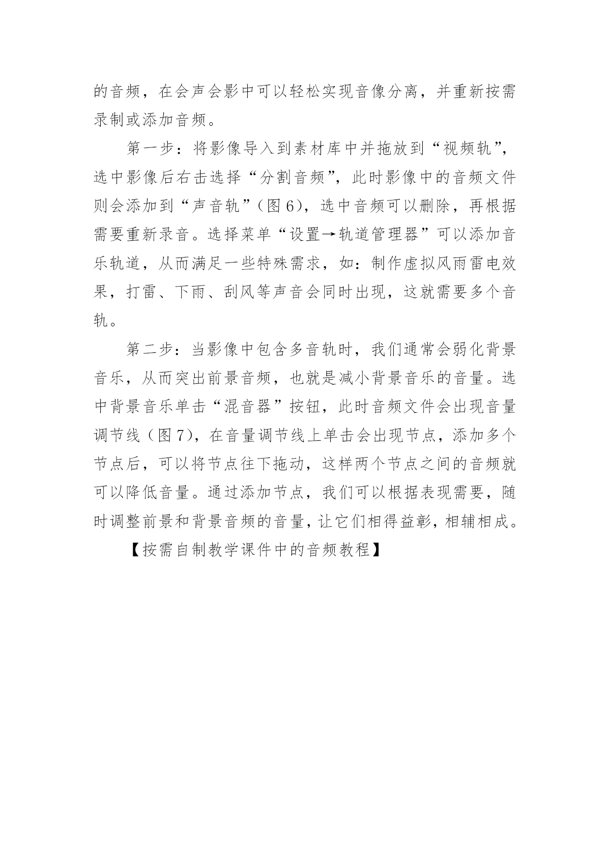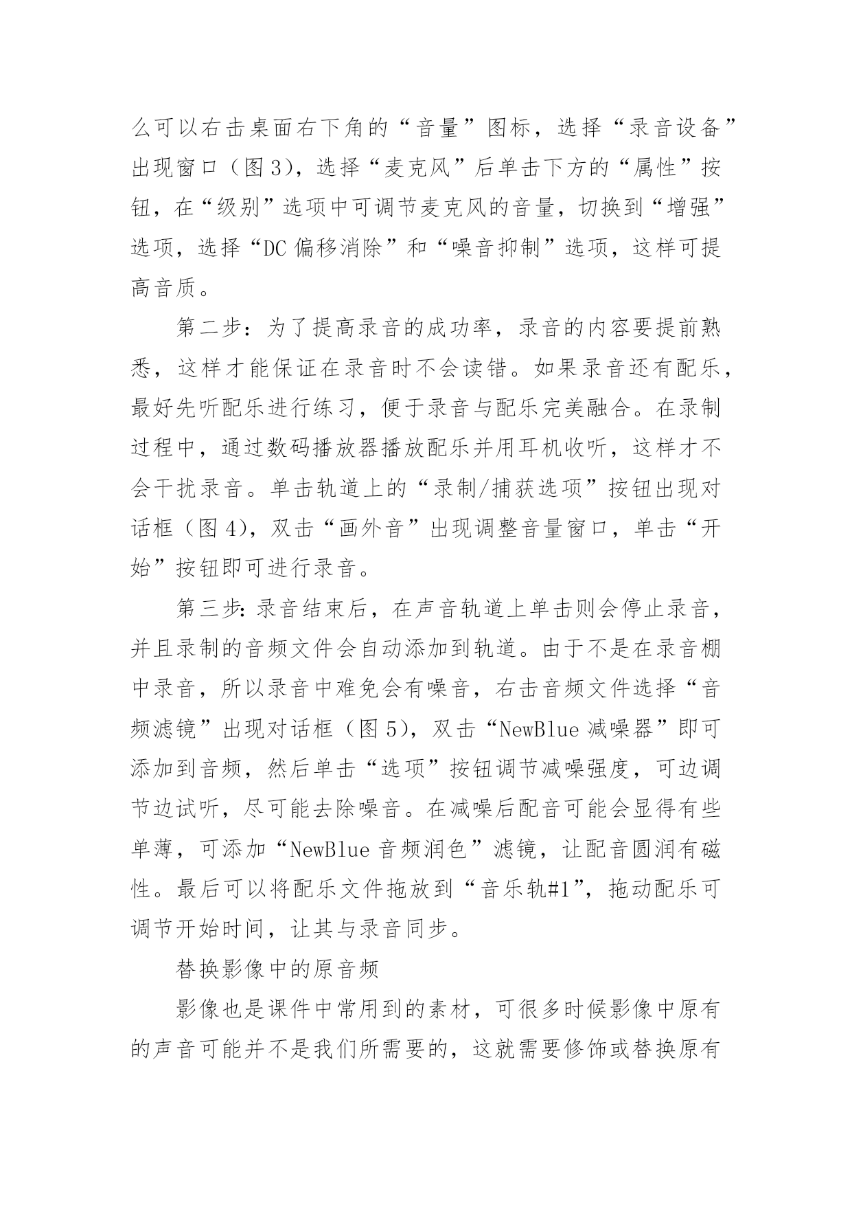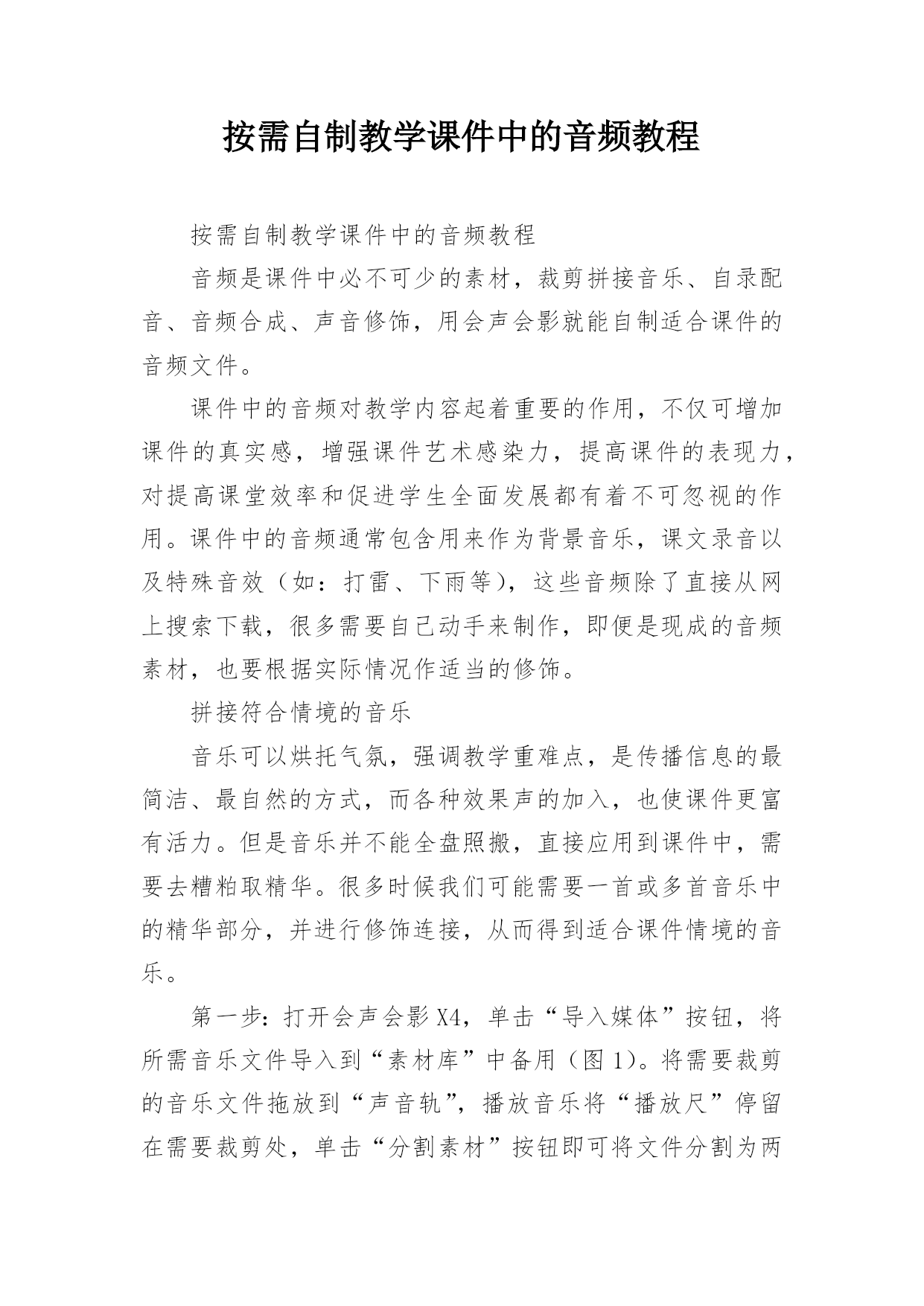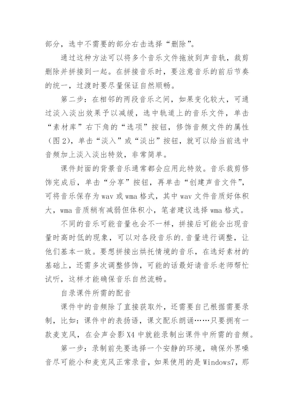按需自制教学课件中的音频教程 按需自制教学课件中的音频教程音频是课件中必不可少的素材,裁剪拼接音乐、自录配音、音频合成、声音修饰,用会声会影就能自制适合课件的音频文件。课件中的音频对教学内容起着重要的作用,不仅可增加课件的真实感,增强课件艺术感染力,提高课件的表现力,对提高课堂效率和促进学生全面发展都有着不可忽视的作用。课件中的音频通常包含用来作为背景音乐,课文录音以及特殊音效(如:打雷、下雨等),这些音频除了直接从网上搜索下载,很多需要自己动手来制作,即便是现成的音频素材,也要根据实际情况作适当的修饰。拼接符合情境的音乐音乐可以烘托气氛,强调教学重难点,是传播信息的最简洁、最自然的方式,而各种效果声的加入,也使课件更富有活力。但是音乐并不能全盘照搬,直接应用到课件中,需要去糟粕取精华。很多时候我们可能需要一首或多首音乐中的精华部分,并进行修饰连接,从而得到适合课件情境的音乐。第一步:打开会声会影X4,单击“导入媒体”按钮,将所需音乐文件导入到“素材库”中备用(图1)。将需要裁剪的音乐文件拖放到“声音轨”,播放音乐将“播放尺”停留在需要裁剪处,单击“分割素材”按钮即可将文件分割为两部分,选中不需要的部分右击选择“删除”。通过这种方法可以将多个音乐文件拖放到声音轨,裁剪删除并拼接到一起。在拼接音乐时,要注意音乐的前后节奏的统一,过渡时要尽量保证自然顺畅。第二步:在相邻的两段音乐之间,如果变化较大,可通过淡入淡出效果予以减缓,选中轨道上的音乐文件,单击“素材库”右下角的“选项”按钮,修饰音频文件的属性(图2),单击“淡入”或“淡出”按钮,就可以给当前选中音频加上淡入淡出特效,非常简单。课件封面的背景音乐通常都会应用此特效。音乐裁剪修饰完成后,单击“分享”按钮,再单击“创建声音文件”,可将音乐保存为wav或wma格式,其中wav文件音质好体积大,wma音质稍有减弱但体积小,笔者建议选择wma格式。不同的音乐可能音量也会不一样,拼接后可能会出现音量时高时低的现象,可以对各段音乐的.音量进行调整,让他们基本一致。要想拼接出烘托情境的音乐,在选好素材的基础上,还需多次调整修饰,可能的话最好请音乐老师帮忙试听,这样才能确保音乐自然流畅。自录课件所需的配音课件中的音频除了直接获取外,还需要自己根据需要录制,比如:课件中的表扬语,课文配乐朗诵……只要拥有一款麦克风,在会声会影X4中就能录制出课件中所需的音频。第一步:录制前先要选择一个安静的环境,确保外界噪音尽可能小和麦克风正常录音,如果使用的是Windows7,那么可以右击桌面右下角的“音量”图标,选择“录音设备”出现窗口(图3),选择“麦克风”后单击下方的“属性”按钮,在“级别”选项中可调节麦克风的音量,切换到“增强”选项,选择“DC偏移消除”和“噪音抑制”选项,这样可提高音质。第二步:为了提高录音的成功率,录音的内容要提前熟悉,这样才能保证在录音时不会读错。如果录音还有配乐,最好先听配乐进行练习,便于录音与配乐完美融合。在录制过程中,通过数码播放器播放配乐并用耳机收听,这样才不会干扰录音。单击轨道上的“录制/捕获选项”按钮出现对话框(图4),双击“画外音”出现调整音量窗口,单击“开始”按钮即可进行录音。第三步:录音结束后,在声音轨道上单击则会停止录音,并且录制的音频文件会自动添加到轨道。由于不是在录音棚中录音,所以录音中难免会有噪音,右击音频文件选择“音频滤镜”出现对话框(图5),双击“NewBlue减噪器”即可添加到音频,然后单击“选项”按钮调节减噪强度,可边调节边试听,尽可能去除噪音。在减噪后配音可能会显得有些单薄,可添加“NewBlue音频润色”滤镜,让配音圆润有磁性。最后可以将配乐文件拖放到“音乐轨#1”,拖动配乐可调节开始时间,让其与录音同步。替换影像中的原音频影像也是课件中常用到的素材,可很多时候影像中原有的声音可能并不是我们所需要的,这就需要修饰或替换原有的音频,在会声会影中可以轻松实现音像分离,并重新按需录制或添加音频。第一步:将影像导入到素材库中并拖放到“视频轨”,选中影像后右击选择“分割音频”,此时影像中的音频文件则会添加到“声音轨”(图6),选中音频可以删除,再根据需要重新录音。选择菜单“设置→轨道管理器”可以添加音乐轨道,从而满足一些特殊需求,如:制作虚拟风雨雷电效果,打雷、下雨、刮风等声音会同时出现,这就需要多个音轨。第二步:当影像中包含多音轨时,我们通常会弱化背景音乐,从而突出前景音频,也就是减小背景音乐的音量。选中背景音乐单击“混音器”按钮,此时音频文件会出现音量调节线(图7),在音量调节线上单击会出现节点,添加多个节点后,可以将节点往下拖动,这样两个节点之间的音频就可以降低音量。通过添加节点,我们可以根据表现需要,随时调整前景和背景音频的音量,让它们相得益