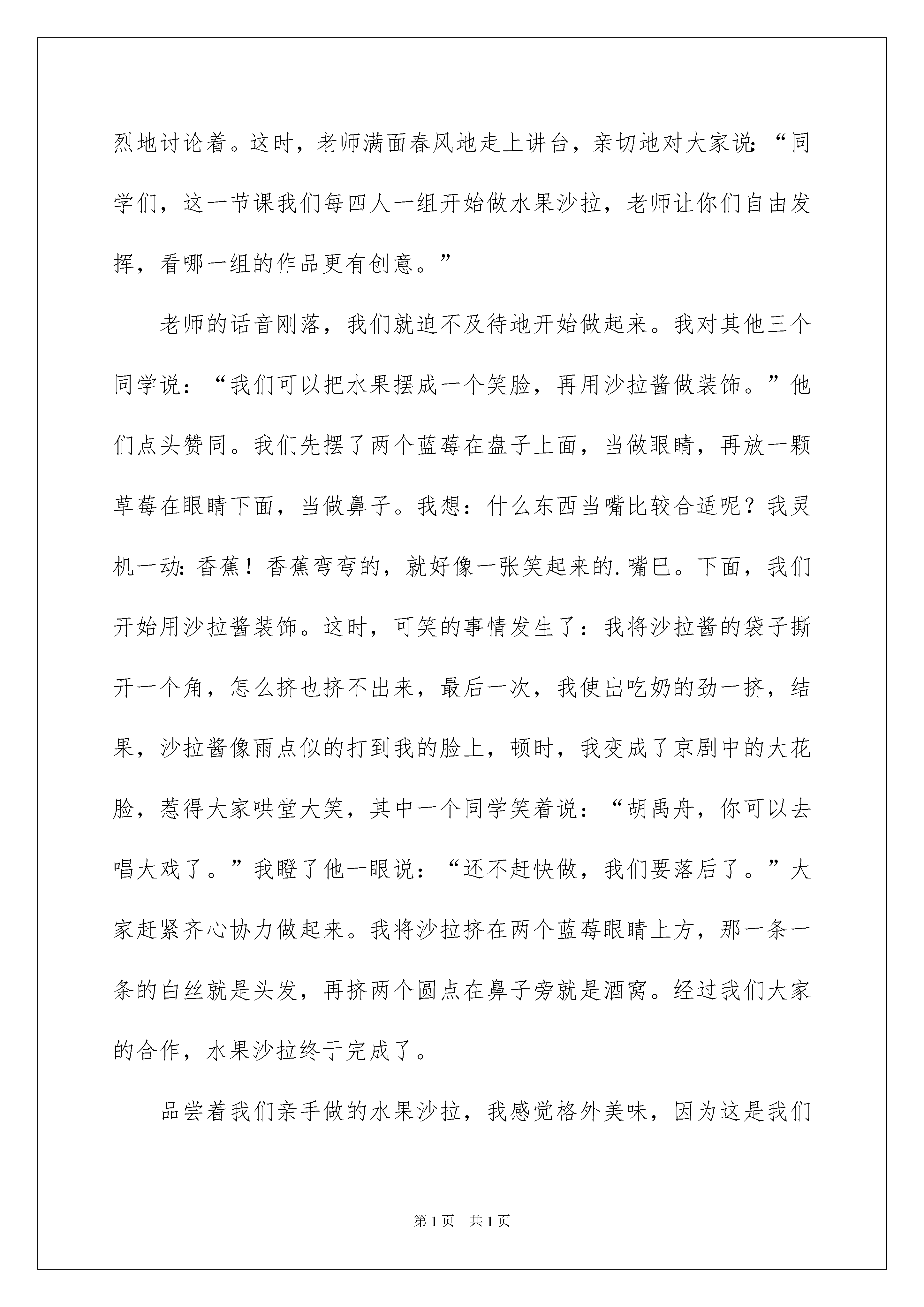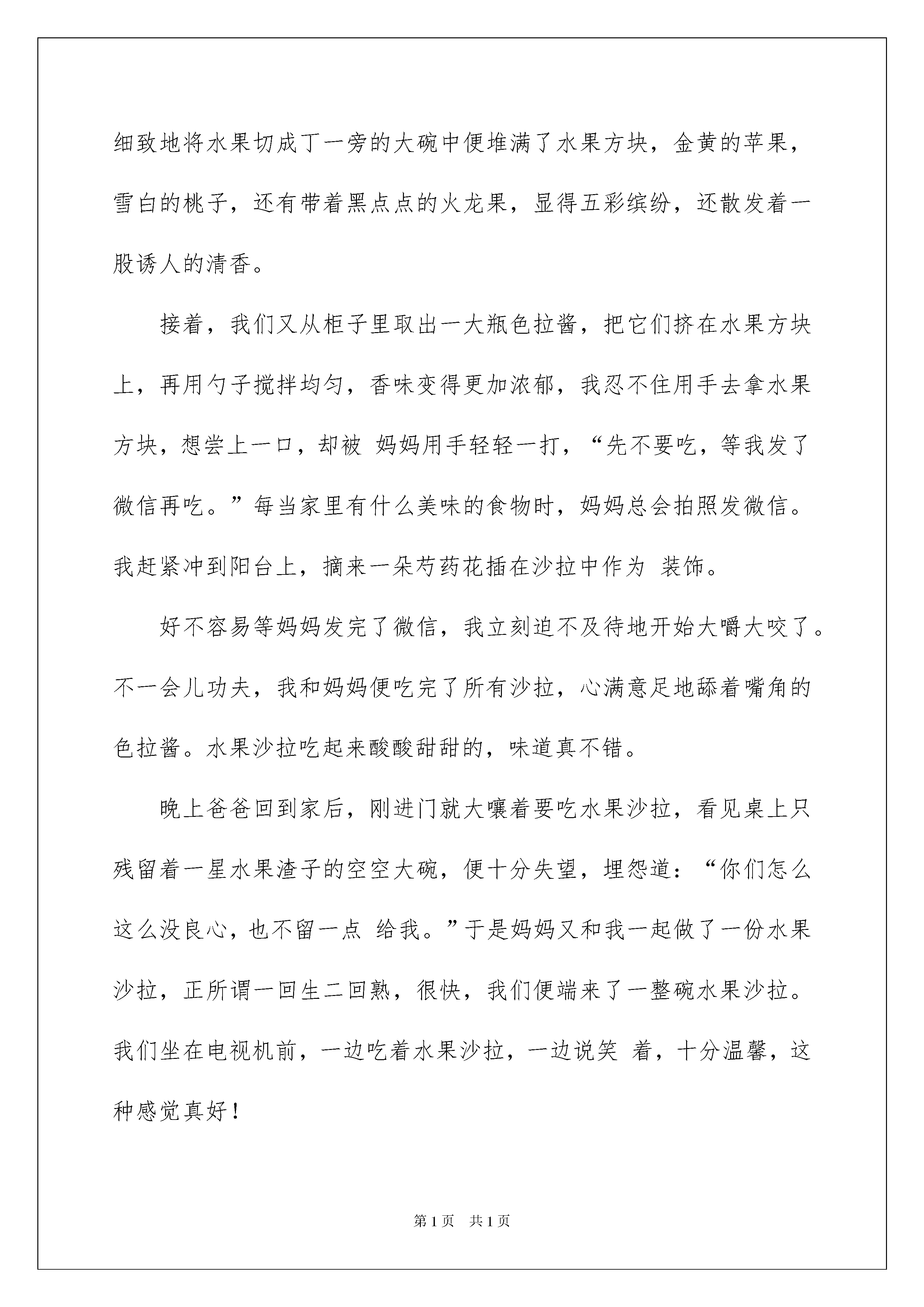 2022水果初一作文水果初一作文无论是身处学校还是步入社会,大家都经常接触到作文吧,借助作文可以提高我们的语言组织能力。你所见过的作文是什么样的呢?下面是我为大家收集的水果初一作文,欢迎阅读与收藏。水果初一作文1天气炎热,胃口不佳,又喜欢跟老妈宅在家里。一天下午,我突然心血来潮,想吃必胜客里的水果沙拉,妈妈说道:“这有什么难的,我做给你吃。”虽然还没开始做,可我已经在不断咽口水了,“那我们赶紧开始吧!”我兴奋地说道,话音未落,我便拉着妈妈冲向厨房。一打开冰箱,只发现了几个苹果,真扫兴。不过为了美味的水果沙拉,我和妈妈还是顶着头顶的烈日,下楼去附近的水果店买水果。经过千挑万选,我们终于挑出了几只不错的桃子,和一个红红的火龙果。回到家后,我和妈妈进行了明确的分工:我负责给水果削皮,妈妈负责给水果切块。我小心翼翼地用剥皮刀削着水果,妈妈也在一边细致地将水果切成丁一旁的大碗中便堆满了水果方块,金黄的苹果,雪白的桃子,还有带着黑点点的火龙果,显得五彩缤纷,还散发着一股诱人的清香。接着,我们又从柜子里取出一大瓶色拉酱,把它们挤在水果方块上,再用勺子搅拌均匀,香味变得更加浓郁,我忍不住用手去拿水果方块,想尝上一口,却被妈妈用手轻轻一打,“先不要吃,等我发了微信再吃。”每当家里有什么美味的食物时,妈妈总会拍照发微信。我赶紧冲到阳台上,摘来一朵芍药花插在沙拉中作为装饰。好不容易等妈妈发完了微信,我立刻迫不及待地开始大嚼大咬了。不一会儿功夫,我和妈妈便吃完了所有沙拉,心满意足地舔着嘴角的色拉酱。水果沙拉吃起来酸酸甜甜的,味道真不错。晚上爸爸回到家后,刚进门就大嚷着要吃水果沙拉,看见桌上只残留着一星水果渣子的空空大碗,便十分失望,埋怨道:“你们怎么这么没良心,也不留一点给我。”于是妈妈又和我一起做了一份水果沙拉,正所谓一回生二回熟,很快,我们便端来了一整碗水果沙拉。我们坐在电视机前,一边吃着水果沙拉,一边说笑着,十分温馨,这种感觉真好!水果初一作文2世界上有许许多多的水果,也有很多水果是我喜欢吃的,如:什么芒果啦,什么桔子啦,什么葡萄啦,什么草莓啦!个个我都觉得还挺不错的,不过,只有唯一一种水果我是超级的酷爱,那个水果就是……嗯!先不能说,先调调你为口,让你猜一猜!这个水果呀!外壳是红红的,坚硬的外壳如刺猬一样,你别看外壳硬梆梆的,吃到口里一咬,软软的果肉里喷出了充足的荔枝水,哎呀!糟了!说出来了!不过你们也应该已经猜出来了,这个水果就是荔枝。说来也挺奇怪的!我叫熊波莉,还爱吃荔枝,大家说是双“莉(荔)”合一,可能是名字里有一个莉,才爱吃荔枝,虽然不是同一个写法,可读音两个字可都是同样的!以前大家就说,我爱吃荔枝的起源是我的名字,以前嘛,就糊里糊涂的点点头,表示同意,那也就算了,过去了。可现在,他们说习惯了,太欺负人了!如果,我的名字里面没有莉,那我就不那么爱吃荔枝了!不对!不管我叫什么,我的口味终究是不会改变的,所以,我重申,我爱吃的水果的由来,跟我的名字没有一丁点关系,是因为荔枝是一种我发自内心的水果。把荔枝的皮儿一剥开,一滴荔枝水就滴到了我的手上,嘻嘻!有点儿丢人,我的口水同荔枝一同顺着我的手流了下去,剥完了皮儿之后,再轻轻地从核上弄下果肉,有一次,我忍不住口水,管它三七二十一我就把它往嘴里一扔,咬啊咬,“喀嚓!”一声,我还以为我的饿牙齿掉了呢!结果仔细一感受,荔枝里的核儿被我给咬破了,呵呵,这就是我吃荔枝时,干下的很傻的事情。每一次我吃荔枝,都可以熟练的剥下荔枝的壳儿,接着再从壳儿上弄下它的果肉,随后,一股冰冰的,香甜香甜的味道就流到了口中,这种冰凉冰凉,酸酸甜甜的味道,我可以用一个诗句来代替,那就是:“此果只应天上有,人间能尝几回闻“啊。呵呵,不瞒你说,我一直在控制着口水写着作文呢,口水就快要被自己说的话给引出来了!不是我馋,是我很爱吃荔枝!水果初一作文3在我的身上发生过许多令我难忘的事儿,最令我难忘的就是第一次做水果沙拉。“我带了香蕉。”“我带了苹果。”“我带了西瓜。”今天,老师要给我们上一节特殊的英语课——做水果沙拉。同学们正在兴高采烈地讨论着。这时,老师满面春风地走上讲台,亲切地对大家说:“同学们,这一节课我们每四人一组开始做水果沙拉,老师让你们自由发挥,看哪一组的作品更有创意。”老师的话音刚落,我们就迫不及待地开始做起来。我对其他三个同学说:“我们可以把水果摆成一个笑脸,再用沙拉酱做装饰。”他们点头赞同。我们先摆了两个蓝莓在盘子上面,当做眼睛,再放一颗草莓在眼睛下面,当做鼻子。我想:什么东西当嘴比较合适呢?我灵机一动:香蕉!香蕉弯弯的,就好像一张笑起来的.嘴巴。下面,我们开始