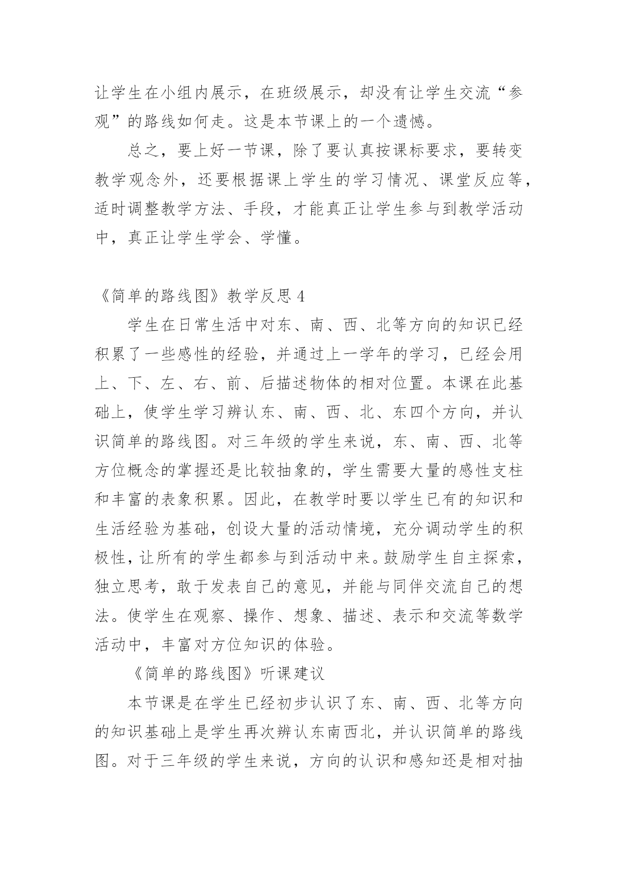 《简单的路线图》教学反思 《简单的路线图》教学反思身为一名人民老师,我们要在教学中快速成长,对学到的教学新方法,我们可以记录在教学反思中,那么优秀的教学反思是什么样的呢?以下是小编收集整理的《简单的路线图》教学反思,供大家参考借鉴,希望可以帮助到有需要的朋友。《简单的路线图》教学反思1“数学的知识,思维和方法必须经由学生在现实的数学实践活动中理解和发展,而不是单纯的依赖教师讲解去获取”。《数学课程标准》提倡的。这节课,要求学生认识简单的'路线,真的是认识这么简单吗?意义不在此,活学活用的数学才有意义,回想我们生活中很多事例,路线图的作用是逃生时,乘搭公交车时,参观时候会用到这些路线图。这些都是应用于实际的生活中才会用到的,因此学完了这节课后是否就完事嗯?不是的,应该让学生把这些知识运用在实际的生活中。这些课的知识点不多,学生掌握得也不错,如果能将这些知识延伸到实际生活中,让学生从亲身经历中体验这些有用的数学知识。《简单的路线图》教学反思2简单的路线图是第1单元位置与方向的第4课时。这部分内容要让我们综合应用8个方位知识解决问题。培养学生的空间观念,为第二学段继续学习确定位置打下基础。在三班上课的时候,大部分同学已经对之前学习过的8个方向非常明确。本节课解决问题的重点在于以哪个地方为出发点就以哪个地方为观测点画十字图。同学们在解决问题的过程当中,往往会混淆这一点。而且在授课的过程当中,我没有注重提高学生的兴趣,在学生给出多种路径和方案之后,没有引导学生找出最佳的方案。尤其是动物园导游图是与实际生活相连的,根据实际生活,如果我们去动物园游玩的话,我们肯定会按照自己的需求制定最佳的方案。这一点没有引导学生说出来。通过这节课的学习,可以让学生感受方向知识与现实生活的紧密联系,一方面可以调动学生已有的.生活经验,增强学生的学习兴趣,另一方面以实践活动为主展开学习活动,让学生在熟悉的情境中,在观察描述和交流中体验方位,有利于学生方位感的形成。在课堂中我应该鼓励学生独立思考,敢于发表自己的意见,并能与同伴交流自己的想法,使学生在多样的活动中进行观察操作想象描述表示和交流丰富对方为知识的体验,进一步发展良好的空间观念。《简单的路线图》教学反思3本节课是在学生认识了八个方位之后,结合这些方位再认识简单的路线图,并会用方位词描述行走路线。教育心理学研究表明:当学习材料与学生已有的知识和生活经验相联系时,学生对学习才会有兴趣。《数学课程标准》也指出:“要重视从学生的生活实践经验中学习数学和理解数学。”这就要求我们的数学教学不仅要从儿童的生活中提出数学问题,使学生产生兴趣,更好地理解数学,还必须结合现实生活中的实际问题,让学生用数学知识和数学的思维方法去看待、分析及解决实际问题。逐步培养学生用数学的眼光看待数学问题,认识数学与社会、生活的联系。因此,本节课,李老师就是以学生日常生活中可能出现的现象作为导入,将数学与生活自然地联系起来。但是在教学中,学生质疑和创新的欲望不高,在今后的教学中,要多加引导。学生在平面图上认识路线很准确,但在完成开放性作业时,却出现了不少问题,以后要加强锻炼学生的实践能力。使学生很好的把数学和实际生活联系起来,体会数学源于生活,也为生活服务。听第二课时教学反思本课主要是:让学生能辨认东南西北四个方向,知道地图上的东南西北四个方向。使学生会看简单的路线图,并能进行描述行走的路线。但“认识路线”这节课,总也感觉有很多令人不满意的地方。如,由于怕教学时间不够,所以,如“自己设计一条合理的参观路线”的'路线图。尽管学生都有去完成,但只让学生在小组内展示,在班级展示,却没有让学生交流“参观”的路线如何走。这是本节课上的一个遗憾。总之,要上好一节课,除了要认真按课标要求,要转变教学观念外,还要根据课上学生的学习情况、课堂反应等,适时调整教学方法、手段,才能真正让学生参与到教学活动中,真正让学生学会、学懂。《简单的路线图》教学反思4学生在日常生活中对东、南、西、北等方向的知识已经积累了一些感性的经验,并通过上一学年的学习,已经会用上、下、左、右、前、后描述物体的相对位置。本课在此基础上,使学生学习辨认东、南、西、北、东四个方向,并认识简单的路线图。对三年级的学生来说,东、南、西、北等方位概念的掌握还是比较抽象的,学生需要大量的感性支柱和丰富的表象积累。因此,在教学时要以学生已有的知识和生活经验为基础,创设大量的活动情境,充分调动学生的积极性,让所有的学生都参与到活动中来。鼓励学生自主探索,独立思考,敢于发表自己的意见,并能与同伴交流自己的想法。使学生在观察、操作、想象、描述、表示和交流等数学活动中,丰富对方位知识的体验。《简单的路线图》听课建议本节课是在学生已经初步认识了东、南、西、北等方向的知识基础上是学生再次辨认东南西北,并认识简单