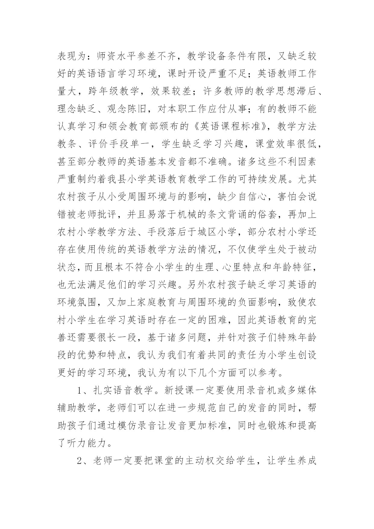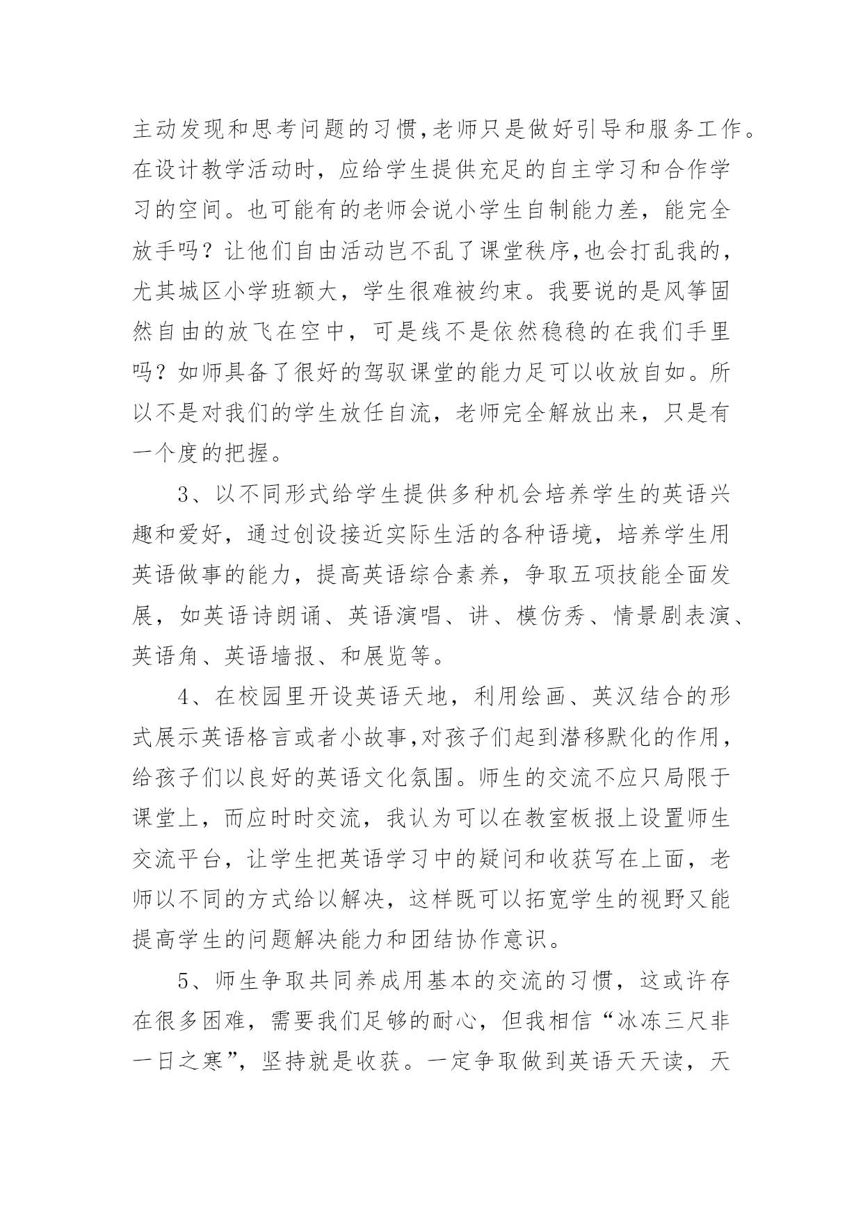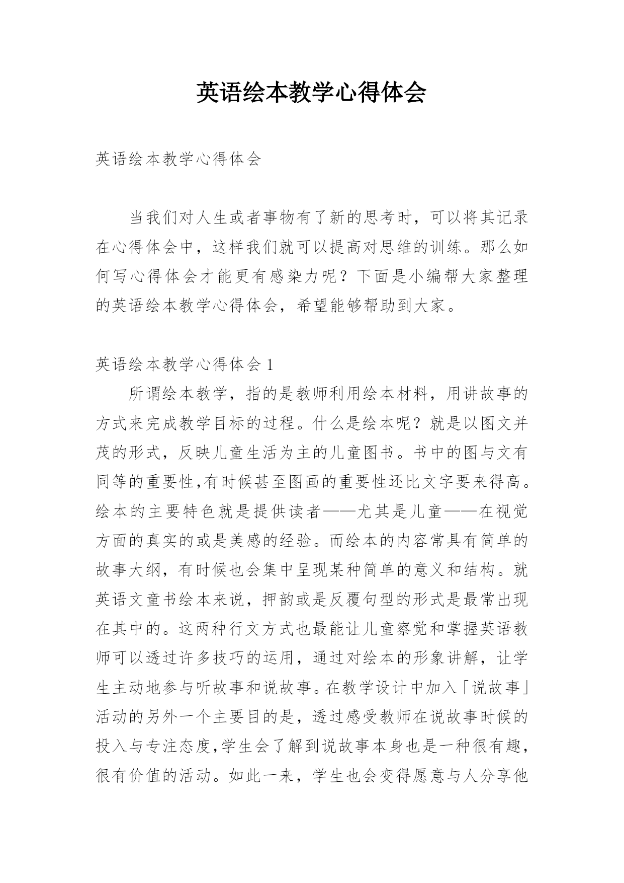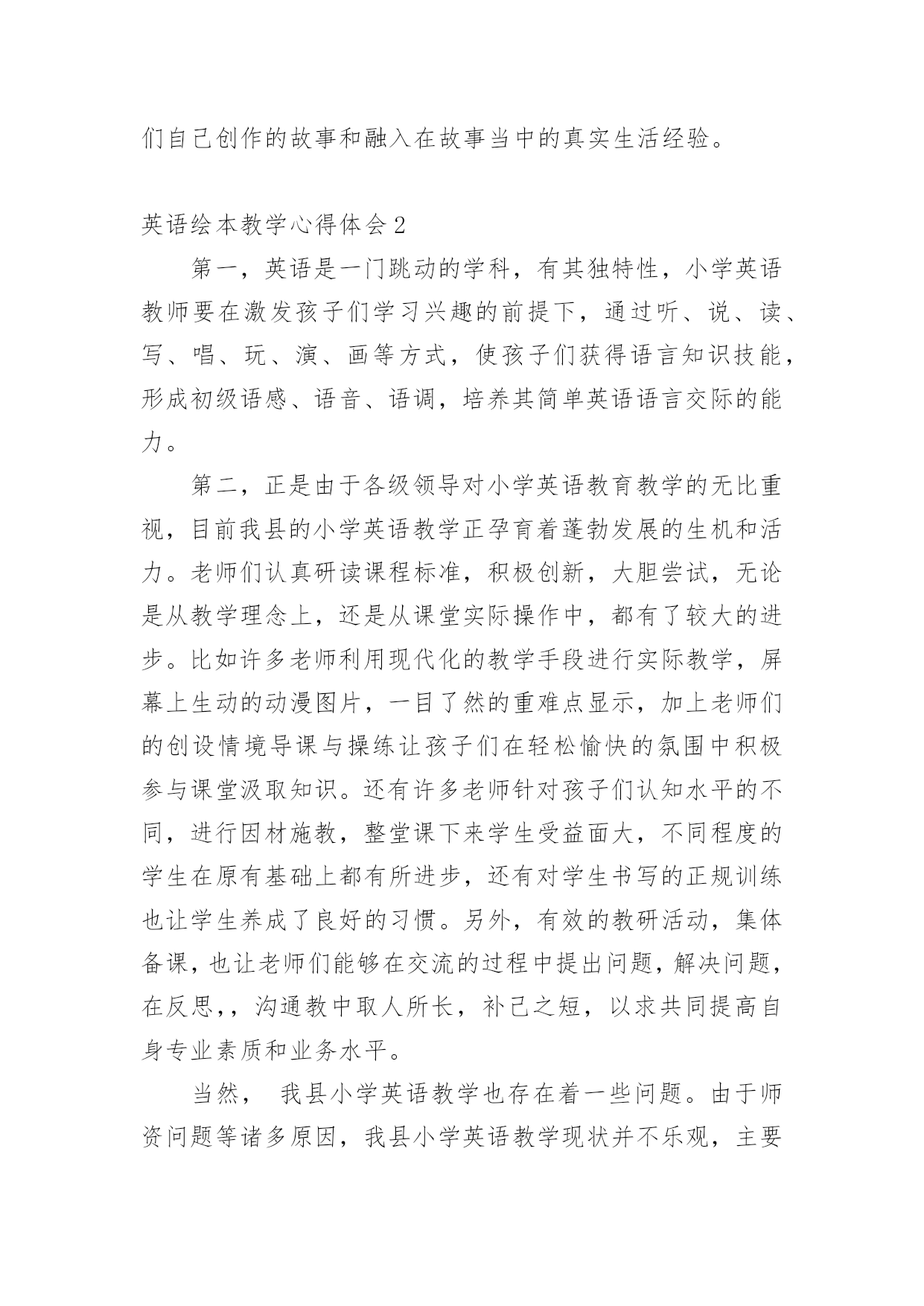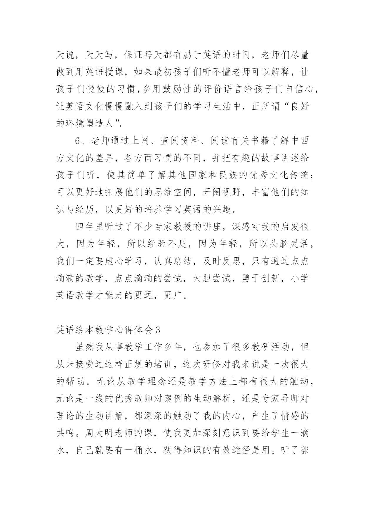 英语绘本教学心得体会 英语绘本教学心得体会当我们对人生或者事物有了新的思考时,可以将其记录在心得体会中,这样我们就可以提高对思维的训练。那么如何写心得体会才能更有感染力呢?下面是小编帮大家整理的英语绘本教学心得体会,希望能够帮助到大家。英语绘本教学心得体会1所谓绘本教学,指的是教师利用绘本材料,用讲故事的方式来完成教学目标的过程。什么是绘本呢?就是以图文并茂的形式,反映儿童生活为主的儿童图书。书中的图与文有同等的重要性,有时候甚至图画的重要性还比文字要来得高。绘本的主要特色就是提供读者——尤其是儿童——在视觉方面的真实的或是美感的经验。而绘本的内容常具有简单的故事大纲,有时候也会集中呈现某种简单的意义和结构。就英语文童书绘本来说,押韵或是反覆句型的形式是最常出现在其中的。这两种行文方式也最能让儿童察觉和掌握英语教师可以透过许多技巧的运用,通过对绘本的形象讲解,让学生主动地参与听故事和说故事。在教学设计中加入「说故事」活动的另外一个主要目的是,透过感受教师在说故事时候的投入与专注态度,学生会了解到说故事本身也是一种很有趣,很有价值的活动。如此一来,学生也会变得愿意与人分享他们自己创作的故事和融入在故事当中的真实生活经验。英语绘本教学心得体会2第一,英语是一门跳动的学科,有其独特性,小学英语教师要在激发孩子们学习兴趣的前提下,通过听、说、读、写、唱、玩、演、画等方式,使孩子们获得语言知识技能,形成初级语感、语音、语调,培养其简单英语语言交际的能力。第二,正是由于各级领导对小学英语教育教学的无比重视,目前我县的小学英语教学正孕育着蓬勃发展的生机和活力。老师们认真研读课程标准,积极创新,大胆尝试,无论是从教学理念上,还是从课堂实际操作中,都有了较大的进步。比如许多老师利用现代化的教学手段进行实际教学,屏幕上生动的动漫图片,一目了然的重难点显示,加上老师们的创设情境导课与操练让孩子们在轻松愉快的氛围中积极参与课堂汲取知识。还有许多老师针对孩子们认知水平的不同,进行因材施教,整堂课下来学生受益面大,不同程度的学生在原有基础上都有所进步,还有对学生书写的正规训练也让学生养成了良好的习惯。另外,有效的教研活动,集体备课,也让老师们能够在交流的过程中提出问题,解决问题,在反思,,沟通教中取人所长,补己之短,以求共同提高自身专业素质和业务水平。当然,我县小学英语教学也存在着一些问题。由于师资问题等诸多原因,我县小学英语教学现状并不乐观,主要表现为:师资水平参差不齐,教学设备条件有限,又缺乏较好的英语语言学习环境,课时开设严重不足;英语教师工作量大,跨年级教学,效果较差;许多教师的教学思想滞后、理念缺乏、观念陈旧,对本职工作应付从事;有的教师不能认真学习和领会教育部颁布的《英语课程标准》,教学方法教条、评价手段单一,学生缺乏学习兴趣,课堂效率很低,甚至部分教师的英语基本发音都不准确。诸多这些不利因素严重制约着我县小学英语教育教学工作的可持续发展。尤其农村孩子从小受周围环境与的影响,缺少自信心,害怕会说错被老师批评,并且易落于机械的条文背诵的俗套,再加上农村小学教学方法、手段落后于城区小学,部分农村小学还存在使用传统的英语教学方法的情况,不仅使学生处于被动状态,而且根本不符合小学生的生理、心里特点和年龄特征,也无法满足他们的学习兴趣。另外农村孩子缺乏学习英语的环境氛围,又加上家庭教育与周围环境的负面影响,致使农村小学生在学习英语时存在一定的困难,因此英语教育的完善还需要很长一段,基于诸多问题,并针对孩子们特殊年龄段的优势和特点,我认为我们有着共同的责任为小学生创设更好的学习环境,我认为有以下几个方面可以参考。1、扎实语音教学。新授课一定要使用录音机或多媒体辅助教学,老师们可以在进一步规范自己的发音的同时,帮助孩子们通过模仿录音让发音更加标准,同时也锻炼和提高了听力能力。2、老师一定要把课堂的主动权交给学生,让学生养成主动发现和思考问题的习惯,老师只是做好引导和服务工作。在设计教学活动时,应给学生提供充足的自主学习和合作学习的空间。也可能有的老师会说小学生自制能力差,能完全放手吗?让他们自由活动岂不乱了课堂秩序,也会打乱我的,尤其城区小学班额大,学生很难被约束。我要说的是风筝固然自由的放飞在空中,可是线不是依然稳稳的在我们手里吗?如师具备了很好的驾驭课堂的能力足可以收放自如。所以不是对我们的学生放任自流,老师完全解放出来,只是有一个度的把握。3、以不同形式给学生提供多种机会培养学生的英语兴趣和爱好,通过创设接近实际生活的各种语境,培养学生用英语做事的能力,提高英语综合素养,争取五项技能全面发展,如英语诗朗诵、英语演唱、讲、模仿秀、情景剧表演、英语角、英语墙报、和展览等。4、在校园里开设英语天地,利用绘画、英汉结合的形式展示英语格言或者小故事,对孩子们