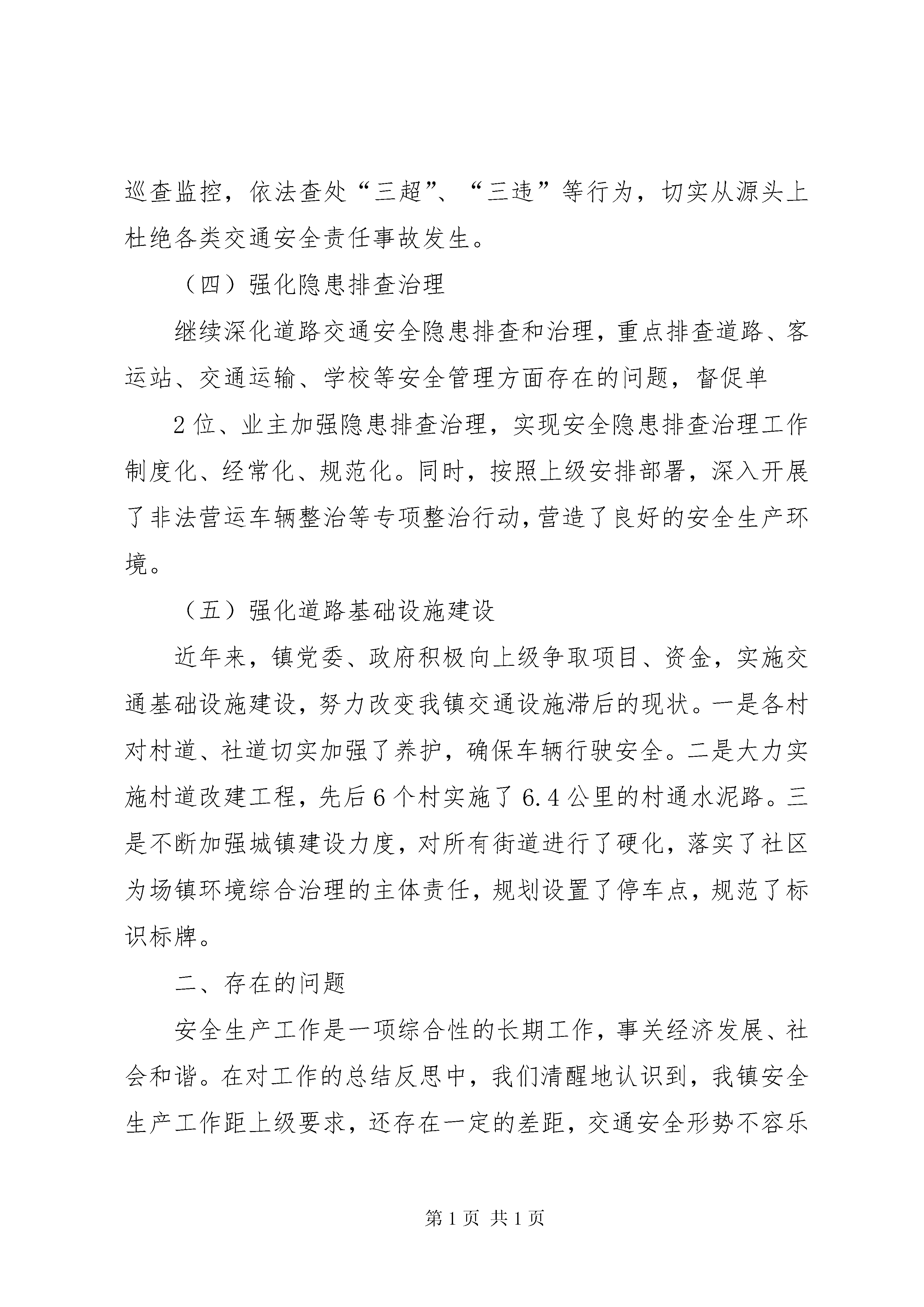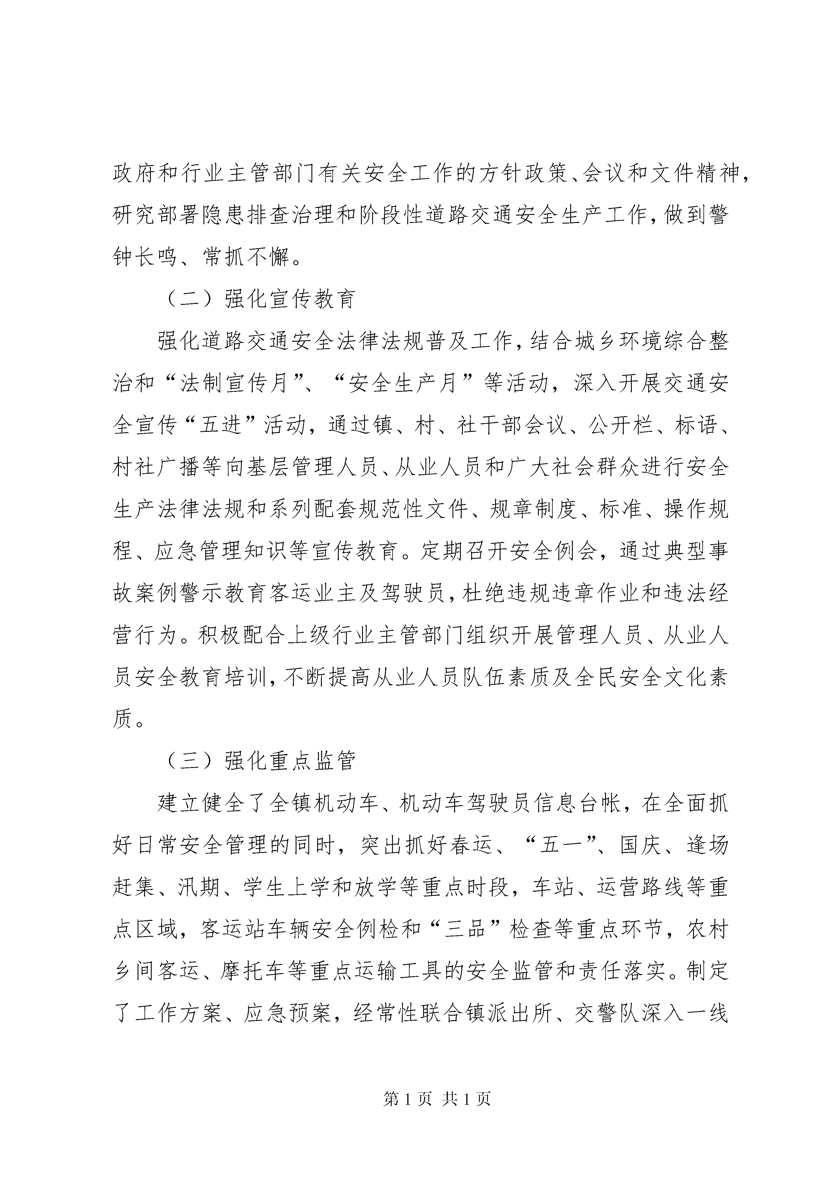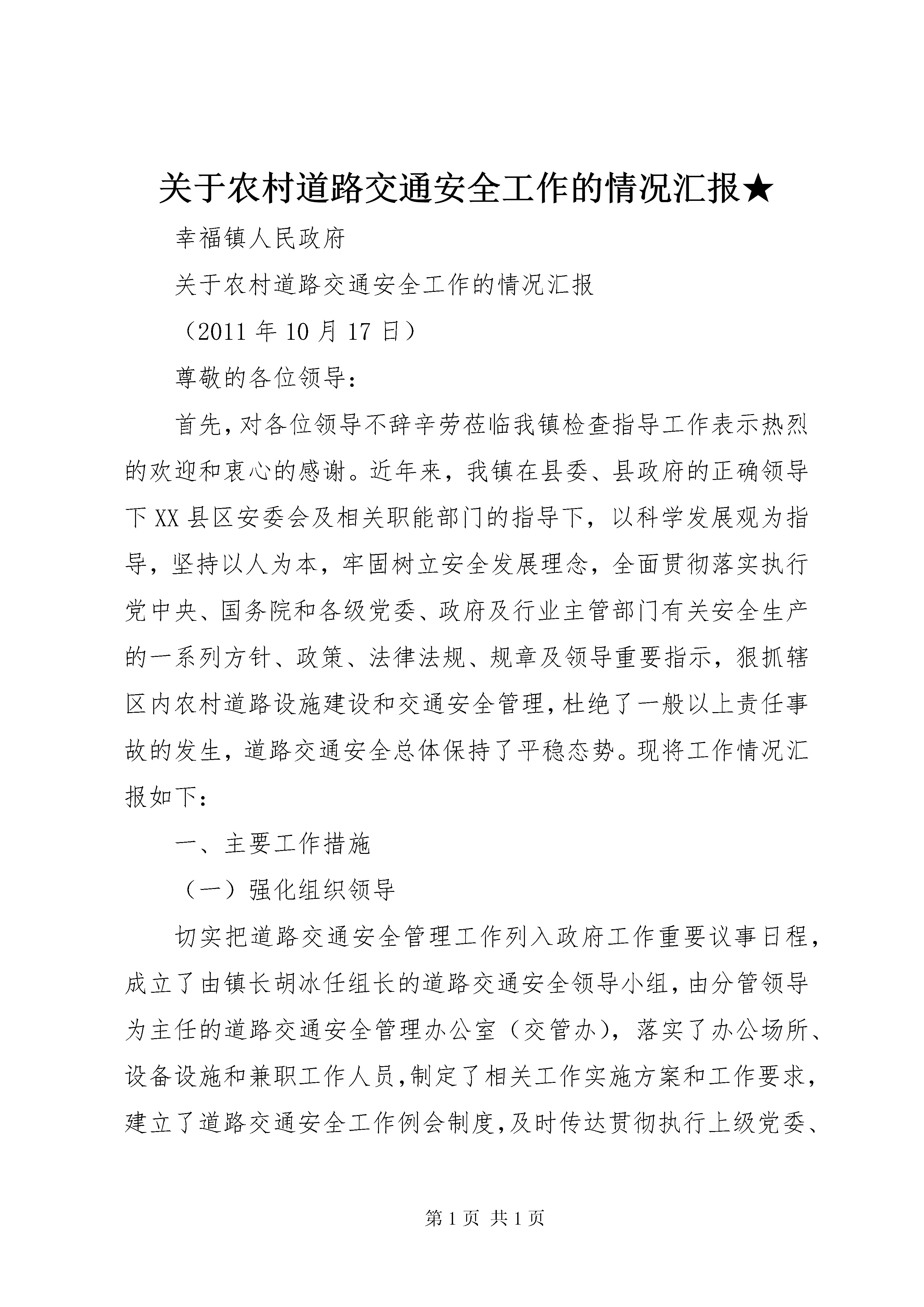 关于农村道路交通安全工作的情况汇报★幸福镇人民政府关于农村道路交通安全工作的情况汇报(2011年10月17日)尊敬的各位领导:首先,对各位领导不辞辛劳莅临我镇检查指导工作表示热烈的欢迎和衷心的感谢。近年来,我镇在县委、县政府的正确领导下XX县区安委会及相关职能部门的指导下,以科学发展观为指导,坚持以人为本,牢固树立安全发展理念,全面贯彻落实执行党中央、国务院和各级党委、政府及行业主管部门有关安全生产的一系列方针、政策、法律法规、规章及领导重要指示,狠抓辖区内农村道路设施建设和交通安全管理,杜绝了一般以上责任事故的发生,道路交通安全总体保持了平稳态势。现将工作情况汇报如下:一、主要工作措施(一)强化组织领导切实把道路交通安全管理工作列入政府工作重要议事日程,成立了由镇长胡冰任组长的道路交通安全领导小组,由分管领导为主任的道路交通安全管理办公室(交管办),落实了办公场所、设备设施和兼职工作人员,制定了相关工作实施方案和工作要求,建立了道路交通安全工作例会制度,及时传达贯彻执行上级党委、政府和行业主管部门有关安全工作的方针政策、会议和文件精神,研究部署隐患排查治理和阶段性道路交通安全生产工作,做到警钟长鸣、常抓不懈。(二)强化宣传教育强化道路交通安全法律法规普及工作,结合城乡环境综合整治和“法制宣传月”、“安全生产月”等活动,深入开展交通安全宣传“五进”活动,通过镇、村、社干部会议、公开栏、标语、村社广播等向基层管理人员、从业人员和广大社会群众进行安全生产法律法规和系列配套规范性文件、规章制度、标准、操作规程、应急管理知识等宣传教育。定期召开安全例会,通过典型事故案例警示教育客运业主及驾驶员,杜绝违规违章作业和违法经营行为。积极配合上级行业主管部门组织开展管理人员、从业人员安全教育培训,不断提高从业人员队伍素质及全民安全文化素质。(三)强化重点监管建立健全了全镇机动车、机动车驾驶员信息台帐,在全面抓好日常安全管理的同时,突出抓好春运、“五一”、国庆、逢场赶集、汛期、学生上学和放学等重点时段,车站、运营路线等重点区域,客运站车辆安全例检和“三品”检查等重点环节,农村乡间客运、摩托车等重点运输工具的安全监管和责任落实。制定了工作方案、应急预案,经常性联合镇派出所、交警队深入一线巡查监控,依法查处“三超”、“三违”等行为,切实从源头上杜绝各类交通安全责任事故发生。(四)强化隐患排查治理继续深化道路交通安全隐患排查和治理,重点排查道路、客运站、交通运输、学校等安全管理方面存在的问题,督促单2位、业主加强隐患排查治理,实现安全隐患排查治理工作制度化、经常化、规范化。同时,按照上级安排部署,深入开展了非法营运车辆整治等专项整治行动,营造了良好的安全生产环境。(五)强化道路基础设施建设近年来,镇党委、政府积极向上级争取项目、资金,实施交通基础设施建设,努力改变我镇交通设施滞后的现状。一是各村对村道、社道切实加强了养护,确保车辆行驶安全。二是大力实施村道改建工程,先后6个村实施了6.4公里的村通水泥路。三是不断加强城镇建设力度,对所有街道进行了硬化,落实了社区为场镇环境综合治理的主体责任,规划设置了停车点,规范了标识标牌。二、存在的问题安全生产工作是一项综合性的长期工作,事关经济发展、社会和谐。在对工作的总结反思中,我们清醒地认识到,我镇安全生产工作距上级要求,还存在一定的差距,交通安全形势不容乐观。一是目前我镇境内村庄道路状况差,大部分道路等级低,路窄、弯多、坡陡,且缺乏配套的安全设施,容易诱发和造成事故。二是车辆营运者的法制观念和交通安全意识淡薄,交通安全警惕性差,超速行驶、客运车辆超员和低速载货汽车、拖拉机、摩托车违法载人等交通违法行为屡禁不止。三是村级客运市场发展缓慢,群众乘车难、出行难的问题还将继续存在,导致群众出行乘坐低速载货汽车、拖拉机、摩托车的现象突出。3四是安全管理队伍力量不足,安全管控覆盖面受限。在今后的工作中,我镇将继续加强对安全生产工作的领导,加强农村道路交通安全责任制的落实,进一步加大交通安全宣传力度,加大道路基础设施建设,加强与各职能部门的相互配合,推进交通安全管理社会化进程,努力推进我镇平安创建工作,维护社会和谐稳定。二○一一年十月十七日