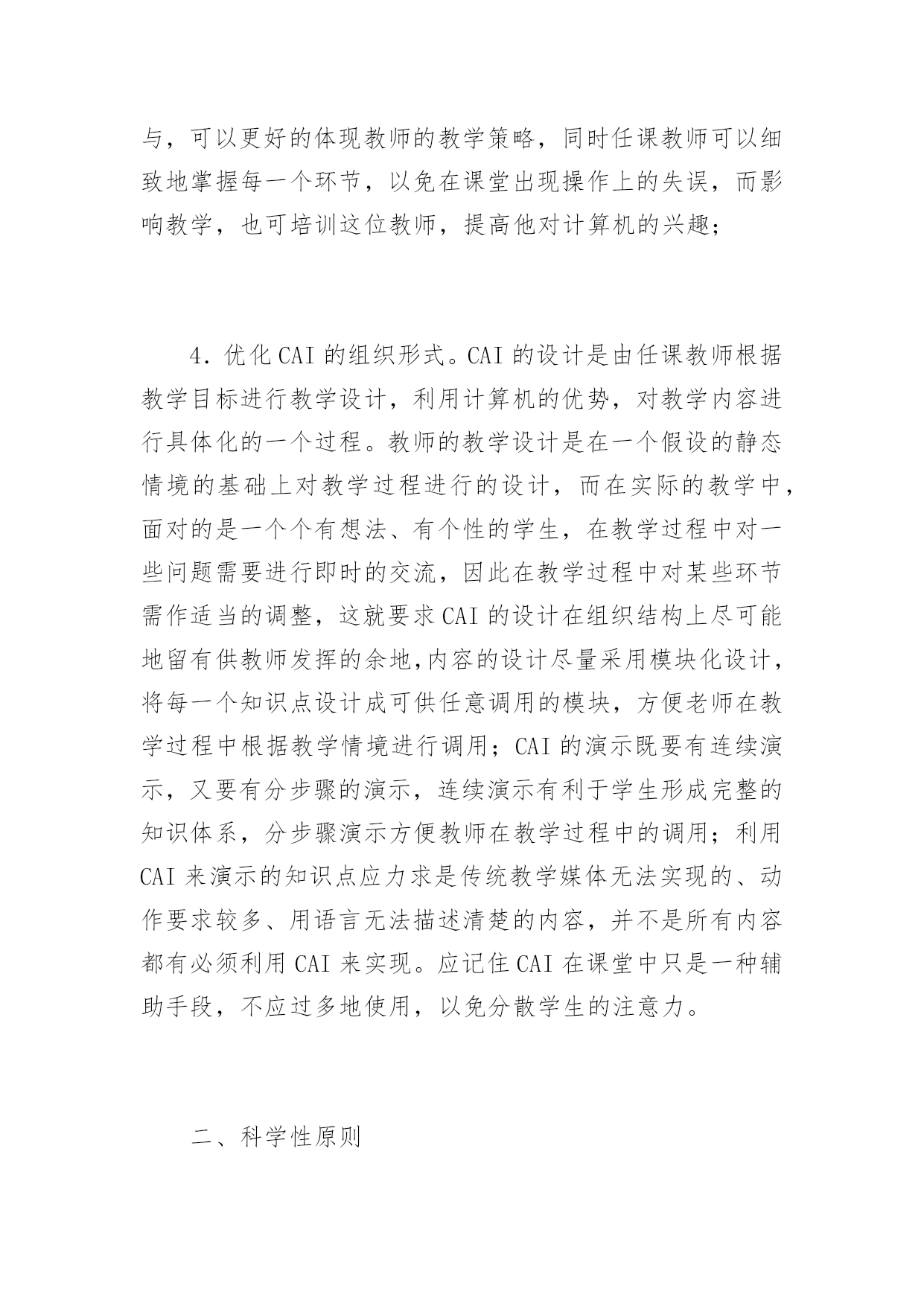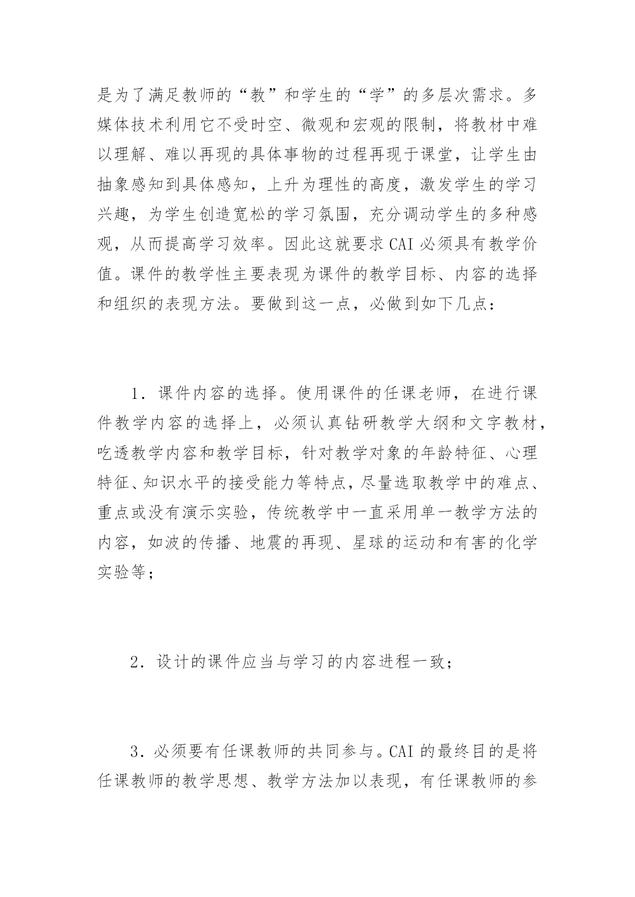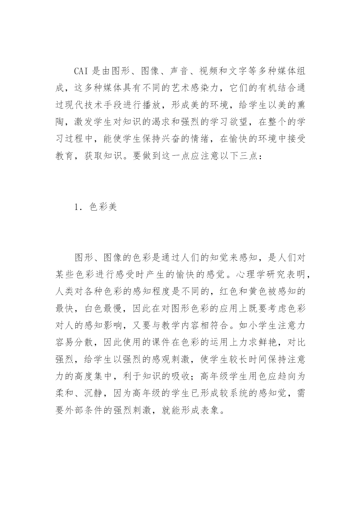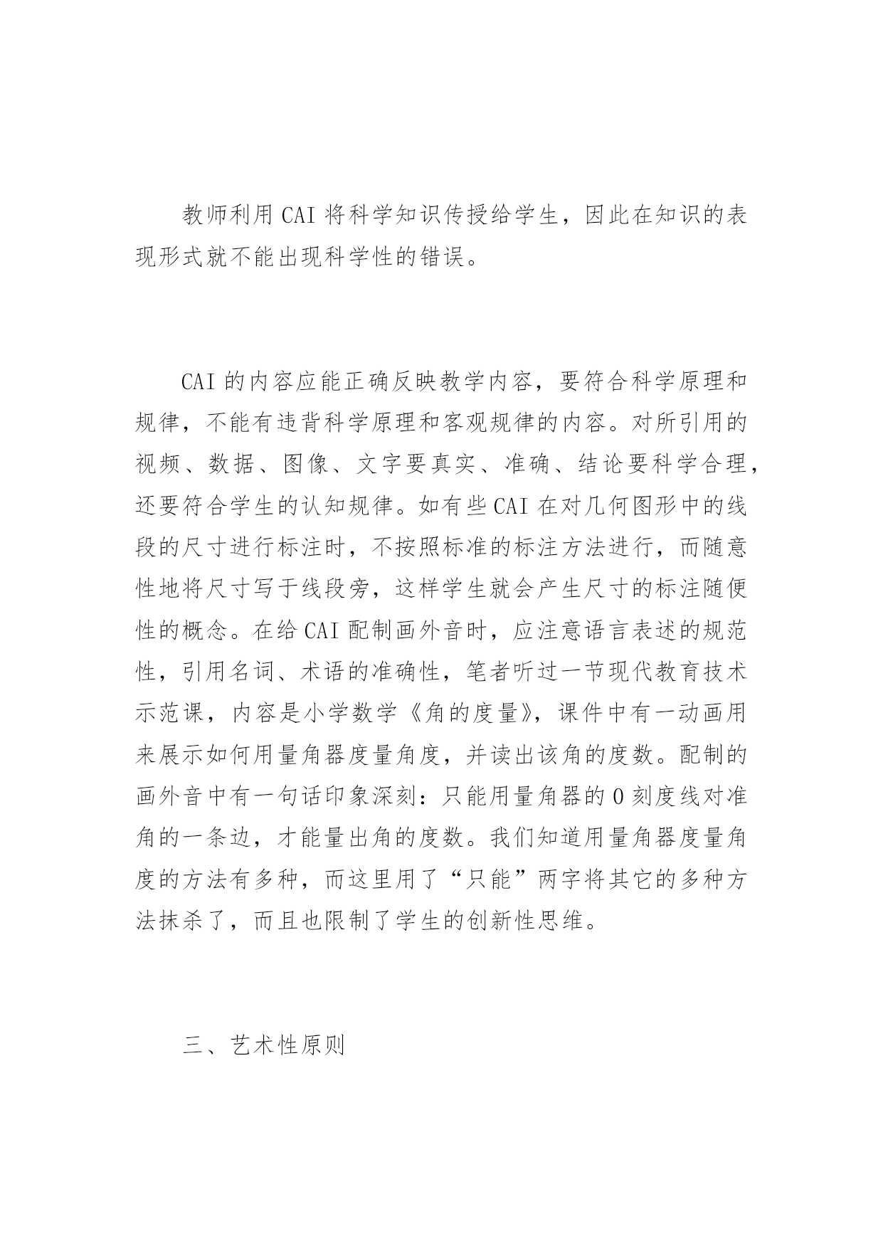 CAI设计中应注意的若干问题 CAI设计中应注意的若干问题随着信息技术在教育中的广泛应用,计算机辅助教学软件(简称CAI)也层出不穷,呈现百花齐放的局面。但目前市场上流行的CAI并没有被广大教师和学生所接受。究其原因,现有的CAI大部分都是由软件开发商牵头结合若干特级教师进行设计,以光盘形式承载,出于商业利益全部加密处理。这些CAI虽然体现了某些特级教师的教学思想和教学策略,但这些教学方法和策略是教师根据教学目标模拟出静态的教学情境而设计的,而具体的使用者面对的是一个动态的有诸多不确定因素的教学情境,由于CAI的“封闭性”,使用者无法将自己的教育思想,结合动态的教学环境加以体现,因此无法实现理想的教学效果。根据课堂教学的特点,笔者认为CAI的设计必须注意以下五点。一、CAI应符合教材的需要,具有明确的教学性教师利用课件进行教学是为了解决传统教学媒体无法再现以及较难解决的教学难点和重点;是为了优化教学结构,突出以学生为主体,教师为主导的个别化教学、合作化教学;是为了满足教师的“教”和学生的“学”的多层次需求。多媒体技术利用它不受时空、微观和宏观的限制,将教材中难以理解、难以再现的具体事物的过程再现于课堂,让学生由抽象感知到具体感知,上升为理性的高度,激发学生的学习兴趣,为学生创造宽松的学习氛围,充分调动学生的多种感观,从而提高学习效率。因此这就要求CAI必须具有教学价值。课件的教学性主要表现为课件的教学目标、内容的选择和组织的表现方法。要做到这一点,必做到如下几点:1.课件内容的选择。使用课件的任课老师,在进行课件教学内容的选择上,必须认真钻研教学大纲和文字教材,吃透教学内容和教学目标,针对教学对象的年龄特征、心理特征、知识水平的接受能力等特点,尽量选取教学中的难点、重点或没有演示实验,传统教学中一直采用单一教学方法的内容,如波的传播、地震的再现、星球的运动和有害的化学实验等;2.设计的课件应当与学习的内容进程一致;3.必须要有任课教师的共同参与。CAI的最终目的是将任课教师的教学思想、教学方法加以表现,有任课教师的参与,可以更好的体现教师的教学策略,同时任课教师可以细致地掌握每一个环节,以免在课堂出现操作上的失误,而影响教学,也可培训这位教师,提高他对计算机的兴趣;4.优化CAI的组织形式。CAI的设计是由任课教师根据教学目标进行教学设计,利用计算机的优势,对教学内容进行具体化的一个过程。教师的教学设计是在一个假设的静态情境的基础上对教学过程进行的设计,而在实际的教学中,面对的是一个个有想法、有个性的学生,在教学过程中对一些问题需要进行即时的交流,因此在教学过程中对某些环节需作适当的调整,这就要求CAI的设计在组织结构上尽可能地留有供教师发挥的余地,内容的设计尽量采用模块化设计,将每一个知识点设计成可供任意调用的模块,方便老师在教学过程中根据教学情境进行调用;CAI的演示既要有连续演示,又要有分步骤的演示,连续演示有利于学生形成完整的知识体系,分步骤演示方便教师在教学过程中的调用;利用CAI来演示的知识点应力求是传统教学媒体无法实现的、动作要求较多、用语言无法描述清楚的内容,并不是所有内容都有必须利用CAI来实现。应记住CAI在课堂中只是一种辅助手段,不应过多地使用,以免分散学生的注意力。二、科学性原则教师利用CAI将科学知识传授给学生,因此在知识的表现形式就不能出现科学性的错误。CAI的内容应能正确反映教学内容,要符合科学原理和规律,不能有违背科学原理和客观规律的内容。对所引用的视频、数据、图像、文字要真实、准确、结论要科学合理,还要符合学生的认知规律。如有些CAI在对几何图形中的线段的尺寸进行标注时,不按照标准的标注方法进行,而随意性地将尺寸写于线段旁,这样学生就会产生尺寸的标注随便性的概念。在给CAI配制画外音时,应注意语言表述的规范性,引用名词、术语的准确性,笔者听过一节现代教育技术示范课,内容是小学数学《角的度量》,课件中有一动画用来展示如何用量角器度量角度,并读出该角的度数。配制的画外音中有一句话印象深刻:只能用量角器的0刻度线对准角的一条边,才能量出角的度数。我们知道用量角器度量角度的方法有多种,而这里用了“只能”两字将其它的多种方法抹杀了,而且也限制了学生的创新性思维。三、艺术性原则CAI是由图形、图像、声音、视频和文字等多种媒体组成,这多种媒体具有不同的艺术感染力,它们的有机结合通过现代技术手段进行播放,形成美的环境,给学生以美的熏陶,激发学生对知识的渴求和强烈的学习欲望,在整个的学习过程中,能使学生保持兴奋的情绪,在愉快的环境中接受教育,获取知识。要做到这一点应注意以下三点:1.色彩美图形、图像的色彩是通过人们的知觉来感知,是人们对某些色彩进行感受时产生的愉快的感觉。心理学研究表明,人类对各种色彩的感知程