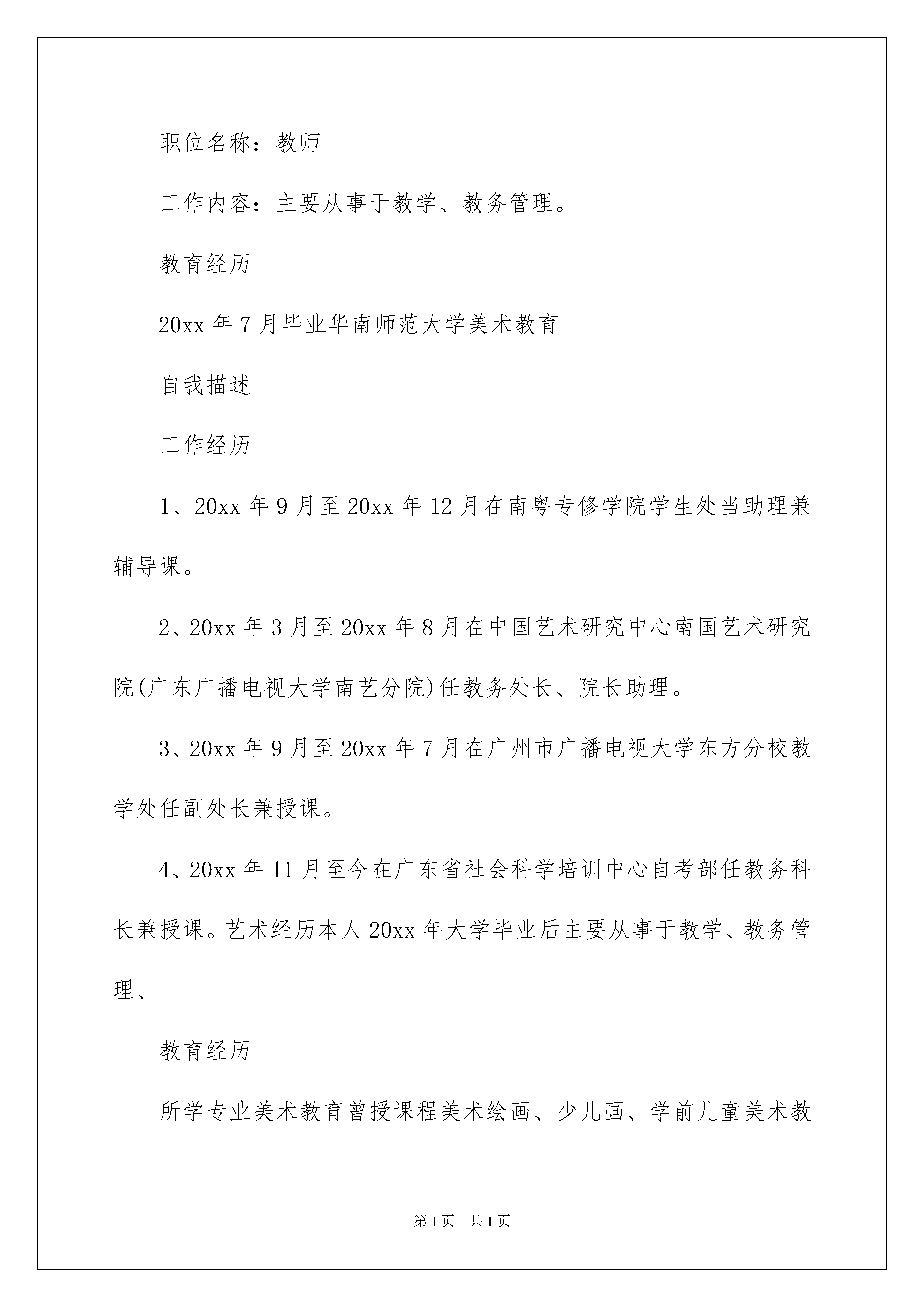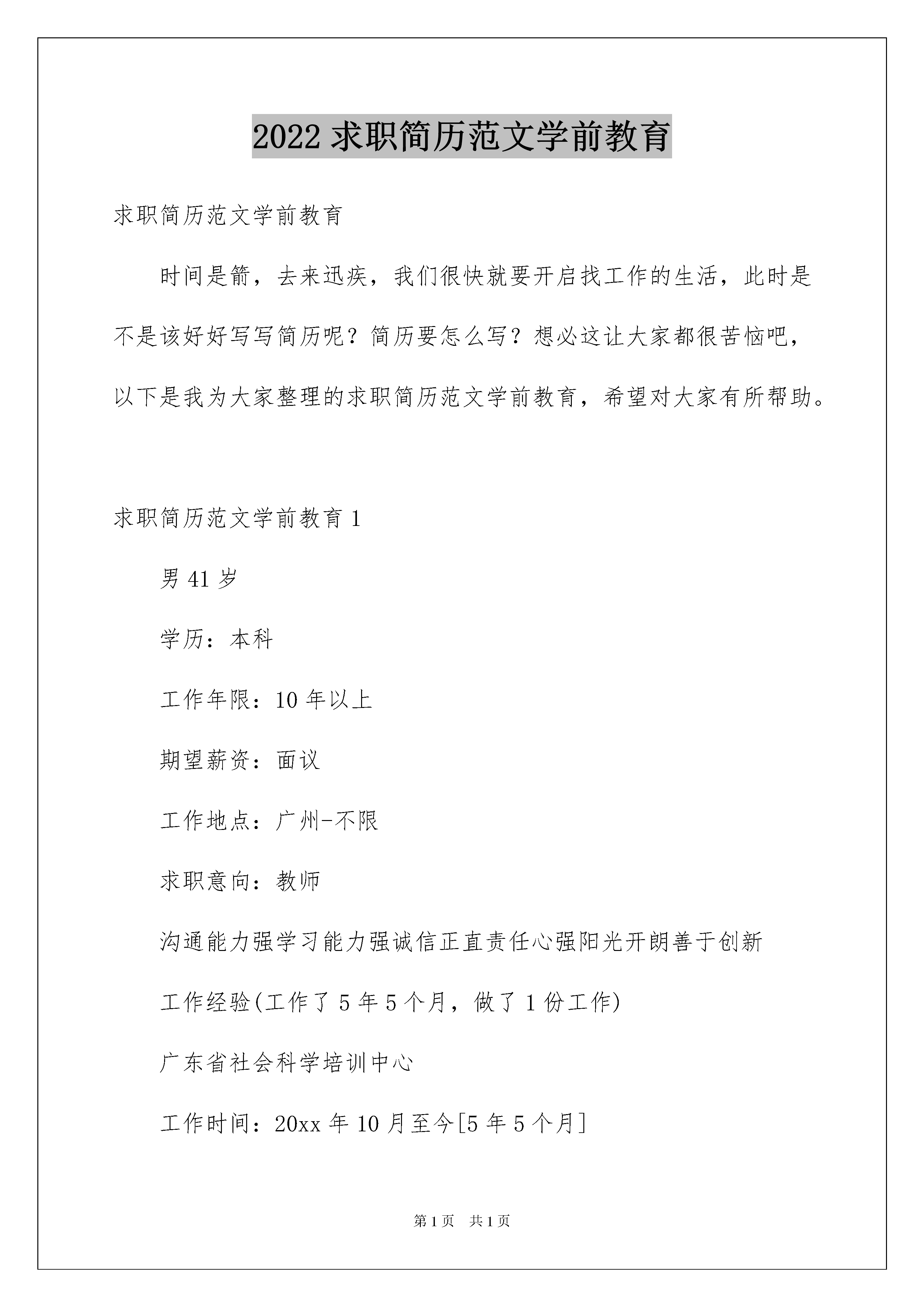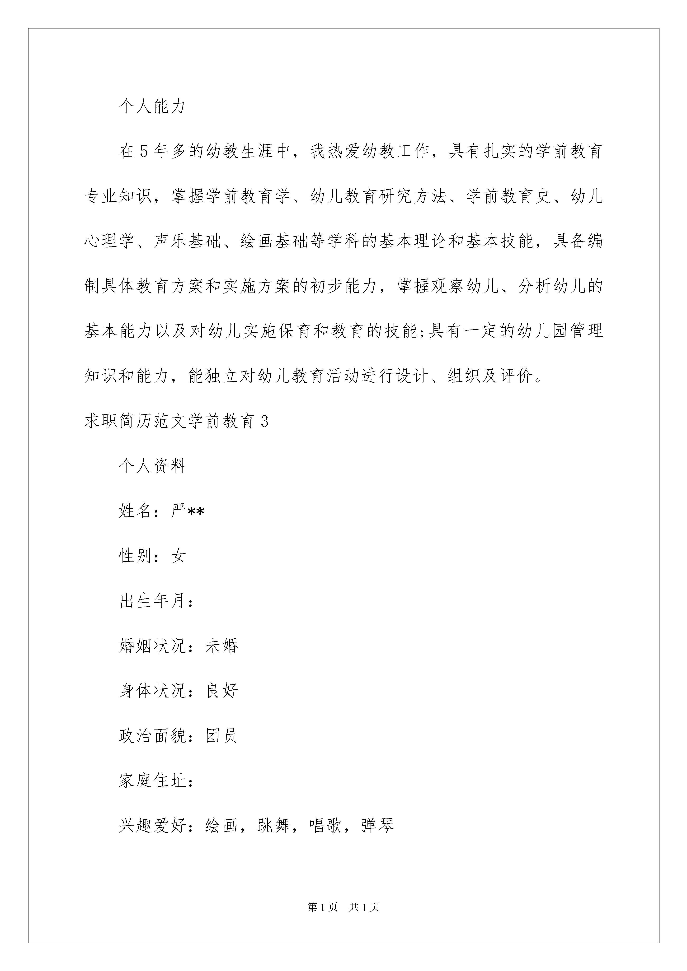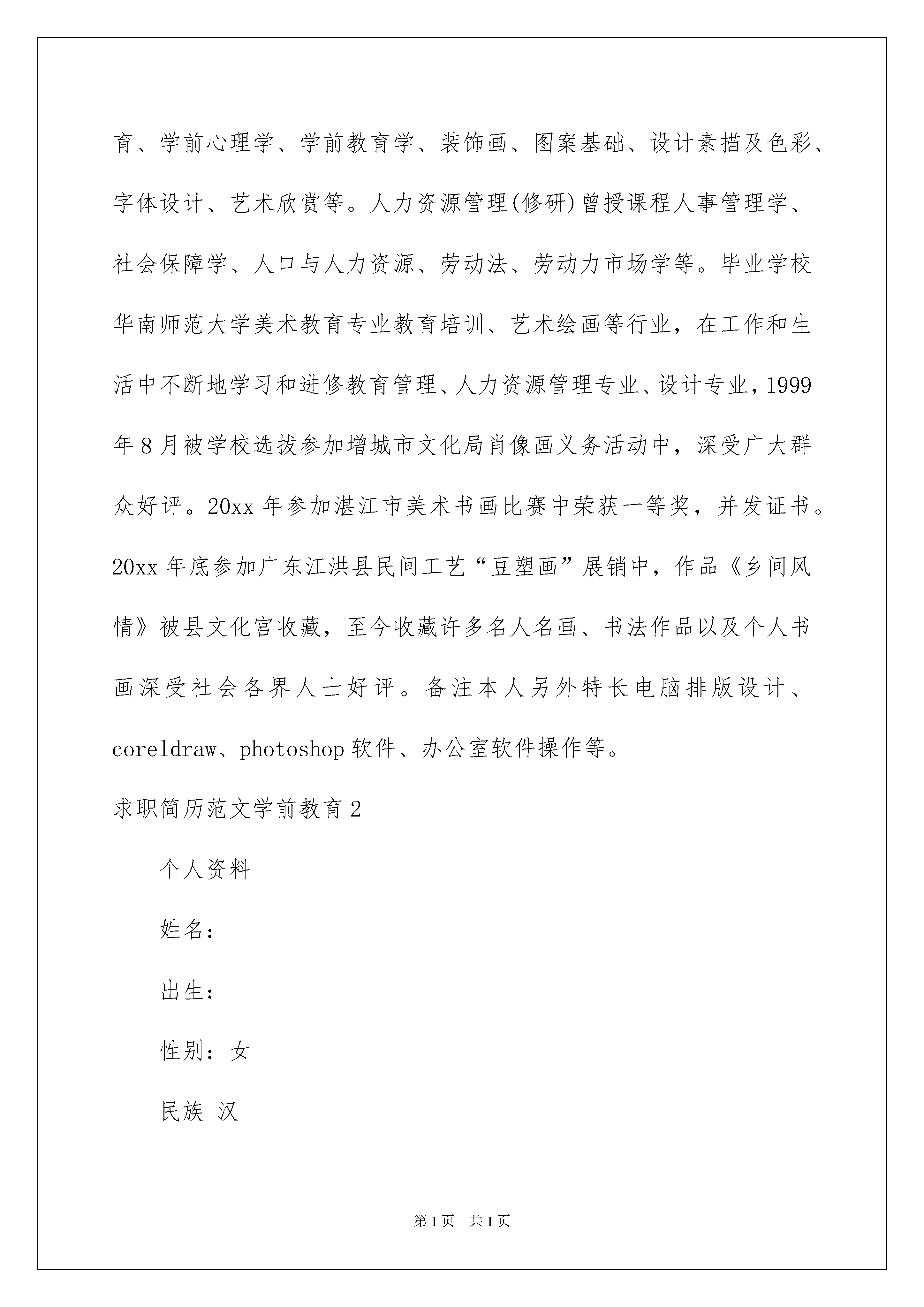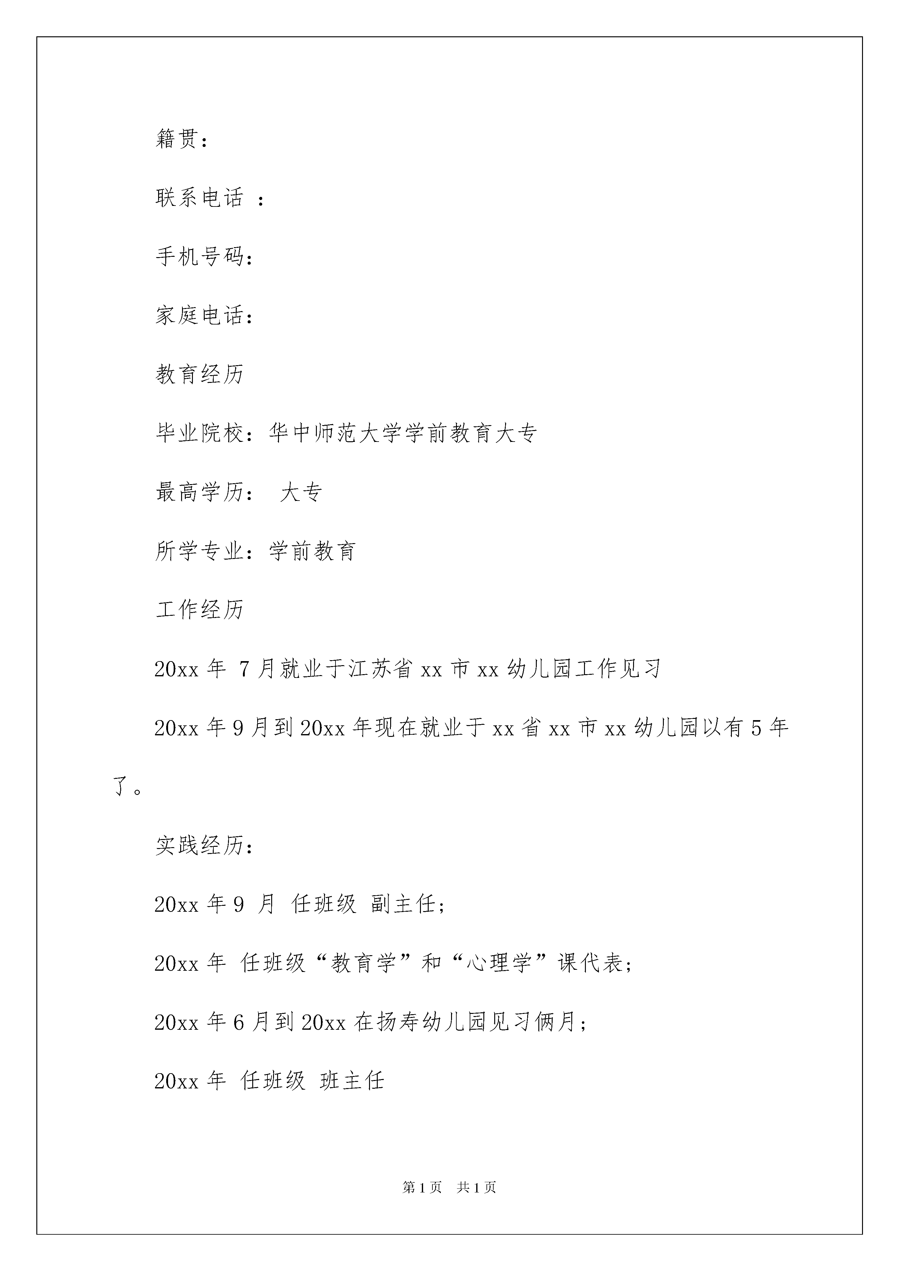 2022求职简历范文学前教育求职简历范文学前教育时间是箭,去来迅疾,我们很快就要开启找工作的生活,此时是不是该好好写写简历呢?简历要怎么写?想必这让大家都很苦恼吧,以下是我为大家整理的求职简历范文学前教育,希望对大家有所帮助。求职简历范文学前教育1男41岁学历:本科工作年限:10年以上期望薪资:面议工作地点:广州-不限求职意向:教师沟通能力强学习能力强诚信正直责任心强阳光开朗善于创新工作经验(工作了5年5个月,做了1份工作)广东省社会科学培训中心工作时间:20xx年10月至今[5年5个月]职位名称:教师工作内容:主要从事于教学、教务管理。教育经历20xx年7月毕业华南师范大学美术教育自我描述工作经历1、20xx年9月至20xx年12月在南粤专修学院学生处当助理兼辅导课。2、20xx年3月至20xx年8月在中国艺术研究中心南国艺术研究院(广东广播电视大学南艺分院)任教务处长、院长助理。3、20xx年9月至20xx年7月在广州市广播电视大学东方分校教学处任副处长兼授课。4、20xx年11月至今在广东省社会科学培训中心自考部任教务科长兼授课。艺术经历本人20xx年大学毕业后主要从事于教学、教务管理、教育经历所学专业美术教育曾授课程美术绘画、少儿画、学前儿童美术教育、学前心理学、学前教育学、装饰画、图案基础、设计素描及色彩、字体设计、艺术欣赏等。人力资源管理(修研)曾授课程人事管理学、社会保障学、人口与人力资源、劳动法、劳动力市场学等。毕业学校华南师范大学美术教育专业教育培训、艺术绘画等行业,在工作和生活中不断地学习和进修教育管理、人力资源管理专业、设计专业,1999年8月被学校选拔参加增城市文化局肖像画义务活动中,深受广大群众好评。20xx年参加湛江市美术书画比赛中荣获一等奖,并发证书。20xx年底参加广东江洪县民间工艺“豆塑画”展销中,作品《乡间风情》被县文化宫收藏,至今收藏许多名人名画、书法作品以及个人书画深受社会各界人士好评。备注本人另外特长电脑排版设计、coreldraw、photoshop软件、办公室软件操作等。求职简历范文学前教育2个人资料姓名:出生:性别:女民族汉籍贯:联系电话:手机号码:家庭电话:教育经历毕业院校:华中师范大学学前教育大专最高学历:大专所学专业:学前教育工作经历20xx年7月就业于江苏省xx市xx幼儿园工作见习20xx年9月到20xx年现在就业于xx省xx市xx幼儿园以有5年了。实践经历:20xx年9月任班级副主任;20xx年任班级“教育学”和“心理学”课代表;20xx年6月到20xx在扬寿幼儿园见习俩月;20xx年任班级班主任个人能力在5年多的幼教生涯中,我热爱幼教工作,具有扎实的学前教育专业知识,掌握学前教育学、幼儿教育研究方法、学前教育史、幼儿心理学、声乐基础、绘画基础等学科的基本理论和基本技能,具备编制具体教育方案和实施方案的初步能力,掌握观察幼儿、分析幼儿的基本能力以及对幼儿实施保育和教育的技能;具有一定的幼儿园管理知识和能力,能独立对幼儿教育活动进行设计、组织及评价。求职简历范文学前教育3个人资料姓名:严**性别:女出生年月:婚姻状况:未婚身体状况:良好政治面貌:团员家庭住址:兴趣爱好:绘画,跳舞,唱歌,弹琴性格特点:开朗活泼,不缺乏稳重,平时态度积极、认真,责任心强学业有关内容就读学校:江苏省丹阳中等专业学校所学专业:学前教育所得证书:一级B证书,声乐八级证书,钢琴六级证书本人经历:入学以来担任副班长一职所获荣誉:优秀学生干部,书法楷书一等奖,行书三等奖,声乐一等奖我的优点1·责任心强,有爱心、耐心;2·态度积极认真,工作努力负责3·学习成绩好,有一定的学习方法,4·思维活跃、精力充沛,积极上进乐于思考和行动,5·在文学、唱歌、画画等方面有一定的特长,舞蹈和表演突出,兴趣比较广泛我的缺点1·考虑问题不够全面,有时比较任性,2·个性较强,固执,缺乏时间观念,做事易拖拉自我评价我是一个办事认真负责,既能坚持原则,又有一定灵活性。性格活泼开朗,为人坦率直爽,乐于助人,在工作上、学习上都能够团结同事同学。我有较强的上进心和学习能力,心理素质良好,具备一定的组织协调能力和分析判断能力,有较强的团队合作精神和服务精神,能适应不同的工作和生活环境。喜欢面对挑战,善于总结自我,不断创新。我是一个.不是很善于交际的人,经过不断的学习与磨练,现在的我在性格上有了很大的改变,会与同学交往,结识更多的新朋友。在人际关系上也有了很大的进步。在平时生活中兴趣爱好广泛。喜欢和比自己强的'人交往,但和一般的人也相处的非常好。对自己的性格是这样定义的:乐观、活泼开朗