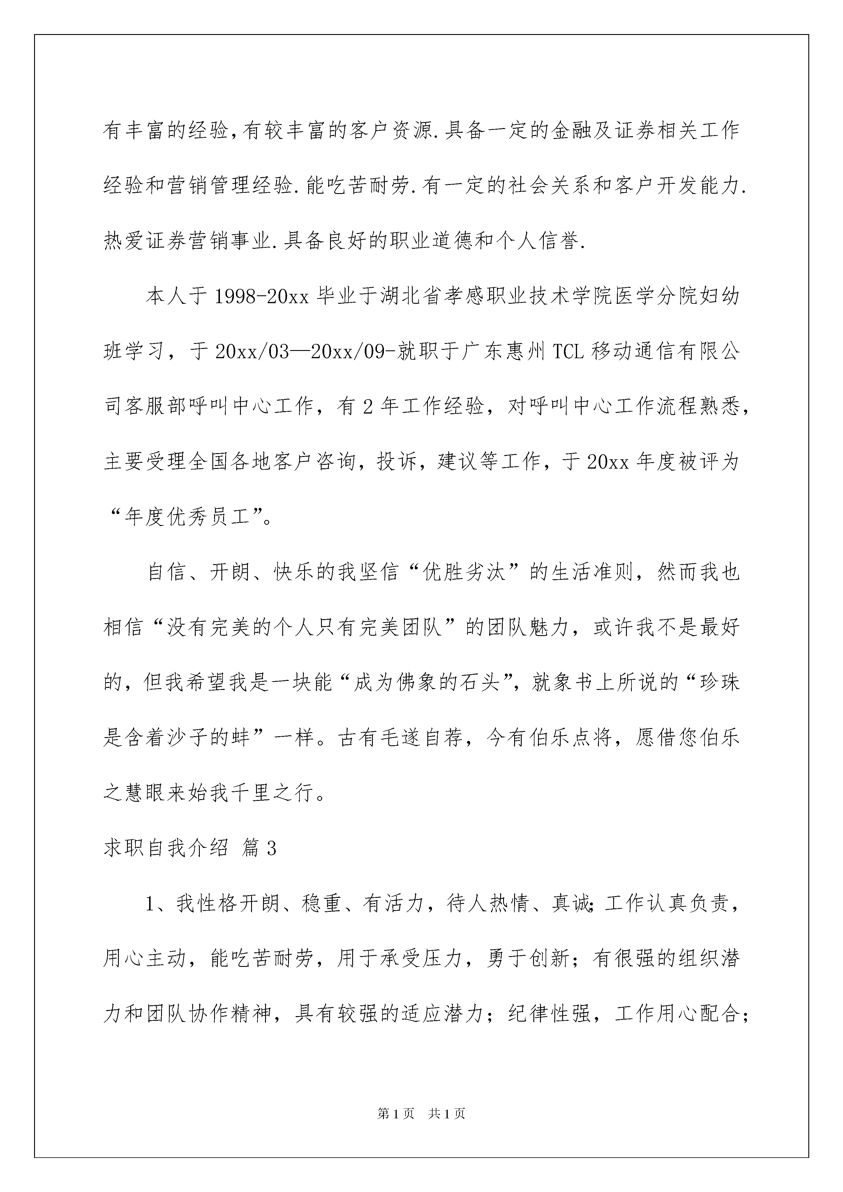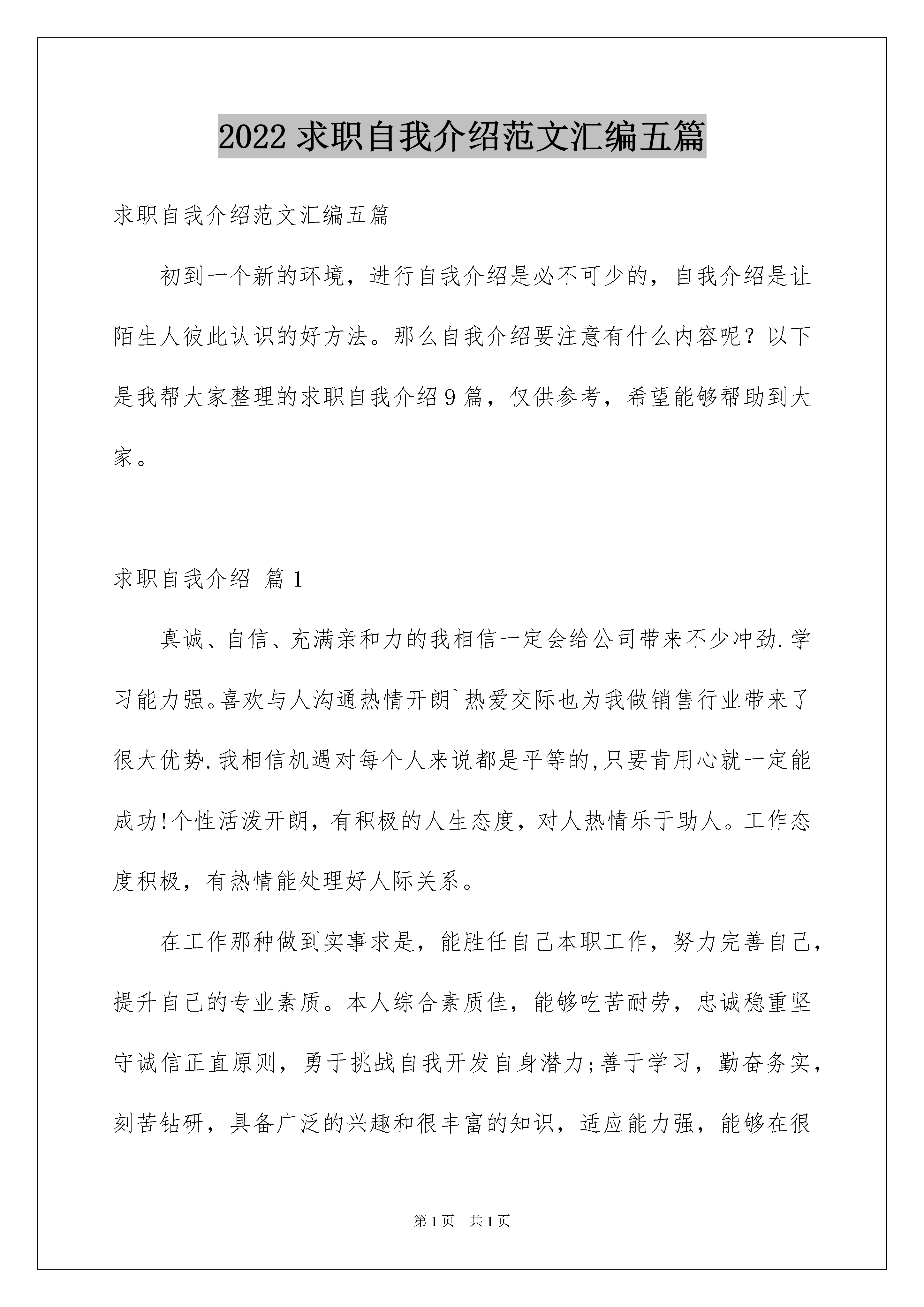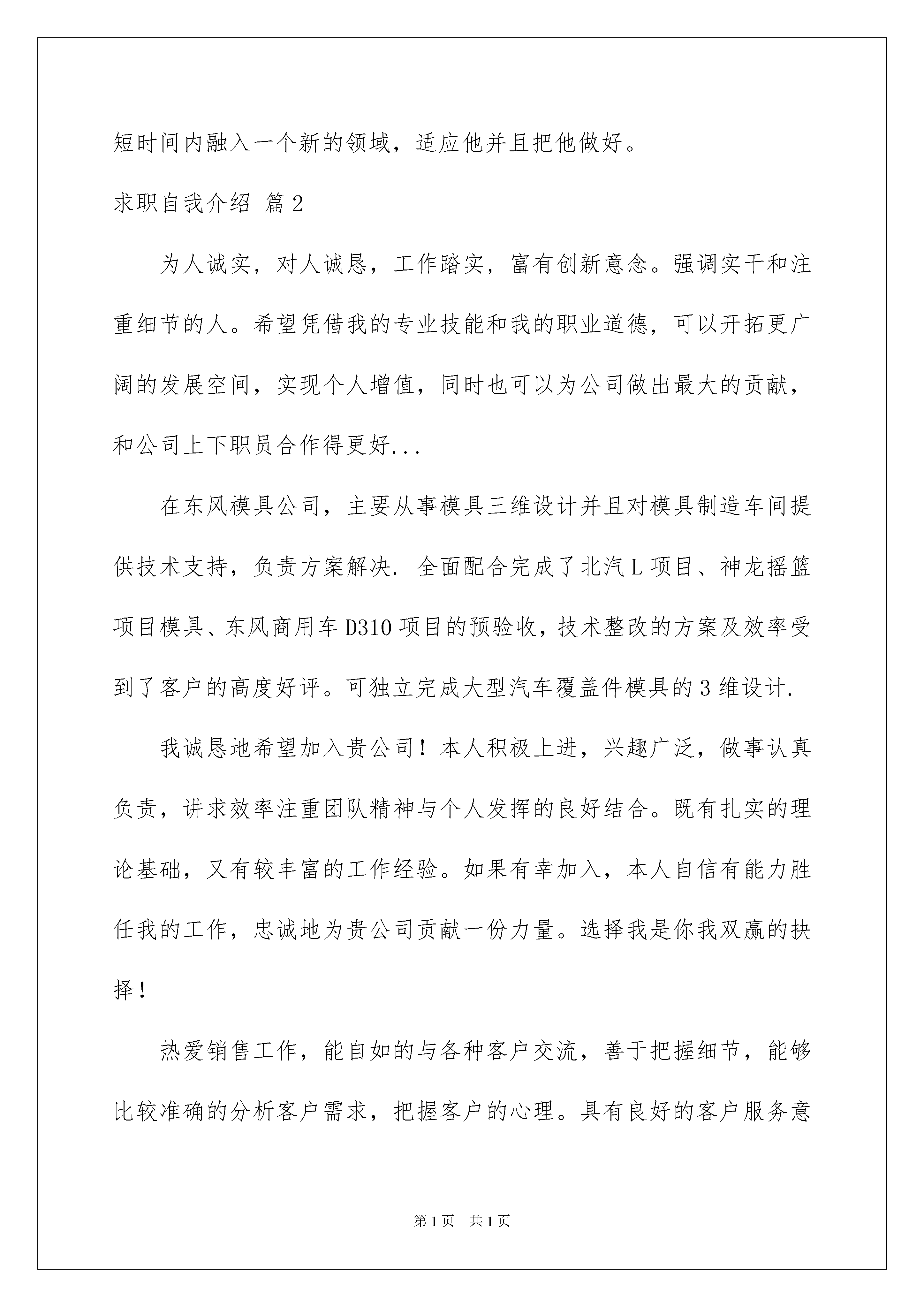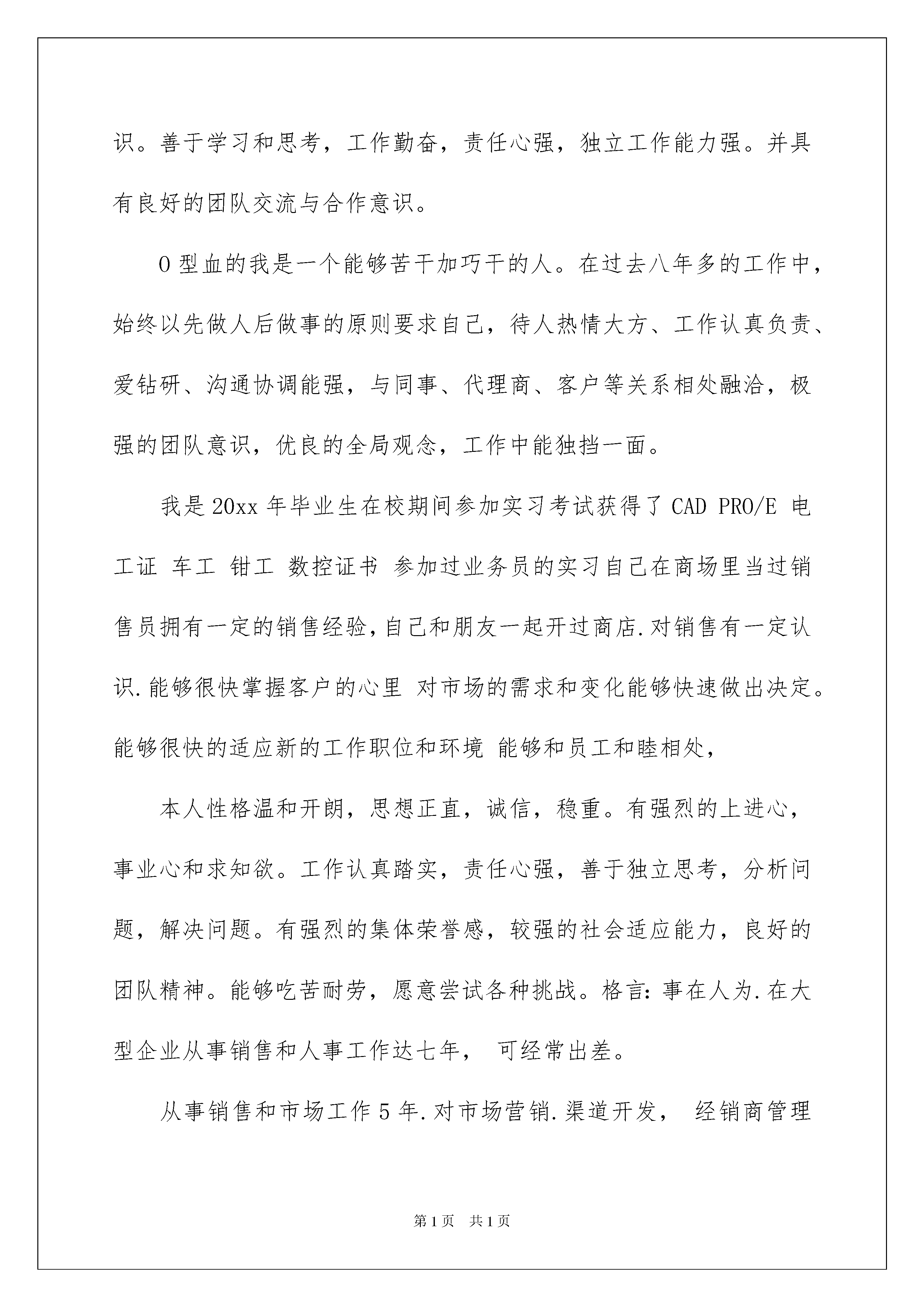 2022求职自我介绍范文汇编五篇求职自我介绍范文汇编五篇初到一个新的环境,进行自我介绍是必不可少的,自我介绍是让陌生人彼此认识的好方法。那么自我介绍要注意有什么内容呢?以下是我帮大家整理的求职自我介绍9篇,仅供参考,希望能够帮助到大家。求职自我介绍篇1真诚、自信、充满亲和力的我相信一定会给公司带来不少冲劲.学习能力强。喜欢与人沟通热情开朗`热爱交际也为我做销售行业带来了很大优势.我相信机遇对每个人来说都是平等的,只要肯用心就一定能成功!个性活泼开朗,有积极的人生态度,对人热情乐于助人。工作态度积极,有热情能处理好人际关系。在工作那种做到实事求是,能胜任自己本职工作,努力完善自己,提升自己的专业素质。本人综合素质佳,能够吃苦耐劳,忠诚稳重坚守诚信正直原则,勇于挑战自我开发自身潜力;善于学习,勤奋务实,刻苦钻研,具备广泛的兴趣和很丰富的知识,适应能力强,能够在很短时间内融入一个新的领域,适应他并且把他做好。求职自我介绍篇2为人诚实,对人诚恳,工作踏实,富有创新意念。强调实干和注重细节的人。希望凭借我的专业技能和我的职业道德,可以开拓更广阔的发展空间,实现个人增值,同时也可以为公司做出最大的贡献,和公司上下职员合作得更好...在东风模具公司,主要从事模具三维设计并且对模具制造车间提供技术支持,负责方案解决.全面配合完成了北汽L项目、神龙摇篮项目模具、东风商用车D310项目的预验收,技术整改的方案及效率受到了客户的高度好评。可独立完成大型汽车覆盖件模具的3维设计.我诚恳地希望加入贵公司!本人积极上进,兴趣广泛,做事认真负责,讲求效率注重团队精神与个人发挥的良好结合。既有扎实的理论基础,又有较丰富的工作经验。如果有幸加入,本人自信有能力胜任我的工作,忠诚地为贵公司贡献一份力量。选择我是你我双赢的抉择!热爱销售工作,能自如的与各种客户交流,善于把握细节,能够比较准确的分析客户需求,把握客户的心理。具有良好的客户服务意识。善于学习和思考,工作勤奋,责任心强,独立工作能力强。并具有良好的团队交流与合作意识。O型血的我是一个能够苦干加巧干的人。在过去八年多的工作中,始终以先做人后做事的原则要求自己,待人热情大方、工作认真负责、爱钻研、沟通协调能强,与同事、代理商、客户等关系相处融洽,极强的团队意识,优良的全局观念,工作中能独挡一面。我是20xx年毕业生在校期间参加实习考试获得了CADPRO/E电工证车工钳工数控证书参加过业务员的实习自己在商场里当过销售员拥有一定的销售经验,自己和朋友一起开过商店.对销售有一定认识.能够很快掌握客户的心里对市场的需求和变化能够快速做出决定。能够很快的适应新的工作职位和环境能够和员工和睦相处,本人性格温和开朗,思想正直,诚信,稳重。有强烈的上进心,事业心和求知欲。工作认真踏实,责任心强,善于独立思考,分析问题,解决问题。有强烈的集体荣誉感,较强的社会适应能力,良好的团队精神。能够吃苦耐劳,愿意尝试各种挑战。格言:事在人为.在大型企业从事销售和人事工作达七年,可经常出差。从事销售和市场工作5年.对市场营销.渠道开发,经销商管理有丰富的经验,有较丰富的客户资源.具备一定的金融及证券相关工作经验和营销管理经验.能吃苦耐劳.有一定的社会关系和客户开发能力.热爱证券营销事业.具备良好的职业道德和个人信誉.本人于1998-20xx毕业于湖北省孝感职业技术学院医学分院妇幼班学习,于20xx/03—20xx/09-就职于广东惠州TCL移动通信有限公司客服部呼叫中心工作,有2年工作经验,对呼叫中心工作流程熟悉,主要受理全国各地客户咨询,投诉,建议等工作,于20xx年度被评为“年度优秀员工”。自信、开朗、快乐的我坚信“优胜劣汰”的生活准则,然而我也相信“没有完美的个人只有完美团队”的团队魅力,或许我不是最好的,但我希望我是一块能“成为佛象的石头”,就象书上所说的“珍珠是含着沙子的蚌”一样。古有毛遂自荐,今有伯乐点将,愿借您伯乐之慧眼来始我千里之行。求职自我介绍篇31、我性格开朗、稳重、有活力,待人热情、真诚;工作认真负责,用心主动,能吃苦耐劳,用于承受压力,勇于创新;有很强的组织潜力和团队协作精神,具有较强的适应潜力;纪律性强,工作用心配合;意志坚强,具有较强的无私奉献精神。2、对待工作认真负责,善于沟通、协调有较强的组织潜力与团队精神;活泼开朗、乐观上进、有爱心并善于施教并行;上进心强、勤于学习能不断提高自身的潜力与综合素质。3、工作时间,曾多次获得“每月之星”,深得领导的信任和关注。求职自我介绍篇4我叫&&,是&&学校&&专业的学生,我知道自己的起点没有别人高,但是我相信只要