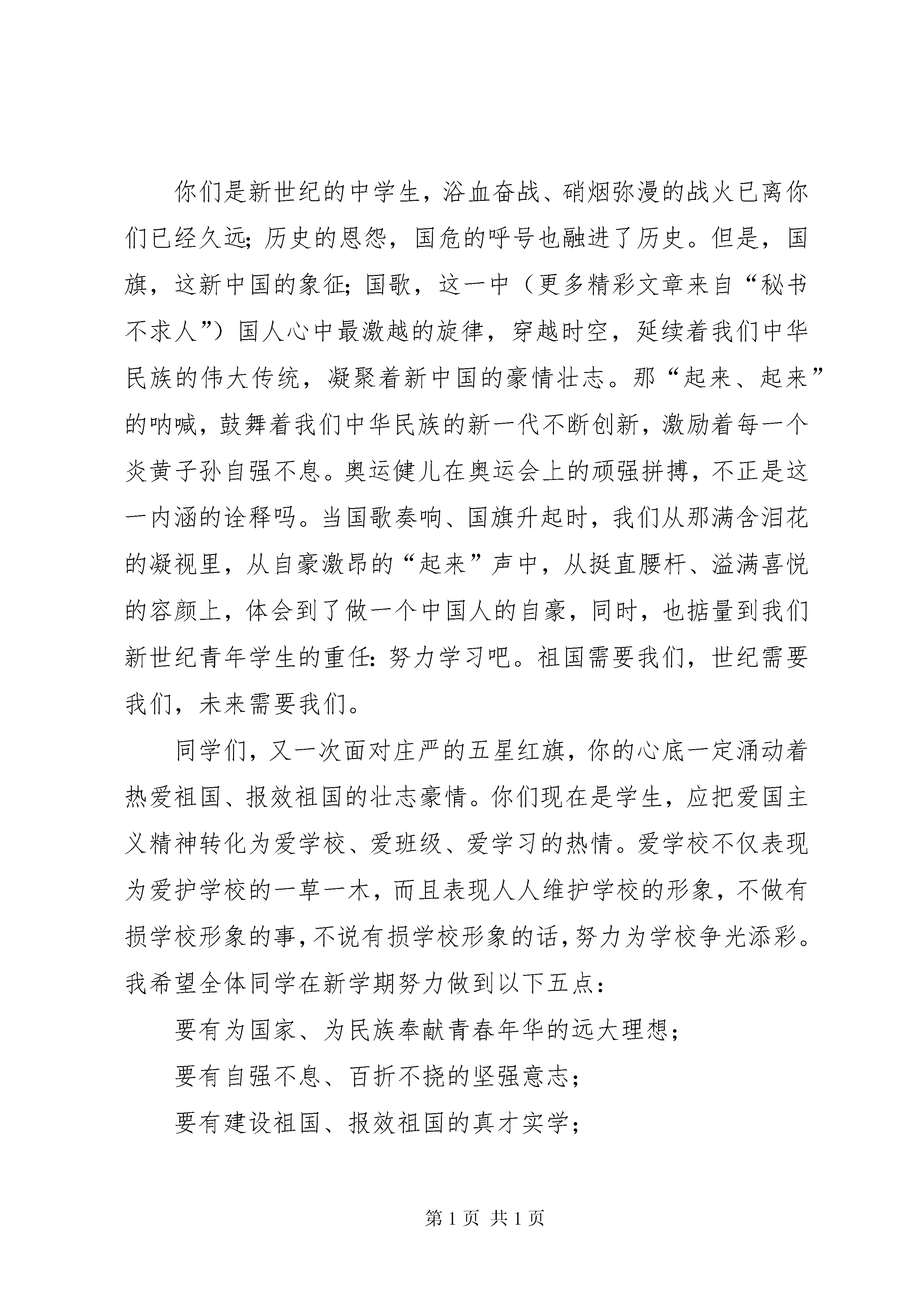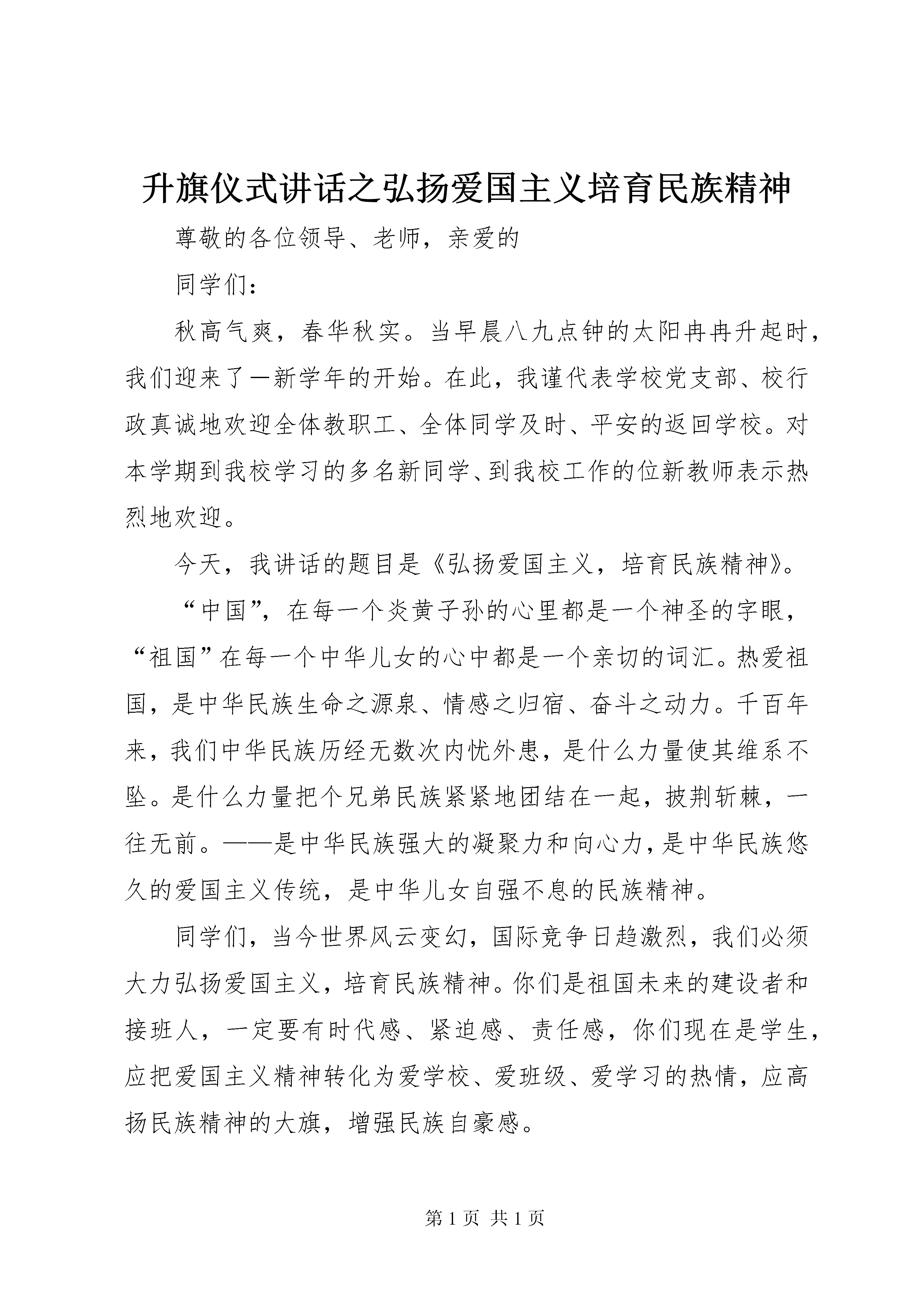 升旗仪式讲话之弘扬爱国主义培育民族精神尊敬的各位领导、老师,亲爱的同学们:秋高气爽,春华秋实。当早晨八九点钟的太阳冉冉升起时,我们迎来了-新学年的开始。在此,我谨代表学校党支部、校行政真诚地欢迎全体教职工、全体同学及时、平安的返回学校。对本学期到我校学习的多名新同学、到我校工作的位新教师表示热烈地欢迎。今天,我讲话的题目是《弘扬爱国主义,培育民族精神》。“中国”,在每一个炎黄子孙的心里都是一个神圣的字眼,“祖国”在每一个中华儿女的心中都是一个亲切的词汇。热爱祖国,是中华民族生命之源泉、情感之归宿、奋斗之动力。千百年来,我们中华民族历经无数次内忧外患,是什么力量使其维系不坠。是什么力量把个兄弟民族紧紧地团结在一起,披荆斩棘,一往无前。——是中华民族强大的凝聚力和向心力,是中华民族悠久的爱国主义传统,是中华儿女自强不息的民族精神。同学们,当今世界风云变幻,国际竞争日趋激烈,我们必须大力弘扬爱国主义,培育民族精神。你们是祖国未来的建设者和接班人,一定要有时代感、紧迫感、责任感,你们现在是学生,应把爱国主义精神转化为爱学校、爱班级、爱学习的热情,应高扬民族精神的大旗,增强民族自豪感。你们是新世纪的中学生,浴血奋战、硝烟弥漫的战火已离你们已经久远;历史的恩怨,国危的呼号也融进了历史。但是,国旗,这新中国的象征;国歌,这一中(更多精彩文章来自“秘书不求人”)国人心中最激越的旋律,穿越时空,延续着我们中华民族的伟大传统,凝聚着新中国的豪情壮志。那“起来、起来”的呐喊,鼓舞着我们中华民族的新一代不断创新,激励着每一个炎黄子孙自强不息。奥运健儿在奥运会上的顽强拼搏,不正是这一内涵的诠释吗。当国歌奏响、国旗升起时,我们从那满含泪花的凝视里,从自豪激昂的“起来”声中,从挺直腰杆、溢满喜悦的容颜上,体会到了做一个中国人的自豪,同时,也掂量到我们新世纪青年学生的重任:努力学习吧。祖国需要我们,世纪需要我们,未来需要我们。同学们,又一次面对庄严的五星红旗,你的心底一定涌动着热爱祖国、报效祖国的壮志豪情。你们现在是学生,应把爱国主义精神转化为爱学校、爱班级、爱学习的热情。爱学校不仅表现为爱护学校的一草一木,而且表现人人维护学校的形象,不做有损学校形象的事,不说有损学校形象的话,努力为学校争光添彩。我希望全体同学在新学期努力做到以下五点:要有为国家、为民族奉献青春年华的远大理想;要有自强不息、百折不挠的坚强意志;要有建设祖国、报效祖国的真才实学;要有文明守纪、严于律己的素质修养;要有敢于拼搏、勇于争先的竞争意识。老师们,同学们,新学期已经开始,希望学习有新目标,工作有新起色,学校有新气象质量有新突破。让我们全体师生高扬爱国主义和民族精神的旗帜,以饱满的热情、昂扬的斗志去刻苦学习,发奋工作,以优异的成绩向建国五十五周年献礼。谢谢。