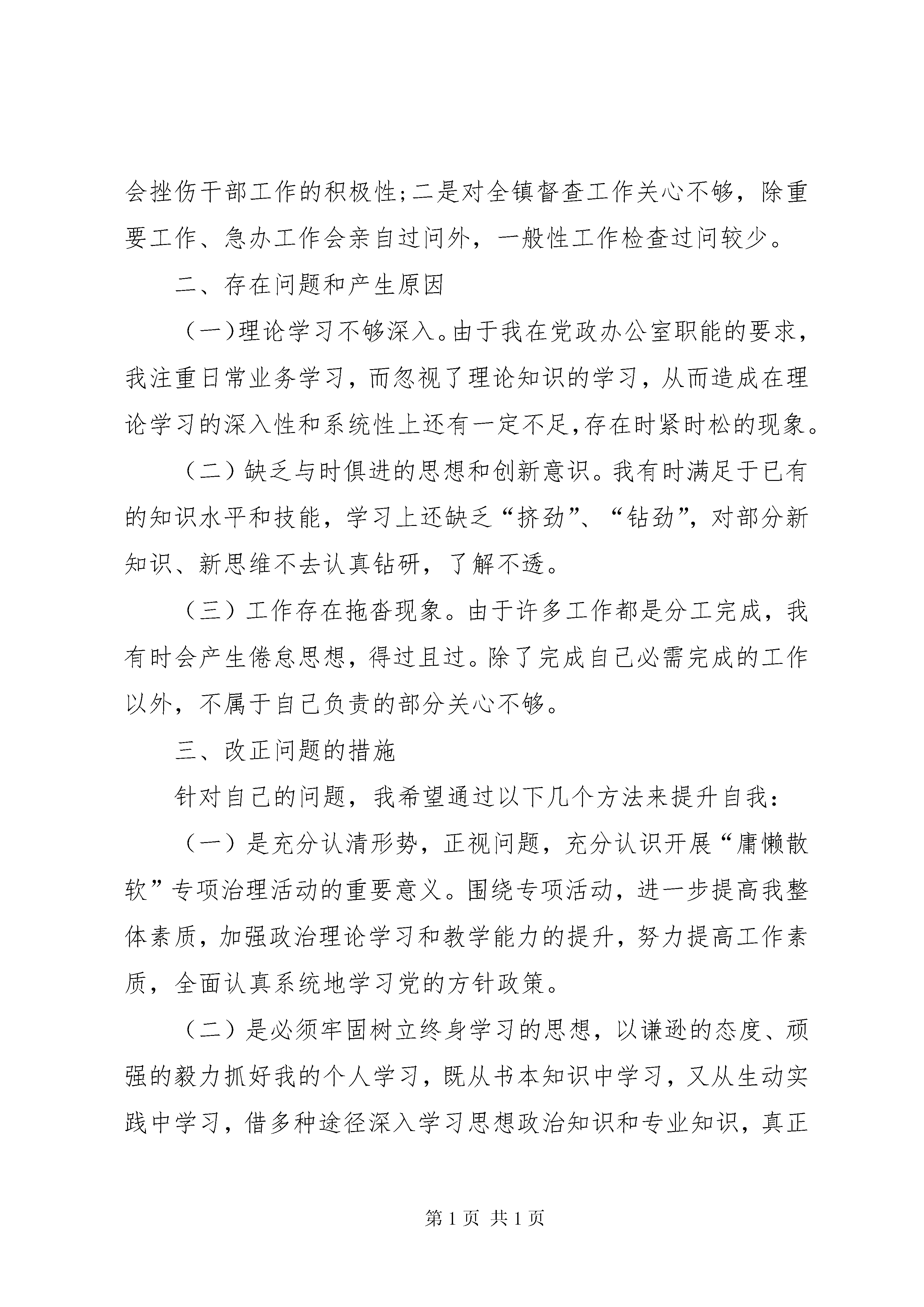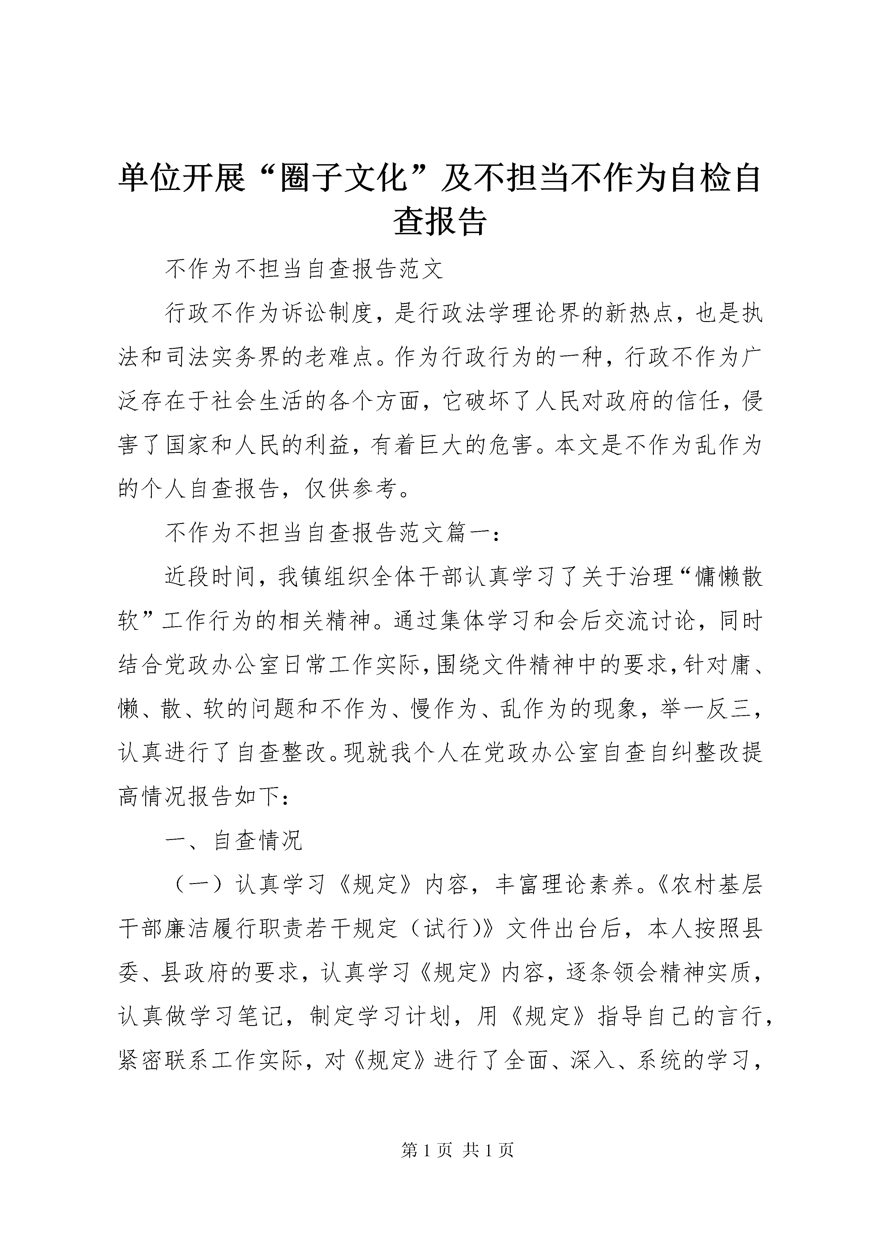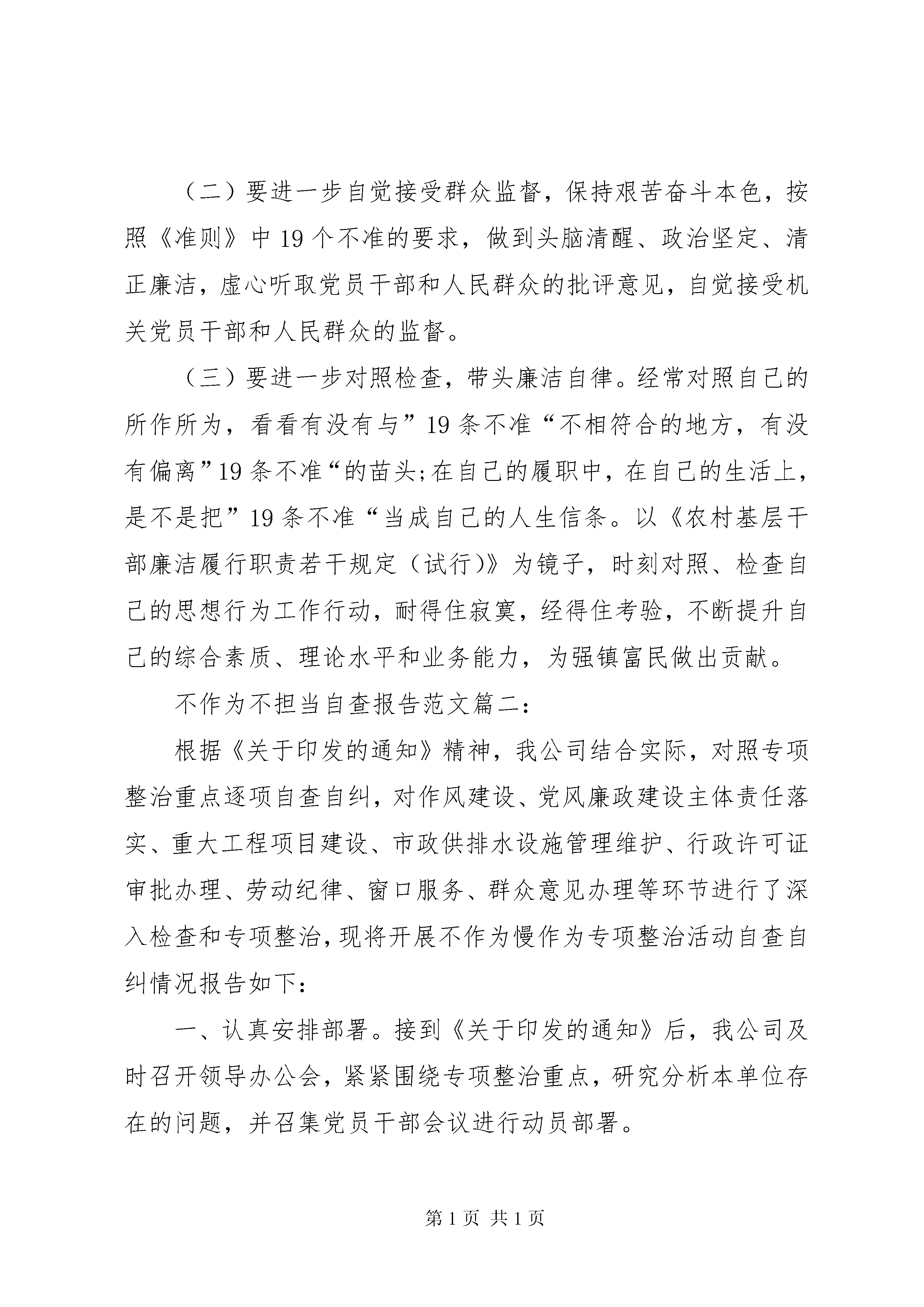 单位开展“圈子文化”及不担当不作为自检自查报告不作为不担当自查报告范文行政不作为诉讼制度,是行政法学理论界的新热点,也是执法和司法实务界的老难点。作为行政行为的一种,行政不作为广泛存在于社会生活的各个方面,它破坏了人民对政府的信任,侵害了国家和人民的利益,有着巨大的危害。本文是不作为乱作为的个人自查报告,仅供参考。不作为不担当自查报告范文篇一:近段时间,我镇组织全体干部认真学习了关于治理“慵懒散软”工作行为的相关精神。通过集体学习和会后交流讨论,同时结合党政办公室日常工作实际,围绕文件精神中的要求,针对庸、懒、散、软的问题和不作为、慢作为、乱作为的现象,举一反三,认真进行了自查整改。现就我个人在党政办公室自查自纠整改提高情况报告如下:一、自查情况(一)认真学习《规定》内容,丰富理论素养。《农村基层干部廉洁履行职责若干规定(试行)》文件出台后,本人按照县委、县政府的要求,认真学习《规定》内容,逐条领会精神实质,认真做学习笔记,制定学习计划,用《规定》指导自己的言行,紧密联系工作实际,对《规定》进行了全面、深入、系统的学习,丰富了自身的理论素养。(二)严格遵守《规定》制度,牢记《规定》要求。作为镇里一把手,率先垂范,严格要求自己,遵守各项规章制度,务求自己做到自省、自警、自励,做到淡泊明志,宁静致远,不让拜金主义、享乐主义和极端个人主义占据自己的头脑,不让现实之中的歪风邪气侵蚀自己的灵魂,严格按照县委县政府和本单位的各项规章制度办事。本人在学习完《农村基层干部廉洁履行职责若干规定(试行)》之后,对照其内容,认真自查,能够严格遵守“19个不准”,无一违反,同时也发现一些问题,具体如下:(1)学习不够深入,思想不够解放。平时虽然学习了大量的政治、经济和社会科学方面的知识,并注重从中吸取精华充实自己,但由于处在领导岗位上,日常性事务工作多,俗话说:“上面千条线、下面一针穿”,来的都是客,要尽地主之谊,所以不能更深层次地静下心来学习,导致对新生事物不能及时掌握,影响了更深层次的解放思想。(2)工作抓落实力度不够。虽然平时对工作强调很多,并注重完善各项规章制度,且强调要求严格,但深入第一线的时间不多;开会发文件较多,对执行情况检查督促较少,过硬措施不力。究其原因:一是乡镇工作片面性,随意性较大,有些工作难以量化、考核,特别是基层干部的工作对象是素质差异较大的广大群众,一些工作难以按原计划完成,所以执行奖惩稍有不慎就会挫伤干部工作的积极性;二是对全镇督查工作关心不够,除重要工作、急办工作会亲自过问外,一般性工作检查过问较少。二、存在问题和产生原因(一)理论学习不够深入。由于我在党政办公室职能的要求,我注重日常业务学习,而忽视了理论知识的学习,从而造成在理论学习的深入性和系统性上还有一定不足,存在时紧时松的现象。(二)缺乏与时俱进的思想和创新意识。我有时满足于已有的知识水平和技能,学习上还缺乏“挤劲”、“钻劲”,对部分新知识、新思维不去认真钻研,了解不透。(三)工作存在拖沓现象。由于许多工作都是分工完成,我有时会产生倦怠思想,得过且过。除了完成自己必需完成的工作以外,不属于自己负责的部分关心不够。三、改正问题的措施针对自己的问题,我希望通过以下几个方法来提升自我:(一)是充分认清形势,正视问题,充分认识开展“庸懒散软”专项治理活动的重要意义。围绕专项活动,进一步提高我整体素质,加强政治理论学习和教学能力的提升,努力提高工作素质,全面认真系统地学习党的方针政策。(二)是必须牢固树立终身学习的思想,以谦逊的态度、顽强的毅力抓好我的个人学习,既从书本知识中学习,又从生动实践中学习,借多种途径深入学习思想政治知识和专业知识,真正学懂弄通,把握精神实质,提高理论素养,不断加强工作中的理论自觉和理论指导。(三)是端正工作态度,树立开拓创新思想,养成勤于思考的习惯,进一步改进工作作风,增强工作主动性,在上班时间不做与工作无关的事情。突破工作思路局限,改进工作方法,统筹兼顾,与时俱进,创造性地开展各项工作。(四)是加强我与同事之间的交流与协作,最大限度地调动工作积极性,推进协同协作,成员之间互相监督,互相督促,在遇到困难时齐心协力,共同解决,在配合中找准结合点,追求工作理念同步、工作谋划同步、工作落实同步,形成协调一致抓工作落实的生动局面和良好风气。在接下来的工作学习中,我还将进一步提高自我,并找出不足,做出整改计划,针对发现的问题逐条进行整改,改正不足,发扬优点,进一步做好党政办的工作和领导交付的任务。四、今后工作的努力方向(一)加强学习,认真整改。进一步加强党性修养,牢固树立宗旨意识,认真学习领会《共产党党员领导干部廉洁从政若干准则》,通过努力学习理论,夯实自身思想政治基础,加强自身的党性修养,时刻牢记党的宗旨和艰苦奋斗的优良传统