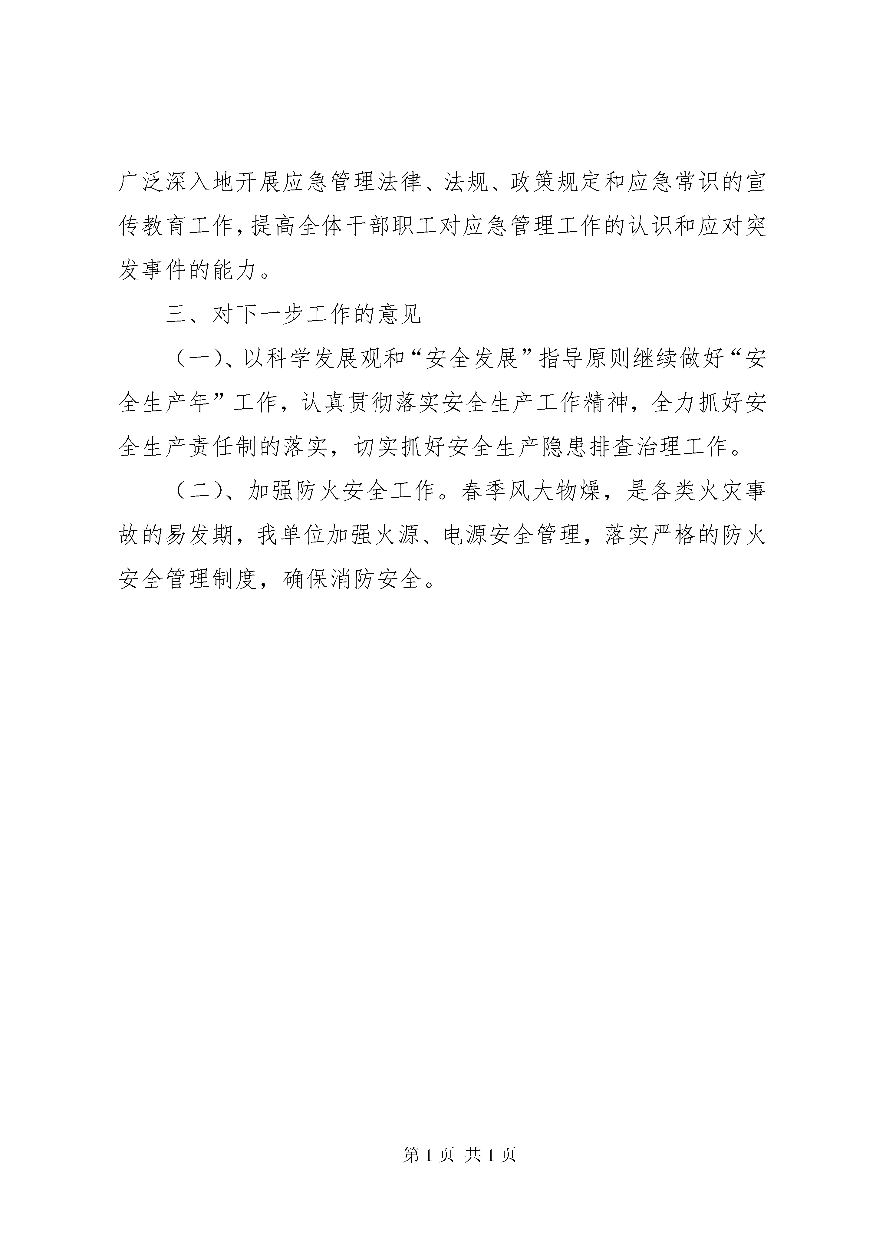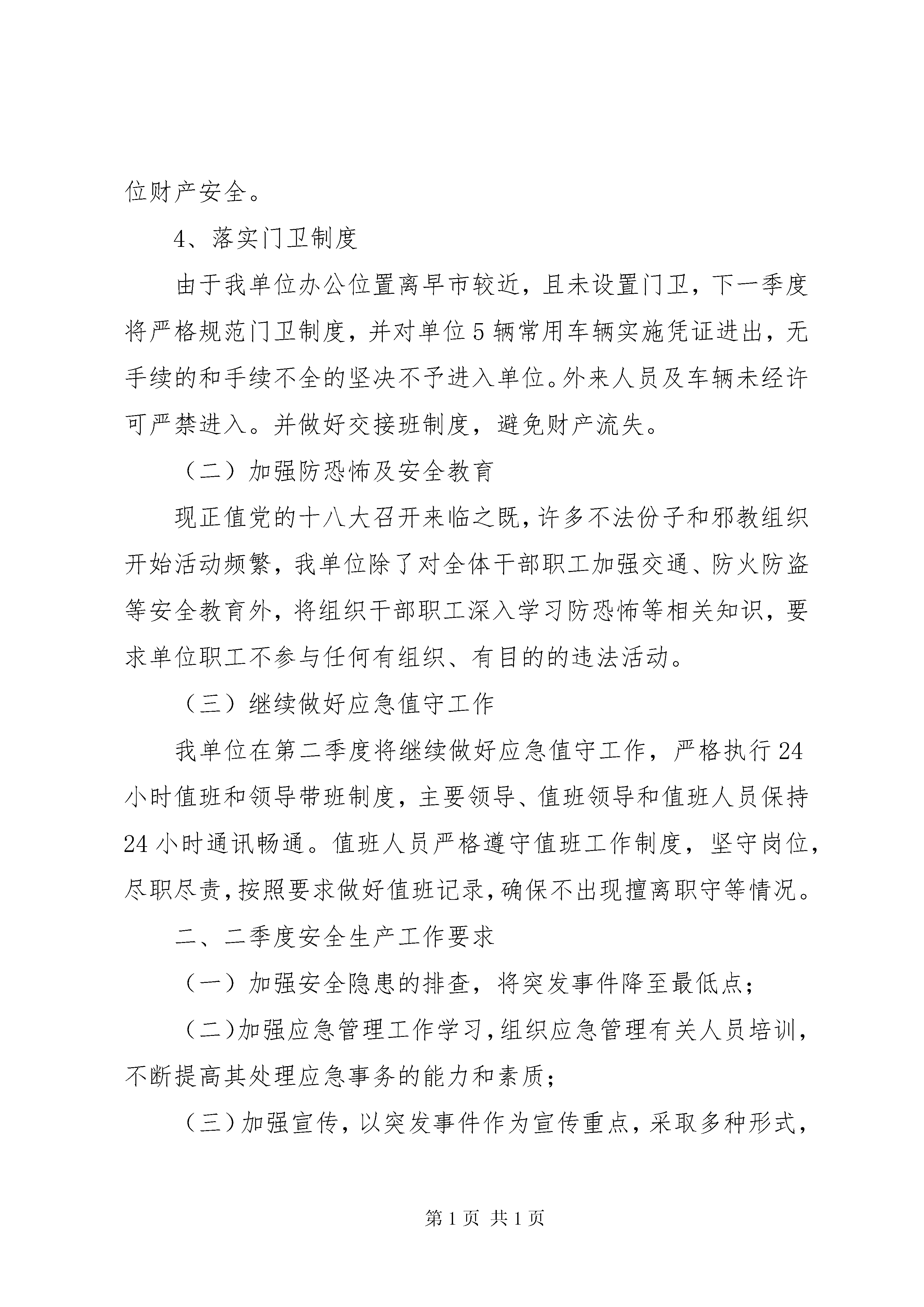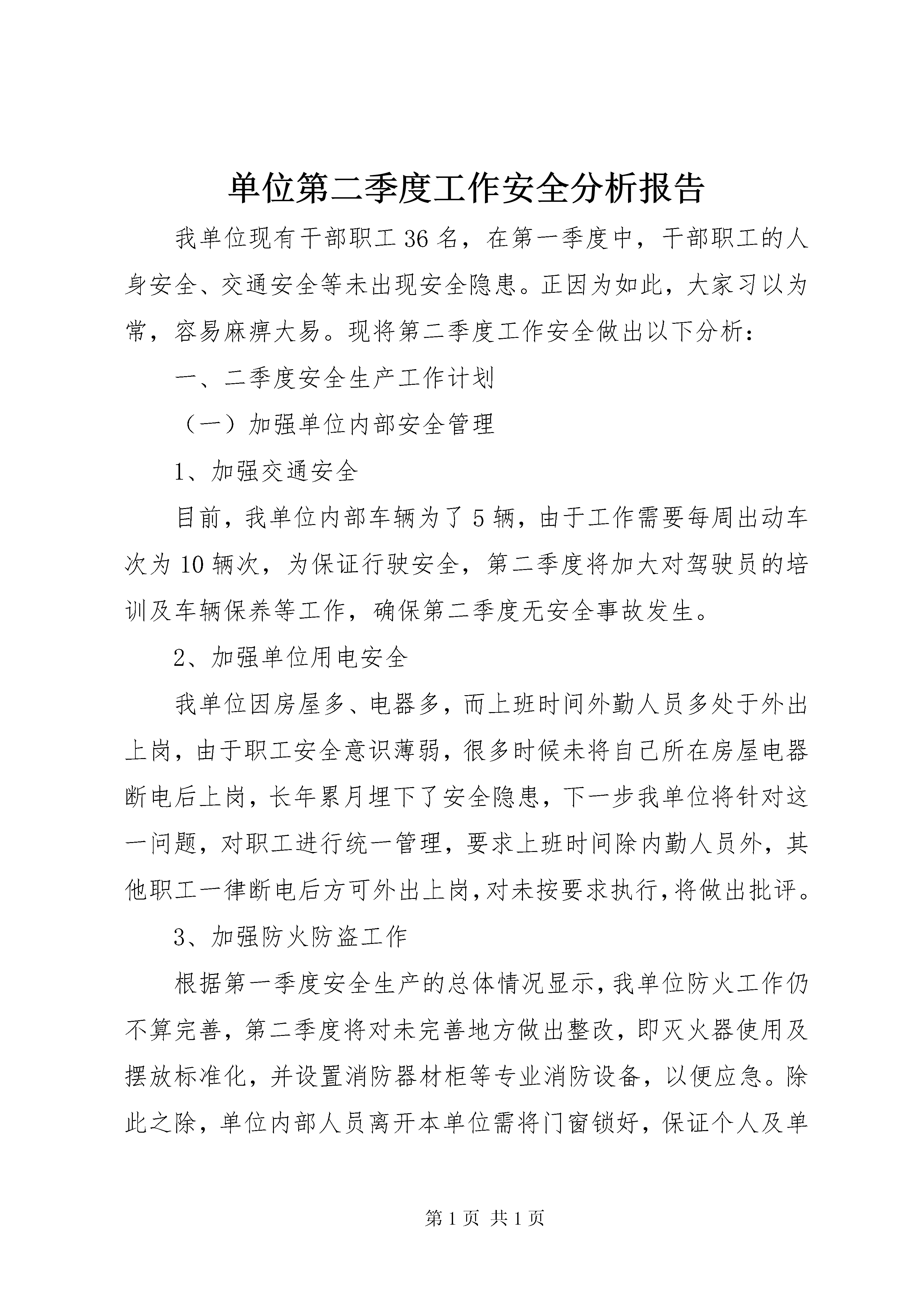 单位第二季度工作安全分析报告我单位现有干部职工36名,在第一季度中,干部职工的人身安全、交通安全等未出现安全隐患。正因为如此,大家习以为常,容易麻痹大易。现将第二季度工作安全做出以下分析:一、二季度安全生产工作计划(一)加强单位内部安全管理1、加强交通安全目前,我单位内部车辆为了5辆,由于工作需要每周出动车次为10辆次,为保证行驶安全,第二季度将加大对驾驶员的培训及车辆保养等工作,确保第二季度无安全事故发生。2、加强单位用电安全我单位因房屋多、电器多,而上班时间外勤人员多处于外出上岗,由于职工安全意识薄弱,很多时候未将自己所在房屋电器断电后上岗,长年累月埋下了安全隐患,下一步我单位将针对这一问题,对职工进行统一管理,要求上班时间除内勤人员外,其他职工一律断电后方可外出上岗,对未按要求执行,将做出批评。3、加强防火防盗工作根据第一季度安全生产的总体情况显示,我单位防火工作仍不算完善,第二季度将对未完善地方做出整改,即灭火器使用及摆放标准化,并设置消防器材柜等专业消防设备,以便应急。除此之除,单位内部人员离开本单位需将门窗锁好,保证个人及单位财产安全。4、落实门卫制度由于我单位办公位置离早市较近,且未设置门卫,下一季度将严格规范门卫制度,并对单位5辆常用车辆实施凭证进出,无手续的和手续不全的坚决不予进入单位。外来人员及车辆未经许可严禁进入。并做好交接班制度,避免财产流失。(二)加强防恐怖及安全教育现正值党的十八大召开来临之既,许多不法份子和邪教组织开始活动频繁,我单位除了对全体干部职工加强交通、防火防盗等安全教育外,将组织干部职工深入学习防恐怖等相关知识,要求单位职工不参与任何有组织、有目的的违法活动。(三)继续做好应急值守工作我单位在第二季度将继续做好应急值守工作,严格执行24小时值班和领导带班制度,主要领导、值班领导和值班人员保持24小时通讯畅通。值班人员严格遵守值班工作制度,坚守岗位,尽职尽责,按照要求做好值班记录,确保不出现擅离职守等情况。二、二季度安全生产工作要求(一)加强安全隐患的排查,将突发事件降至最低点;(二)加强应急管理工作学习,组织应急管理有关人员培训,不断提高其处理应急事务的能力和素质;(三)加强宣传,以突发事件作为宣传重点,采取多种形式,广泛深入地开展应急管理法律、法规、政策规定和应急常识的宣传教育工作,提高全体干部职工对应急管理工作的认识和应对突发事件的能力。三、对下一步工作的意见(一)、以科学发展观和“安全发展”指导原则继续做好“安全生产年”工作,认真贯彻落实安全生产工作精神,全力抓好安全生产责任制的落实,切实抓好安全生产隐患排查治理工作。(二)、加强防火安全工作。春季风大物燥,是各类火灾事故的易发期,我单位加强火源、电源安全管理,落实严格的防火安全管理制度,确保消防安全。