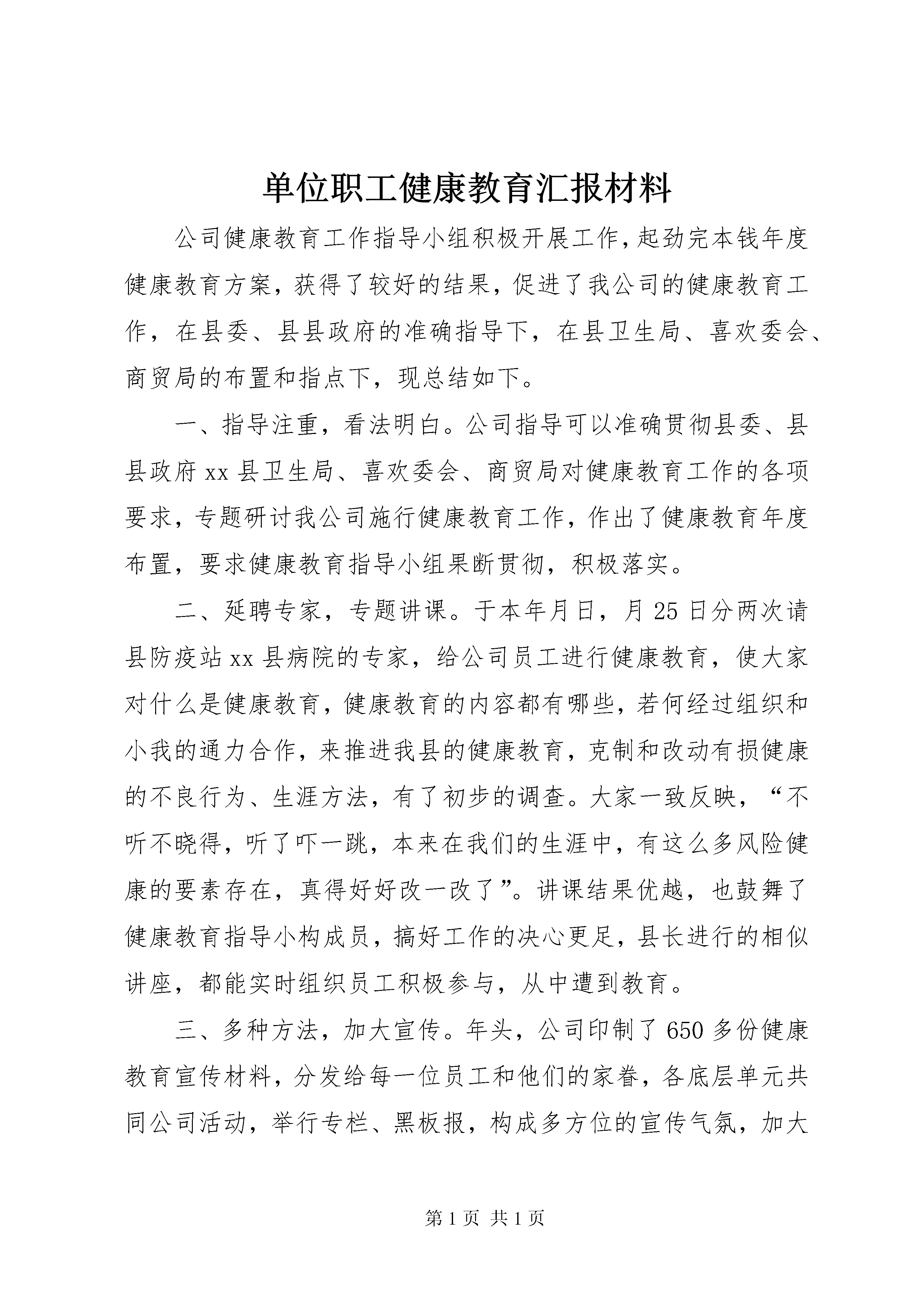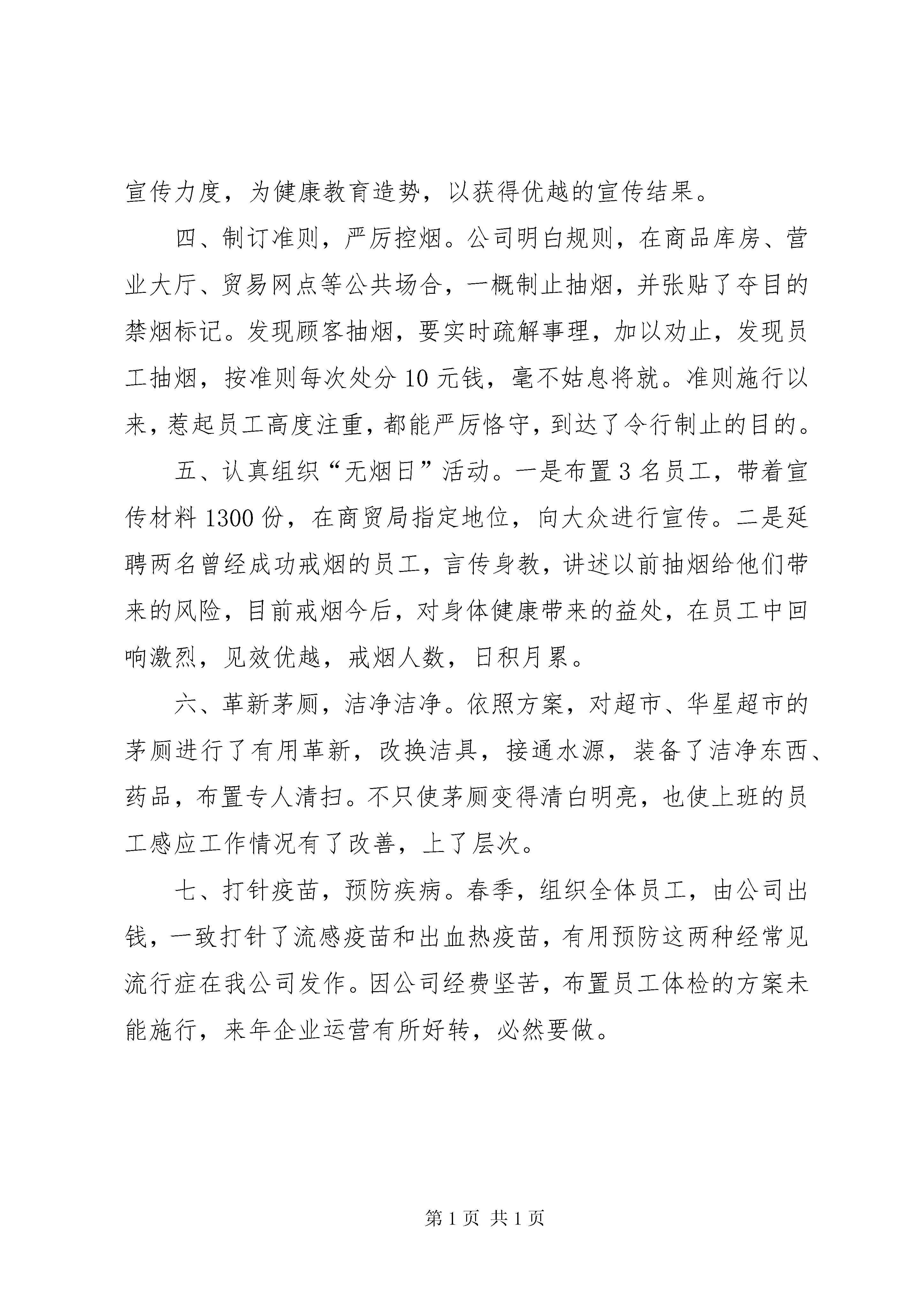 单位职工健康教育汇报材料公司健康教育工作指导小组积极开展工作,起劲完本钱年度健康教育方案,获得了较好的结果,促进了我公司的健康教育工作,在县委、县县政府的准确指导下,在县卫生局、喜欢委会、商贸局的布置和指点下,现总结如下。一、指导注重,看法明白。公司指导可以准确贯彻县委、县县政府xx县卫生局、喜欢委会、商贸局对健康教育工作的各项要求,专题研讨我公司施行健康教育工作,作出了健康教育年度布置,要求健康教育指导小组果断贯彻,积极落实。二、延聘专家,专题讲课。于本年月日,月25日分两次请县防疫站xx县病院的专家,给公司员工进行健康教育,使大家对什么是健康教育,健康教育的内容都有哪些,若何经过组织和小我的通力合作,来推进我县的健康教育,克制和改动有损健康的不良行为、生涯方法,有了初步的调查。大家一致反映,“不听不晓得,听了吓一跳,本来在我们的生涯中,有这么多风险健康的要素存在,真得好好改一改了”。讲课结果优越,也鼓舞了健康教育指导小构成员,搞好工作的决心更足,县长进行的相似讲座,都能实时组织员工积极参与,从中遭到教育。三、多种方法,加大宣传。年头,公司印制了650多份健康教育宣传材料,分发给每一位员工和他们的家眷,各底层单元共同公司活动,举行专栏、黑板报,构成多方位的宣传气氛,加大宣传力度,为健康教育造势,以获得优越的宣传结果。四、制订准则,严厉控烟。公司明白规则,在商品库房、营业大厅、贸易网点等公共场合,一概制止抽烟,并张贴了夺目的禁烟标记。发现顾客抽烟,要实时疏解事理,加以劝止,发现员工抽烟,按准则每次处分10元钱,毫不姑息将就。准则施行以来,惹起员工高度注重,都能严厉恪守,到达了令行制止的目的。五、认真组织“无烟日”活动。一是布置3名员工,带着宣传材料1300份,在商贸局指定地位,向大众进行宣传。二是延聘两名曾经成功戒烟的员工,言传身教,讲述以前抽烟给他们带来的风险,目前戒烟今后,对身体健康带来的益处,在员工中回响激烈,见效优越,戒烟人数,日积月累。六、革新茅厕,洁净洁净。依照方案,对超市、华星超市的茅厕进行了有用革新,改换洁具,接通水源,装备了洁净东西、药品,布置专人清扫。不只使茅厕变得清白明亮,也使上班的员工感应工作情况有了改善,上了层次。七、打针疫苗,预防疾病。春季,组织全体员工,由公司出钱,一致打针了流感疫苗和出血热疫苗,有用预防这两种经常见流行症在我公司发作。因公司经费坚苦,布置员工体检的方案未能施行,来年企业运营有所好转,必然要做。