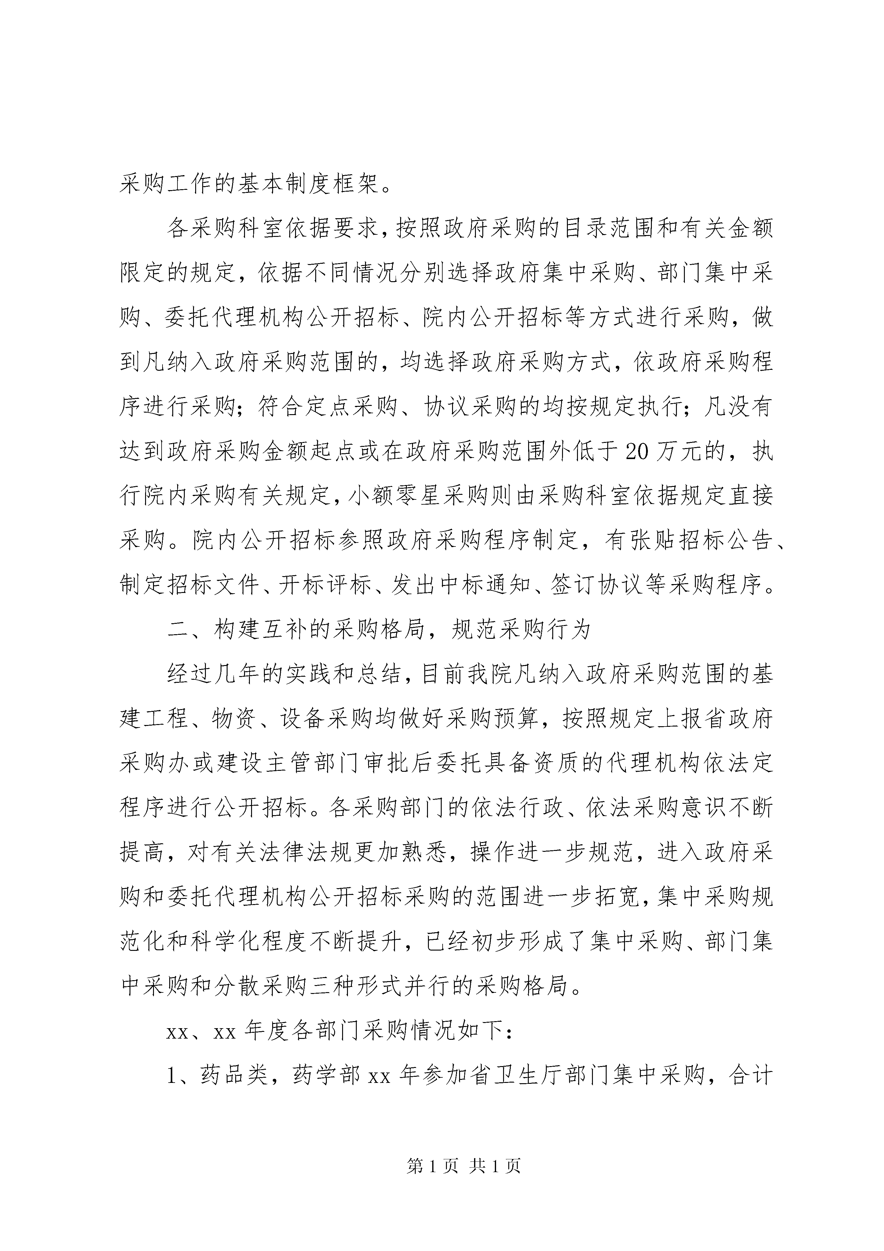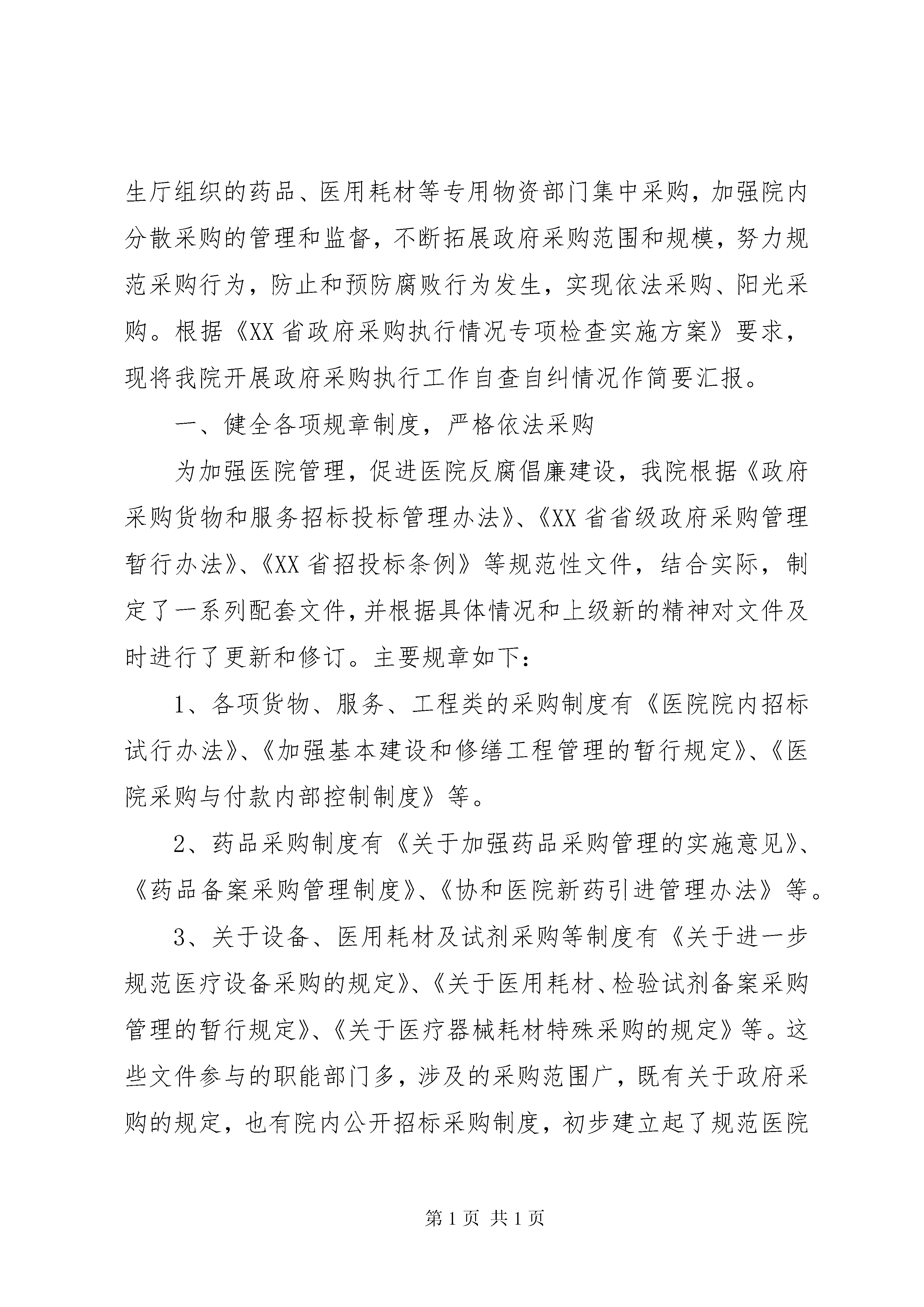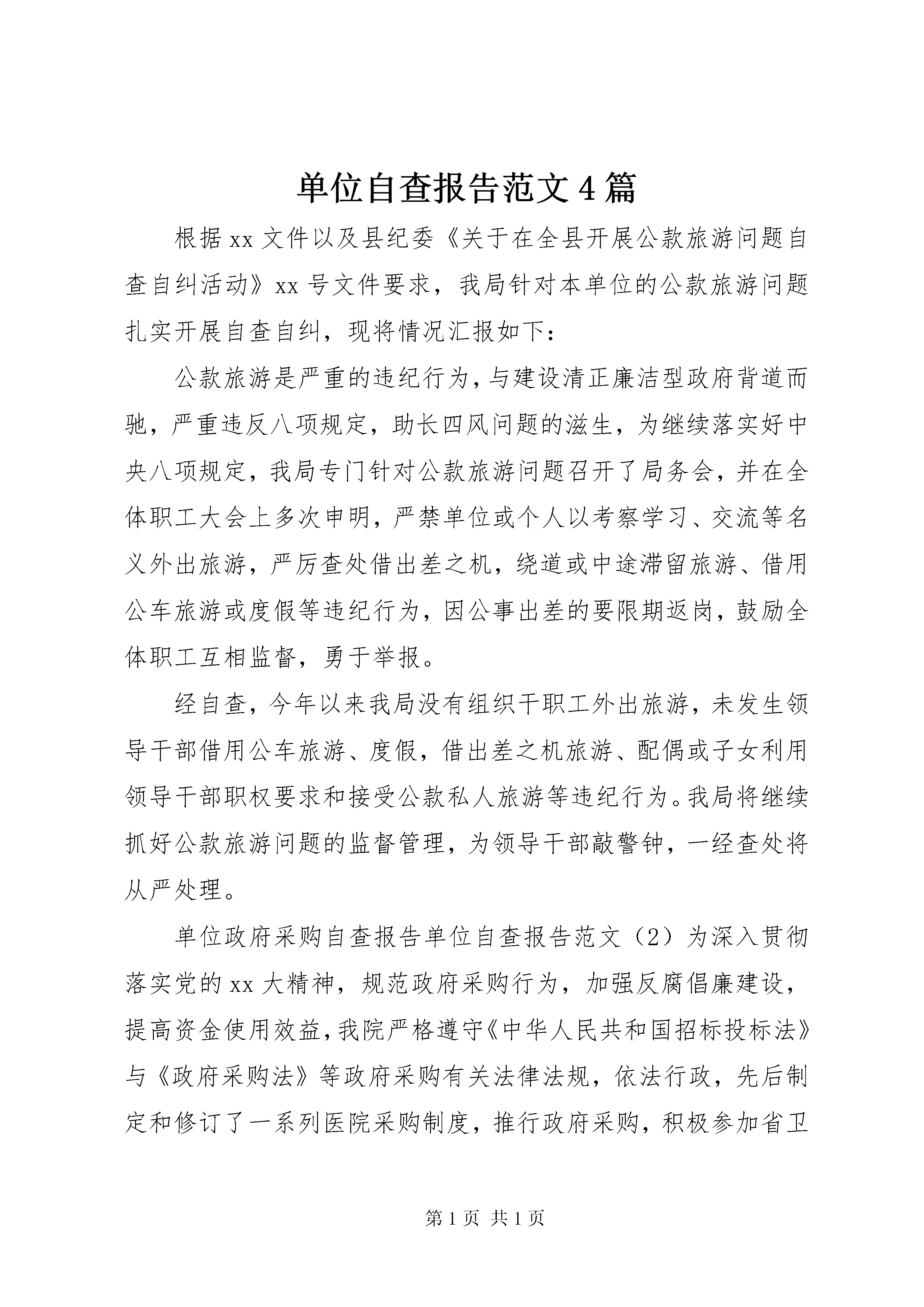 单位自查报告范文4篇根据xx文件以及县纪委《关于在全县开展公款旅游问题自查自纠活动》xx号文件要求,我局针对本单位的公款旅游问题扎实开展自查自纠,现将情况汇报如下:公款旅游是严重的违纪行为,与建设清正廉洁型政府背道而驰,严重违反八项规定,助长四风问题的滋生,为继续落实好中央八项规定,我局专门针对公款旅游问题召开了局务会,并在全体职工大会上多次申明,严禁单位或个人以考察学习、交流等名义外出旅游,严厉查处借出差之机,绕道或中途滞留旅游、借用公车旅游或度假等违纪行为,因公事出差的要限期返岗,鼓励全体职工互相监督,勇于举报。经自查,今年以来我局没有组织干职工外出旅游,未发生领导干部借用公车旅游、度假,借出差之机旅游、配偶或子女利用领导干部职权要求和接受公款私人旅游等违纪行为。我局将继续抓好公款旅游问题的监督管理,为领导干部敲警钟,一经查处将从严处理。单位政府采购自查报告单位自查报告范文(2)为深入贯彻落实党的xx大精神,规范政府采购行为,加强反腐倡廉建设,提高资金使用效益,我院严格遵守《中华人民共和国招标投标法》与《政府采购法》等政府采购有关法律法规,依法行政,先后制定和修订了一系列医院采购制度,推行政府采购,积极参加省卫生厅组织的药品、医用耗材等专用物资部门集中采购,加强院内分散采购的管理和监督,不断拓展政府采购范围和规模,努力规范采购行为,防止和预防腐败行为发生,实现依法采购、阳光采购。根据《XX省政府采购执行情况专项检查实施方案》要求,现将我院开展政府采购执行工作自查自纠情况作简要汇报。一、健全各项规章制度,严格依法采购为加强医院管理,促进医院反腐倡廉建设,我院根据《政府采购货物和服务招标投标管理办法》、《XX省省级政府采购管理暂行办法》、《XX省招投标条例》等规范性文件,结合实际,制定了一系列配套文件,并根据具体情况和上级新的精神对文件及时进行了更新和修订。主要规章如下:1、各项货物、服务、工程类的采购制度有《医院院内招标试行办法》、《加强基本建设和修缮工程管理的暂行规定》、《医院采购与付款内部控制制度》等。2、药品采购制度有《关于加强药品采购管理的实施意见》、《药品备案采购管理制度》、《协和医院新药引进管理办法》等。3、关于设备、医用耗材及试剂采购等制度有《关于进一步规范医疗设备采购的规定》、《关于医用耗材、检验试剂备案采购管理的暂行规定》、《关于医疗器械耗材特殊采购的规定》等。这些文件参与的职能部门多,涉及的采购范围广,既有关于政府采购的规定,也有院内公开招标采购制度,初步建立起了规范医院采购工作的基本制度框架。各采购科室依据要求,按照政府采购的目录范围和有关金额限定的规定,依据不同情况分别选择政府集中采购、部门集中采购、委托代理机构公开招标、院内公开招标等方式进行采购,做到凡纳入政府采购范围的,均选择政府采购方式,依政府采购程序进行采购;符合定点采购、协议采购的均按规定执行;凡没有达到政府采购金额起点或在政府采购范围外低于20万元的,执行院内采购有关规定,小额零星采购则由采购科室依据规定直接采购。院内公开招标参照政府采购程序制定,有张贴招标公告、制定招标文件、开标评标、发出中标通知、签订协议等采购程序。二、构建互补的采购格局,规范采购行为经过几年的实践和总结,目前我院凡纳入政府采购范围的基建工程、物资、设备采购均做好采购预算,按照规定上报省政府采购办或建设主管部门审批后委托具备资质的代理机构依法定程序进行公开招标。各采购部门的依法行政、依法采购意识不断提高,对有关法律法规更加熟悉,操作进一步规范,进入政府采购和委托代理机构公开招标采购的范围进一步拓宽,集中采购规范化和科学化程度不断提升,已经初步形成了集中采购、部门集中采购和分散采购三种形式并行的采购格局。xx、xx年度各部门采购情况如下:1、药品类,药学部xx年参加省卫生厅部门集中采购,合计采购金额为元,实际采购总金额为元,参加政府部门集中招标采购占总采购额的百分比达93.31%。xx年参加部门集中采购金额为元,实际采购总金额为3元,参加政府采购金额占总采购额的百分比达93.73%。2、货物、服务、修缮类,总务后勤部门按照规定,凡纳入省级政府采购目录范围内采购预算金额在20万元以上的货物类物资及专用设备均进行政府集中采购,在协议供货、定点采购、网上竞价范围内的均进入政府采购,政府采购范围外的20万元以上也委托代理机构进行公开招标,xx年参加政府采购金额为元,xx年参加政府采购金额为元。3、医疗器械、医用耗材、设备类,设备科依照规定预算金额20万元以上的医疗器械、设备采购均委托代理机构公开招标,医用耗材在省卫生厅组织的部门集中招标范围内的参加部门集中招标,范围外的部分委托代理机构公开招标,xx年参加部门集中采购金额为元,参加政府集中采购金额为元,