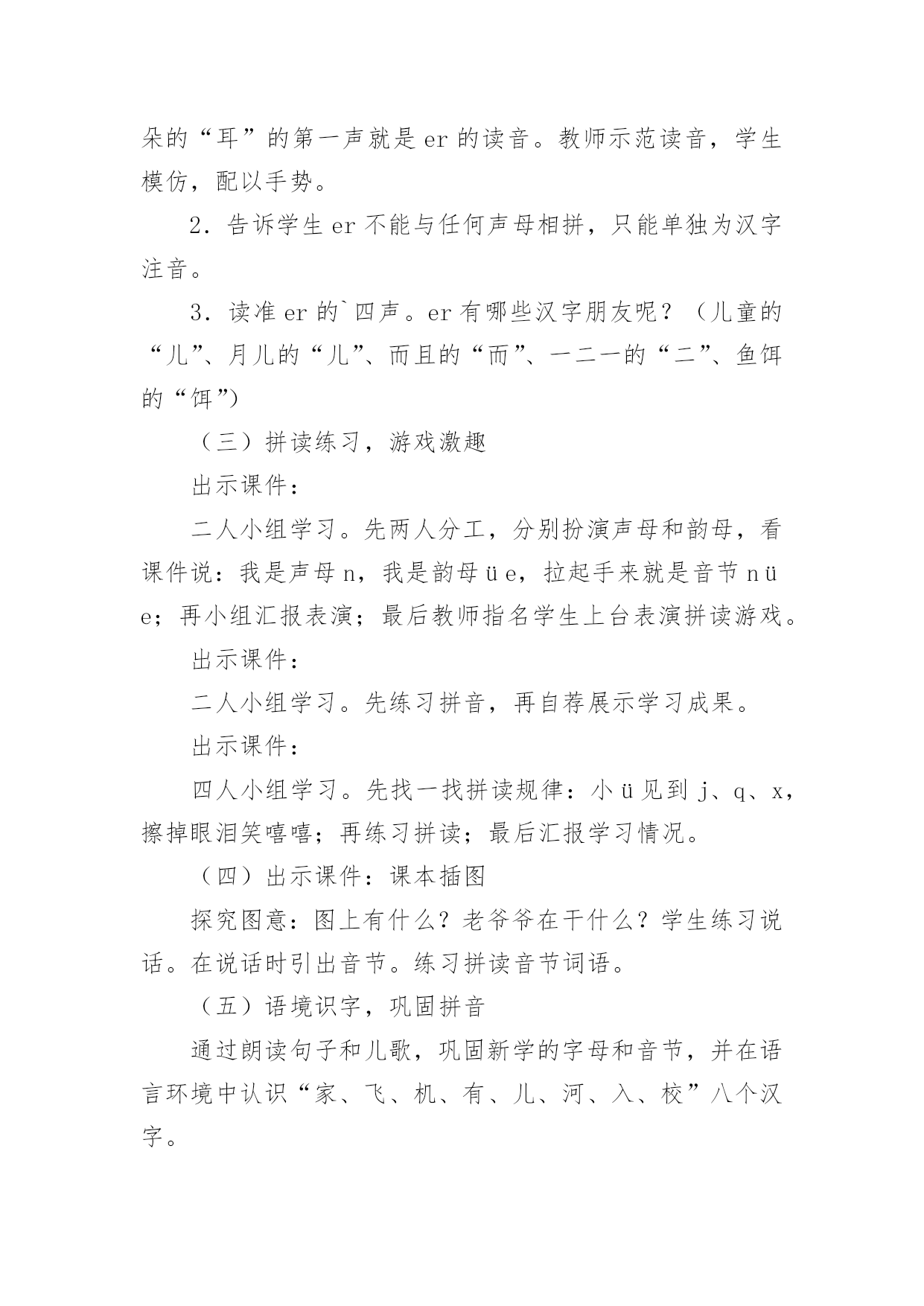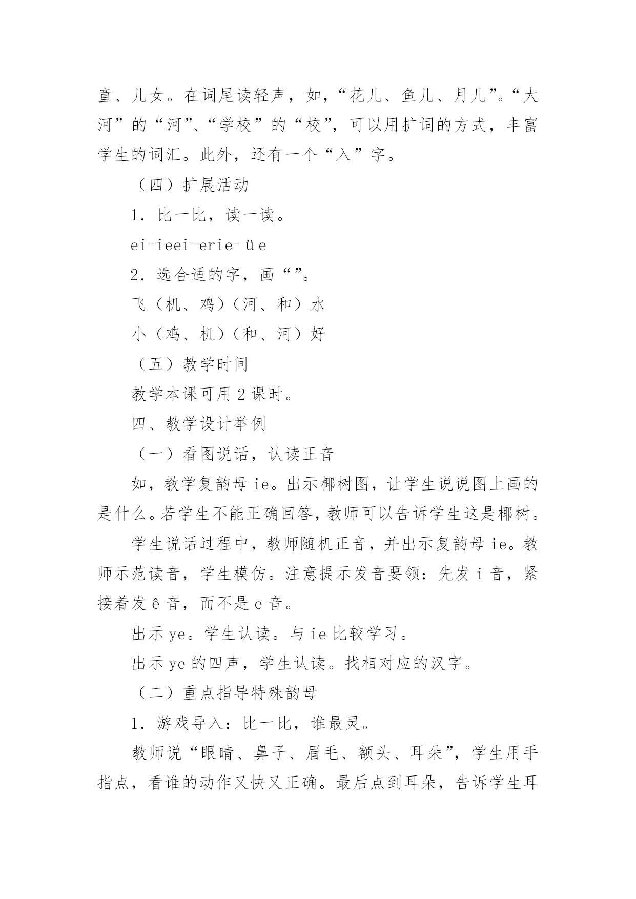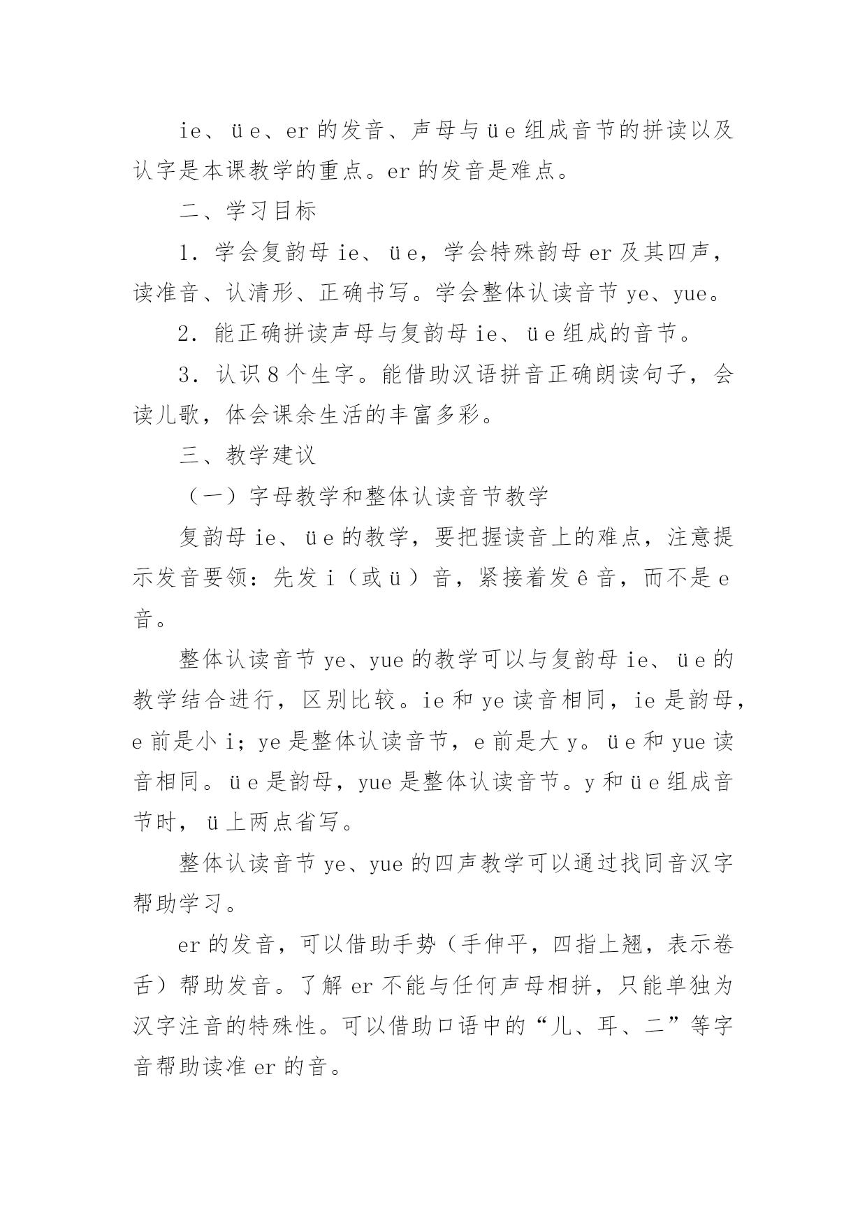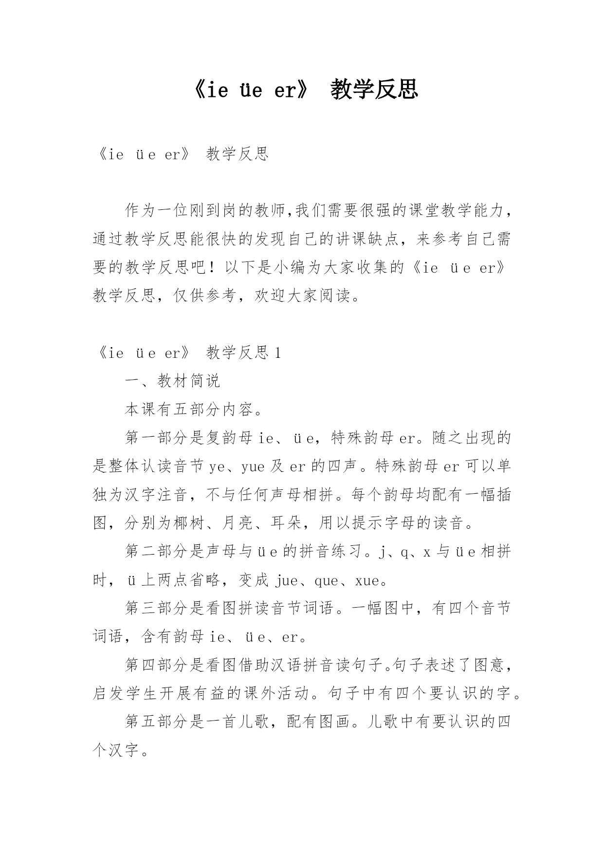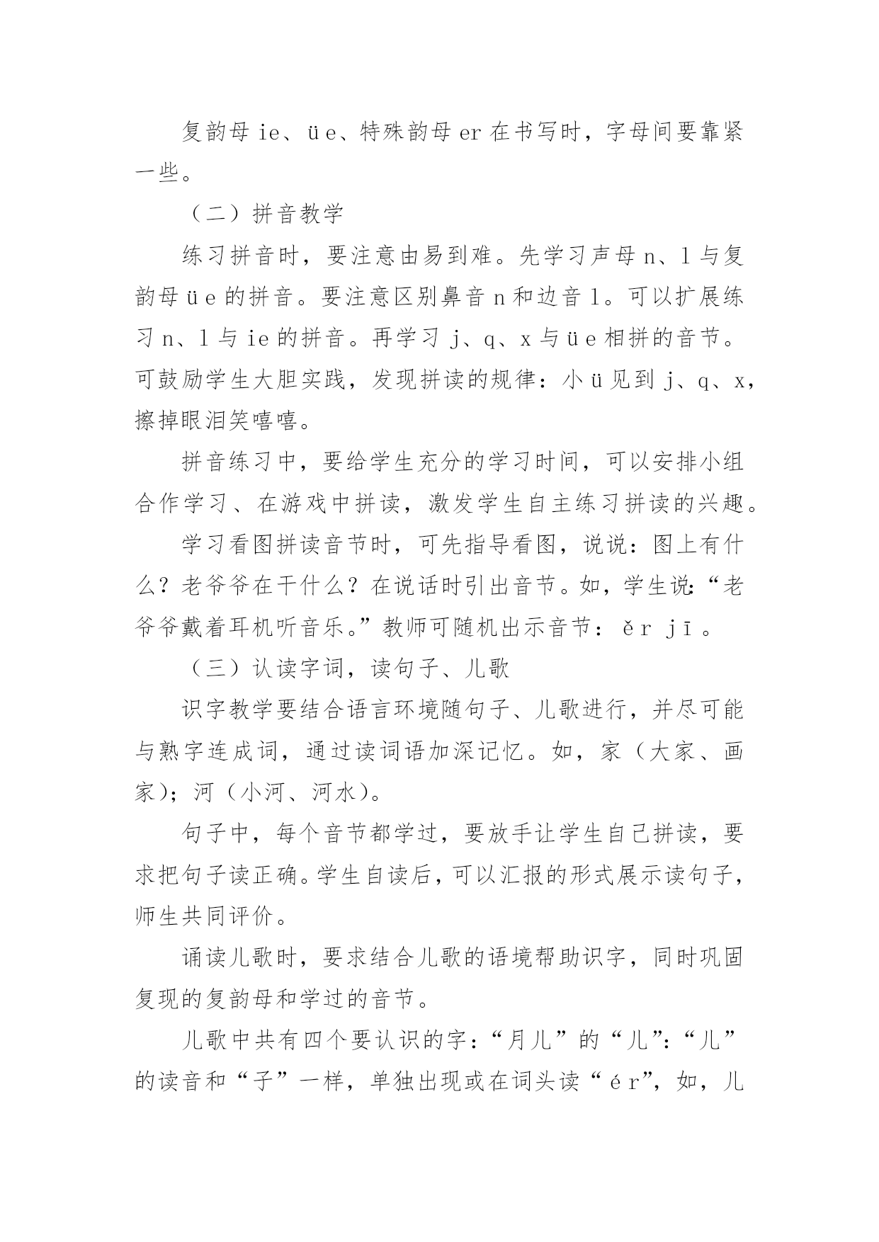 《ieüeer》教学反思 《ieüeer》教学反思作为一位刚到岗的教师,我们需要很强的课堂教学能力,通过教学反思能很快的发现自己的讲课缺点,来参考自己需要的教学反思吧!以下是小编为大家收集的《ieüeer》教学反思,仅供参考,欢迎大家阅读。《ieüeer》教学反思1一、教材简说本课有五部分内容。第一部分是复韵母ie、üe,特殊韵母er。随之出现的是整体认读音节ye、yue及er的四声。特殊韵母er可以单独为汉字注音,不与任何声母相拼。每个韵母均配有一幅插图,分别为椰树、月亮、耳朵,用以提示字母的读音。第二部分是声母与üe的拼音练习。j、q、x与üe相拼时,ü上两点省略,变成jue、que、xue。第三部分是看图拼读音节词语。一幅图中,有四个音节词语,含有韵母ie、üe、er。第四部分是看图借助汉语拼音读句子。句子表述了图意,启发学生开展有益的课外活动。句子中有四个要认识的字。第五部分是一首儿歌,配有图画。儿歌中有要认识的四个汉字。ie、üe、er的发音、声母与üe组成音节的拼读以及认字是本课教学的重点。er的发音是难点。二、学习目标1.学会复韵母ie、üe,学会特殊韵母er及其四声,读准音、认清形、正确书写。学会整体认读音节ye、yue。2.能正确拼读声母与复韵母ie、üe组成的音节。3.认识8个生字。能借助汉语拼音正确朗读句子,会读儿歌,体会课余生活的丰富多彩。三、教学建议(一)字母教学和整体认读音节教学复韵母ie、üe的教学,要把握读音上的难点,注意提示发音要领:先发i(或ü)音,紧接着发ê音,而不是e音。整体认读音节ye、yue的教学可以与复韵母ie、üe的教学结合进行,区别比较。ie和ye读音相同,ie是韵母,e前是小i;ye是整体认读音节,e前是大y。üe和yue读音相同。üe是韵母,yue是整体认读音节。y和üe组成音节时,ü上两点省写。整体认读音节ye、yue的四声教学可以通过找同音汉字帮助学习。er的发音,可以借助手势(手伸平,四指上翘,表示卷舌)帮助发音。了解er不能与任何声母相拼,只能单独为汉字注音的特殊性。可以借助口语中的“儿、耳、二”等字音帮助读准er的音。复韵母ie、üe、特殊韵母er在书写时,字母间要靠紧一些。(二)拼音教学练习拼音时,要注意由易到难。先学习声母n、l与复韵母üe的拼音。要注意区别鼻音n和边音l。可以扩展练习n、l与ie的拼音。再学习j、q、x与üe相拼的音节。可鼓励学生大胆实践,发现拼读的规律:小ü见到j、q、x,擦掉眼泪笑嘻嘻。拼音练习中,要给学生充分的学习时间,可以安排小组合作学习、在游戏中拼读,激发学生自主练习拼读的兴趣。学习看图拼读音节时,可先指导看图,说说:图上有什么?老爷爷在干什么?在说话时引出音节。如,学生说:“老爷爷戴着耳机听音乐。”教师可随机出示音节:ěrjī。(三)认读字词,读句子、儿歌识字教学要结合语言环境随句子、儿歌进行,并尽可能与熟字连成词,通过读词语加深记忆。如,家(大家、画家);河(小河、河水)。句子中,每个音节都学过,要放手让学生自己拼读,要求把句子读正确。学生自读后,可以汇报的形式展示读句子,师生共同评价。诵读儿歌时,要求结合儿歌的语境帮助识字,同时巩固复现的复韵母和学过的音节。儿歌中共有四个要认识的字:“月儿”的“儿”:“儿”的读音和“子”一样,单独出现或在词头读“ér”,如,儿童、儿女。在词尾读轻声,如,“花儿、鱼儿、月儿”。“大河”的“河”、“学校”的“校”,可以用扩词的方式,丰富学生的词汇。此外,还有一个“入”字。(四)扩展活动1.比一比,读一读。ei-ieei-erie-üe2.选合适的字,画“”。飞(机、鸡)(河、和)水小(鸡、机)(和、河)好(五)教学时间教学本课可用2课时。四、教学设计举例(一)看图说话,认读正音如,教学复韵母ie。出示椰树图,让学生说说图上画的是什么。若学生不能正确回答,教师可以告诉学生这是椰树。学生说话过程中,教师随机正音,并出示复韵母ie。教师示范读音,学生模仿。注意提示发音要领:先发i音,紧接着发ê音,而不是e音。出示ye。学生认读。与ie比较学习。出示ye的四声,学生认读。找相对应的汉字。(二)重点指导特殊韵母1.游戏导入:比一比,谁最灵。教师说“眼睛、鼻子、眉毛、额头、耳朵”,学生用手指点,看谁的动作又快又正确。最后点到耳朵,告诉学生耳朵的“耳”的第一声就是er的读音。教师示范读音,学生模仿,配以手势。2.告诉学生er不能与任何声母相拼,只能单独为汉字注音。3.读准er的`四声。er有哪些汉字朋友呢?(儿童的“儿”、月儿的“儿”、而且的“而”、一二一的“二”、鱼饵的“饵”)(三)拼读练习,游戏激趣出示课件:二人小组学习。先两人分工,分别扮演声母和韵母,看课件说:我是声母n,我是韵母üe,拉起手来就是音节
