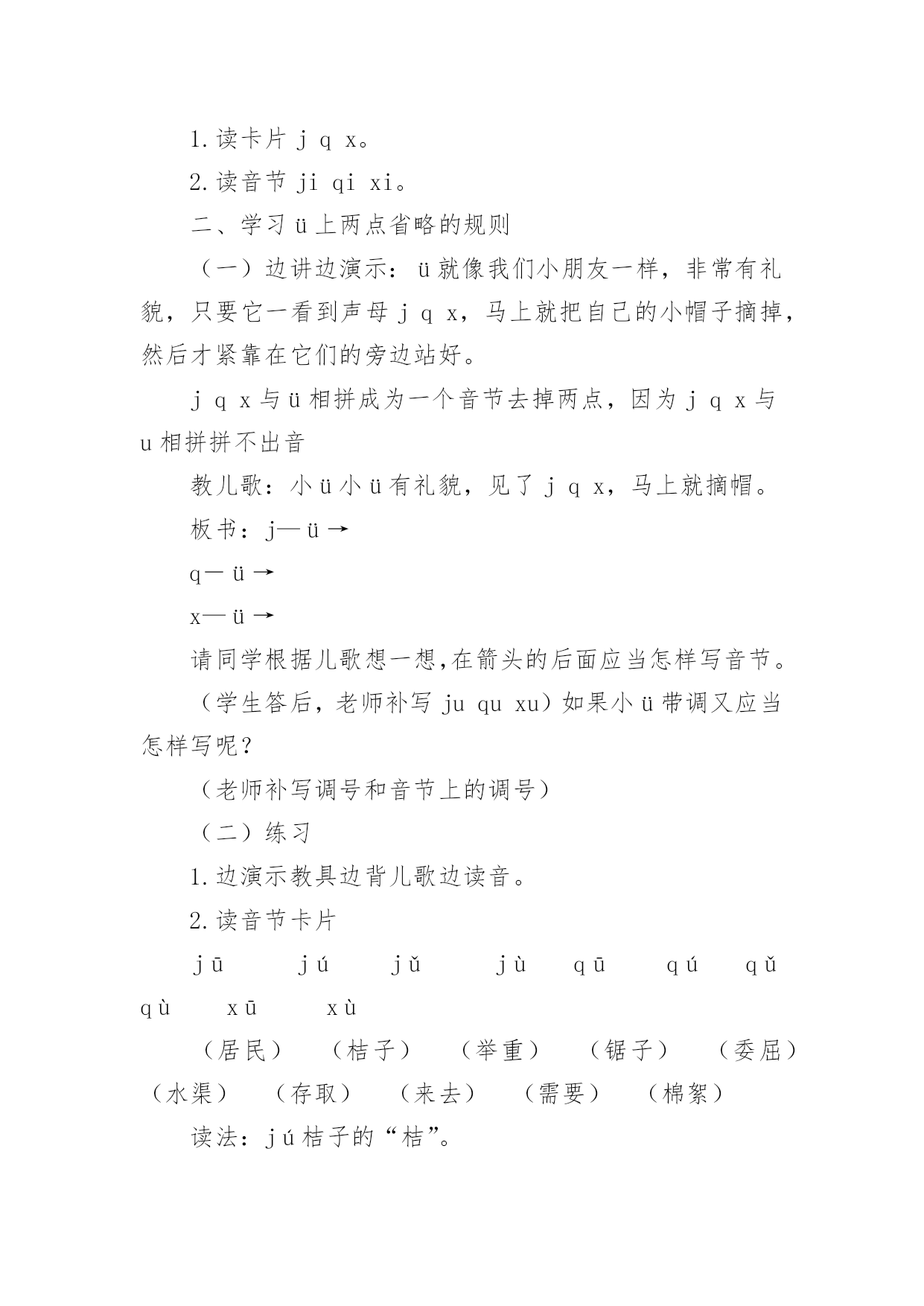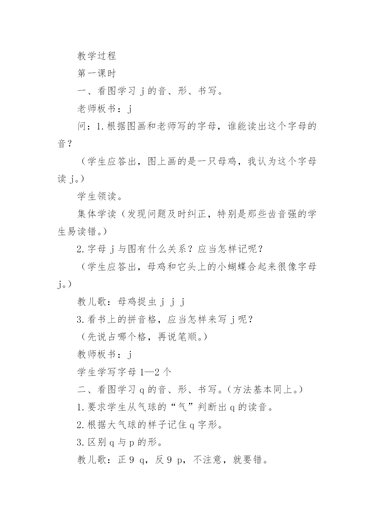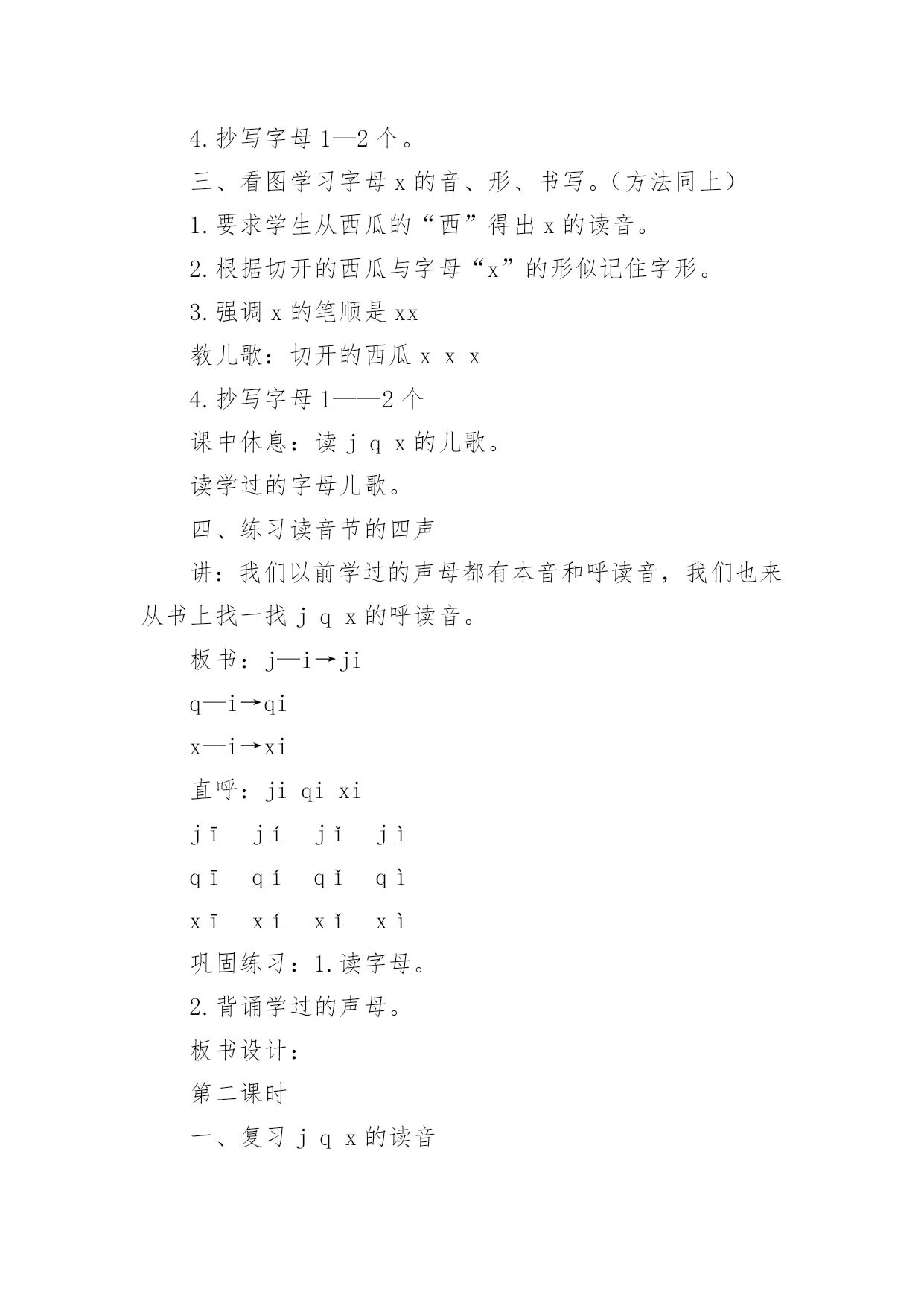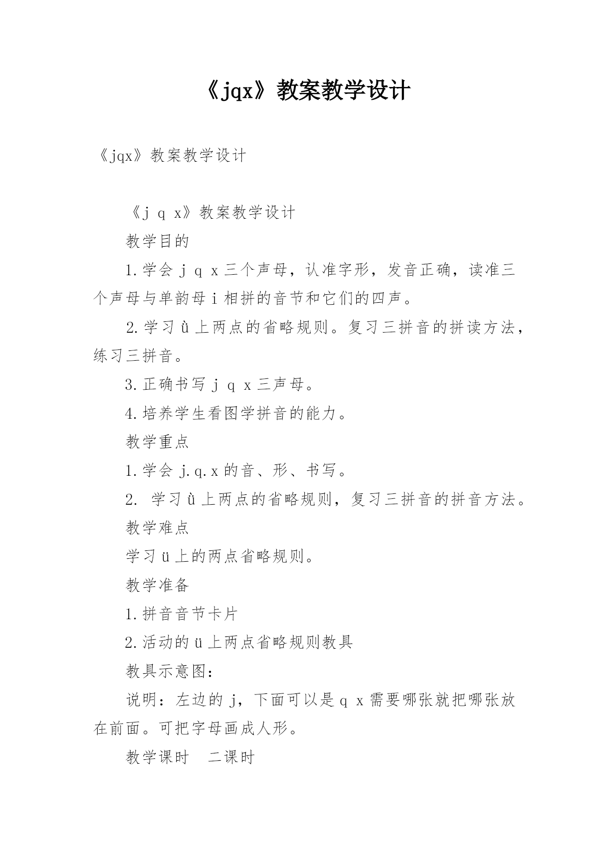 《jqx》教案教学设计 《jqx》教案教学设计《jqx》教案教学设计教学目的1.学会jqx三个声母,认准字形,发音正确,读准三个声母与单韵母i相拼的音节和它们的四声。2.学习ǜ上两点的省略规则。复习三拼音的拼读方法,练习三拼音。3.正确书写jqx三声母。4.培养学生看图学拼音的能力。教学重点1.学会j.q.x的音、形、书写。2.学习ǜ上两点的省略规则,复习三拼音的拼音方法。教学难点学习ü上的两点省略规则。教学准备1.拼音音节卡片2.活动的ü上两点省略规则教具教具示意图:说明:左边的j,下面可以是qx需要哪张就把哪张放在前面。可把字母画成人形。教学课时二课时教学过程第一课时一、看图学习j的音、形、书写。老师板书:j问:1.根据图画和老师写的字母,谁能读出这个字母的音?(学生应答出,图上画的是一只母鸡,我认为这个字母读j。)学生领读。集体学读(发现问题及时纠正,特别是那些齿音强的学生易读错。)2.字母j与图有什么关系?应当怎样记呢?(学生应答出,母鸡和它头上的小蝴蝶合起来很像字母j。)教儿歌:母鸡捉虫jjj3.看书上的拼音格,应当怎样来写j呢?(先说占哪个格,再说笔顺。)教师板书:j学生学写字母1—2个二、看图学习q的音、形、书写。(方法基本同上。)1.要求学生从气球的“气”判断出q的读音。2.根据大气球的样子记住q字形。3.区别q与p的形。教儿歌:正9q,反9p,不注意,就要错。4.抄写字母1—2个。三、看图学习字母x的音、形、书写。(方法同上)1.要求学生从西瓜的“西”得出x的读音。2.根据切开的西瓜与字母“x”的形似记住字形。3.强调x的笔顺是xx教儿歌:切开的西瓜xxx4.抄写字母1——2个课中休息:读jqx的儿歌。读学过的字母儿歌。四、练习读音节的四声讲:我们以前学过的声母都有本音和呼读音,我们也来从书上找一找jqx的呼读音。板书:j—i→jiq—i→qix—i→xi直呼:jiqixijījíjǐjìqīqíqǐqìxīxíxǐxì巩固练习:1.读字母。2.背诵学过的声母。板书设计:第二课时一、复习jqx的读音1.读卡片jqx。2.读音节jiqixi。二、学习ü上两点省略的规则(一)边讲边演示:ü就像我们小朋友一样,非常有礼貌,只要它一看到声母jqx,马上就把自己的小帽子摘掉,然后才紧靠在它们的旁边站好。jqx与ü相拼成为一个音节去掉两点,因为jqx与u相拼拼不出音教儿歌:小ü小ü有礼貌,见了jqx,马上就摘帽。板书:j—ü→q-ü→x—ü→请同学根据儿歌想一想,在箭头的后面应当怎样写音节。(学生答后,老师补写juquxu)如果小ü带调又应当怎样写呢?(老师补写调号和音节上的调号)(二)练习1.边演示教具边背儿歌边读音。2.读音节卡片jūjújǔjùqūqúqǔqùxūxù(居民)(桔子)(举重)(锯子)(委屈)(水渠)(存取)(来去)(需要)(棉絮)读法:jú桔子的“桔”。课中休息:小表演(选一位最有礼貌的小同学扮演ü,选三位同学分别扮演jqx。他们从教室的两边向中间走,小ü先摘帽向j问好,然后与j站在一起,集体直呼音,其它两个同j。)三、练习三拼音板书:方法:1.背三拼连读的儿歌“声轻,介快,韵母响,三音连读很顺当。”2.反复练习拼读,体会和掌握方法。四、巩固练习1.读本课的字母和音节2.直呼训练:jiqixijuquxujiaqiaxiajīqīxījūqūxūjiāqiāxiā板书设计:
