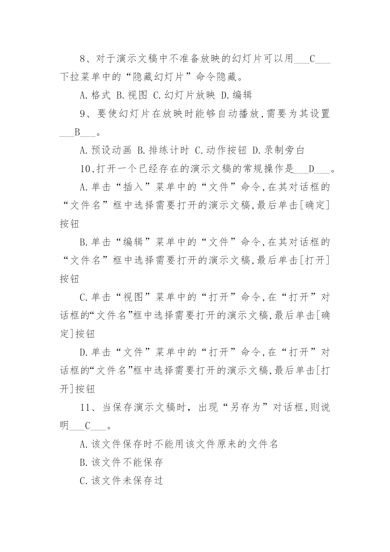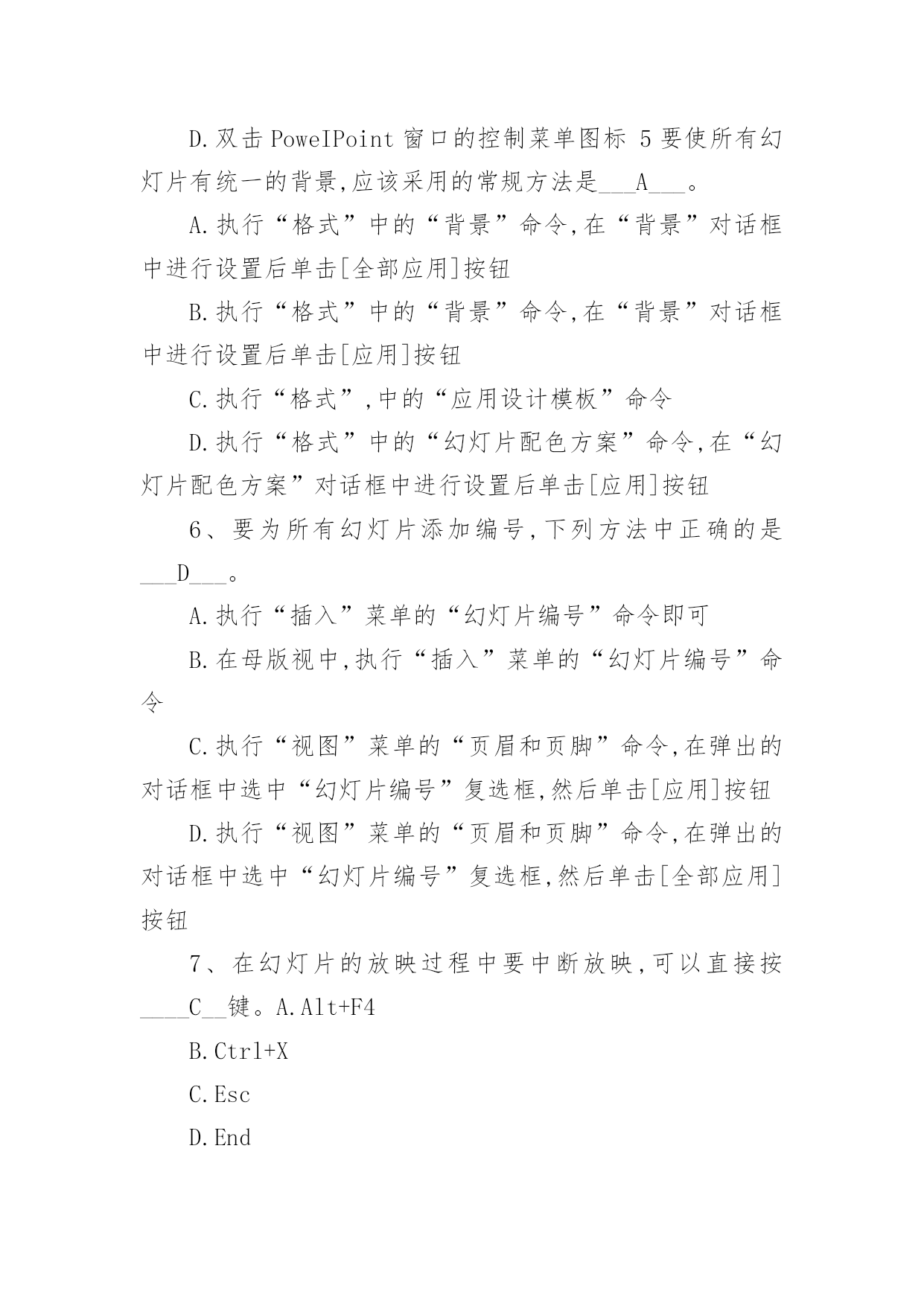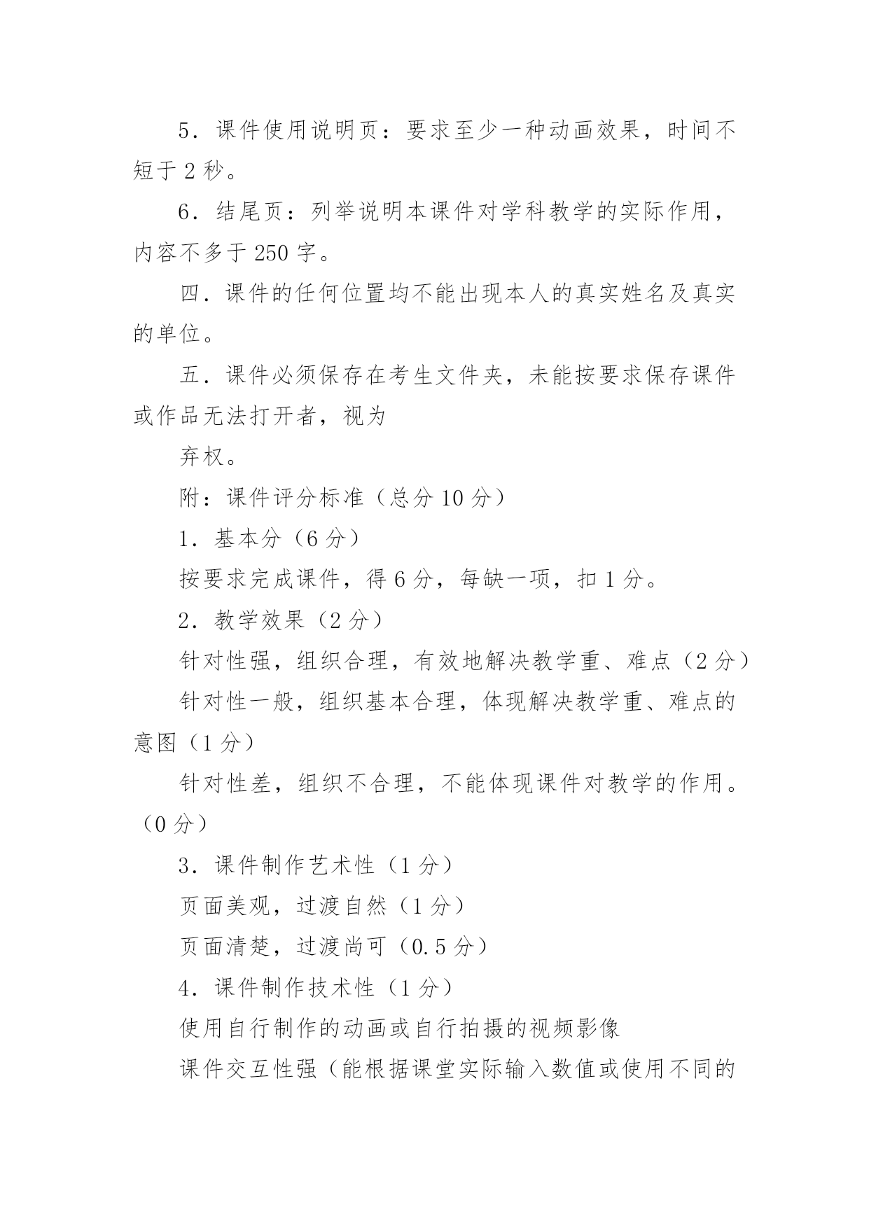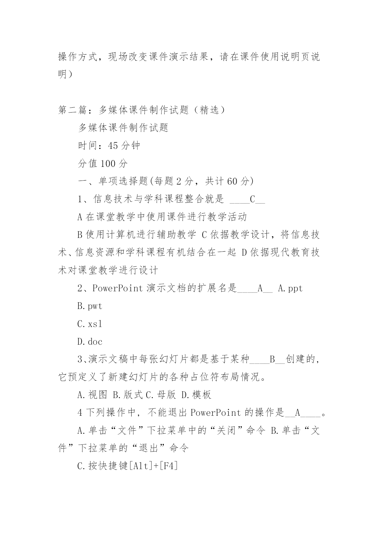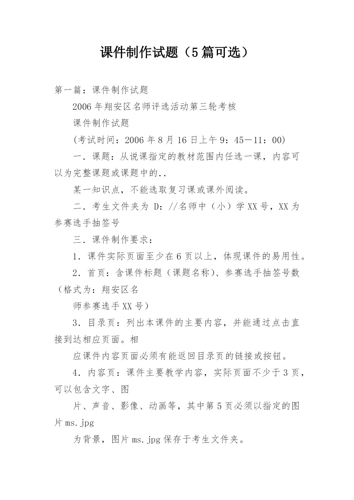课件制作试题(5篇可选) 第一篇:课件制作试题2006年翔安区名师评选活动第三轮考核课件制作试题(考试时间:2006年8月16日上午9:45-11:00)一.课题:从说课指定的教材范围内任选一课,内容可以为完整课题或课题中的..某一知识点,不能选取复习课或课外阅读。二.考生文件夹为D://名师中(小)学XX号,XX为参赛选手抽签号三.课件制作要求:1.课件实际页面至少在6页以上,体现课件的易用性。2.首页:含课件标题(课题名称)、参赛选手抽签号数(格式为:翔安区名师参赛选手XX号)3.目录页:列出本课件的主要内容,并能通过点击直接到达相应页面。相应课件内容页面必须有能返回目录页的链接或按钮。4.内容页:课件主要教学内容,实际页面不少于3页,可以包含文字、图片、声音、影像、动画等,其中必须以指定的图片ms.jpg为背景,图片ms.jpg保存于考生文件夹。5.课件使用说明页:要求至少一种动画效果,时间不短于2秒。6.结尾页:列举说明本课件对学科教学的实际作用,内容不多于250字。四.课件的任何位置均不能出现本人的真实姓名及真实的单位。五.课件必须保存在考生文件夹,未能按要求保存课件或作品无法打开者,视为弃权。附:课件评分标准(总分10分)1.基本分(6分)按要求完成课件,得6分,每缺一项,扣1分。2.教学效果(2分)针对性强,组织合理,有效地解决教学重、难点(2分)针对性一般,组织基本合理,体现解决教学重、难点的意图(1分)针对性差,组织不合理,不能体现课件对教学的作用。(0分)3.课件制作艺术性(1分)页面美观,过渡自然(1分)页面清楚,过渡尚可(0.5分)4.课件制作技术性(1分)使用自行制作的动画或自行拍摄的视频影像课件交互性强(能根据课堂实际输入数值或使用不同的操作方式,现场改变课件演示结果,请在课件使用说明页说明)第二篇:多媒体课件制作试题(精选)多媒体课件制作试题时间:45分钟分值100分一、单项选择题(每题2分,共计60分)1、信息技术与学科课程整合就是____C__A在课堂教学中使用课件进行教学活动B使用计算机进行辅助教学C依据教学设计,将信息技术、信息资源和学科课程有机结合在一起D依据现代教育技术对课堂教学进行设计2、PowerPoint演示文档的扩展名是____A__A.pptB.pwtC.xslD.doc3、演示文稿中每张幻灯片都是基于某种____B__创建的,它预定义了新建幻灯片的各种占位符布局情况。A.视图B.版式C.母版D.模板4下列操作中,不能退出PowerPoint的操作是__A____。A.单击“文件”下拉菜单中的“关闭”命令B.单击“文件”下拉菜单的“退出”命令C.按快捷键[Alt]+[F4]D.双击PoweIPoint窗口的控制菜单图标5要使所有幻灯片有统一的背景,应该采用的常规方法是___A___。A.执行“格式”中的“背景”命令,在“背景”对话框中进行设置后单击[全部应用]按钮B.执行“格式”中的“背景”命令,在“背景”对话框中进行设置后单击[应用]按钮C.执行“格式”,中的“应用设计模板”命令D.执行“格式”中的“幻灯片配色方案”命令,在“幻灯片配色方案”对话框中进行设置后单击[应用]按钮6、要为所有幻灯片添加编号,下列方法中正确的是___D___。A.执行“插入”菜单的“幻灯片编号”命令即可B.在母版视中,执行“插入”菜单的“幻灯片编号”命令C.执行“视图”菜单的“页眉和页脚”命令,在弹出的对话框中选中“幻灯片编号”复选框,然后单击[应用]按钮D.执行“视图”菜单的“页眉和页脚”命令,在弹出的对话框中选中“幻灯片编号”复选框,然后单击[全部应用]按钮7、在幻灯片的放映过程中要中断放映,可以直接按____C__键。A.Alt+F4B.Ctrl+XC.EscD.End8、对于演示文稿中不准备放映的幻灯片可以用___C___下拉菜单中的“隐藏幻灯片”命令隐藏。A.格式B.视图C.幻灯片放映D.编辑9、要使幻灯片在放映时能够自动播放,需要为其设置___B___。A.预设动画B.排练计时C.动作按钮D.录制旁白10、打开一个已经存在的演示文稿的常规操作是___D___。A.单击“插入”菜单中的“文件”命令,在其对话框的“文件名”框中选择需要打开的演示文稿,最后单击[确定]按钮B.单击“编辑”菜单中的“文件”命令,在其对话框的“文件名”框中选择需要打开的演示文稿,最后单击[打开]按钮C.单击“视图”菜单中的“打开”命令,在“打开”对话框的“文件名”框中选择需要打开的演示文稿,最后单击[确定]按钮D.单击“文件”菜单中的“打开”命令,在“打开”对话框的“文件名”框中选择需要打开的演示文稿,最后单击[打开]按钮11、当保存演示文稿时,出现“另存为”对话框,则说明___C___。A.该文件保存时不能用