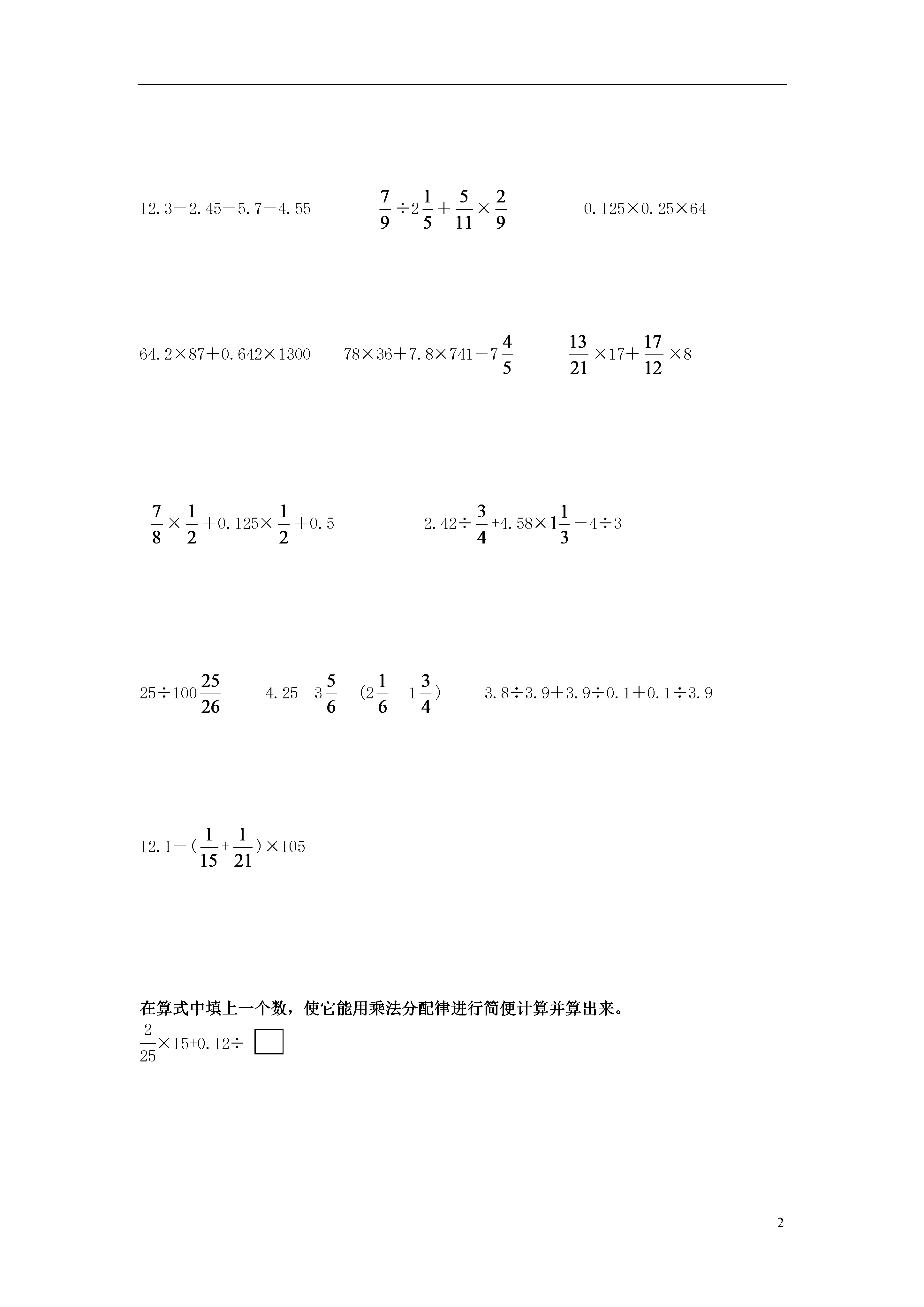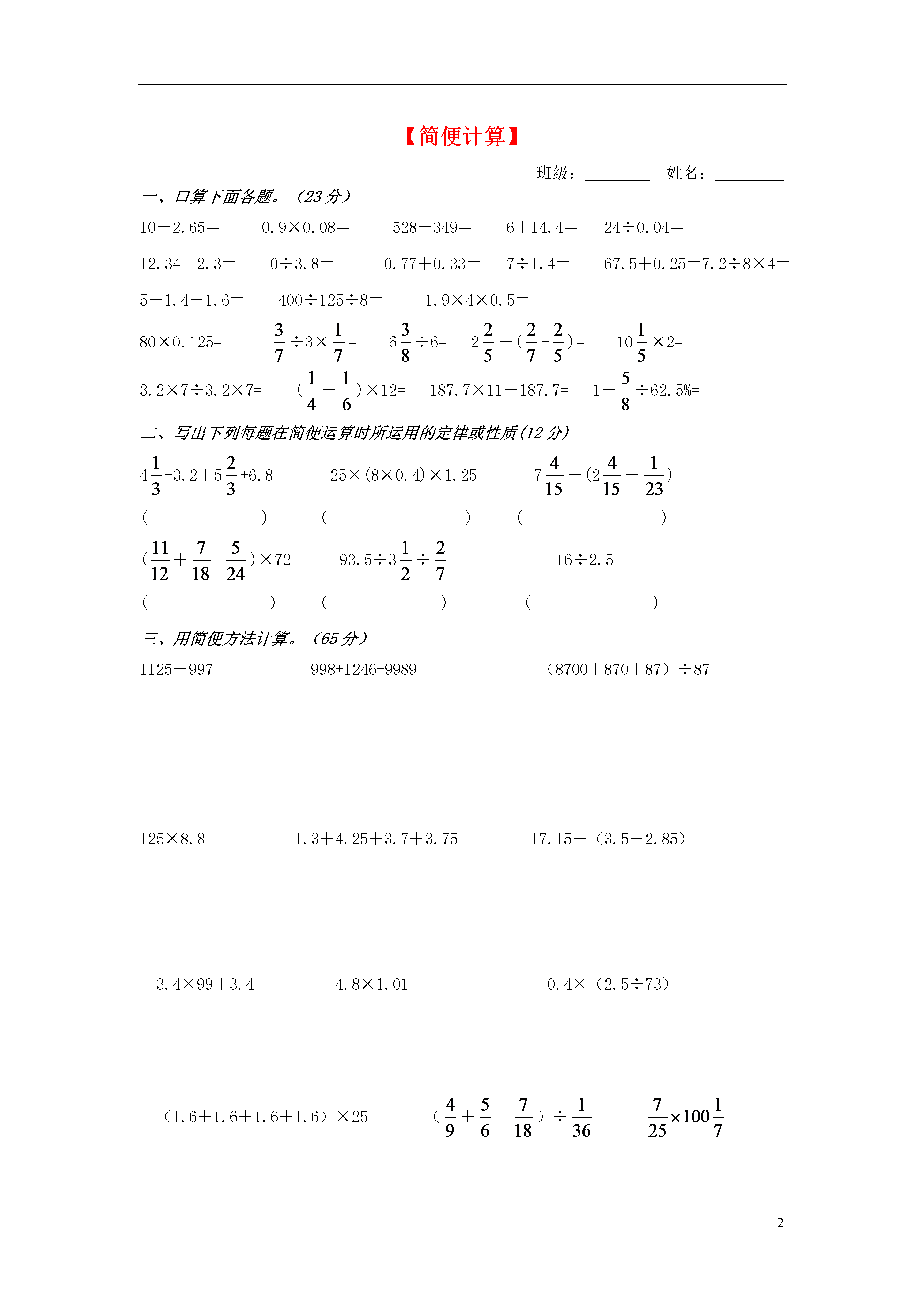 2【简便计算】班级:姓名:一、口算下面各题。(23分)10-2.65=0.9×0.08=528-349=6+14.4=24÷0.04=12.34-2.3=0÷3.8=0.77+0.33=7÷1.4=67.5+0.25=7.2÷8×4=5-1.4-1.6=400÷125÷8=1.9×4×0.5=80×0.125=÷3×=6÷6=2-(+)=10×2=3.2×7÷3.2×7=(-)×12=187.7×11-187.7=1-÷62.5%=二、写出下列每题在简便运算时所运用的定律或性质(12分)4+3.2+5+6.825×(8×0.4)×1.257-(2-)()()()(++)×7293.5÷3÷16÷2.5()()()三、用简便方法计算。(65分)1125-997998+1246+9989(8700+870+87)÷87125×8.81.3+4.25+3.7+3.7517.15-(3.5-2.85)3.4×99+3.44.8×1.010.4×(2.5÷73)(1.6+1.6+1.6+1.6)×25(+-)÷12.3-2.45-5.7-4.55÷2+×0.125×0.25×6464.2×87+0.642×130078×36+7.8×741-7×17+×8×+0.125×+0.52.42÷+4.58×-4÷325÷1004.25-3-(2-1)3.8÷3.9+3.9÷0.1+0.1÷3.912.1-(+)×105在算式中填上一个数,使它能用乘法分配律进行简便计算并算出来。EQ\F(2,25)×15+0.12÷