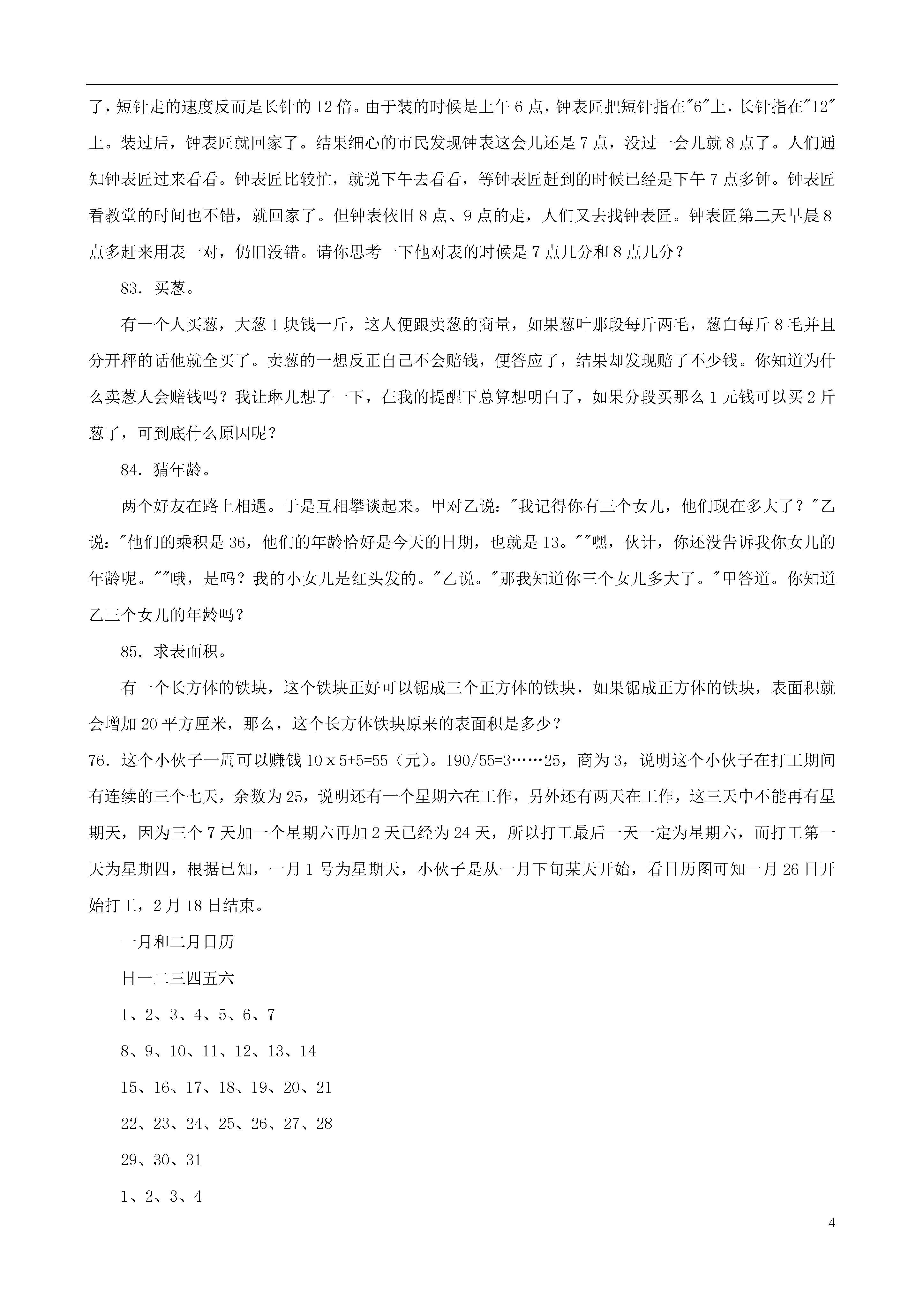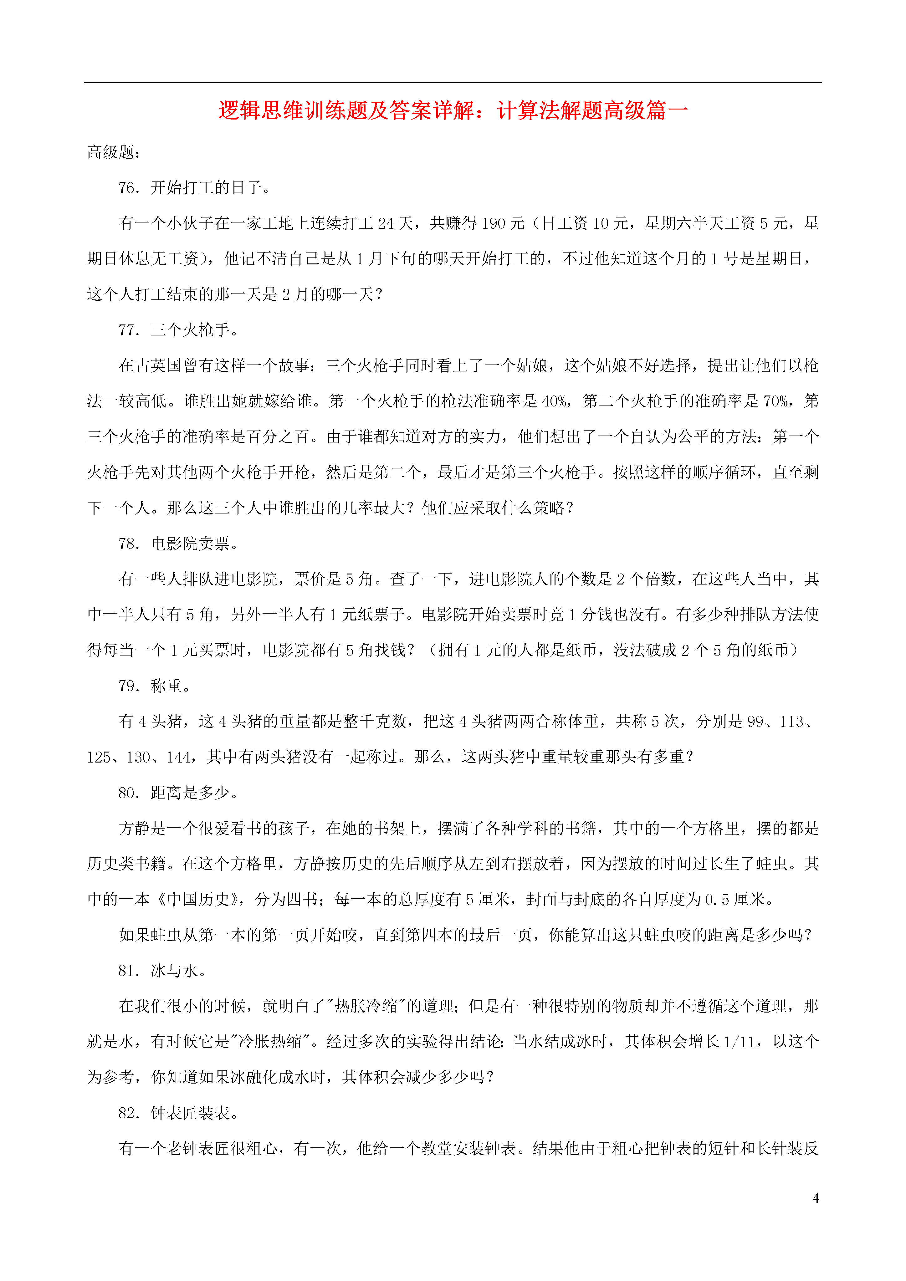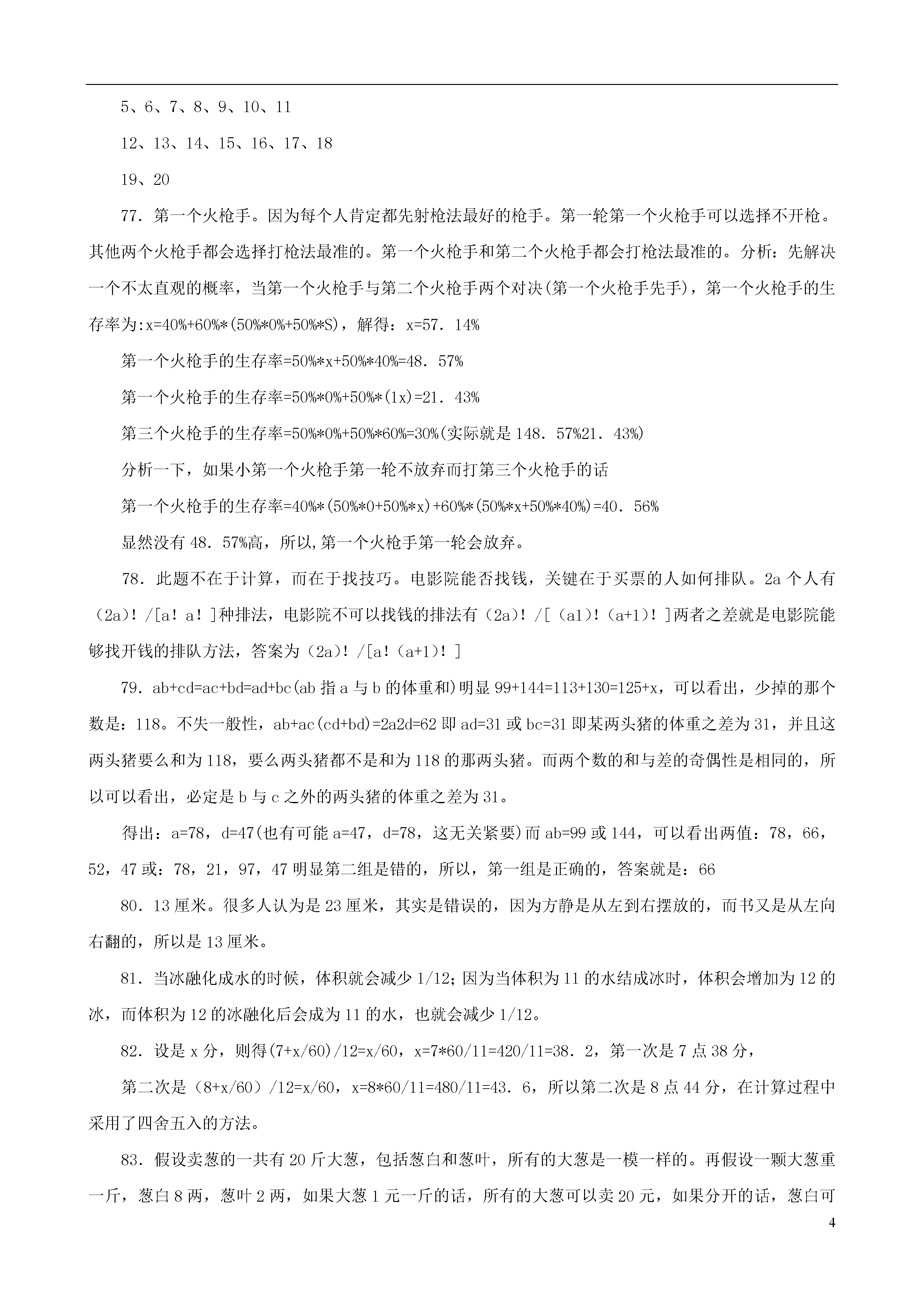 4逻辑思维训练题及答案详解:计算法解题高级篇一高级题:76.开始打工的日子。有一个小伙子在一家工地上连续打工24天,共赚得190元(日工资10元,星期六半天工资5元,星期日休息无工资),他记不清自己是从1月下旬的哪天开始打工的,不过他知道这个月的1号是星期日,这个人打工结束的那一天是2月的哪一天?77.三个火枪手。在古英国曾有这样一个故事:三个火枪手同时看上了一个姑娘,这个姑娘不好选择,提出让他们以枪法一较高低。谁胜出她就嫁给谁。第一个火枪手的枪法准确率是40%,第二个火枪手的准确率是70%,第三个火枪手的准确率是百分之百。由于谁都知道对方的实力,他们想出了一个自认为公平的方法:第一个火枪手先对其他两个火枪手开枪,然后是第二个,最后才是第三个火枪手。按照这样的顺序循环,直至剩下一个人。那么这三个人中谁胜出的几率最大?他们应采取什么策略?78.电影院卖票。有一些人排队进电影院,票价是5角。查了一下,进电影院人的个数是2个倍数,在这些人当中,其中一半人只有5角,另外一半人有1元纸票子。电影院开始卖票时竟1分钱也没有。有多少种排队方法使得每当一个1元买票时,电影院都有5角找钱?(拥有1元的人都是纸币,没法破成2个5角的纸币)79.称重。有4头猪,这4头猪的重量都是整千克数,把这4头猪两两合称体重,共称5次,分别是99、113、125、130、144,其中有两头猪没有一起称过。那么,这两头猪中重量较重那头有多重?80.距离是多少。方静是一个很爱看书的孩子,在她的书架上,摆满了各种学科的书籍,其中的一个方格里,摆的都是历史类书籍。在这个方格里,方静按历史的先后顺序从左到右摆放着,因为摆放的时间过长生了蛀虫。其中的一本《中国历史》,分为四书;每一本的总厚度有5厘米,封面与封底的各自厚度为0.5厘米。如果蛀虫从第一本的第一页开始咬,直到第四本的最后一页,你能算出这只蛀虫咬的距离是多少吗?81.冰与水。在我们很小的时候,就明白了"热胀冷缩"的道理;但是有一种很特别的物质却并不遵循这个道理,那就是水,有时候它是"冷胀热缩"。经过多次的实验得出结论:当水结成冰时,其体积会增长1/11,以这个为参考,你知道如果冰融化成水时,其体积会减少多少吗?82.钟表匠装表。有一个老钟表匠很粗心,有一次,他给一个教堂安装钟表。结果他由于粗心把钟表的短针和长针装反了,短针走的速度反而是长针的12倍。由于装的时候是上午6点,钟表匠把短针指在"6"上,长针指在"12"上。装过后,钟表匠就回家了。结果细心的市民发现钟表这会儿还是7点,没过一会儿就8点了。人们通知钟表匠过来看看。钟表匠比较忙,就说下午去看看,等钟表匠赶到的时候已经是下午7点多钟。钟表匠看教堂的时间也不错,就回家了。但钟表依旧8点、9点的走,人们又去找钟表匠。钟表匠第二天早晨8点多赶来用表一对,仍旧没错。请你思考一下他对表的时候是7点几分和8点几分?83.买葱。有一个人买葱,大葱1块钱一斤,这人便跟卖葱的商量,如果葱叶那段每斤两毛,葱白每斤8毛并且分开秤的话他就全买了。卖葱的一想反正自己不会赔钱,便答应了,结果却发现赔了不少钱。你知道为什么卖葱人会赔钱吗?我让琳儿想了一下,在我的提醒下总算想明白了,如果分段买那么1元钱可以买2斤葱了,可到底什么原因呢?84.猜年龄。两个好友在路上相遇。于是互相攀谈起来。甲对乙说:"我记得你有三个女儿,他们现在多大了?"乙说:"他们的乘积是36,他们的年龄恰好是今天的日期,也就是13。""嘿,伙计,你还没告诉我你女儿的年龄呢。""哦,是吗?我的小女儿是红头发的。"乙说。"那我知道你三个女儿多大了。"甲答道。你知道乙三个女儿的年龄吗?85.求表面积。有一个长方体的铁块,这个铁块正好可以锯成三个正方体的铁块,如果锯成正方体的铁块,表面积就会增加20平方厘米,那么,这个长方体铁块原来的表面积是多少?76.这个小伙子一周可以赚钱10ⅹ5+5=55(元)。190/55=3……25,商为3,说明这个小伙子在打工期间有连续的三个七天,余数为25,说明还有一个星期六在工作,另外还有两天在工作,这三天中不能再有星期天,因为三个7天加一个星期六再加2天已经为24天,所以打工最后一天一定为星期六,而打工第一天为星期四,根据已知,一月1号为星期天,小伙子是从一月下旬某天开始,看日历图可知一月26日开始打工,2月18日结束。一月和二月日历日一二三四五六1、2、3、4、5、6、78、9、10、11、12、13、1415、16、17、18、19、20、2122、23、24、25、26、27、2829、30、311、2、3、45、6、7、8、9、10、1112、13、14、15、16、17、1819、2077.第一个火枪手