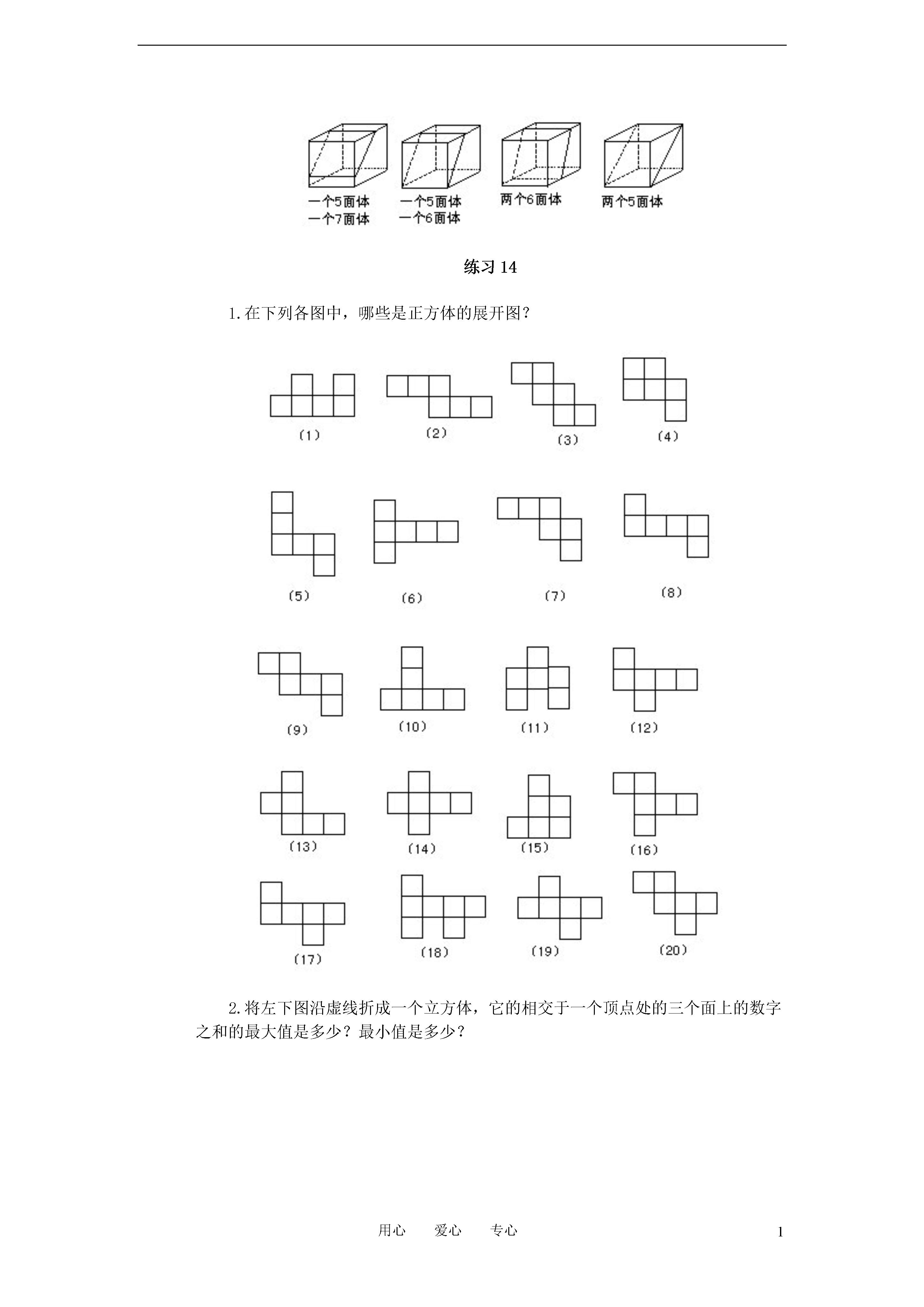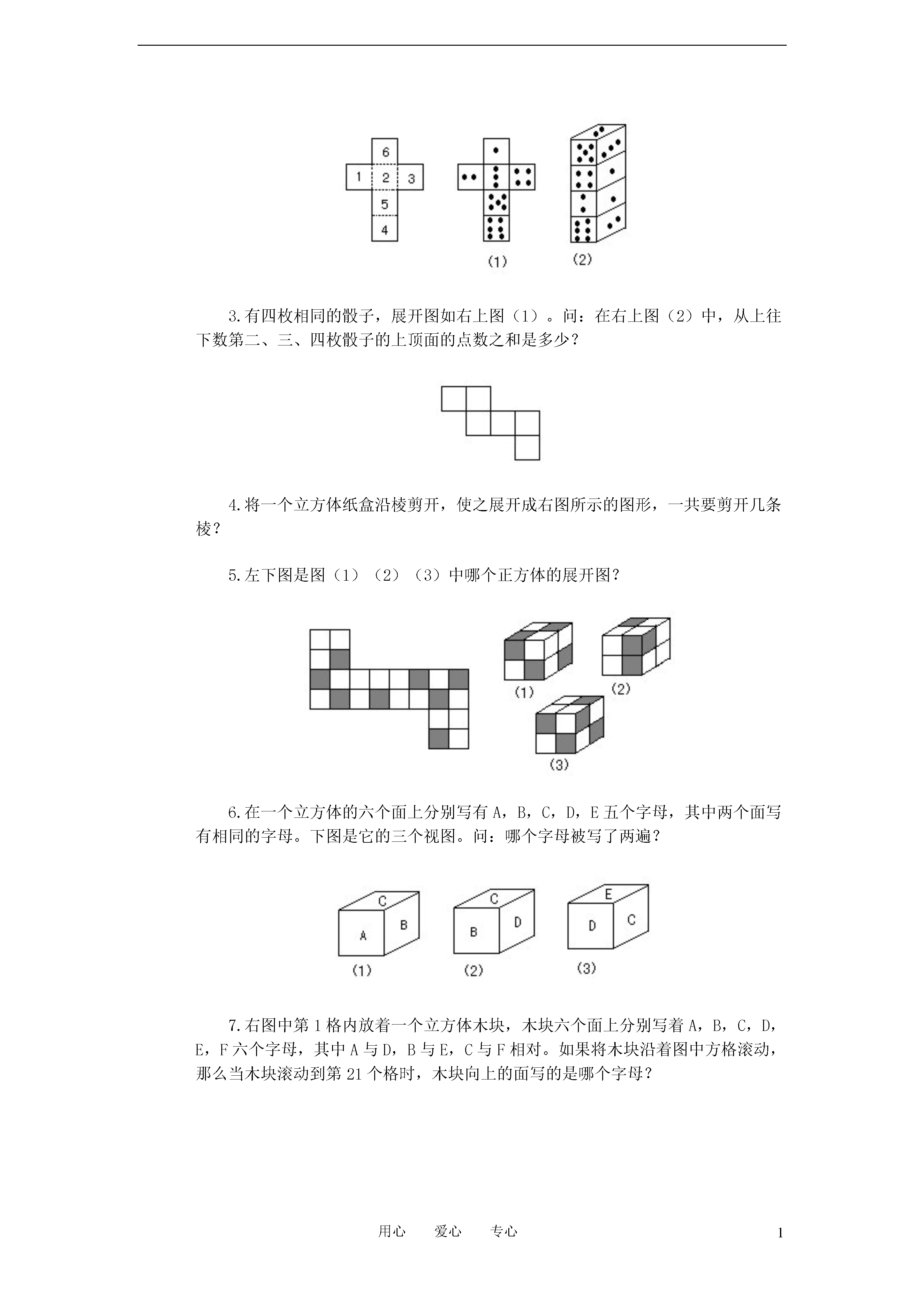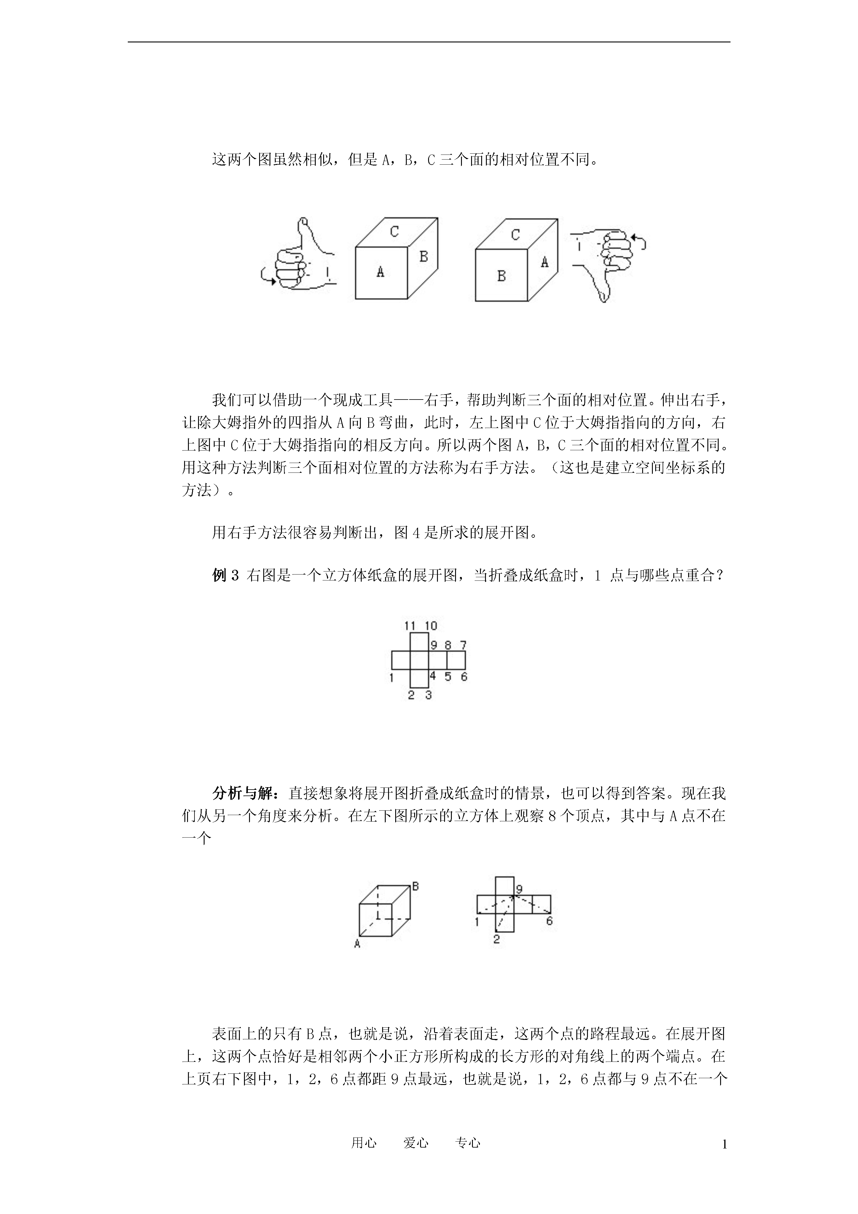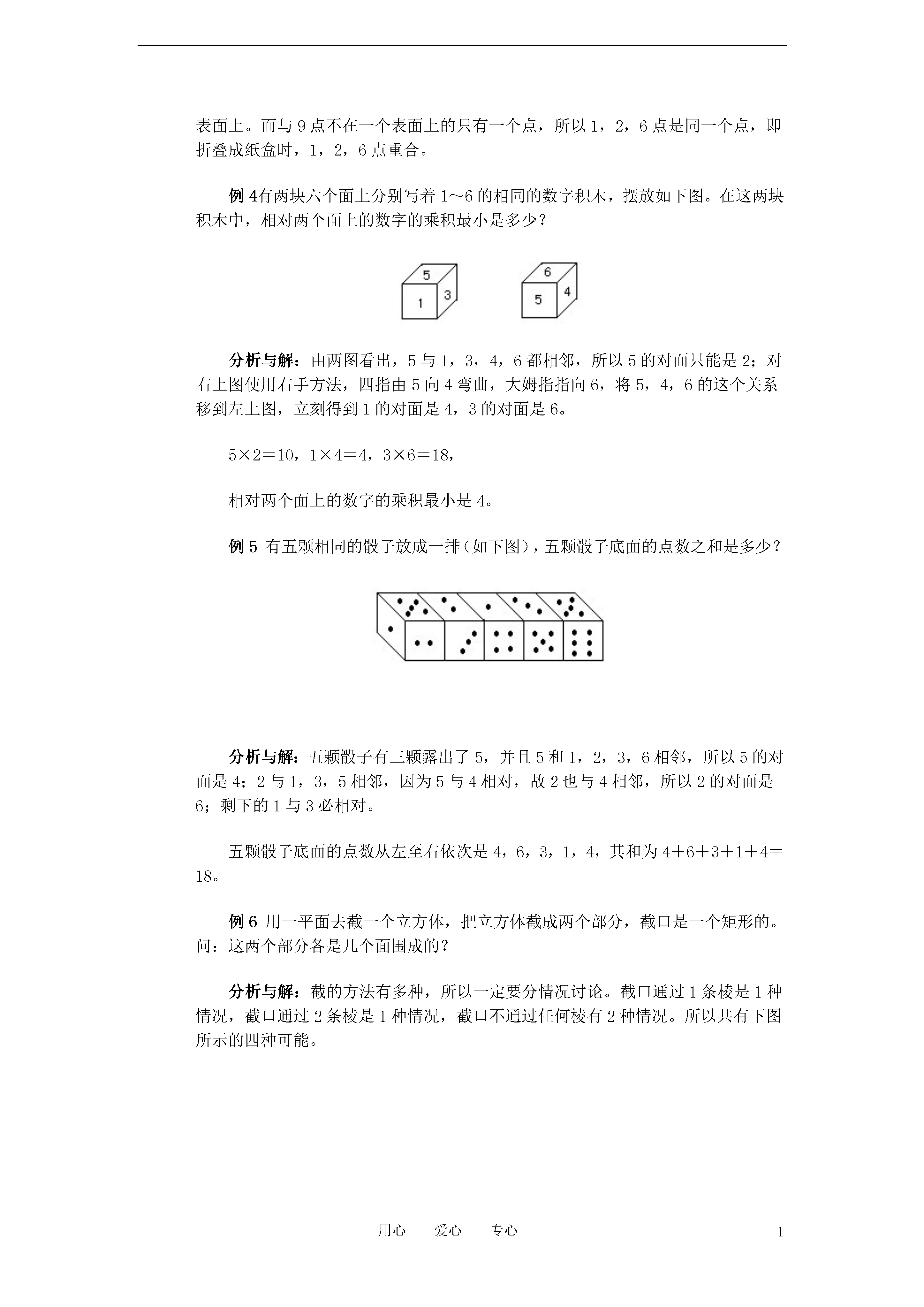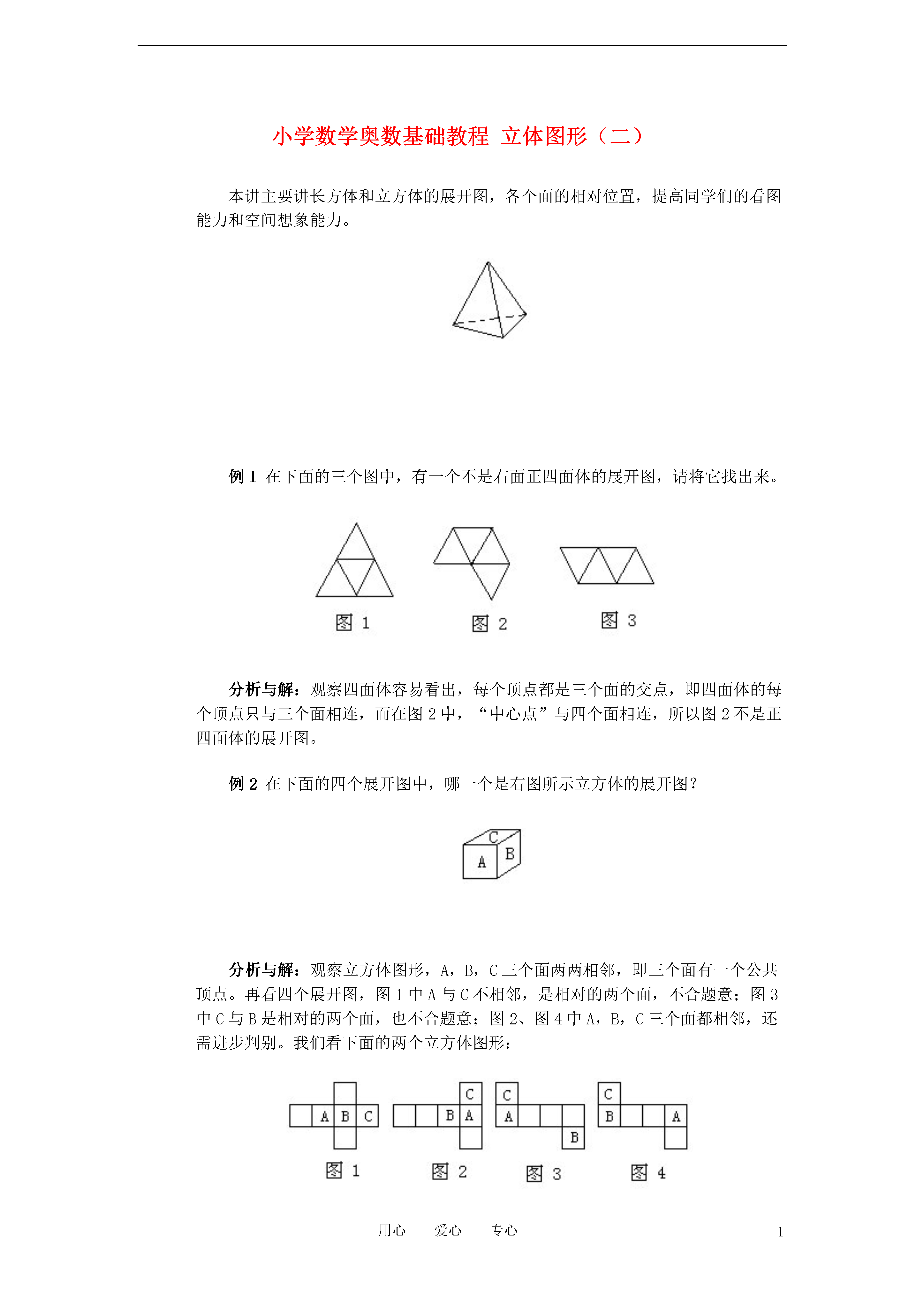 1用心爱心专心小学数学奥数基础教程立体图形(二)本讲主要讲长方体和立方体的展开图,各个面的相对位置,提高同学们的看图能力和空间想象能力。例1在下面的三个图中,有一个不是右面正四面体的展开图,请将它找出来。分析与解:观察四面体容易看出,每个顶点都是三个面的交点,即四面体的每个顶点只与三个面相连,而在图2中,“中心点”与四个面相连,所以图2不是正四面体的展开图。例2在下面的四个展开图中,哪一个是右图所示立方体的展开图?分析与解:观察立方体图形,A,B,C三个面两两相邻,即三个面有一个公共顶点。再看四个展开图,图1中A与C不相邻,是相对的两个面,不合题意;图3中C与B是相对的两个面,也不合题意;图2、图4中A,B,C三个面都相邻,还需进步判别。我们看下面的两个立方体图形:这两个图虽然相似,但是A,B,C三个面的相对位置不同。我们可以借助一个现成工具——右手,帮助判断三个面的相对位置。伸出右手,让除大姆指外的四指从A向B弯曲,此时,左上图中C位于大姆指指向的方向,右上图中C位于大姆指指向的相反方向。所以两个图A,B,C三个面的相对位置不同。用这种方法判断三个面相对位置的方法称为右手方法。(这也是建立空间坐标系的方法)。用右手方法很容易判断出,图4是所求的展开图。例3右图是一个立方体纸盒的展开图,当折叠成纸盒时,1点与哪些点重合?分析与解:直接想象将展开图折叠成纸盒时的情景,也可以得到答案。现在我们从另一个角度来分析。在左下图所示的立方体上观察8个顶点,其中与A点不在一个表面上的只有B点,也就是说,沿着表面走,这两个点的路程最远。在展开图上,这两个点恰好是相邻两个小正方形所构成的长方形的对角线上的两个端点。在上页右下图中,1,2,6点都距9点最远,也就是说,1,2,6点都与9点不在一个表面上。而与9点不在一个表面上的只有一个点,所以1,2,6点是同一个点,即折叠成纸盒时,1,2,6点重合。例4有两块六个面上分别写着1~6的相同的数字积木,摆放如下图。在这两块积木中,相对两个面上的数字的乘积最小是多少?分析与解:由两图看出,5与1,3,4,6都相邻,所以5的对面只能是2;对右上图使用右手方法,四指由5向4弯曲,大姆指指向6,将5,4,6的这个关系移到左上图,立刻得到1的对面是4,3的对面是6。5×2=10,1×4=4,3×6=18,相对两个面上的数字的乘积最小是4。例5有五颗相同的骰子放成一排(如下图),五颗骰子底面的点数之和是多少?分析与解:五颗骰子有三颗露出了5,并且5和1,2,3,6相邻,所以5的对面是4;2与1,3,5相邻,因为5与4相对,故2也与4相邻,所以2的对面是6;剩下的1与3必相对。五颗骰子底面的点数从左至右依次是4,6,3,1,4,其和为4+6+3+1+4=18。例6用一平面去截一个立方体,把立方体截成两个部分,截口是一个矩形的。问:这两个部分各是几个面围成的?分析与解:截的方法有多种,所以一定要分情况讨论。截口通过1条棱是1种情况,截口通过2条棱是1种情况,截口不通过任何棱有2种情况。所以共有下图所示的四种可能。练习141.在下列各图中,哪些是正方体的展开图?2.将左下图沿虚线折成一个立方体,它的相交于一个顶点处的三个面上的数字之和的最大值是多少?最小值是多少?3.有四枚相同的骰子,展开图如右上图(1)。问:在右上图(2)中,从上往下数第二、三、四枚骰子的上顶面的点数之和是多少?4.将一个立方体纸盒沿棱剪开,使之展开成右图所示的图形,一共要剪开几条棱?5.左下图是图(1)(2)(3)中哪个正方体的展开图?6.在一个立方体的六个面上分别写有A,B,C,D,E五个字母,其中两个面写有相同的字母。下图是它的三个视图。问:哪个字母被写了两遍?7.右图中第1格内放着一个立方体木块,木块六个面上分别写着A,B,C,D,E,F六个字母,其中A与D,B与E,C与F相对。如果将木块沿着图中方格滚动,那么当木块滚动到第21个格时,木块向上的面写的是哪个字母?答案与提示练习141.(2)(3)(6)(8)(9)(12)(14)(16)(17)(19)(20)共11个。2.13;8。提示:最大是6+4+3=13;最小是1+2+5=8。3.12。提示:用右手方法可得,第二、三、四枚骰子上顶面的点数依次为3,6和1。4.7条。提示:每剪开一条棱,展开图的周长就会增加2条棱长。展开图的周长是14条棱长,所以剪开了14÷2=7(条)棱。注:沿棱剪,无论剪成哪种连通的展开图,都要剪开7条棱。也就是说,无论哪种展开图,周长都等于14条棱长。5.图(1)。提示:图(2)正面有两个相连的阴影的正方形,展开图中找不