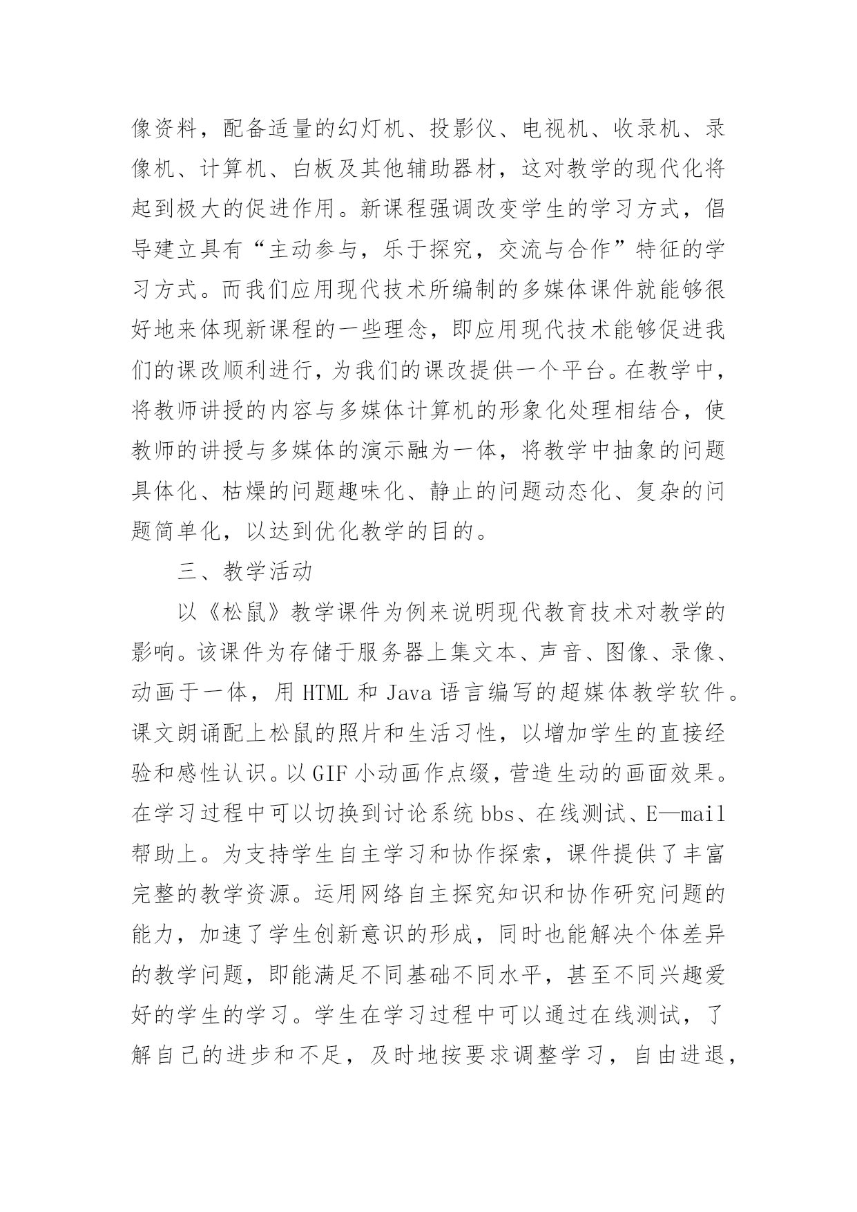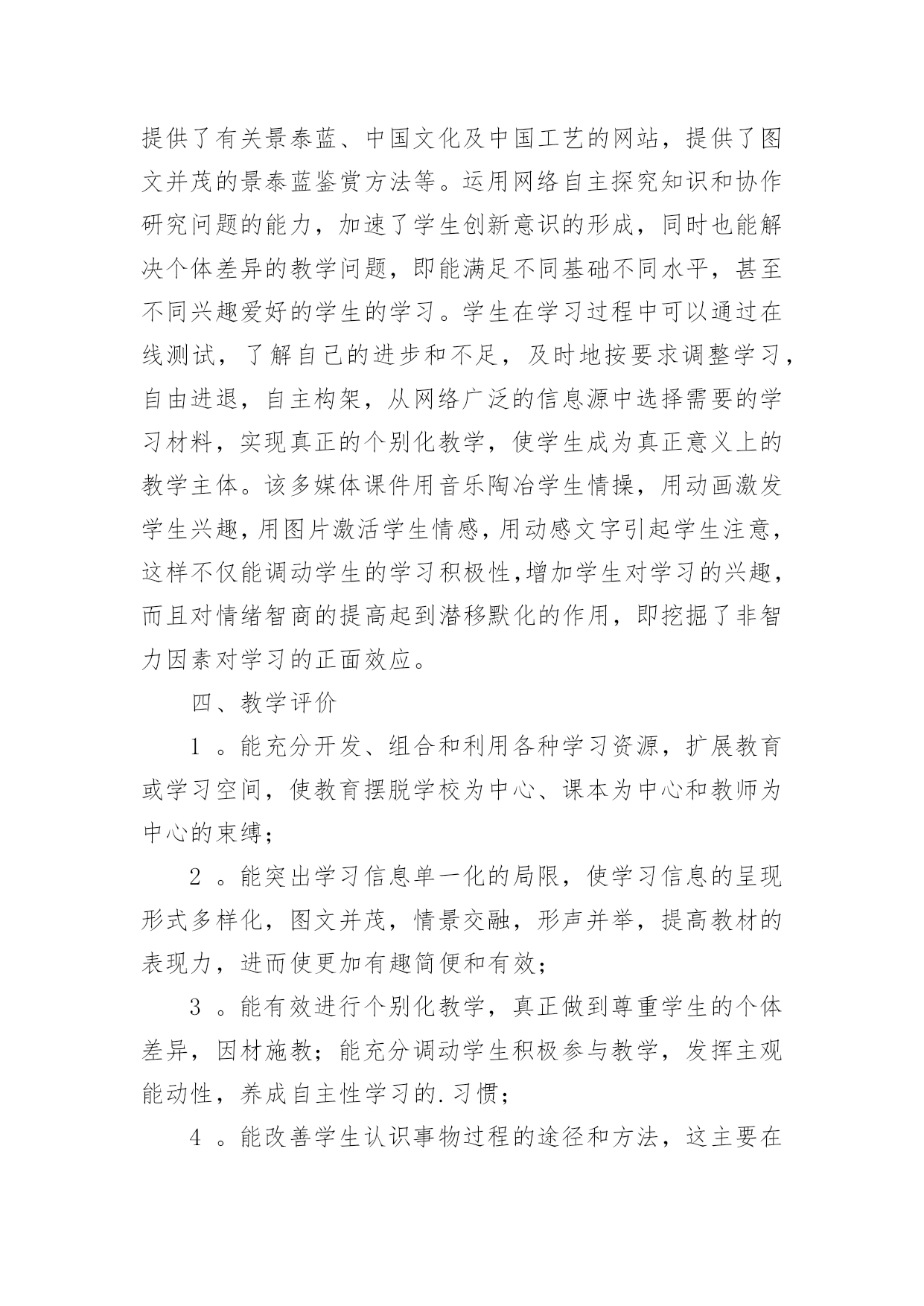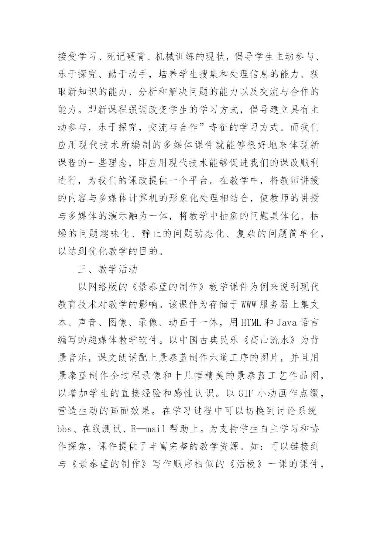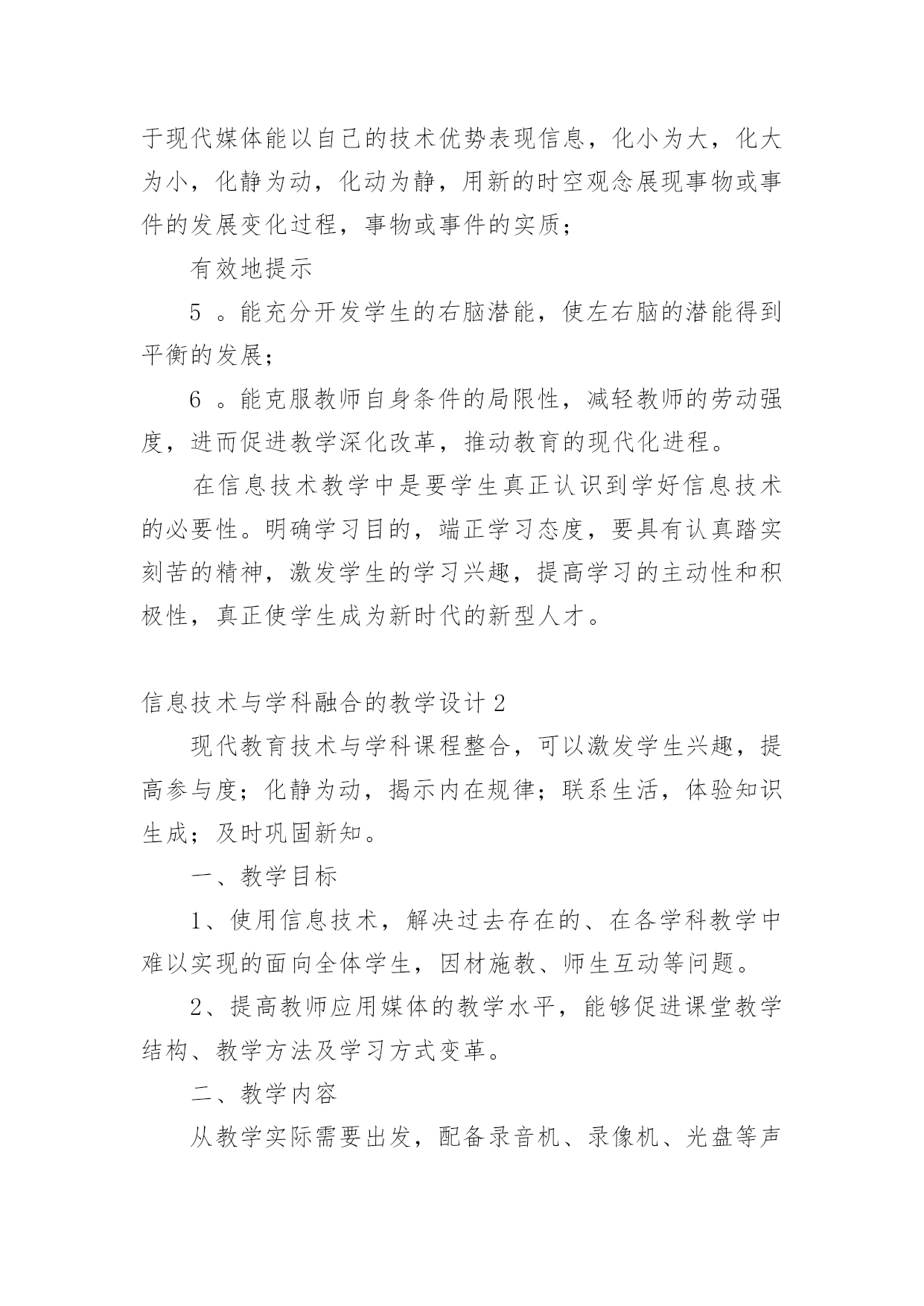 信息技术与学科融合的教学设计 信息技术与学科融合的教学设计作为一位杰出的老师,时常需要准备好教学设计,教学设计是对学业业绩问题的解决措施进行策划的过程。一份好的教学设计是什么样子的呢?下面是小编收集整理的信息技术与学科融合的教学设计,欢迎阅读,希望大家能够喜欢。信息技术与学科融合的教学设计1一、教学目标1、使用信息技术,解决过去存在的、在各学科教学中难以实现的面向全体学生,因材施教、师生互动等问题。2、通过整合、真正实现教学目标的综合化;教学过程的民主化;教学方法的多样化和教学技术的信息化。从而使素质教育在教学中得到突破性的进展。3、提高教师应用媒体的教学水平,能够促进课堂教学结构、教学方法及学习方式变革。二、教学内容从教学实际需要出发,配备录音机、录像机、光盘等声像资料,配备适量的幻灯机、投影仪、电视机、收录机、录像机、计算机及其他辅助器材,这对教学的现代化将起到极大的促进作用。《基础教育课程改革纲要》提出改变课程实施过于强调接受学习、死记硬背、机械训练的现状,倡导学生主动参与、乐于探究、勤于动手,培养学生搜集和处理信息的能力、获取新知识的能力、分析和解决问题的能力以及交流与合作的能力。即新课程强调改变学生的学习方式,倡导建立具有主动参与,乐于探究,交流与合作”寺征的学习方式。而我们应用现代技术所编制的多媒体课件就能够很好地来体现新课程的一些理念,即应用现代技术能够促进我们的课改顺利进行,为我们的课改提供一个平台。在教学中,将教师讲授的内容与多媒体计算机的形象化处理相结合,使教师的讲授与多媒体的演示融为一体,将教学中抽象的问题具体化、枯燥的问题趣味化、静止的问题动态化、复杂的问题简单化,以达到优化教学的目的。三、教学活动以网络版的《景泰蓝的制作》教学课件为例来说明现代教育技术对教学的影响。该课件为存储于WWW服务器上集文本、声音、图像、录像、动画于一体,用HTML和Java语言编写的超媒体教学软件。以中国古典民乐《高山流水》为背景音乐,课文朗诵配上景泰蓝制作六道工序的图片,并且用景泰蓝制作全过程录像和十几幅精美的景泰蓝工艺作品图,以增加学生的直接经验和感性认识。以GIF小动画作点缀,营造生动的画面效果。在学习过程中可以切换到讨论系统bbs、在线测试、E—mail帮助上。为支持学生自主学习和协作探索,课件提供了丰富完整的教学资源。如:可以链接到与《景泰蓝的制作》写作顺序相似的《活板》一课的课件,提供了有关景泰蓝、中国文化及中国工艺的网站,提供了图文并茂的景泰蓝鉴赏方法等。运用网络自主探究知识和协作研究问题的能力,加速了学生创新意识的形成,同时也能解决个体差异的教学问题,即能满足不同基础不同水平,甚至不同兴趣爱好的学生的学习。学生在学习过程中可以通过在线测试,了解自己的进步和不足,及时地按要求调整学习,自由进退,自主构架,从网络广泛的信息源中选择需要的学习材料,实现真正的个别化教学,使学生成为真正意义上的教学主体。该多媒体课件用音乐陶冶学生情操,用动画激发学生兴趣,用图片激活学生情感,用动感文字引起学生注意,这样不仅能调动学生的学习积极性,增加学生对学习的兴趣,而且对情绪智商的提高起到潜移默化的作用,即挖掘了非智力因素对学习的正面效应。四、教学评价1。能充分开发、组合和利用各种学习资源,扩展教育或学习空间,使教育摆脱学校为中心、课本为中心和教师为中心的束缚;2。能突出学习信息单一化的局限,使学习信息的呈现形式多样化,图文并茂,情景交融,形声并举,提高教材的表现力,进而使更加有趣简便和有效;3。能有效进行个别化教学,真正做到尊重学生的个体差异,因材施教;能充分调动学生积极参与教学,发挥主观能动性,养成自主性学习的.习惯;4。能改善学生认识事物过程的途径和方法,这主要在于现代媒体能以自己的技术优势表现信息,化小为大,化大为小,化静为动,化动为静,用新的时空观念展现事物或事件的发展变化过程,事物或事件的实质;有效地提示5。能充分开发学生的右脑潜能,使左右脑的潜能得到平衡的发展;6。能克服教师自身条件的局限性,减轻教师的劳动强度,进而促进教学深化改革,推动教育的现代化进程。在信息技术教学中是要学生真正认识到学好信息技术的必要性。明确学习目的,端正学习态度,要具有认真踏实刻苦的精神,激发学生的学习兴趣,提高学习的主动性和积极性,真正使学生成为新时代的新型人才。信息技术与学科融合的教学设计2现代教育技术与学科课程整合,可以激发学生兴趣,提高参与度;化静为动,揭示内在规律;联系生活,体验知识生成;及时巩固新知。一、教学目标1、使用信息技术,解决过去存在的、在各学科教学中难以实现的面向全体学生,因材施教、师生互动等问题。2、提高教师应用媒体的教学水平,能够促进课堂教学结构、教学方法及学习方式变革。二、教学内容从教学实际需要出发,配备录音机、录