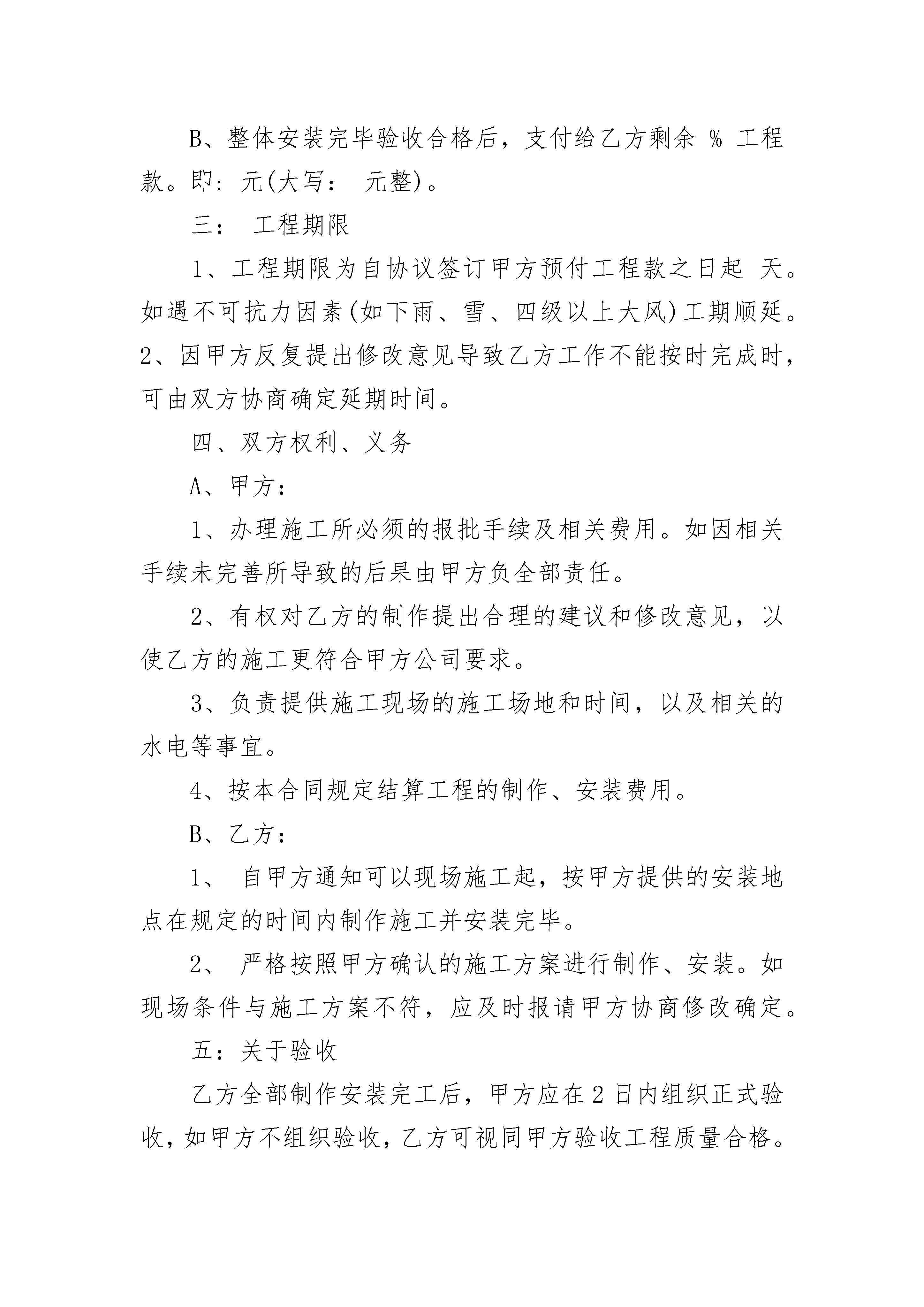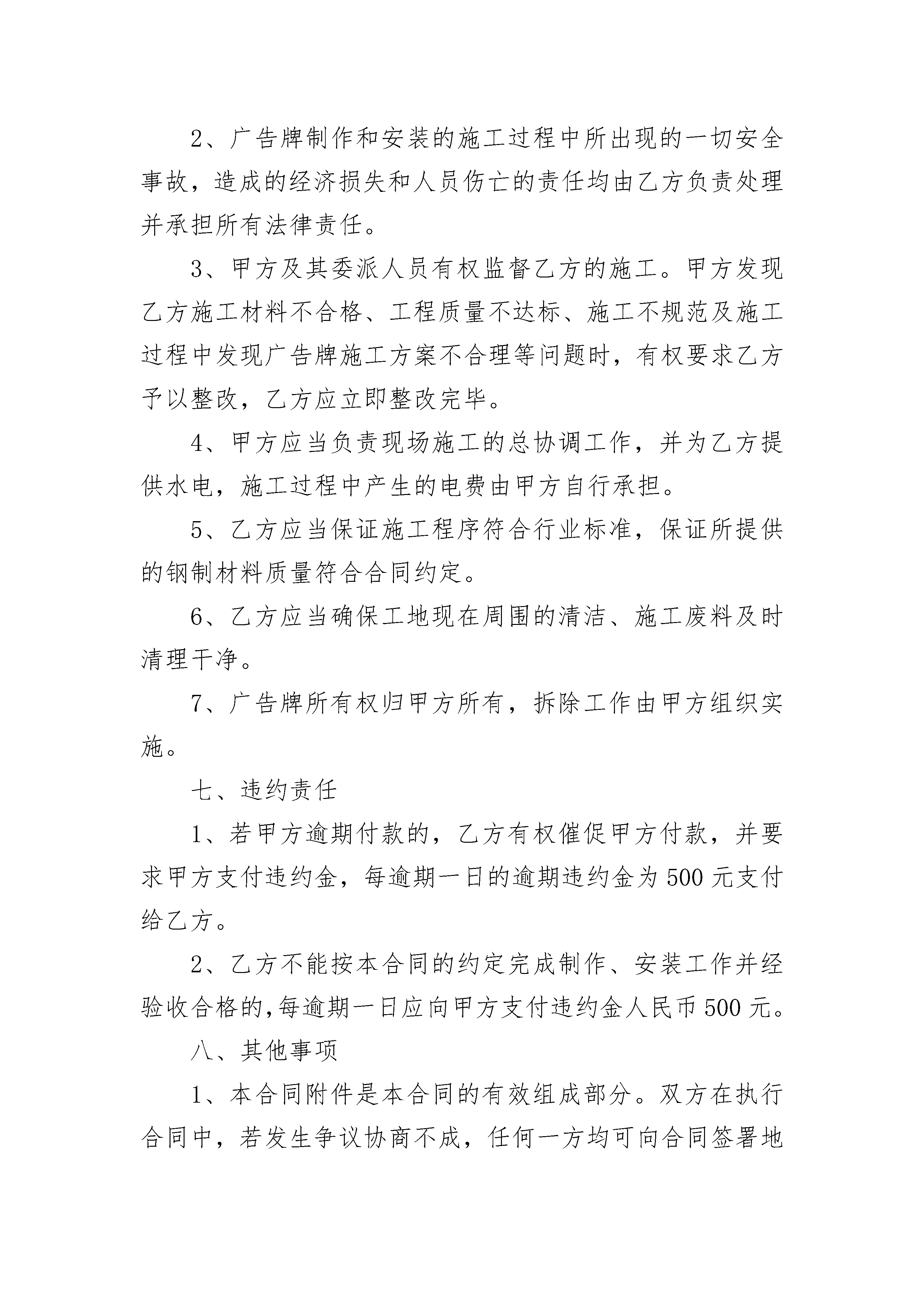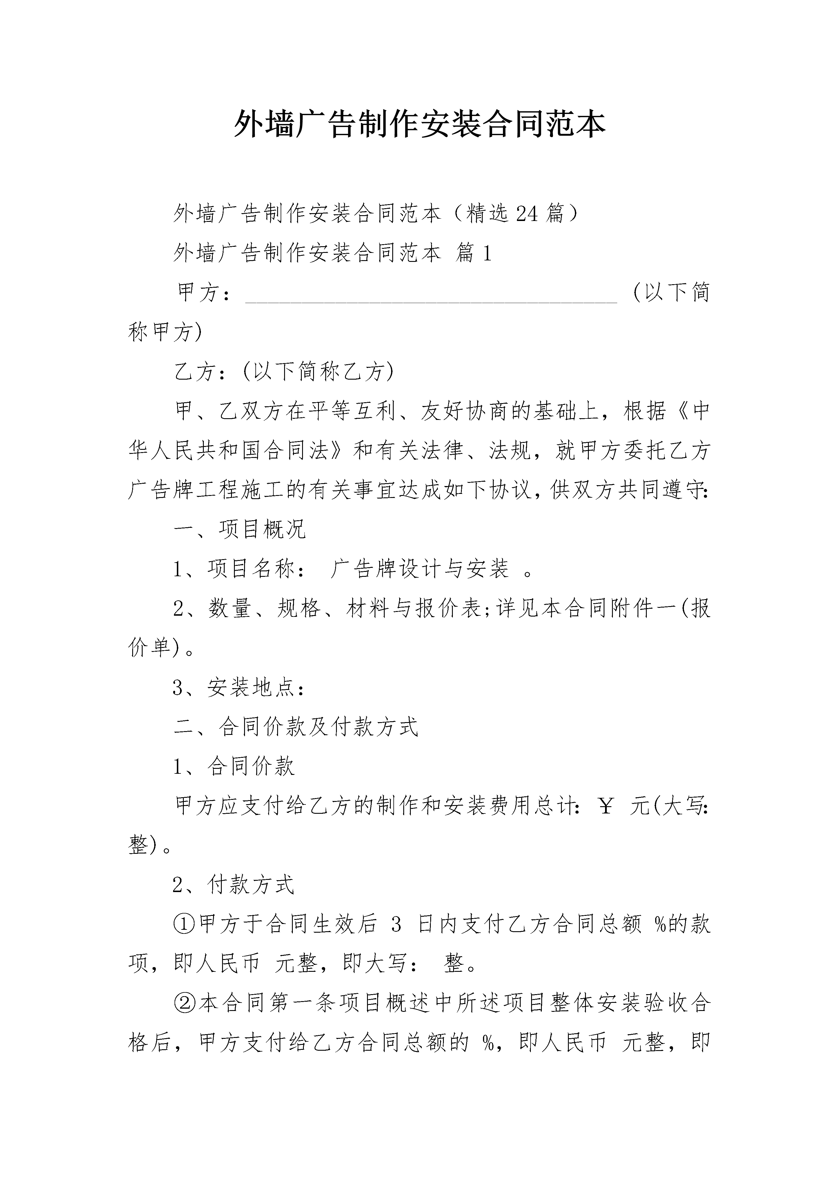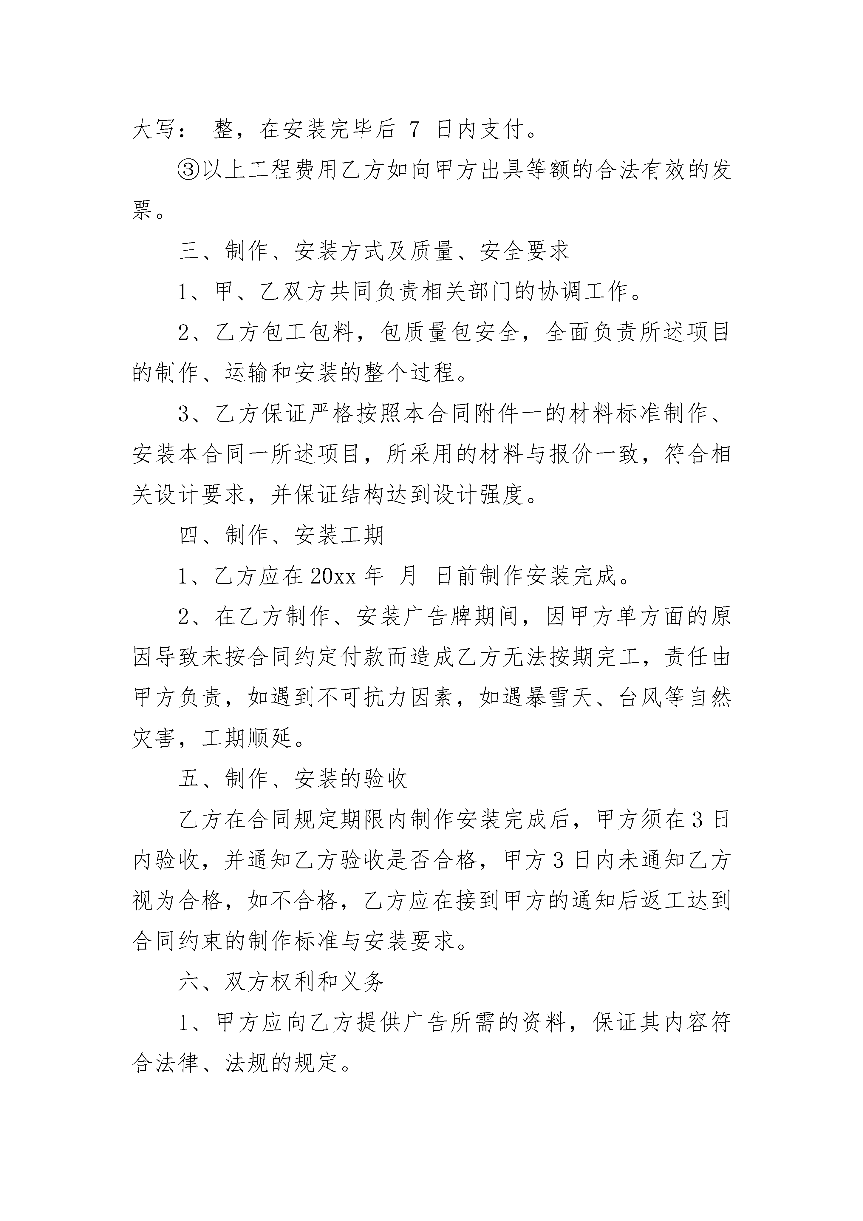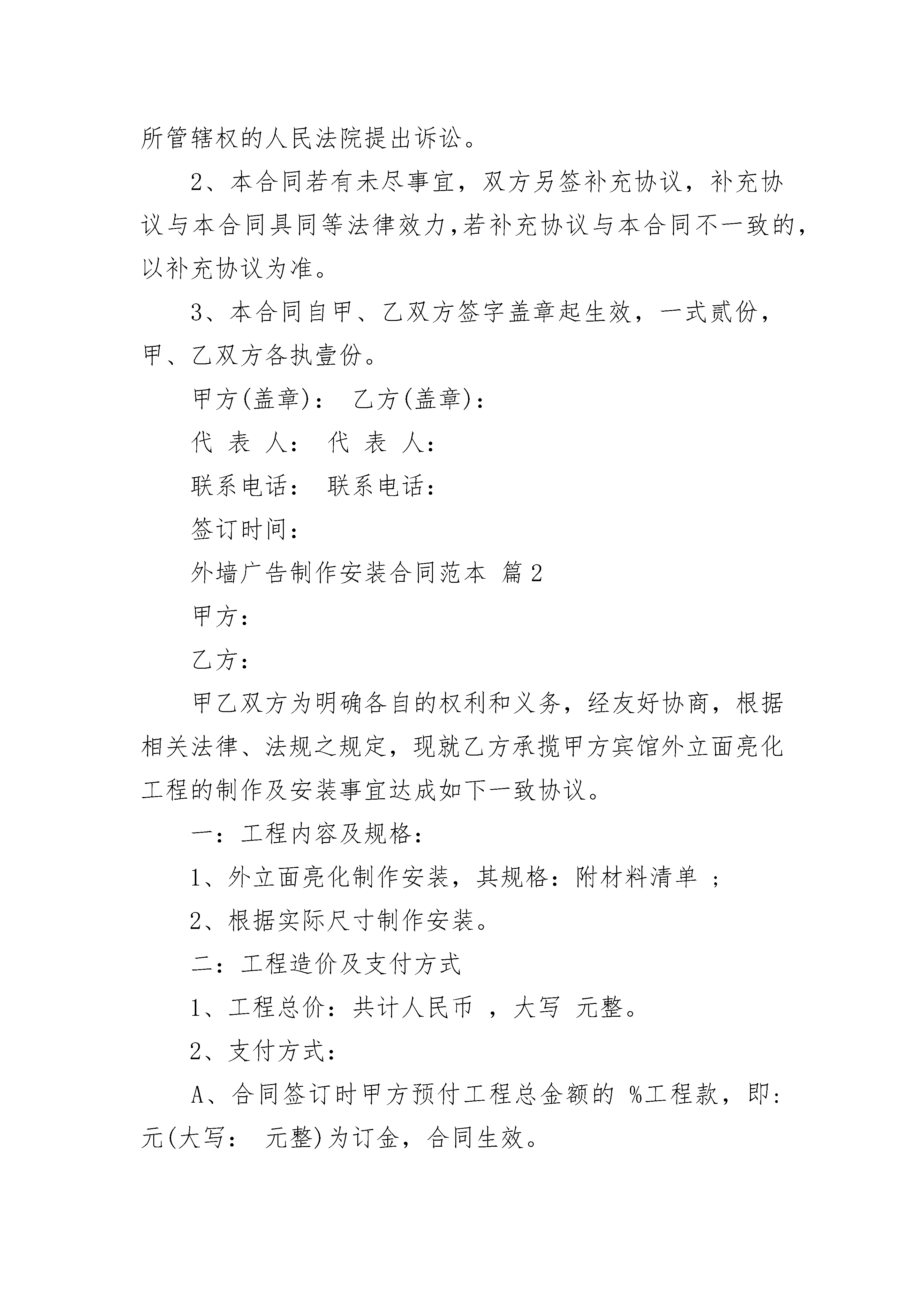 外墙广告制作安装合同范本外墙广告制作安装合同范本(精选24篇)外墙广告制作安装合同范本篇1甲方:_________________________________(以下简称甲方)乙方:(以下简称乙方)甲、乙双方在平等互利、友好协商的基础上,根据《中华人民共和国合同法》和有关法律、法规,就甲方委托乙方广告牌工程施工的有关事宜达成如下协议,供双方共同遵守:一、项目概况1、项目名称:广告牌设计与安装。2、数量、规格、材料与报价表;详见本合同附件一(报价单)。3、安装地点:二、合同价款及付款方式1、合同价款甲方应支付给乙方的制作和安装费用总计:¥元(大写:整)。2、付款方式①甲方于合同生效后3日内支付乙方合同总额%的款项,即人民币元整,即大写:整。②本合同第一条项目概述中所述项目整体安装验收合格后,甲方支付给乙方合同总额的%,即人民币元整,即大写:整,在安装完毕后7日内支付。③以上工程费用乙方如向甲方出具等额的合法有效的发票。三、制作、安装方式及质量、安全要求1、甲、乙双方共同负责相关部门的协调工作。2、乙方包工包料,包质量包安全,全面负责所述项目的制作、运输和安装的整个过程。3、乙方保证严格按照本合同附件一的材料标准制作、安装本合同一所述项目,所采用的材料与报价一致,符合相关设计要求,并保证结构达到设计强度。四、制作、安装工期1、乙方应在20xx年月日前制作安装完成。2、在乙方制作、安装广告牌期间,因甲方单方面的原因导致未按合同约定付款而造成乙方无法按期完工,责任由甲方负责,如遇到不可抗力因素,如遇暴雪天、台风等自然灾害,工期顺延。五、制作、安装的验收乙方在合同规定期限内制作安装完成后,甲方须在3日内验收,并通知乙方验收是否合格,甲方3日内未通知乙方视为合格,如不合格,乙方应在接到甲方的通知后返工达到合同约束的制作标准与安装要求。六、双方权利和义务1、甲方应向乙方提供广告所需的资料,保证其内容符合法律、法规的规定。2、广告牌制作和安装的施工过程中所出现的一切安全事故,造成的经济损失和人员伤亡的责任均由乙方负责处理并承担所有法律责任。3、甲方及其委派人员有权监督乙方的施工。甲方发现乙方施工材料不合格、工程质量不达标、施工不规范及施工过程中发现广告牌施工方案不合理等问题时,有权要求乙方予以整改,乙方应立即整改完毕。4、甲方应当负责现场施工的总协调工作,并为乙方提供水电,施工过程中产生的电费由甲方自行承担。5、乙方应当保证施工程序符合行业标准,保证所提供的钢制材料质量符合合同约定。6、乙方应当确保工地现在周围的清洁、施工废料及时清理干净。7、广告牌所有权归甲方所有,拆除工作由甲方组织实施。七、违约责任1、若甲方逾期付款的,乙方有权催促甲方付款,并要求甲方支付违约金,每逾期一日的逾期违约金为500元支付给乙方。2、乙方不能按本合同的约定完成制作、安装工作并经验收合格的,每逾期一日应向甲方支付违约金人民币500元。八、其他事项1、本合同附件是本合同的有效组成部分。双方在执行合同中,若发生争议协商不成,任何一方均可向合同签署地所管辖权的人民法院提出诉讼。2、本合同若有未尽事宜,双方另签补充协议,补充协议与本合同具同等法律效力,若补充协议与本合同不一致的,以补充协议为准。3、本合同自甲、乙双方签字盖章起生效,一式贰份,甲、乙双方各执壹份。甲方(盖章):乙方(盖章):代表人:代表人:联系电话:联系电话:签订时间:外墙广告制作安装合同范本篇2甲方:乙方:甲乙双方为明确各自的权利和义务,经友好协商,根据相关法律、法规之规定,现就乙方承揽甲方宾馆外立面亮化工程的制作及安装事宜达成如下一致协议。一:工程内容及规格:1、外立面亮化制作安装,其规格:附材料清单;2、根据实际尺寸制作安装。二:工程造价及支付方式1、工程总价:共计人民币,大写元整。2、支付方式:A、合同签订时甲方预付工程总金额的%工程款,即:元(大写:元整)为订金,合同生效。B、整体安装完毕验收合格后,支付给乙方剩余%工程款。即:元(大写:元整)。三:工程期限1、工程期限为自协议签订甲方预付工程款之日起天。如遇不可抗力因素(如下雨、雪、四级以上大风)工期顺延。2、因甲方反复提出修改意见导致乙方工作不能按时完成时,可由双方协商确定延期时间。四、双方权利、义务A、甲方:1、办理施工所必须的报批手续及相关费用。如因相关手续未完善所导致的后果由甲方负全部责任。2、有权对乙方的制作提出合理的建议和修改意见,以使乙方的施工更符合甲方公司要求。3、负责提供施工现场的施工场地和时间,以及相关的水电等事宜。4、按本合同规定结算工程的制作、安装费用。B、乙方:1、自甲方通知可以现场施工起,按甲方提供的安装地点在规定的时间内制作施工并安装完毕。2、严格按照甲方确认的施工方案进行制作、安装。如现场条件与施工方案不符,