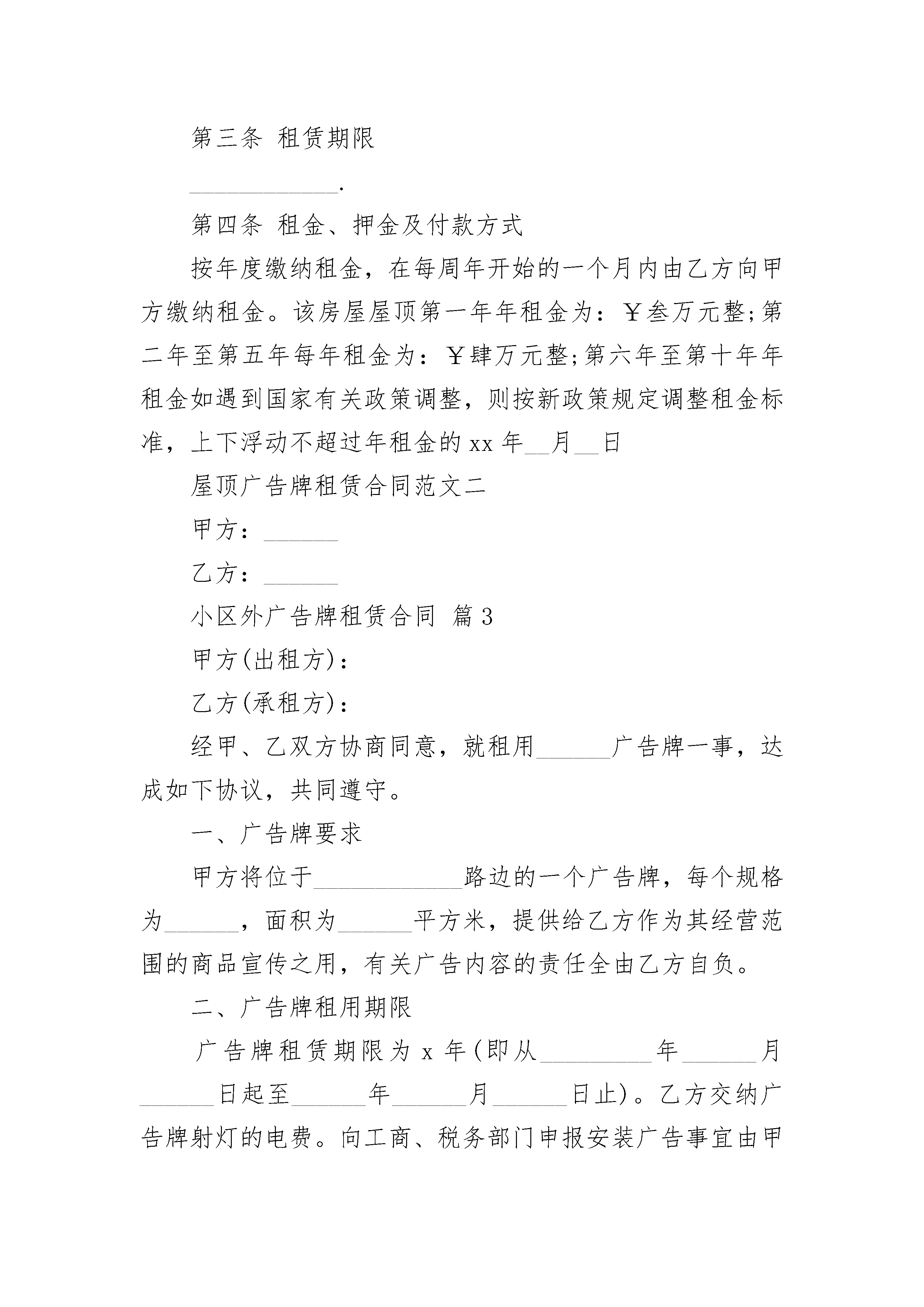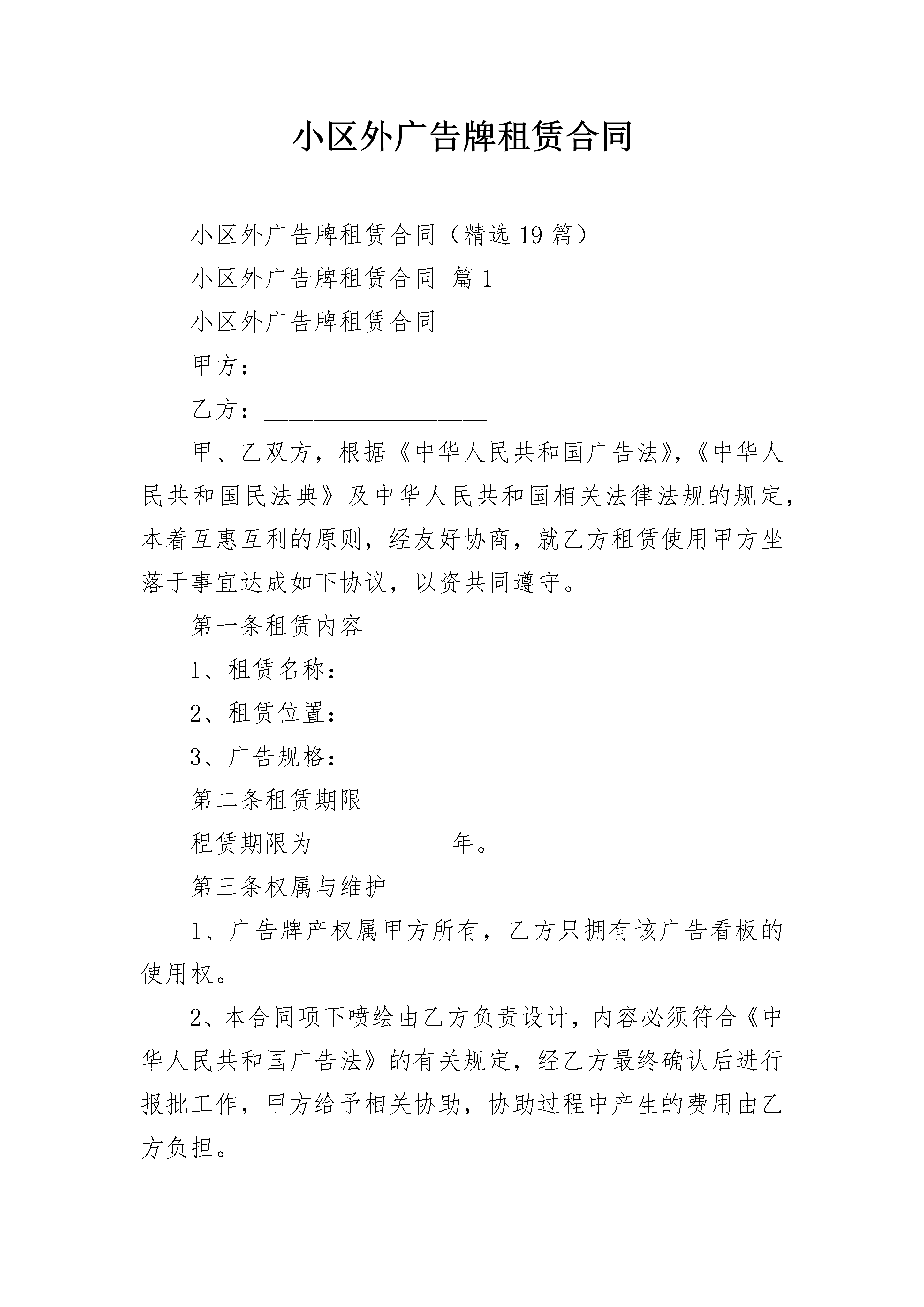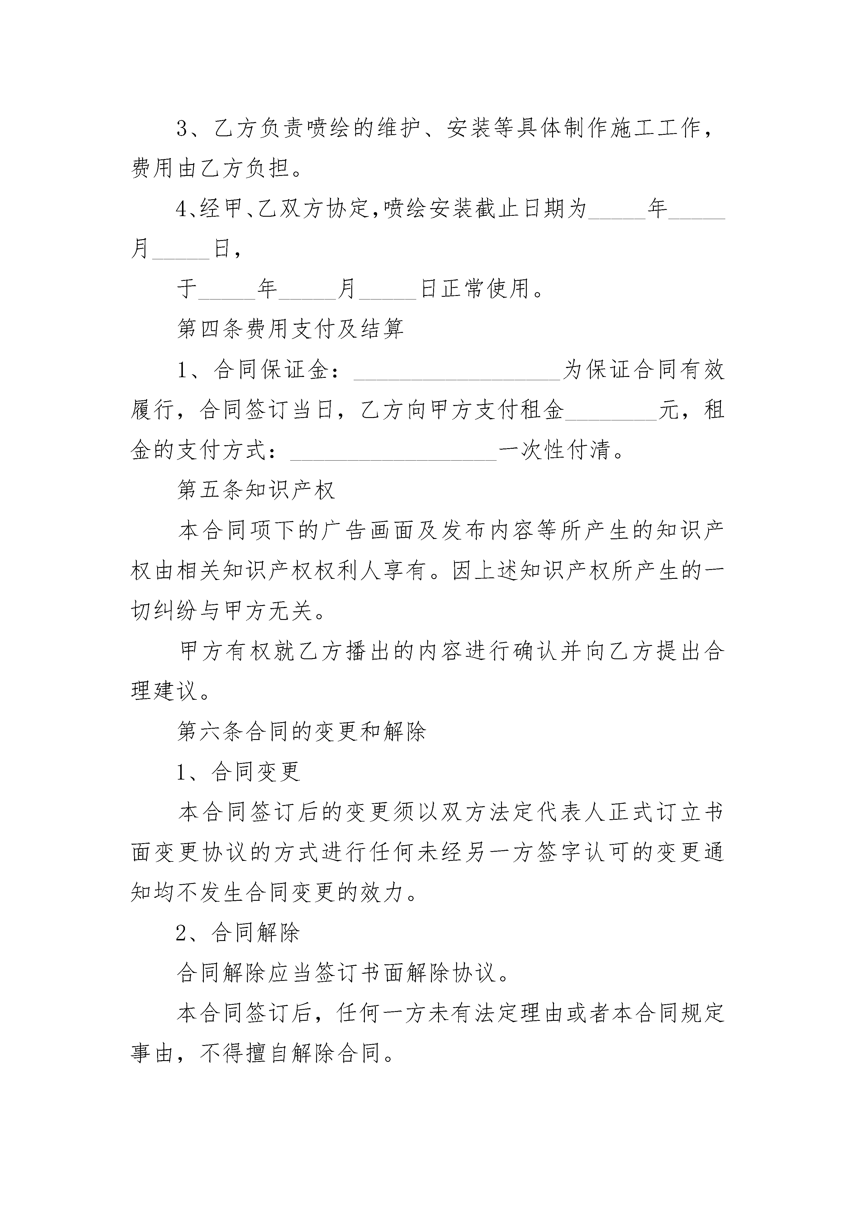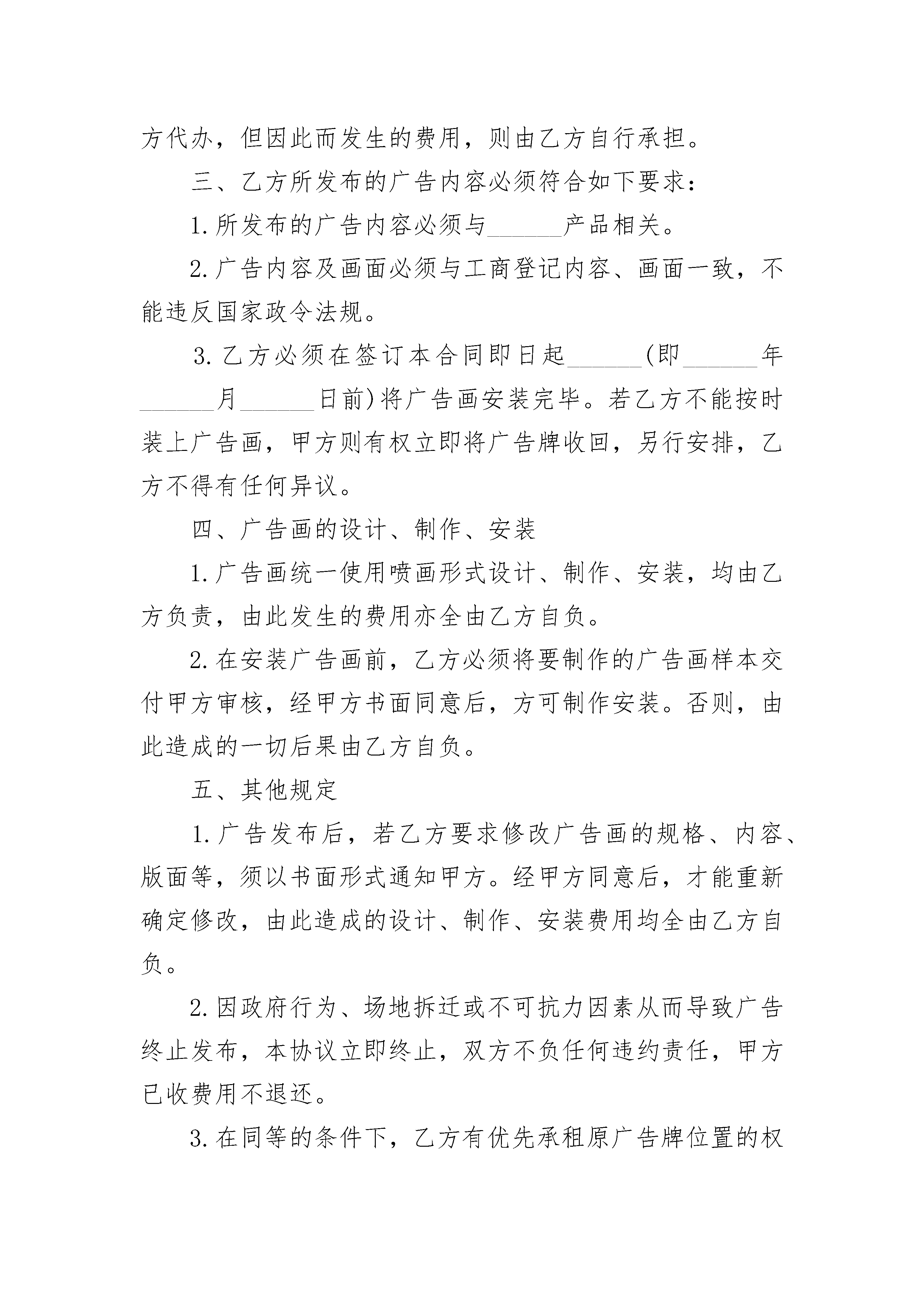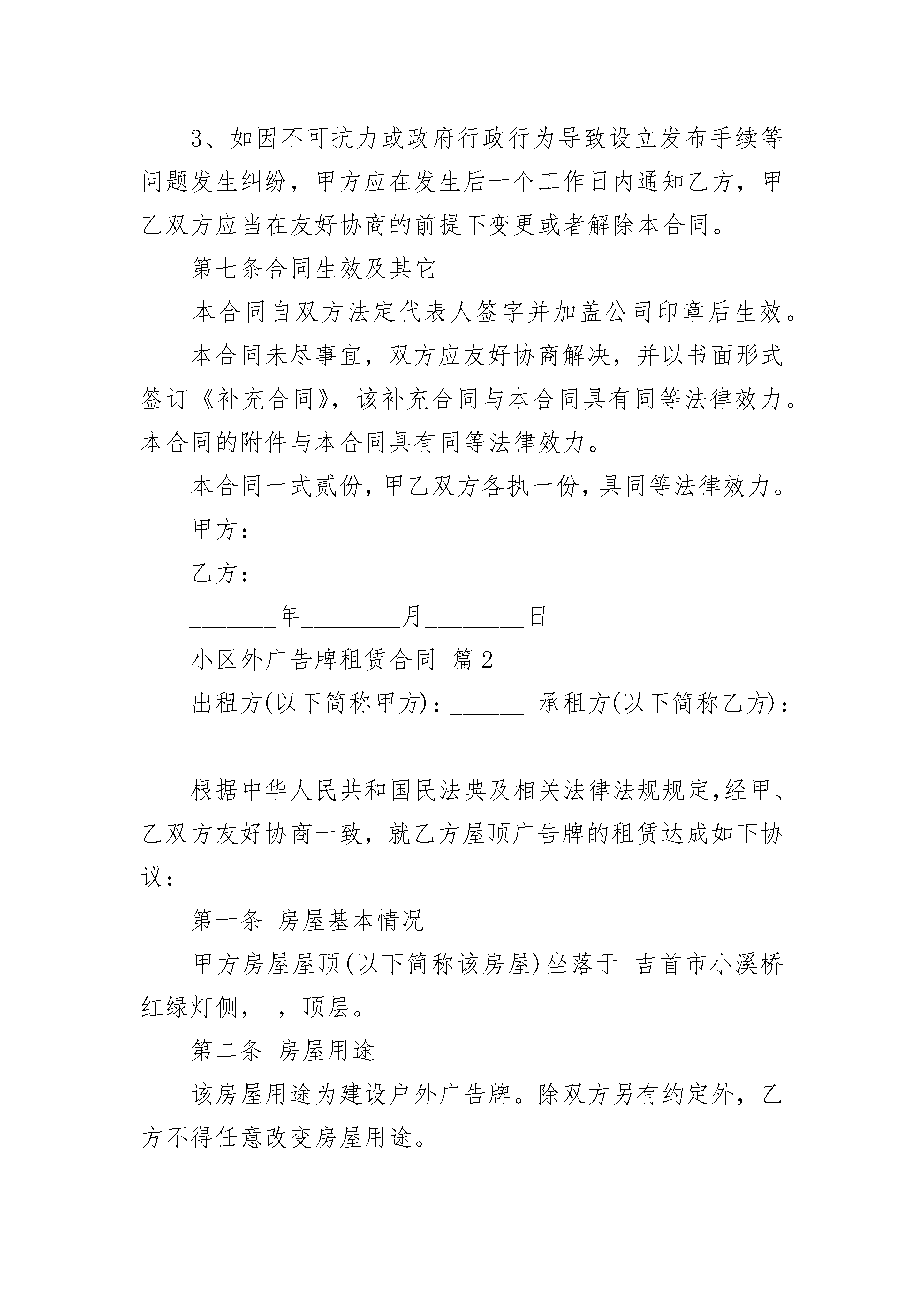 小区外广告牌租赁合同小区外广告牌租赁合同(精选19篇)小区外广告牌租赁合同篇1小区外广告牌租赁合同甲方:__________________乙方:__________________甲、乙双方,根据《中华人民共和国广告法》,《中华人民共和国民法典》及中华人民共和国相关法律法规的规定,本着互惠互利的原则,经友好协商,就乙方租赁使用甲方坐落于事宜达成如下协议,以资共同遵守。第一条租赁内容1、租赁名称:__________________2、租赁位置:__________________3、广告规格:__________________第二条租赁期限租赁期限为___________年。第三条权属与维护1、广告牌产权属甲方所有,乙方只拥有该广告看板的使用权。2、本合同项下喷绘由乙方负责设计,内容必须符合《中华人民共和国广告法》的有关规定,经乙方最终确认后进行报批工作,甲方给予相关协助,协助过程中产生的费用由乙方负担。3、乙方负责喷绘的维护、安装等具体制作施工工作,费用由乙方负担。4、经甲、乙双方协定,喷绘安装截止日期为_____年_____月_____日,于_____年_____月_____日正常使用。第四条费用支付及结算1、合同保证金:__________________为保证合同有效履行,合同签订当日,乙方向甲方支付租金________元,租金的支付方式:__________________一次性付清。第五条知识产权本合同项下的广告画面及发布内容等所产生的知识产权由相关知识产权权利人享有。因上述知识产权所产生的一切纠纷与甲方无关。甲方有权就乙方播出的内容进行确认并向乙方提出合理建议。第六条合同的变更和解除1、合同变更本合同签订后的变更须以双方法定代表人正式订立书面变更协议的方式进行任何未经另一方签字认可的变更通知均不发生合同变更的效力。2、合同解除合同解除应当签订书面解除协议。本合同签订后,任何一方未有法定理由或者本合同规定事由,不得擅自解除合同。3、如因不可抗力或政府行政行为导致设立发布手续等问题发生纠纷,甲方应在发生后一个工作日内通知乙方,甲乙双方应当在友好协商的前提下变更或者解除本合同。第七条合同生效及其它本合同自双方法定代表人签字并加盖公司印章后生效。本合同未尽事宜,双方应友好协商解决,并以书面形式签订《补充合同》,该补充合同与本合同具有同等法律效力。本合同的附件与本合同具有同等法律效力。本合同一式贰份,甲乙双方各执一份,具同等法律效力。甲方:__________________乙方:____________________________________年________月________日小区外广告牌租赁合同篇2出租方(以下简称甲方):______承租方(以下简称乙方):______根据中华人民共和国民法典及相关法律法规规定,经甲、乙双方友好协商一致,就乙方屋顶广告牌的租赁达成如下协议:第一条房屋基本情况甲方房屋屋顶(以下简称该房屋)坐落于吉首市小溪桥红绿灯侧,,顶层。第二条房屋用途该房屋用途为建设户外广告牌。除双方另有约定外,乙方不得任意改变房屋用途。第三条租赁期限____________.第四条租金、押金及付款方式按年度缴纳租金,在每周年开始的一个月内由乙方向甲方缴纳租金。该房屋屋顶第一年年租金为:¥叁万元整;第二年至第五年每年租金为:¥肆万元整;第六年至第十年年租金如遇到国家有关政策调整,则按新政策规定调整租金标准,上下浮动不超过年租金的xx年__月__日屋顶广告牌租赁合同范文二甲方:______乙方:______小区外广告牌租赁合同篇3甲方(出租方):乙方(承租方):经甲、乙双方协商同意,就租用______广告牌一事,达成如下协议,共同遵守。一、广告牌要求甲方将位于____________路边的一个广告牌,每个规格为______,面积为______平方米,提供给乙方作为其经营范围的商品宣传之用,有关广告内容的责任全由乙方自负。二、广告牌租用期限广告牌租赁期限为x年(即从_________年______月______日起至______年______月______日止)。乙方交纳广告牌射灯的电费。向工商、税务部门申报安装广告事宜由甲方代办,但因此而发生的费用,则由乙方自行承担。三、乙方所发布的广告内容必须符合如下要求:1.所发布的广告内容必须与______产品相关。2.广告内容及画面必须与工商登记内容、画面一致,不能违反国家政令法规。3.乙方必须在签订本合同即日起______(即______年______月______日前)将广告画安装完毕。若乙方不能按时装上广告画,甲方则有权立即将广告牌收回,另行安排,乙方不得有任何异议。四、广告画的设计、制作、安装1.广告画统一使用喷画形式设计、制作、安装,均由乙方负责,由