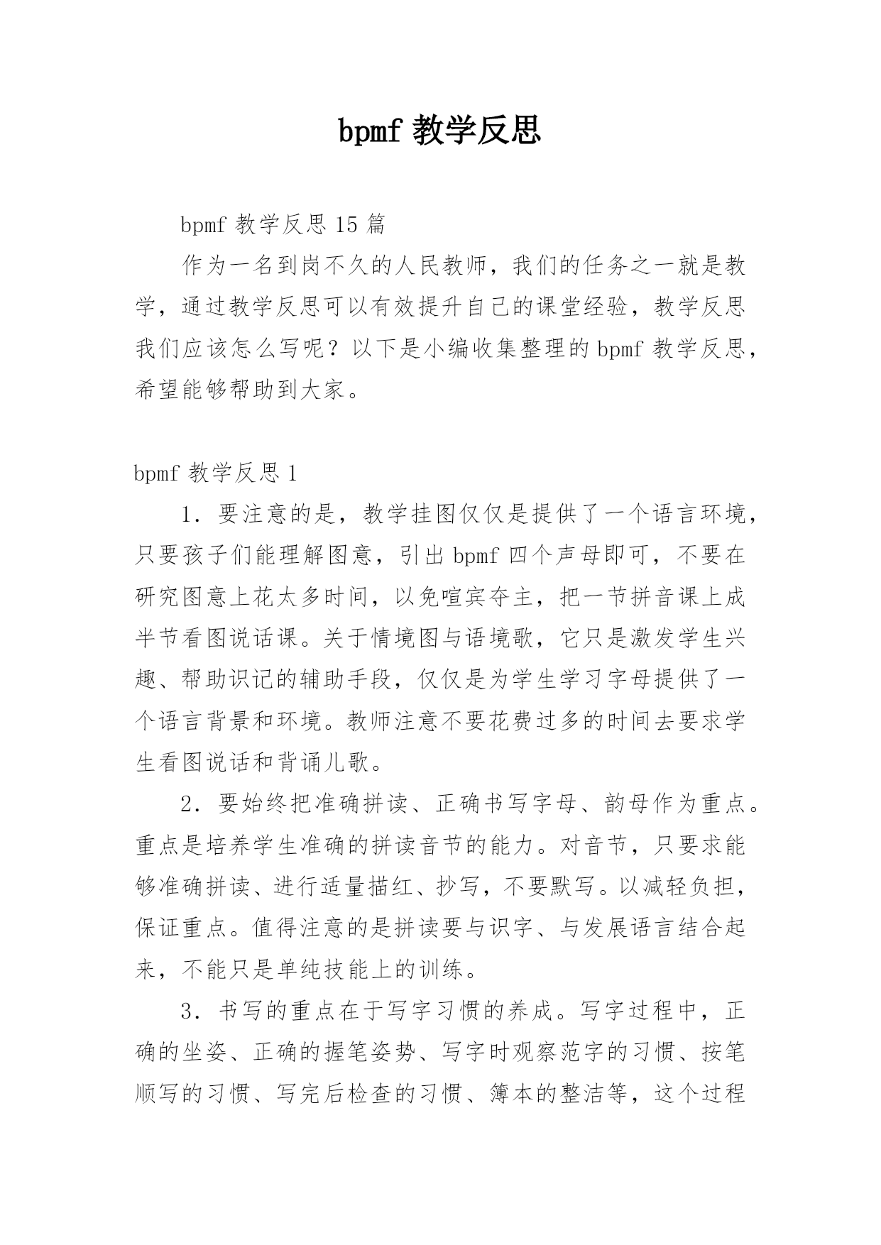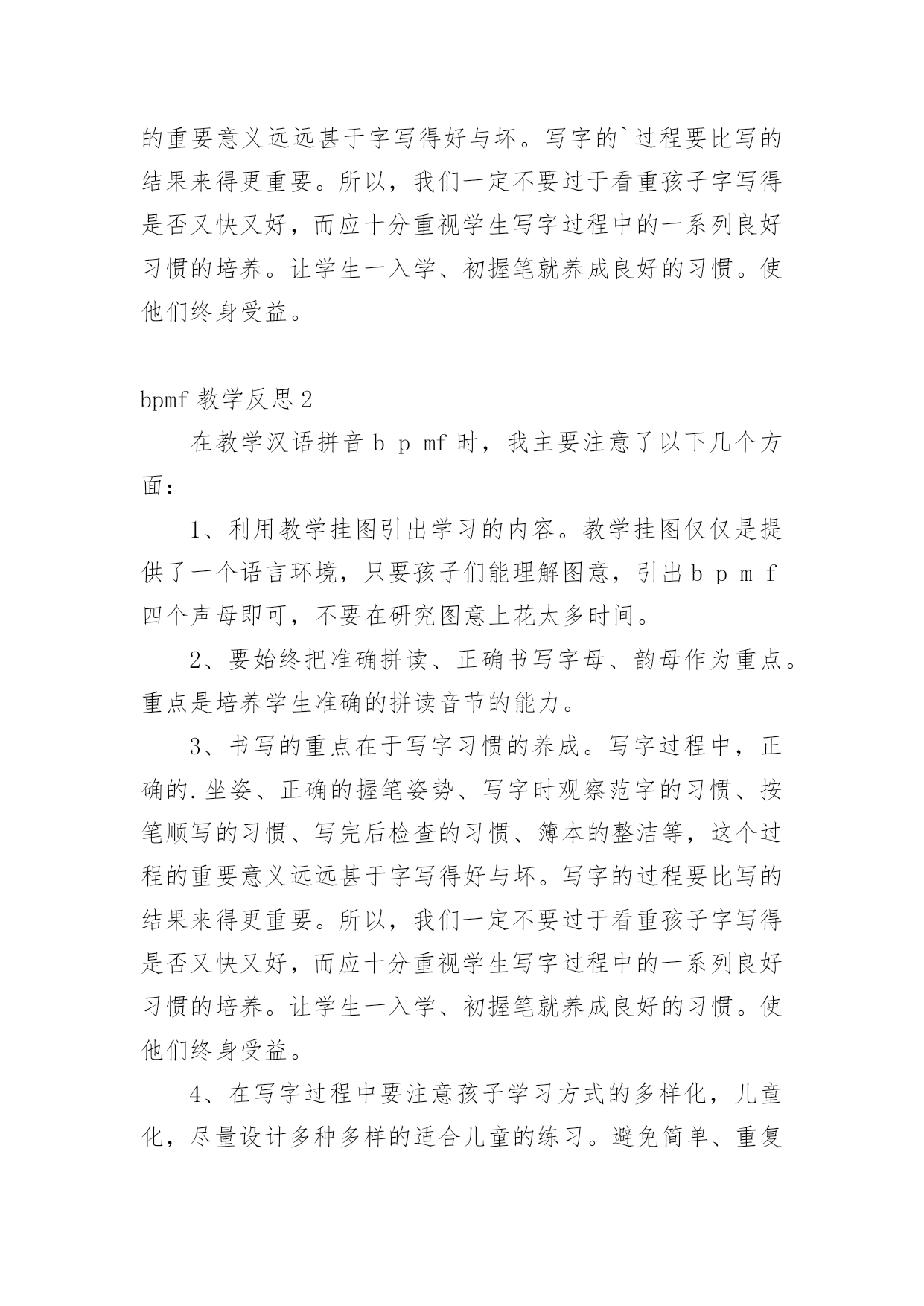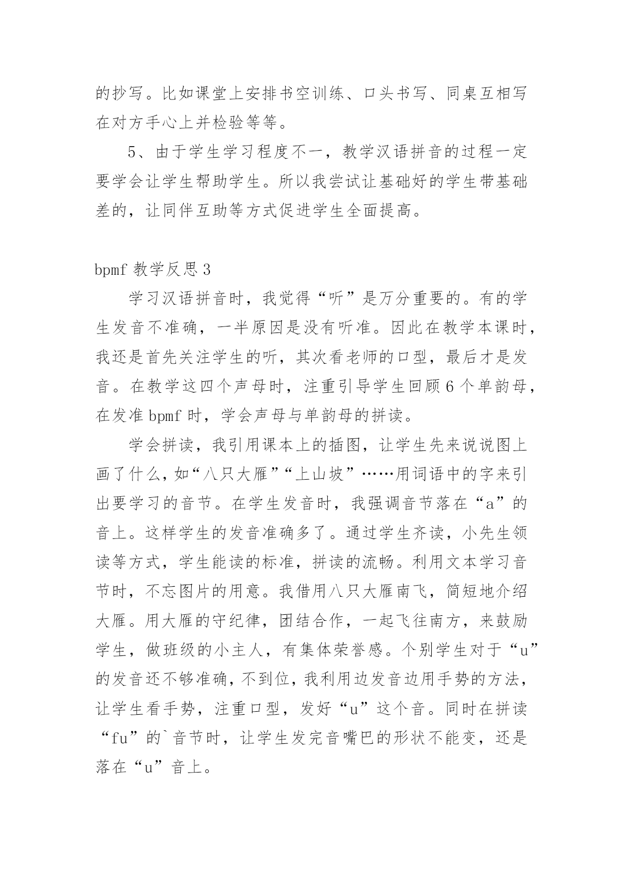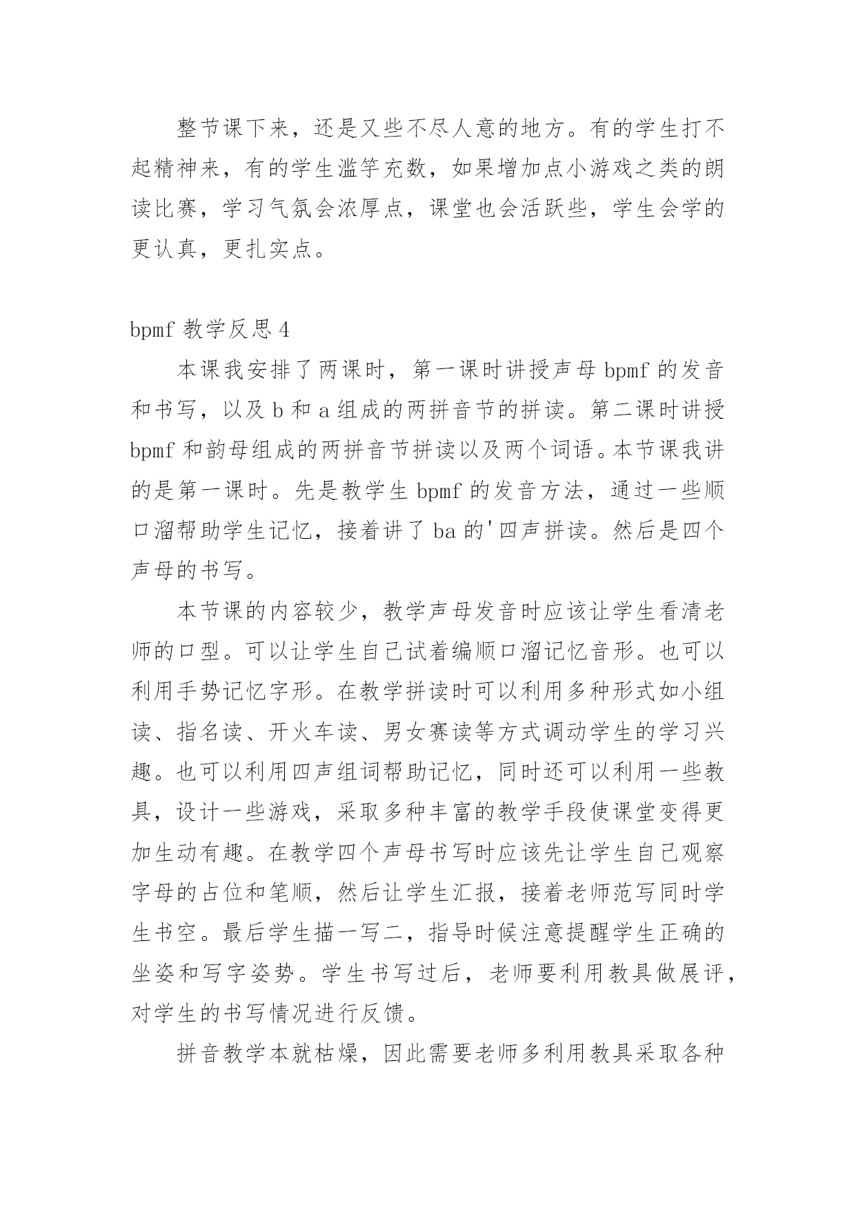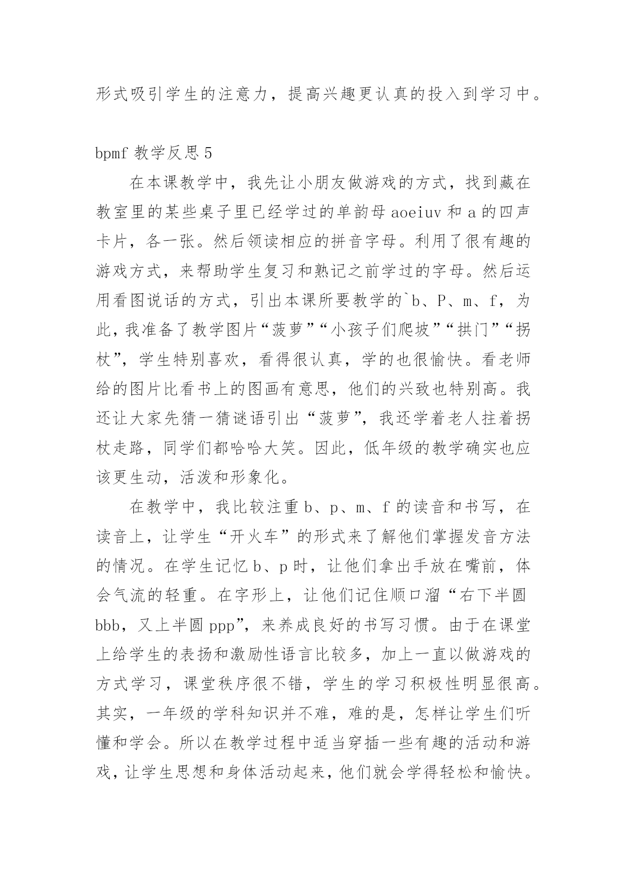 bpmf教学反思 bpmf教学反思15篇作为一名到岗不久的人民教师,我们的任务之一就是教学,通过教学反思可以有效提升自己的课堂经验,教学反思我们应该怎么写呢?以下是小编收集整理的bpmf教学反思,希望能够帮助到大家。bpmf教学反思11.要注意的是,教学挂图仅仅是提供了一个语言环境,只要孩子们能理解图意,引出bpmf四个声母即可,不要在研究图意上花太多时间,以免喧宾夺主,把一节拼音课上成半节看图说话课。关于情境图与语境歌,它只是激发学生兴趣、帮助识记的辅助手段,仅仅是为学生学习字母提供了一个语言背景和环境。教师注意不要花费过多的时间去要求学生看图说话和背诵儿歌。2.要始终把准确拼读、正确书写字母、韵母作为重点。重点是培养学生准确的拼读音节的能力。对音节,只要求能够准确拼读、进行适量描红、抄写,不要默写。以减轻负担,保证重点。值得注意的是拼读要与识字、与发展语言结合起来,不能只是单纯技能上的训练。3.书写的重点在于写字习惯的养成。写字过程中,正确的坐姿、正确的握笔姿势、写字时观察范字的习惯、按笔顺写的习惯、写完后检查的习惯、簿本的整洁等,这个过程的重要意义远远甚于字写得好与坏。写字的`过程要比写的结果来得更重要。所以,我们一定不要过于看重孩子字写得是否又快又好,而应十分重视学生写字过程中的一系列良好习惯的培养。让学生一入学、初握笔就养成良好的习惯。使他们终身受益。bpmf教学反思2在教学汉语拼音bpmf时,我主要注意了以下几个方面:1、利用教学挂图引出学习的内容。教学挂图仅仅是提供了一个语言环境,只要孩子们能理解图意,引出bpmf四个声母即可,不要在研究图意上花太多时间。2、要始终把准确拼读、正确书写字母、韵母作为重点。重点是培养学生准确的拼读音节的能力。3、书写的重点在于写字习惯的养成。写字过程中,正确的.坐姿、正确的握笔姿势、写字时观察范字的习惯、按笔顺写的习惯、写完后检查的习惯、簿本的整洁等,这个过程的重要意义远远甚于字写得好与坏。写字的过程要比写的结果来得更重要。所以,我们一定不要过于看重孩子字写得是否又快又好,而应十分重视学生写字过程中的一系列良好习惯的培养。让学生一入学、初握笔就养成良好的习惯。使他们终身受益。4、在写字过程中要注意孩子学习方式的多样化,儿童化,尽量设计多种多样的适合儿童的练习。避免简单、重复的抄写。比如课堂上安排书空训练、口头书写、同桌互相写在对方手心上并检验等等。5、由于学生学习程度不一,教学汉语拼音的过程一定要学会让学生帮助学生。所以我尝试让基础好的学生带基础差的,让同伴互助等方式促进学生全面提高。bpmf教学反思3学习汉语拼音时,我觉得“听”是万分重要的。有的学生发音不准确,一半原因是没有听准。因此在教学本课时,我还是首先关注学生的听,其次看老师的口型,最后才是发音。在教学这四个声母时,注重引导学生回顾6个单韵母,在发准bpmf时,学会声母与单韵母的拼读。学会拼读,我引用课本上的插图,让学生先来说说图上画了什么,如“八只大雁”“上山坡”……用词语中的字来引出要学习的音节。在学生发音时,我强调音节落在“a”的音上。这样学生的发音准确多了。通过学生齐读,小先生领读等方式,学生能读的标准,拼读的流畅。利用文本学习音节时,不忘图片的用意。我借用八只大雁南飞,简短地介绍大雁。用大雁的守纪律,团结合作,一起飞往南方,来鼓励学生,做班级的小主人,有集体荣誉感。个别学生对于“u”的发音还不够准确,不到位,我利用边发音边用手势的方法,让学生看手势,注重口型,发好“u”这个音。同时在拼读“fu”的`音节时,让学生发完音嘴巴的形状不能变,还是落在“u”音上。整节课下来,还是又些不尽人意的地方。有的学生打不起精神来,有的学生滥竽充数,如果增加点小游戏之类的朗读比赛,学习气氛会浓厚点,课堂也会活跃些,学生会学的更认真,更扎实点。bpmf教学反思4本课我安排了两课时,第一课时讲授声母bpmf的发音和书写,以及b和a组成的两拼音节的拼读。第二课时讲授bpmf和韵母组成的两拼音节拼读以及两个词语。本节课我讲的是第一课时。先是教学生bpmf的发音方法,通过一些顺口溜帮助学生记忆,接着讲了ba的'四声拼读。然后是四个声母的书写。本节课的内容较少,教学声母发音时应该让学生看清老师的口型。可以让学生自己试着编顺口溜记忆音形。也可以利用手势记忆字形。在教学拼读时可以利用多种形式如小组读、指名读、开火车读、男女赛读等方式调动学生的学习兴趣。也可以利用四声组词帮助记忆,同时还可以利用一些教具,设计一些游戏,采取多种丰富的教学手段使课堂变得更加生动有趣。在教学四个声母书写时应该先让学生自己观察字母的占位和笔顺,然后让学生汇报,接着老师范写同时学生书空。最后学生描一写二,指导时候注意提醒学生正确的坐姿和写字姿势。学生书写过后,老师要利用教具