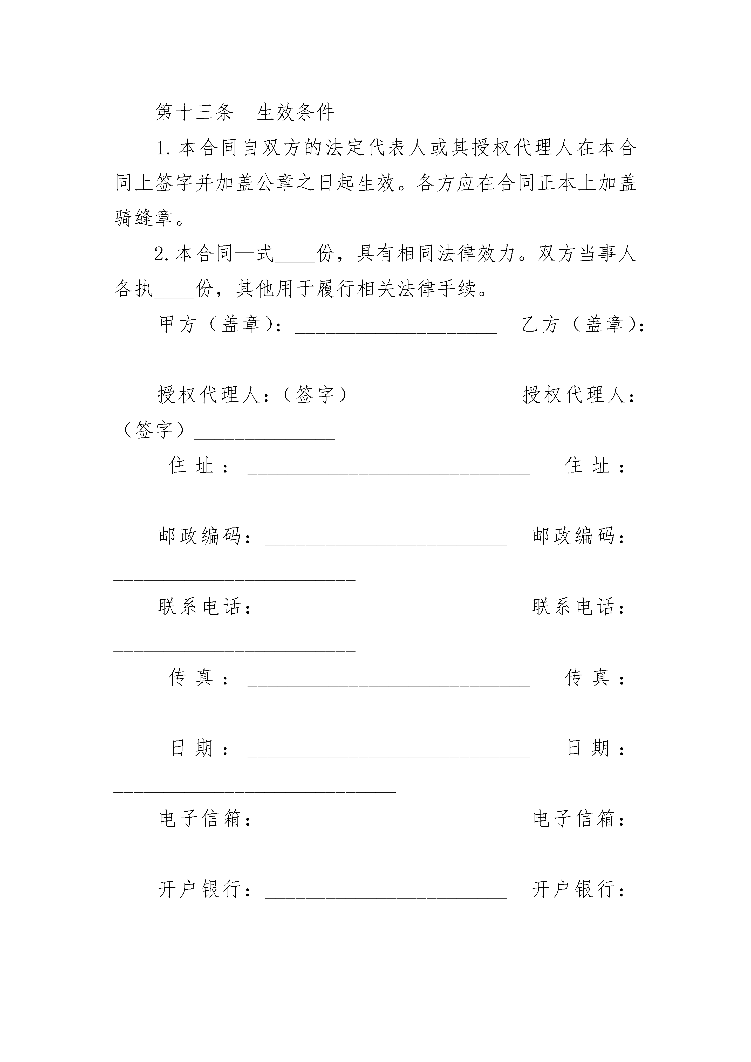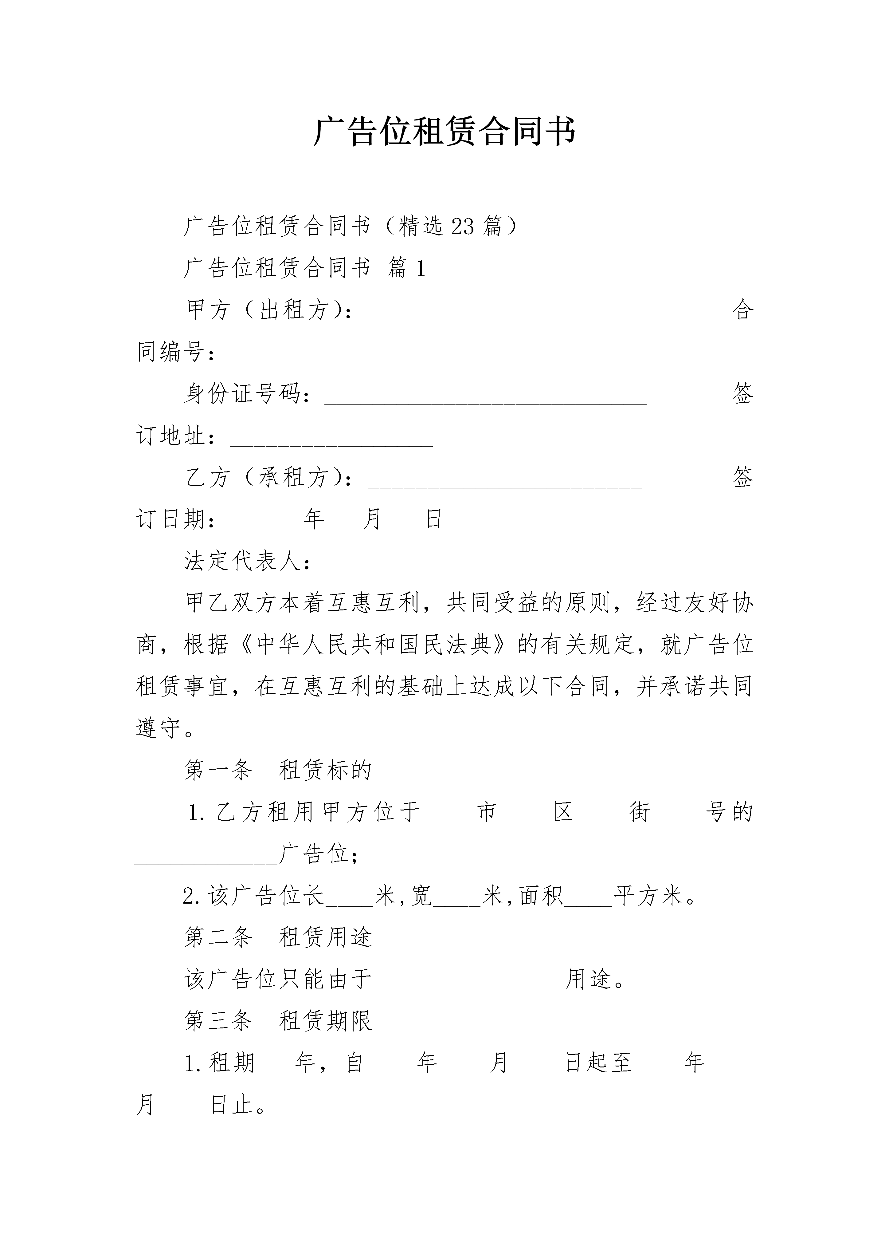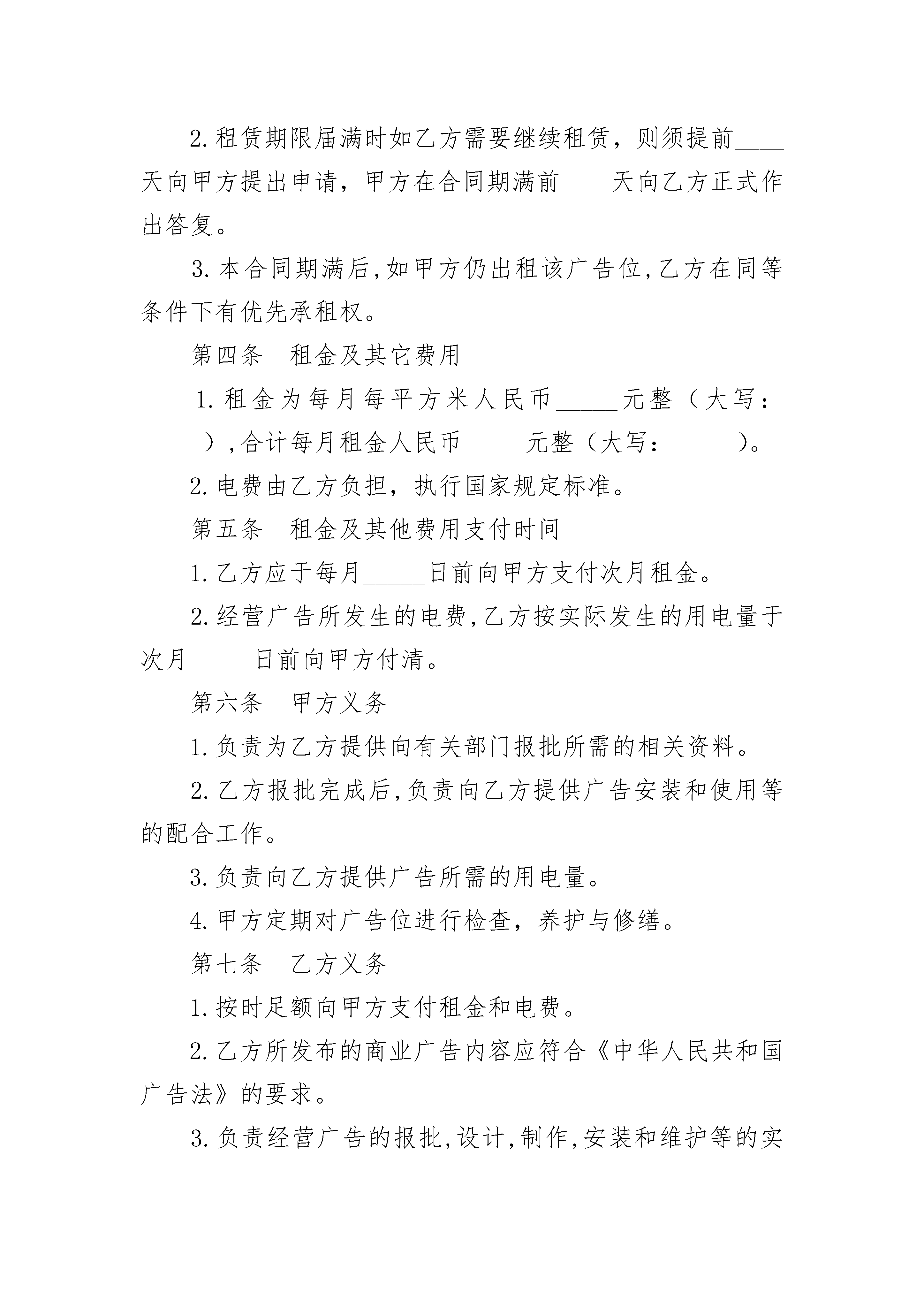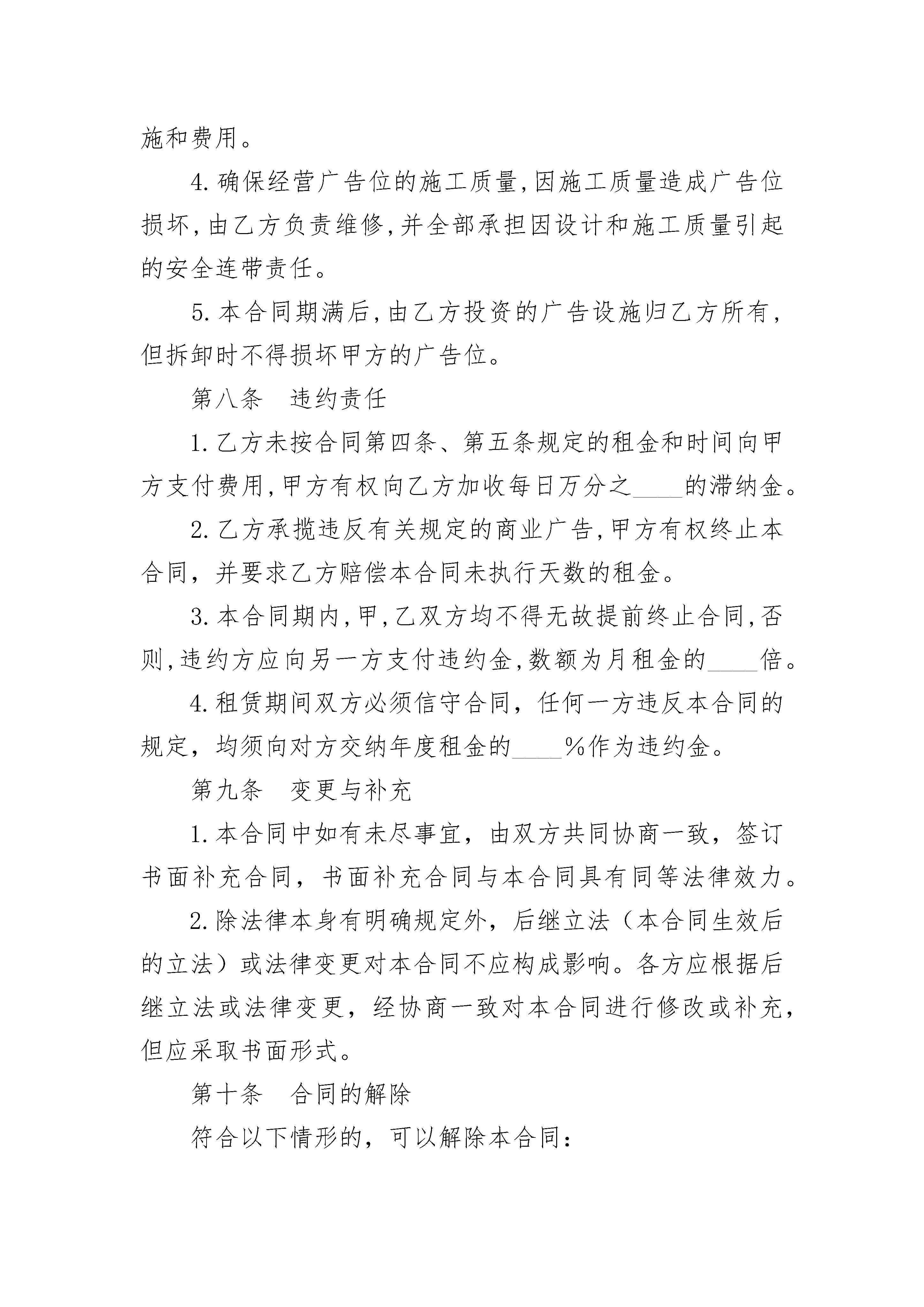 广告位租赁合同书广告位租赁合同书(精选23篇)广告位租赁合同书篇1甲方(出租方):_______________________合同编号:_________________身份证号码:___________________________签订地址:_________________乙方(承租方):_______________________签订日期:______年___月___日法定代表人:___________________________甲乙双方本着互惠互利,共同受益的原则,经过友好协商,根据《中华人民共和国民法典》的有关规定,就广告位租赁事宜,在互惠互利的基础上达成以下合同,并承诺共同遵守。第一条租赁标的1.乙方租用甲方位于____市____区____街____号的____________广告位;2.该广告位长____米,宽____米,面积____平方米。第二条租赁用途该广告位只能由于________________用途。第三条租赁期限1.租期___年,自____年____月____日起至____年____月____日止。2.租赁期限届满时如乙方需要继续租赁,则须提前____天向甲方提出申请,甲方在合同期满前____天向乙方正式作出答复。3.本合同期满后,如甲方仍出租该广告位,乙方在同等条件下有优先承租权。第四条租金及其它费用1.租金为每月每平方米人民币_____元整(大写:_____),合计每月租金人民币_____元整(大写:_____)。2.电费由乙方负担,执行国家规定标准。第五条租金及其他费用支付时间1.乙方应于每月_____日前向甲方支付次月租金。2.经营广告所发生的电费,乙方按实际发生的用电量于次月_____日前向甲方付清。第六条甲方义务1.负责为乙方提供向有关部门报批所需的相关资料。2.乙方报批完成后,负责向乙方提供广告安装和使用等的配合工作。3.负责向乙方提供广告所需的用电量。4.甲方定期对广告位进行检查,养护与修缮。第七条乙方义务1.按时足额向甲方支付租金和电费。2.乙方所发布的商业广告内容应符合《中华人民共和国广告法》的要求。3.负责经营广告的报批,设计,制作,安装和维护等的实施和费用。4.确保经营广告位的施工质量,因施工质量造成广告位损坏,由乙方负责维修,并全部承担因设计和施工质量引起的安全连带责任。5.本合同期满后,由乙方投资的广告设施归乙方所有,但拆卸时不得损坏甲方的广告位。第八条违约责任1.乙方未按合同第四条、第五条规定的租金和时间向甲方支付费用,甲方有权向乙方加收每日万分之____的滞纳金。2.乙方承揽违反有关规定的商业广告,甲方有权终止本合同,并要求乙方赔偿本合同未执行天数的租金。3.本合同期内,甲,乙双方均不得无故提前终止合同,否则,违约方应向另一方支付违约金,数额为月租金的____倍。4.租赁期间双方必须信守合同,任何一方违反本合同的规定,均须向对方交纳年度租金的____%作为违约金。第九条变更与补充1.本合同中如有未尽事宜,由双方共同协商一致,签订书面补充合同,书面补充合同与本合同具有同等法律效力。2.除法律本身有明确规定外,后继立法(本合同生效后的立法)或法律变更对本合同不应构成影响。各方应根据后继立法或法律变更,经协商一致对本合同进行修改或补充,但应采取书面形式。第十条合同的解除符合以下情形的,可以解除本合同:1.双方经协商一致同意的。2.因不可抗力致使本合同不能履行的或没必要履行的。3.合同一方违反本合同约定,守约方根据本合同约定提出解除本合同的。第十一条陈述和保证1.甲方向乙方陈述和保证如下:(1)其有权进行本协议规定的交易,并已采取所有必要的公司行为授权签订和履行本协议;(2)本协议自签订之日起对其构成有约束力的义务。2.乙方向甲方陈述和保证如下:(1)其有权进行本协议规定的交易,并已采取所有必要的公司行为授权签订和履行本协议;(2)本协议自签订之日起对其构成有约束力的义务。第十二条法律适用与纠纷解决方式1.本合同适用中华人民共和国有关法律,受中华人民共和国法律管辖。2.本合同执行期间,如遇不可抗力致使合同无法履行的,双方应按有关法律法规规定及时协商处理。3.本合同各方当事人对本合同有关条款的解释或履行发生争议时,应通过友好协商的方式予以解决。双方约定,凡因本合同发生的一切争议,当和解或调解不成时,选择下列第____种方式解决:(1)将争议提交____仲裁委员会仲裁;(2)依法向____人民法院提起诉讼。第十三条生效条件1.本合同自双方的法定代表人或其授权代理人在本合同上签字并加盖公章之日起生效。各方应在合同正本上加盖骑缝章。2.本合同—式____份,具有相同法律效力。双方当事人各执____份,其他用于履行相关法律手续。甲方(盖章):_________________